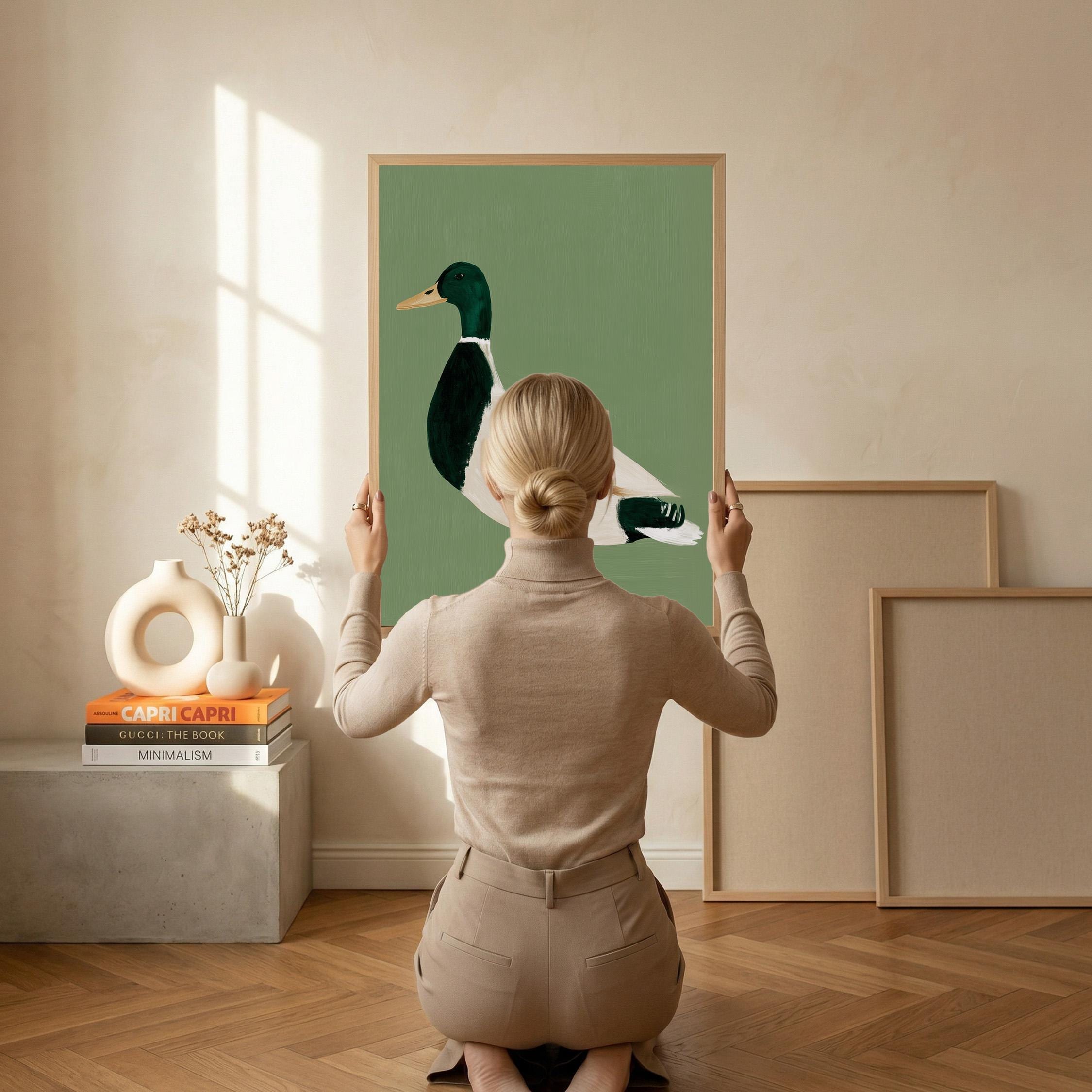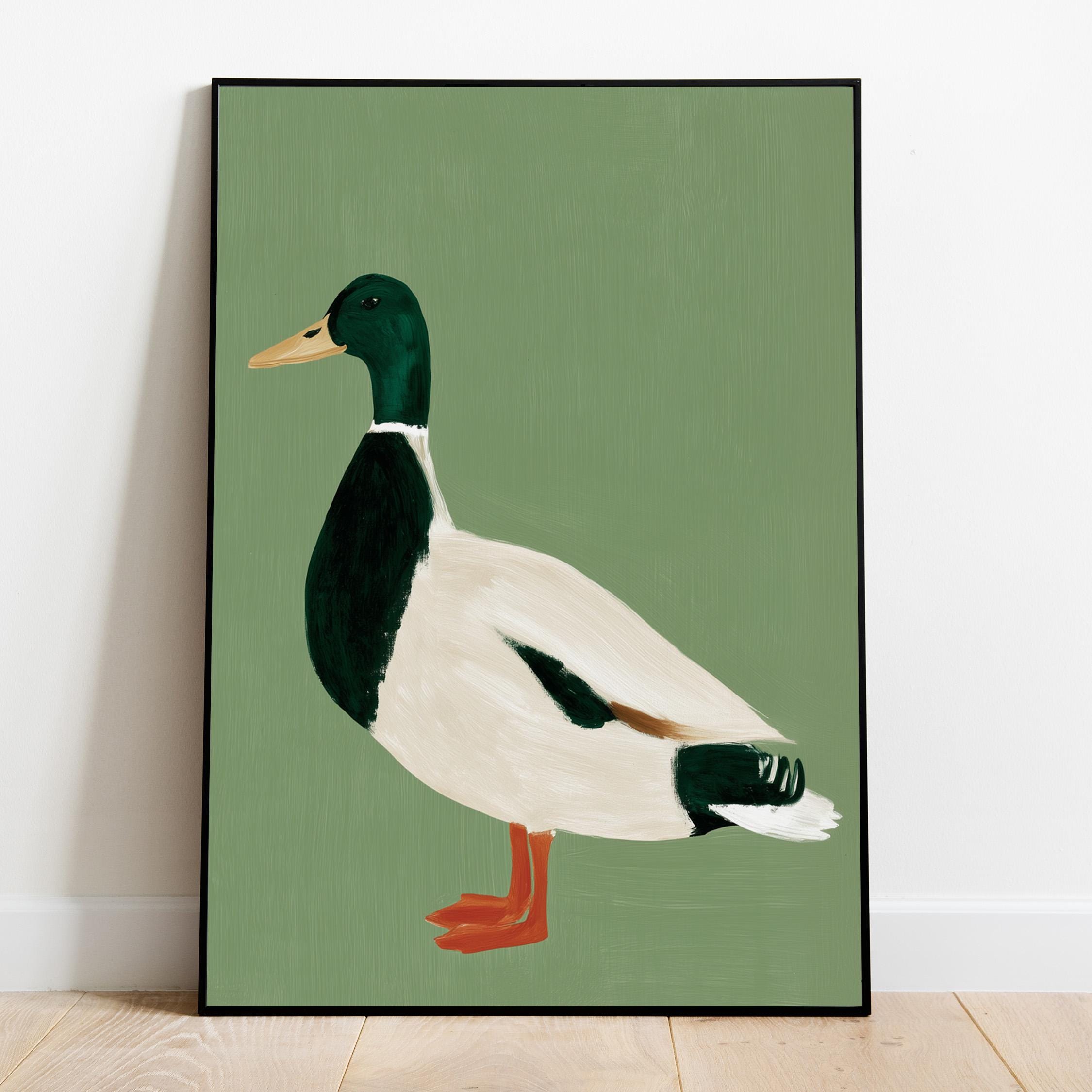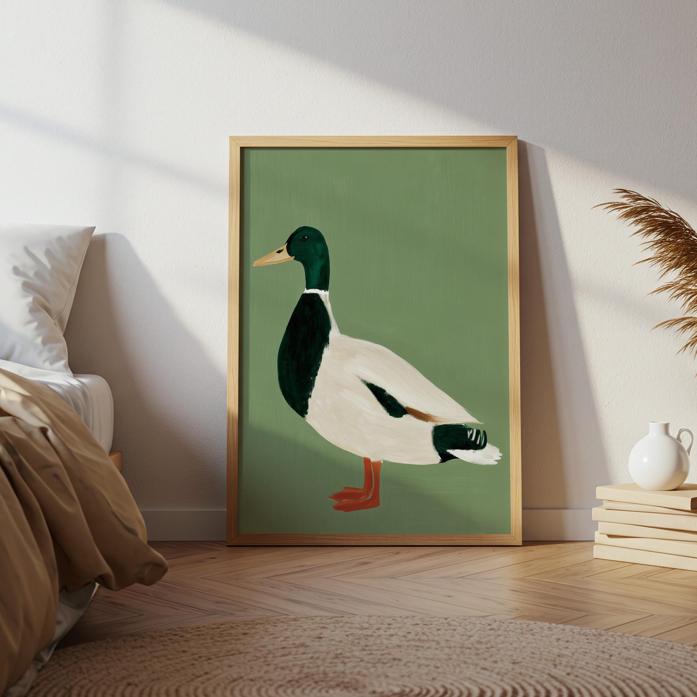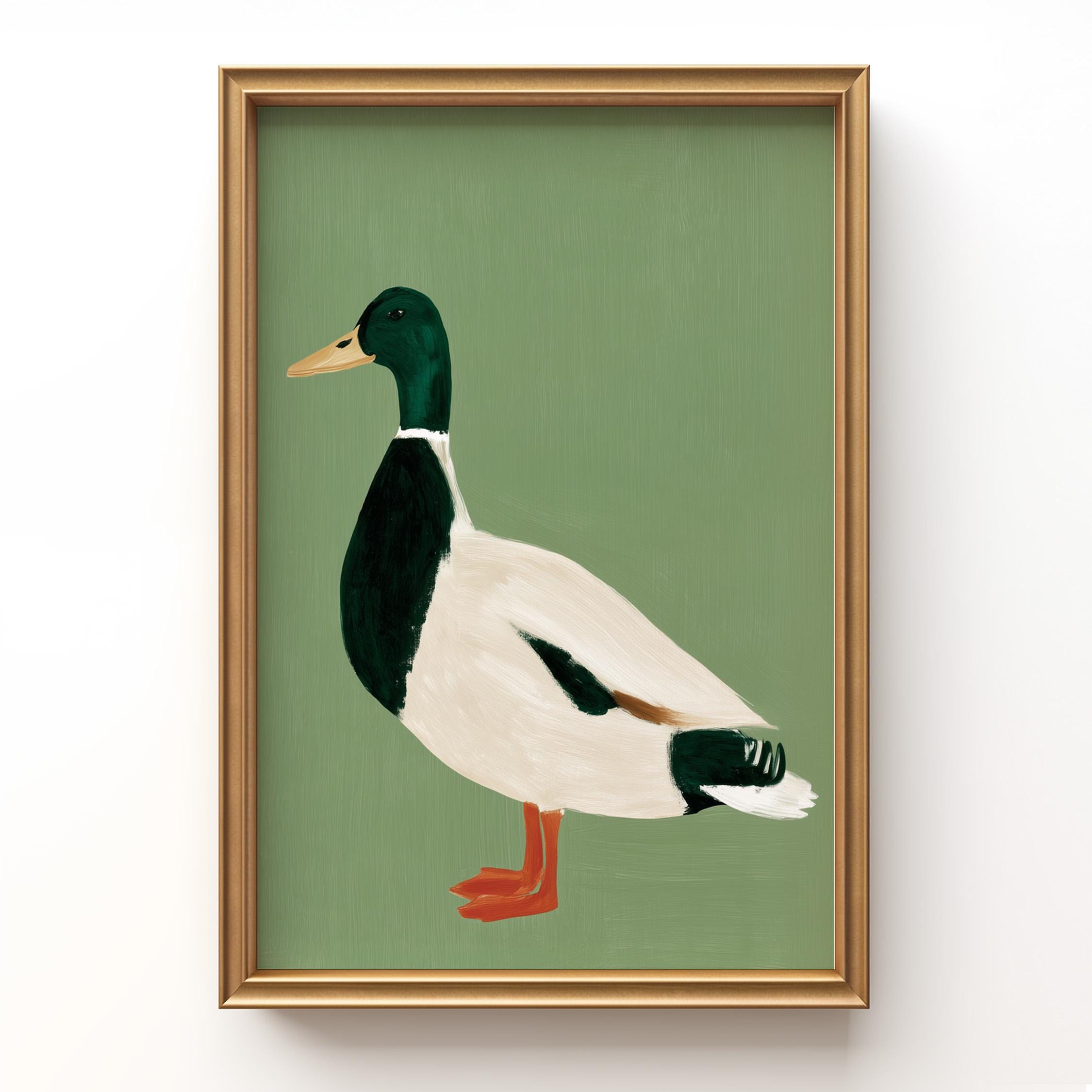 Minimalist duck painting featuring a standing mallard duck against a soft sage green background. The simple composition and visible brush texture give the artwork a calm, modern look while highlighting the classic colors of the duck — deep green head, warm orange feet, and soft cream feathers.