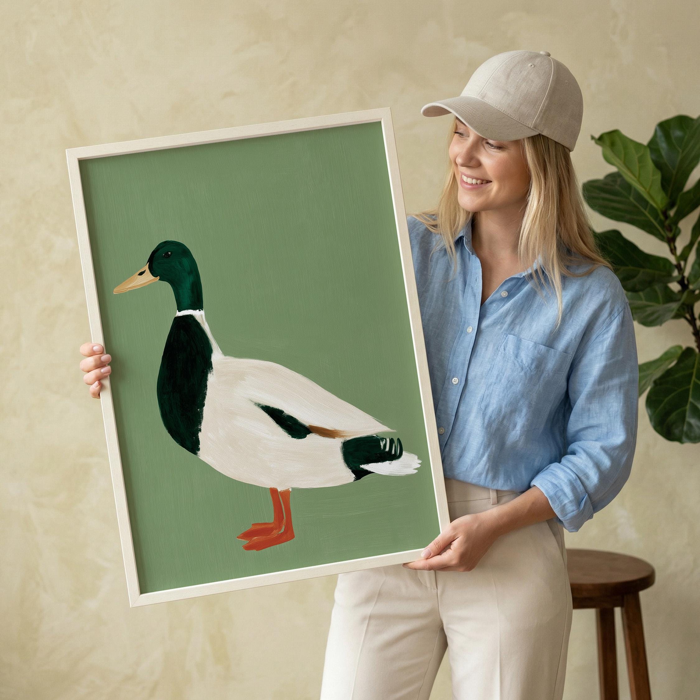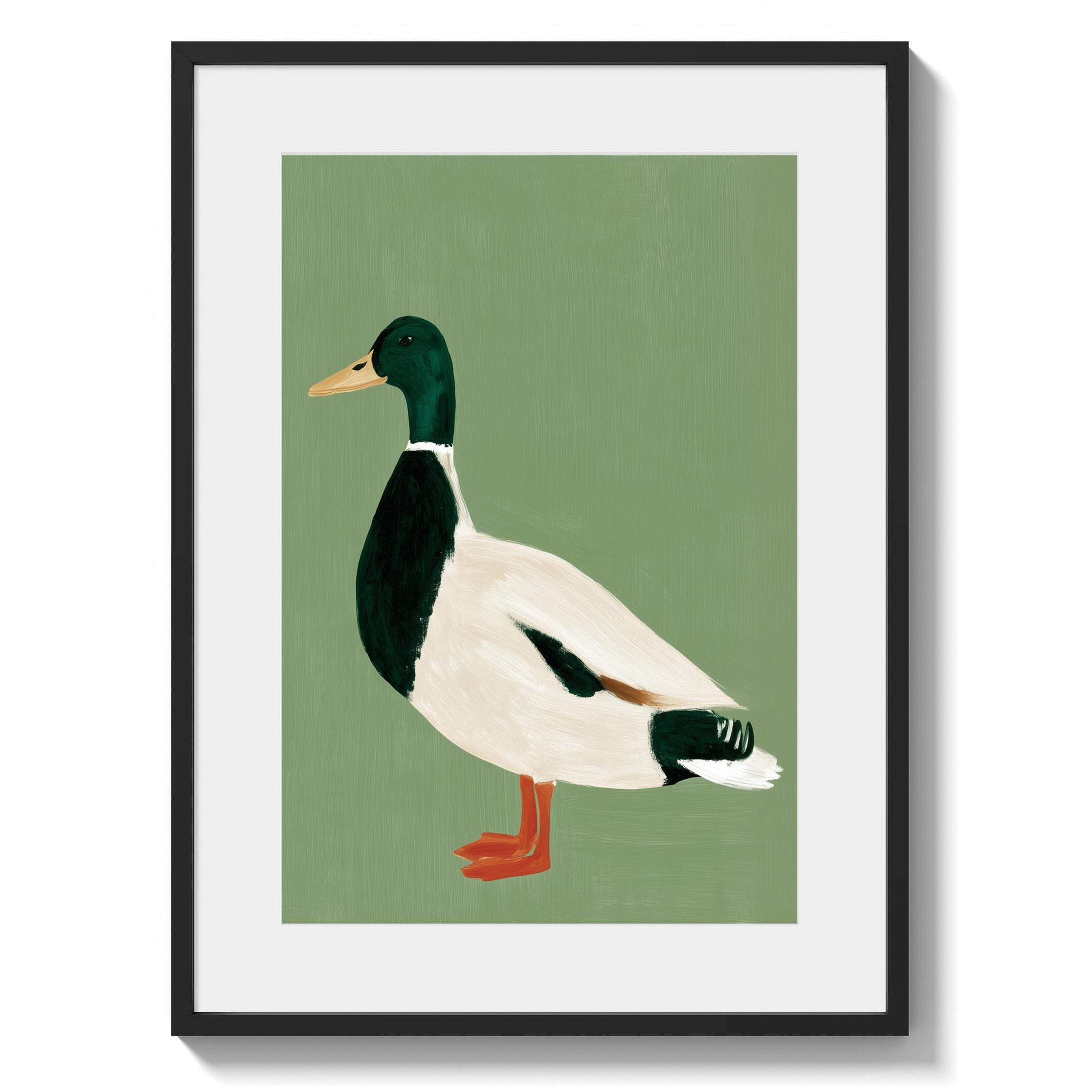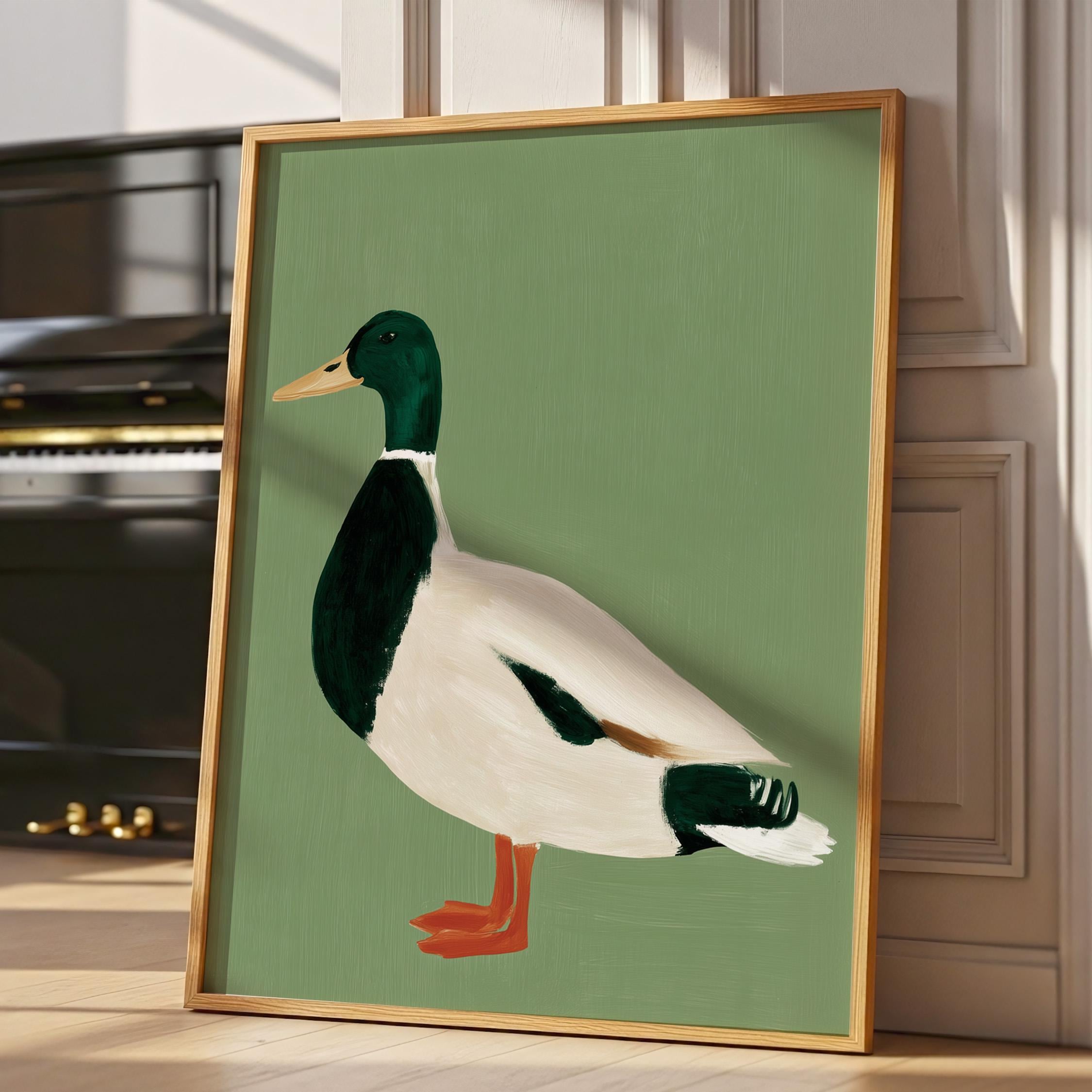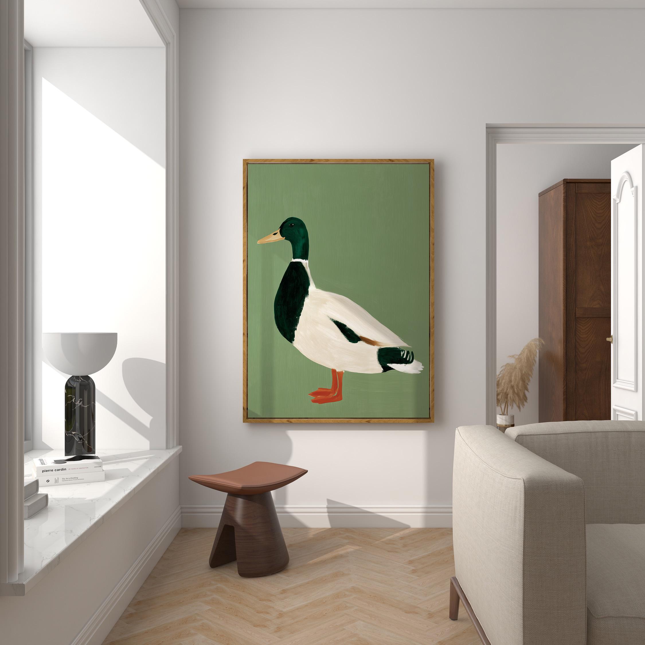 Minimalist duck painting featuring a standing mallard duck against a soft sage green background. The simple composition and visible brush texture give the artwork a calm, modern look while highlighting the classic colors of the duck — deep green head, warm orange feet, and soft cream feathers.