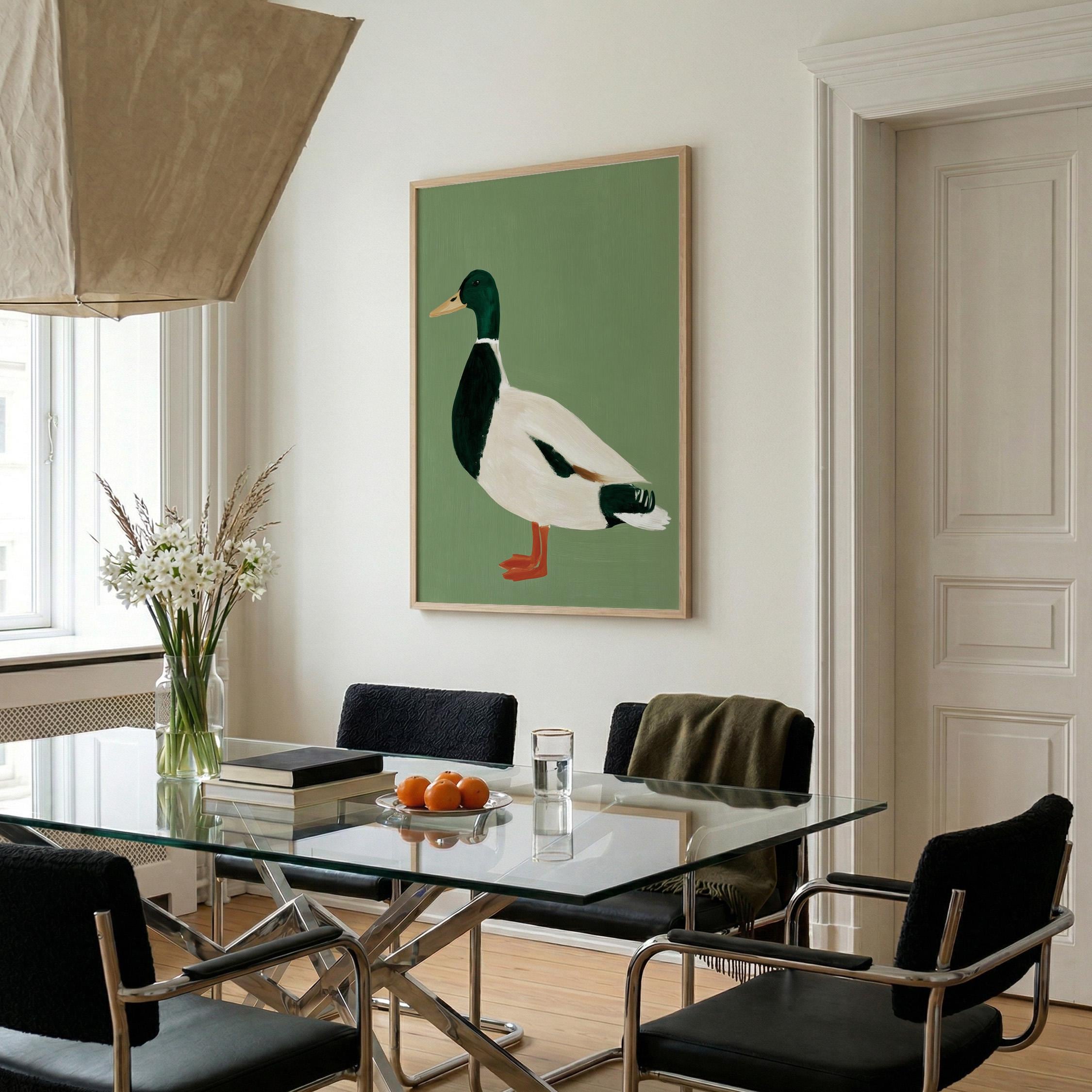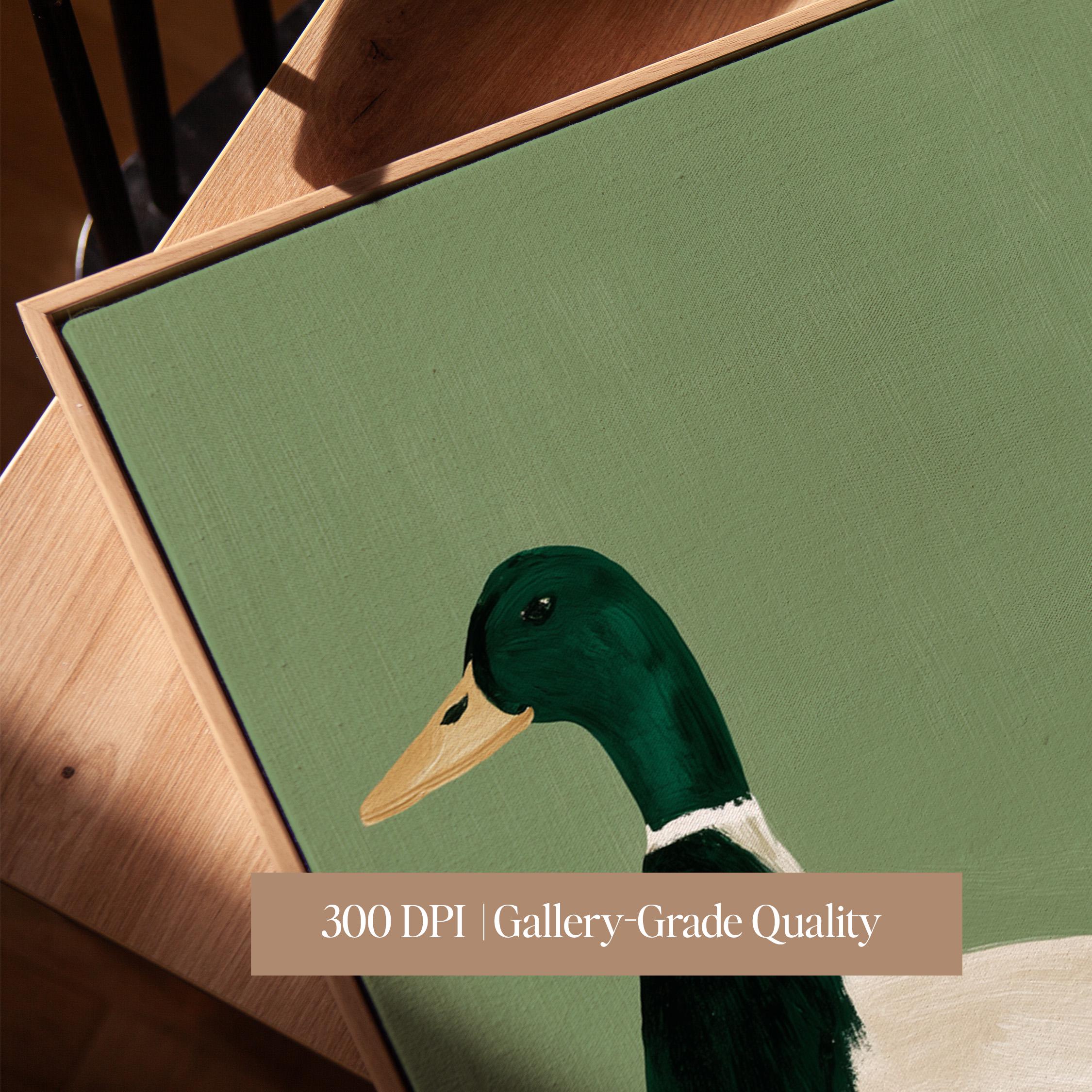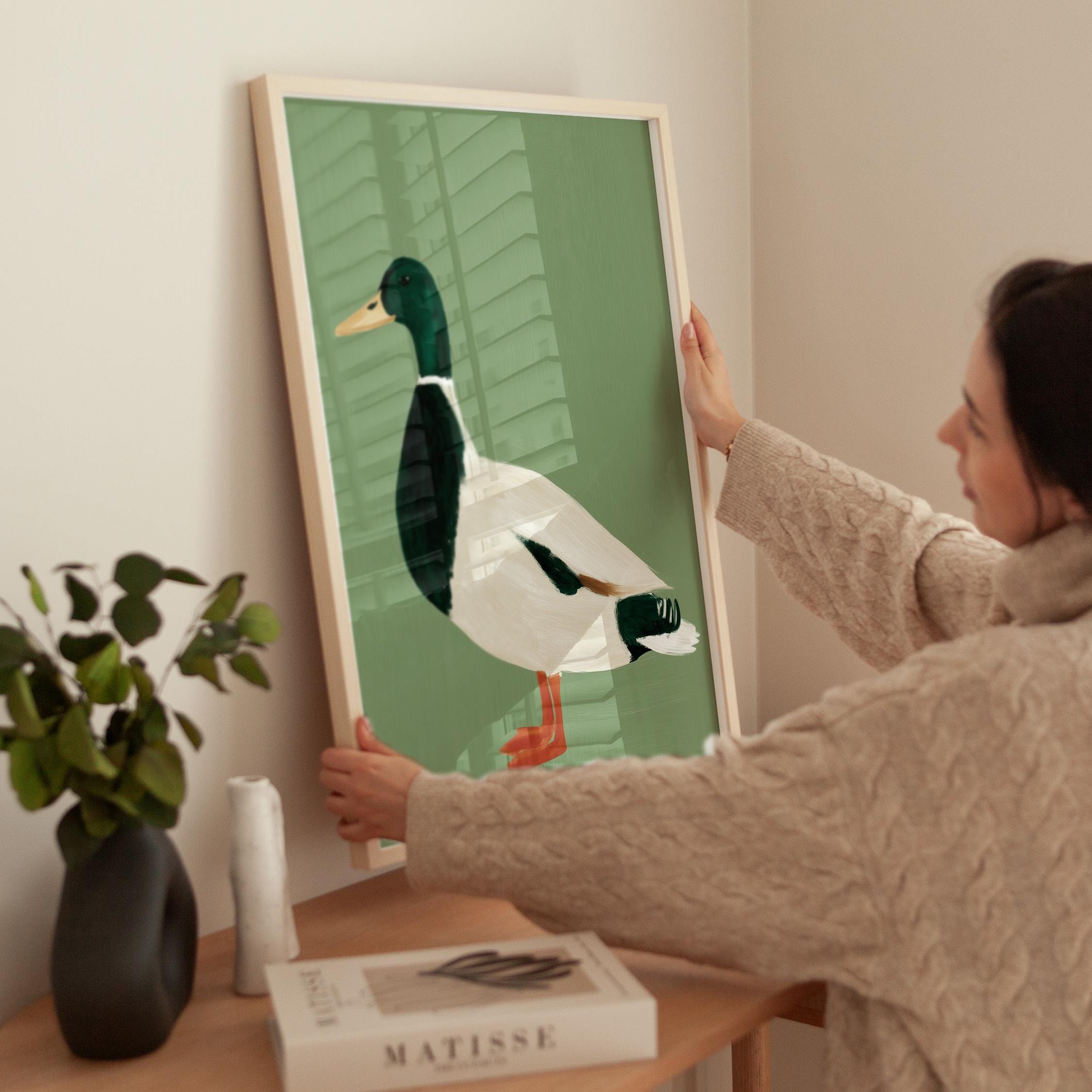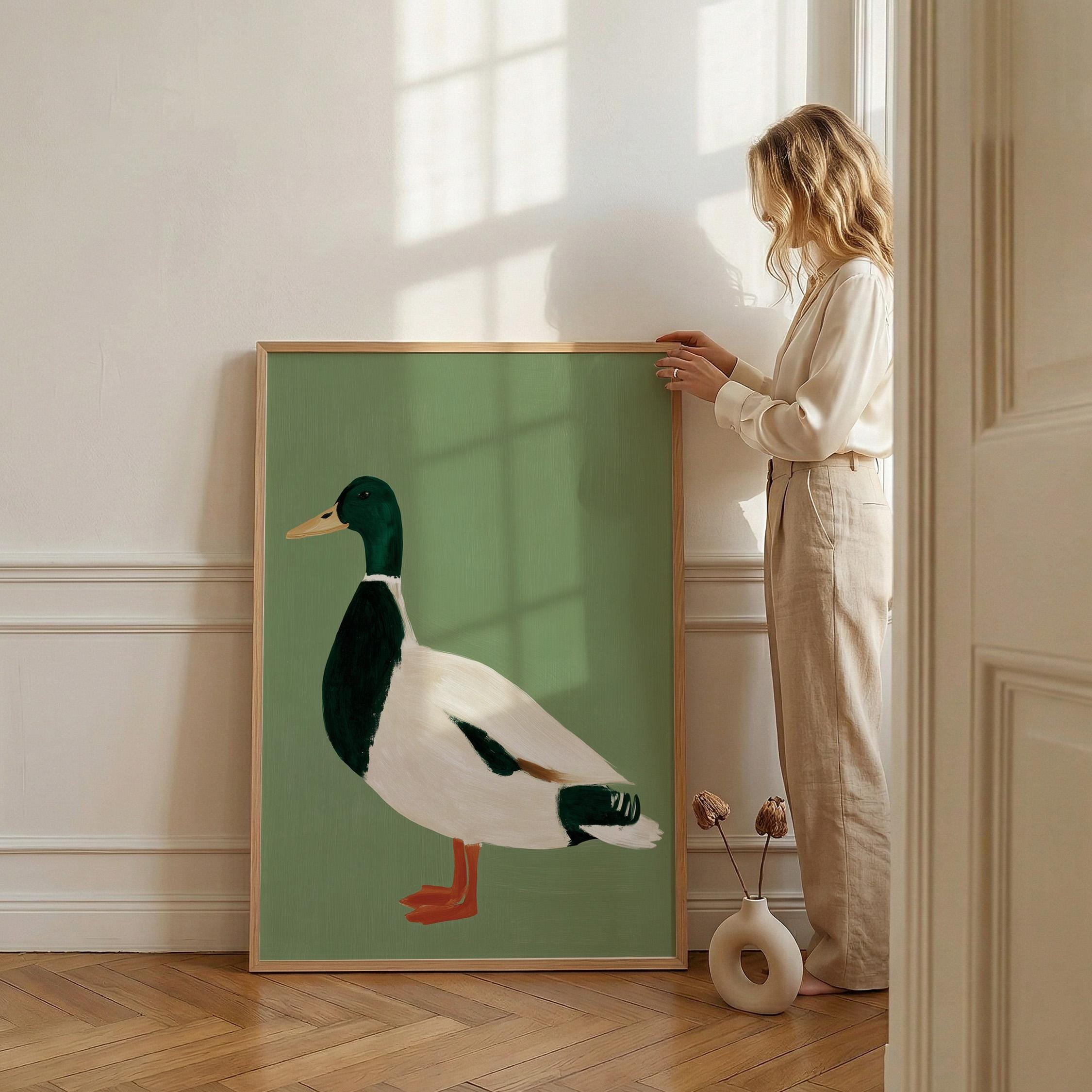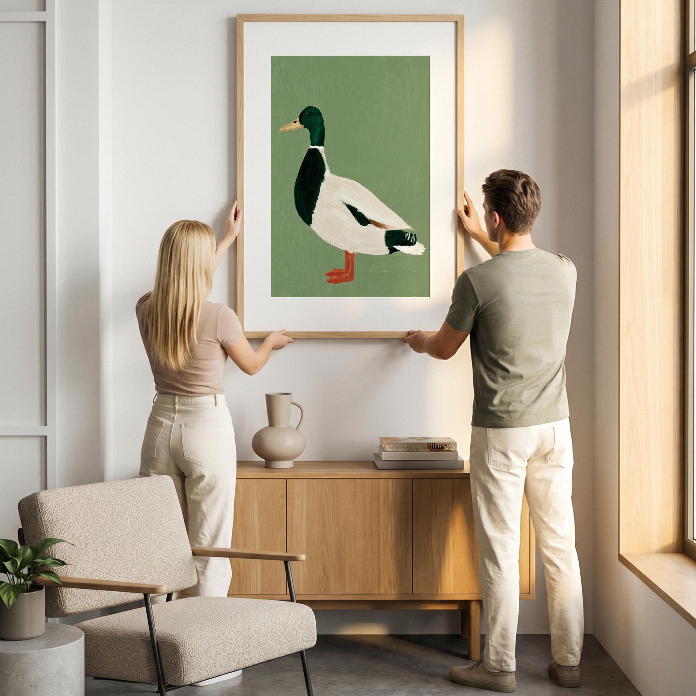 Minimalist duck painting featuring a standing mallard duck against a soft sage green background. The simple composition and visible brush texture give the artwork a calm, modern look while highlighting the classic colors of the duck — deep green head, warm orange feet, and soft cream feathers.