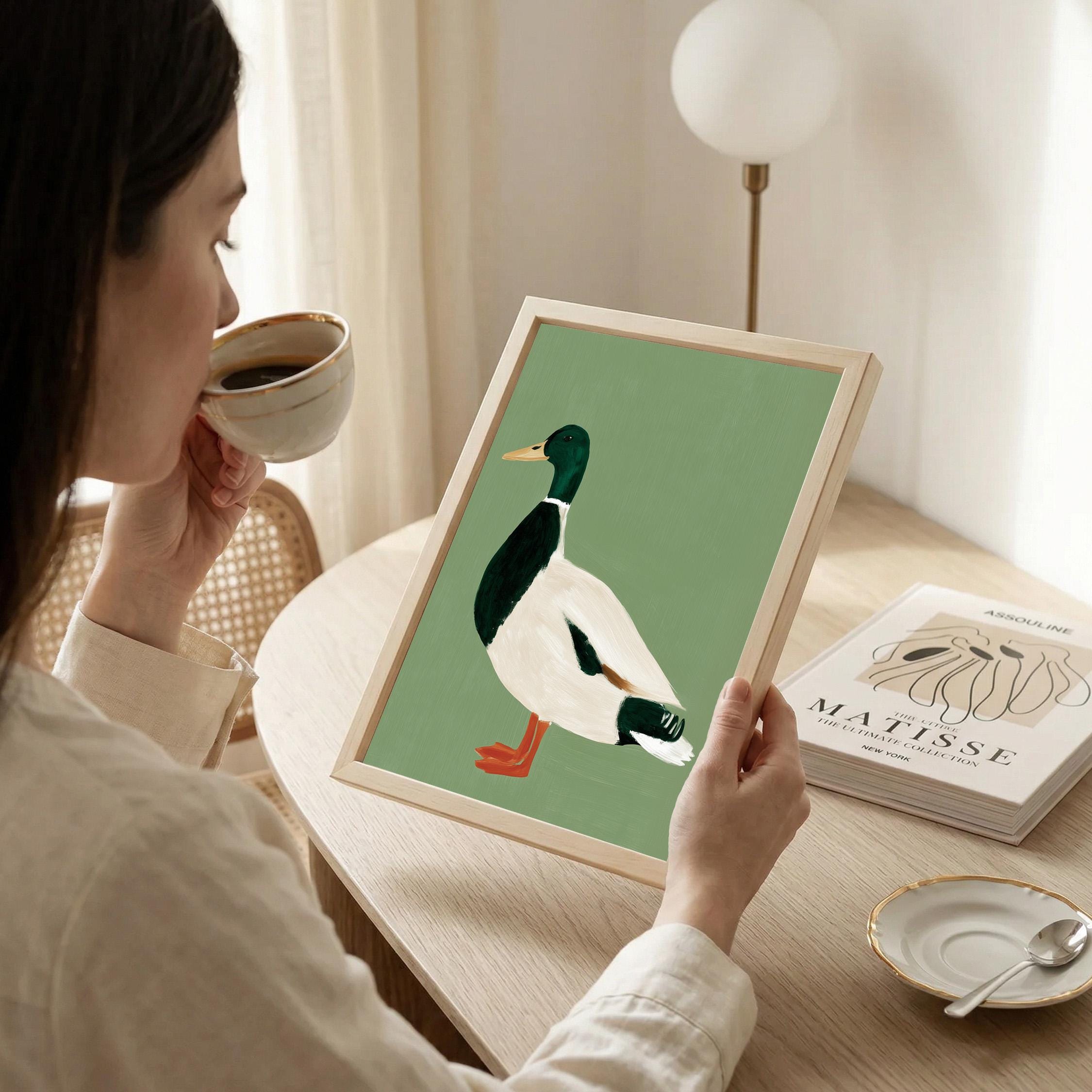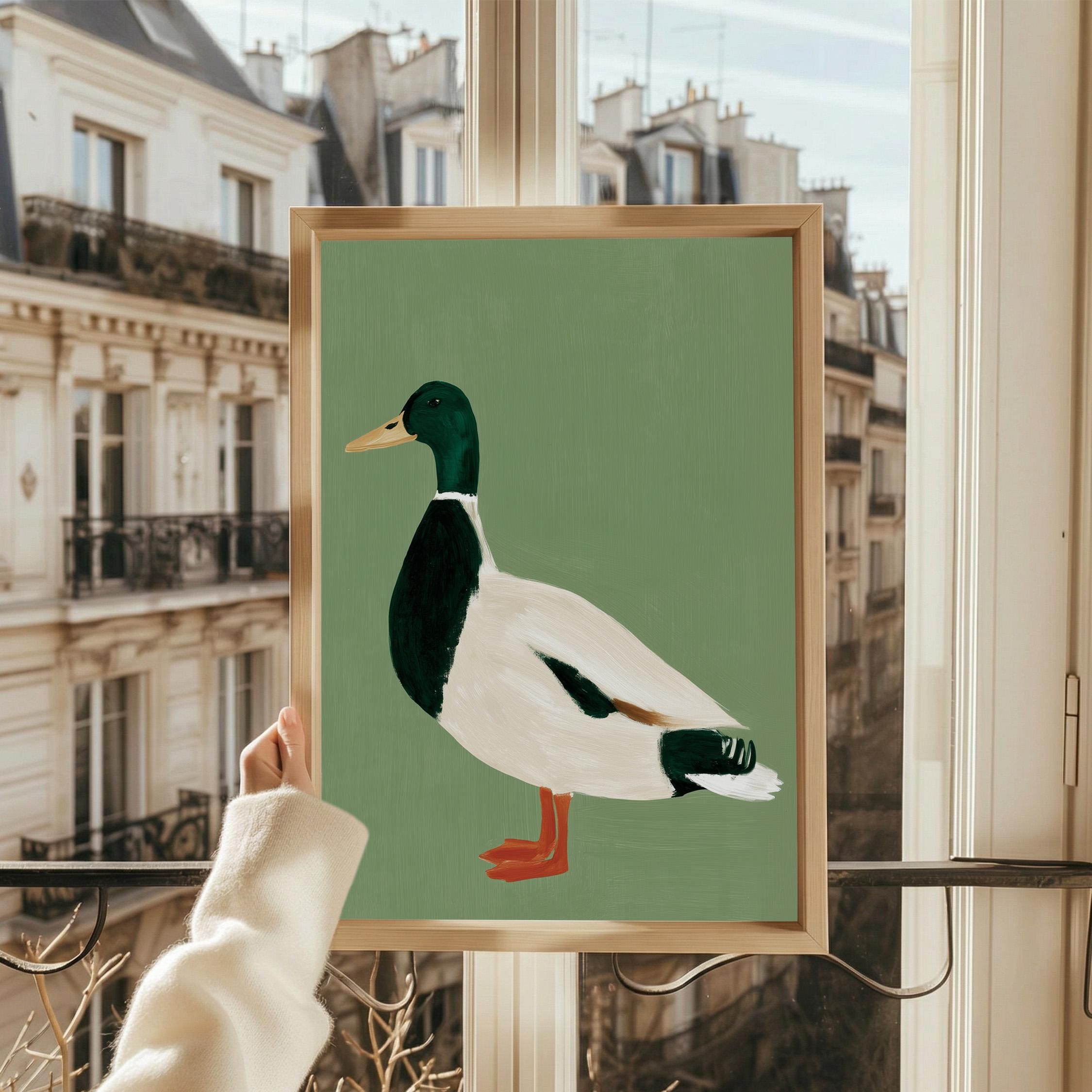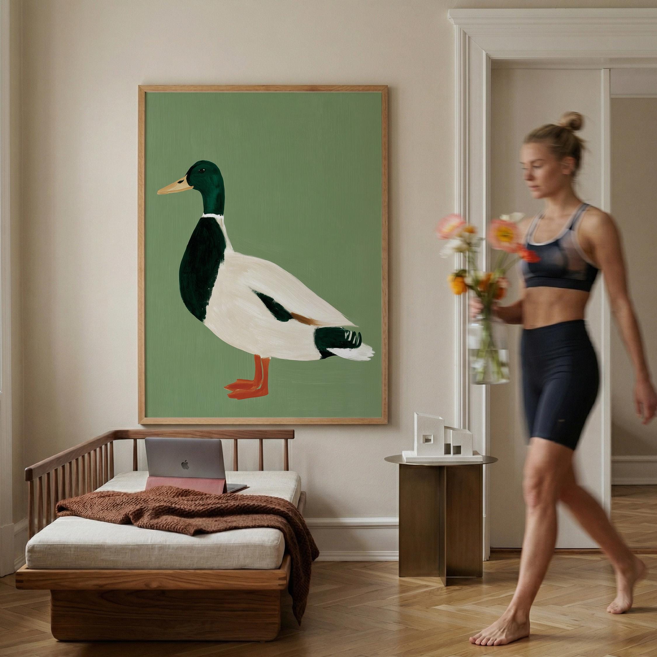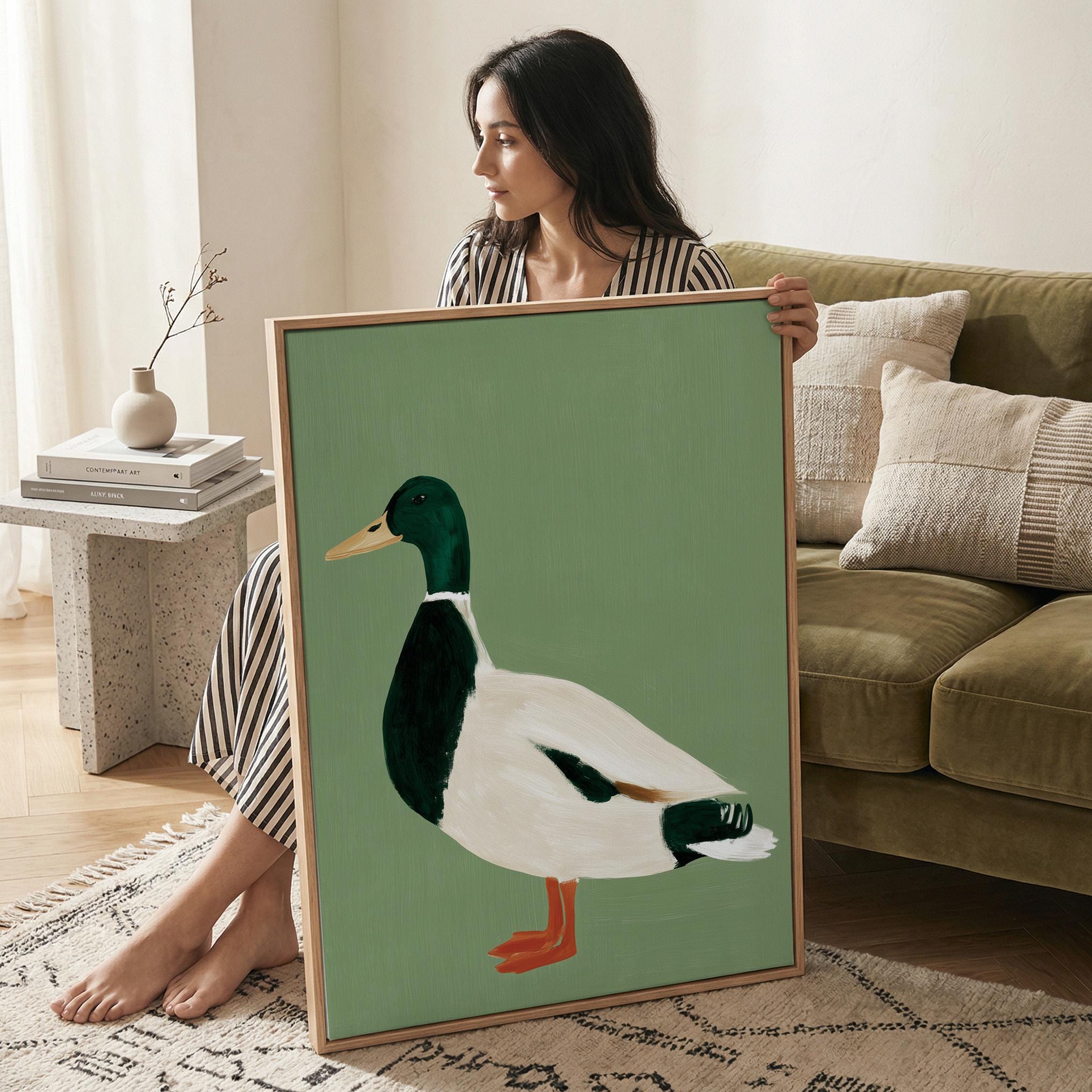 Minimalist duck painting featuring a standing mallard duck against a soft sage green background. The simple composition and visible brush texture give the artwork a calm, modern look while highlighting the classic colors of the duck — deep green head, warm orange feet, and soft cream feathers.