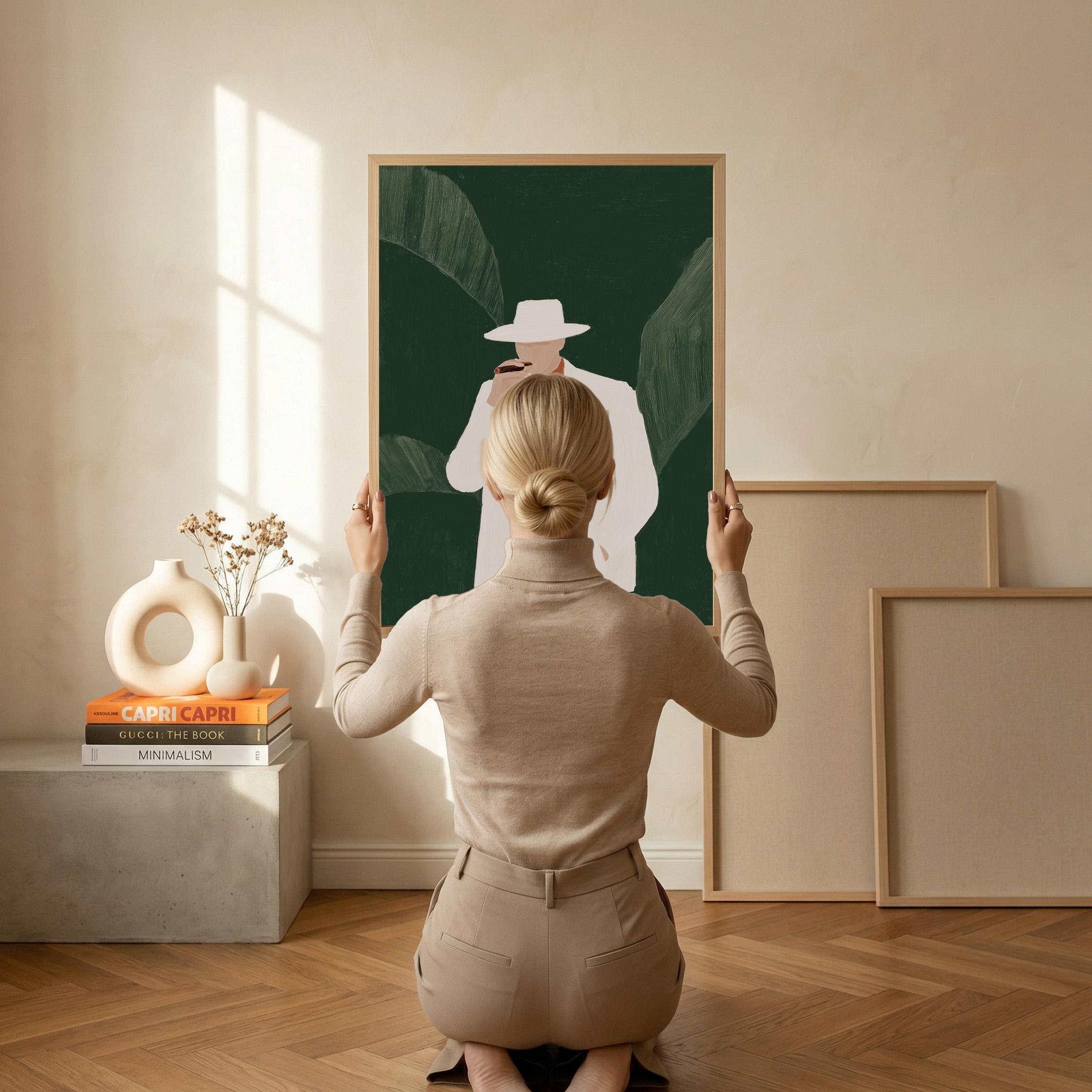 Transform your space with this striking gouache painting of a man with cigar. A sophisticated figure in an elegant white suit against lush green botanical leaves. Perfect for living rooms, home offices, or lounges where you want to add a touch of refined, worldly sophistication and vintage charm.