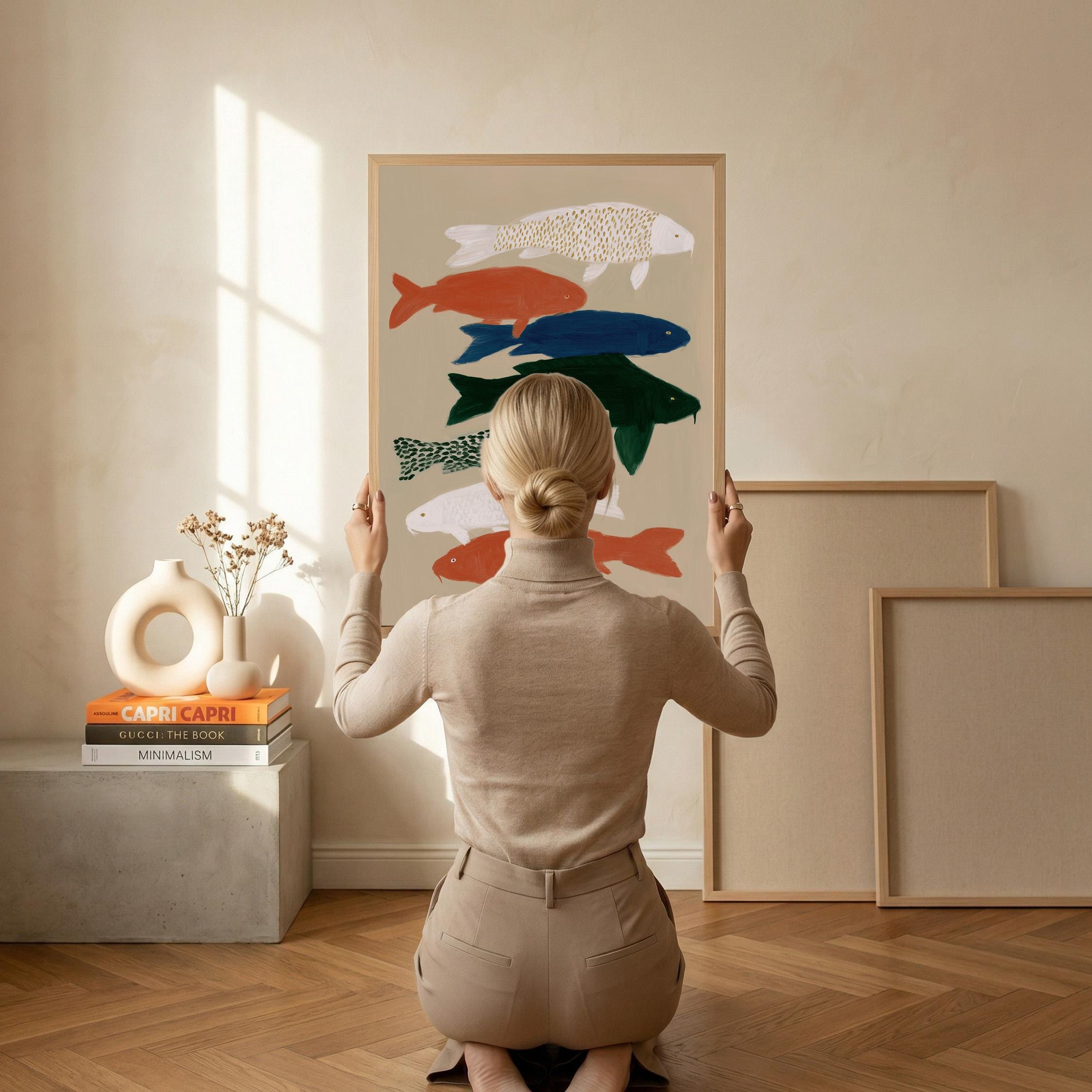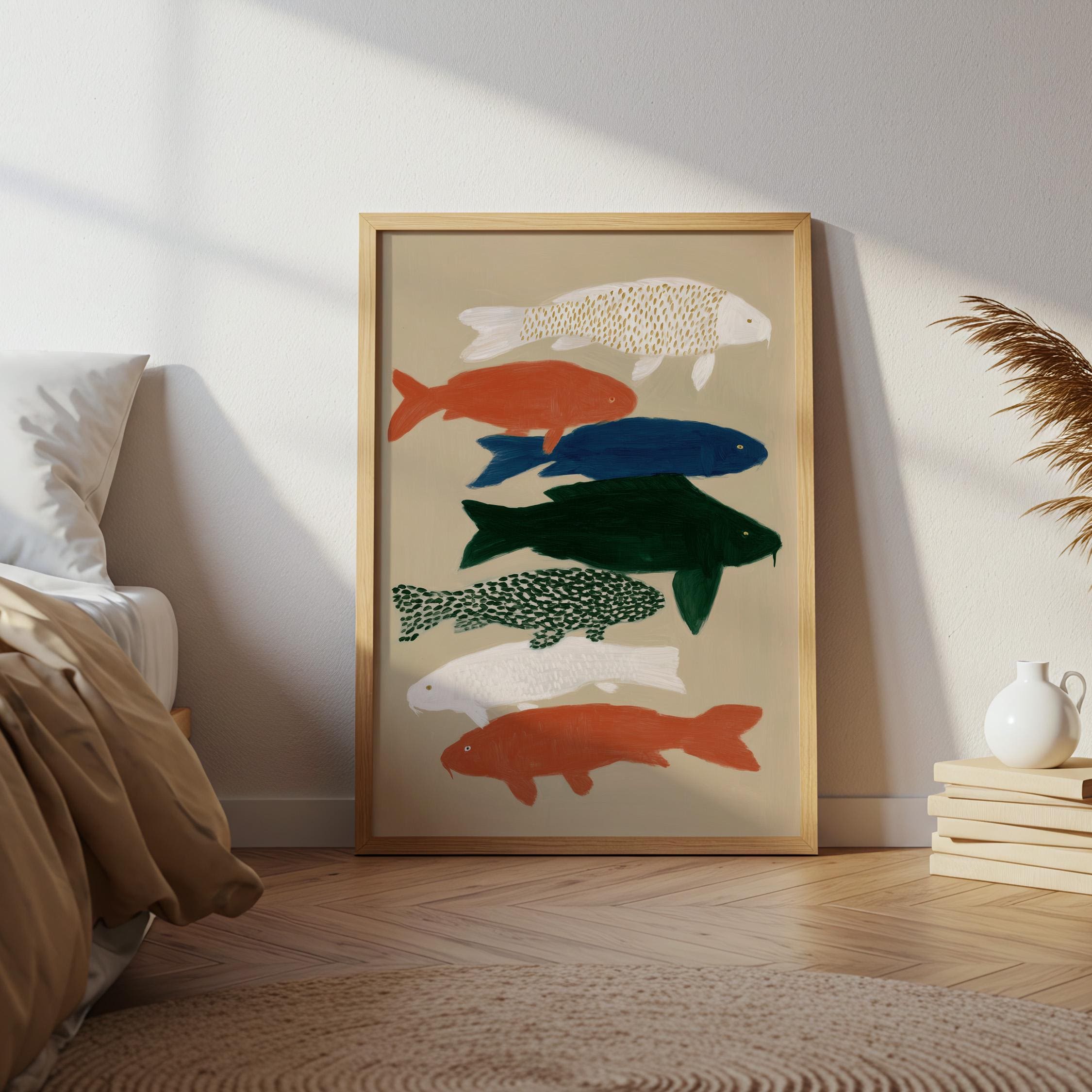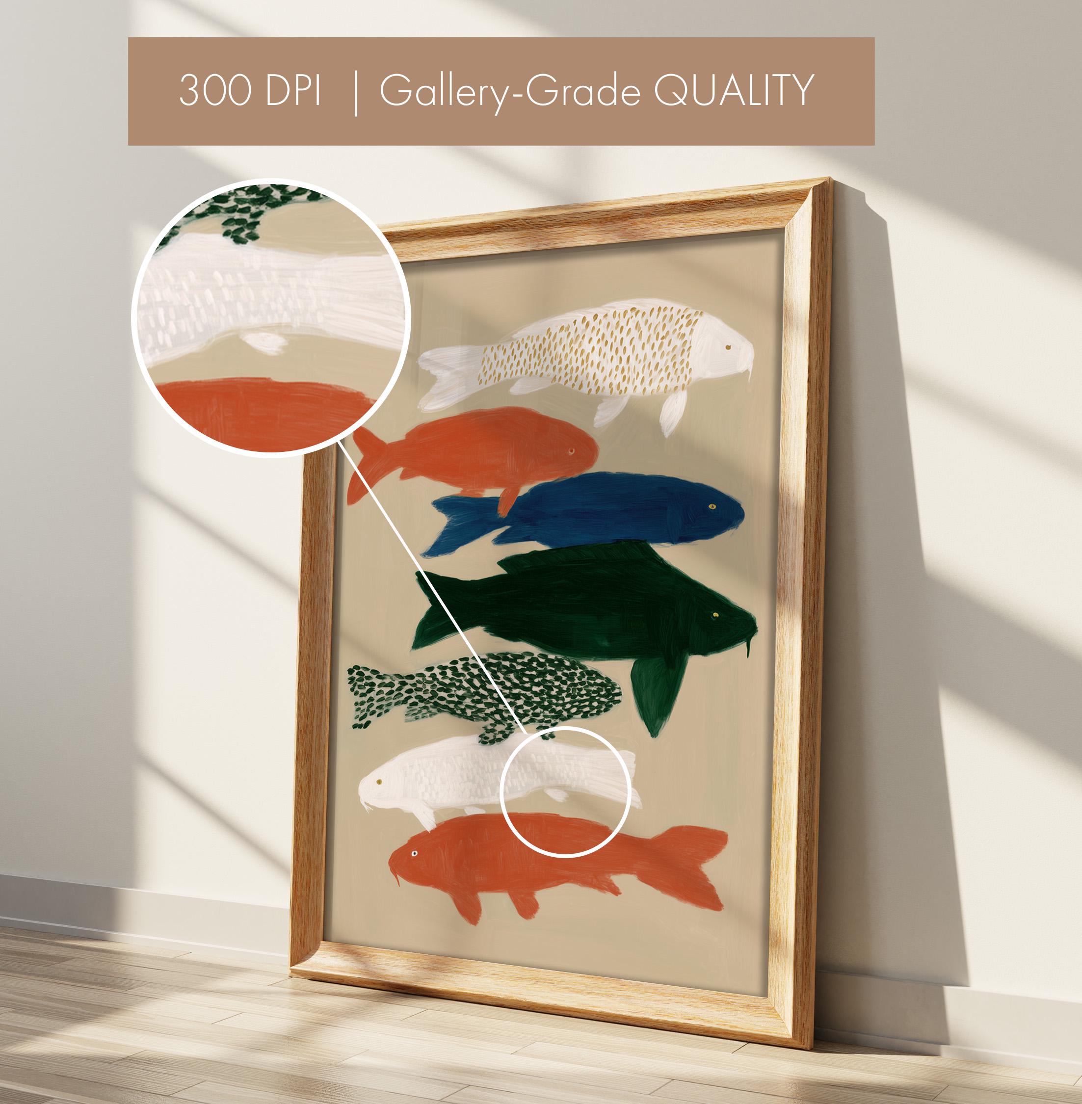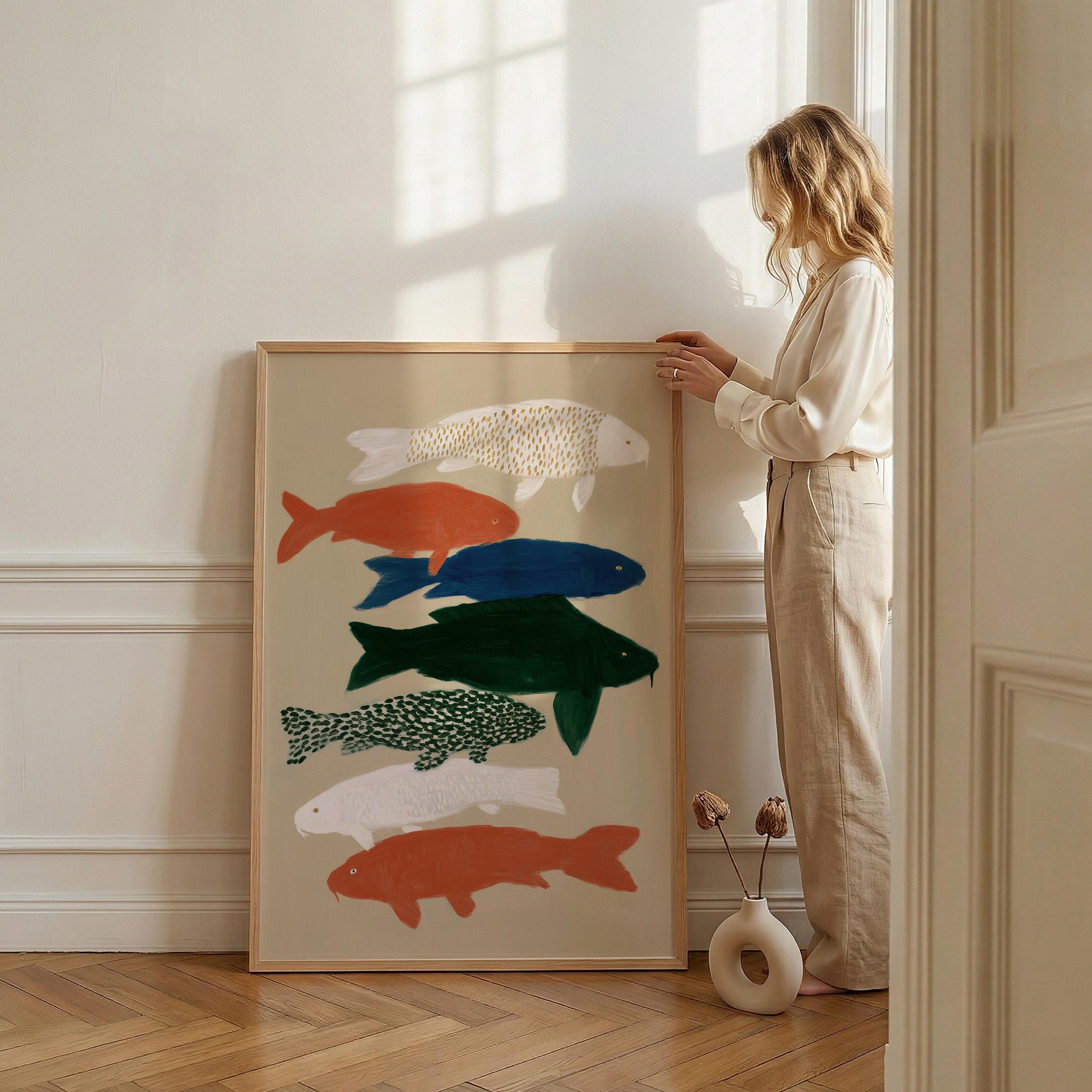 Transform your space with this serene koi fish wall art print featuring seven hand-painted koi in calming colors against a neutral backdrop. Perfect for creating a peaceful retreat in bedrooms, bathrooms, living rooms, or meditation spaces with Japanese-inspired style. Brings tranquil Zen energy and Japandi minimalism to your home with flowing movement and earthy tones.