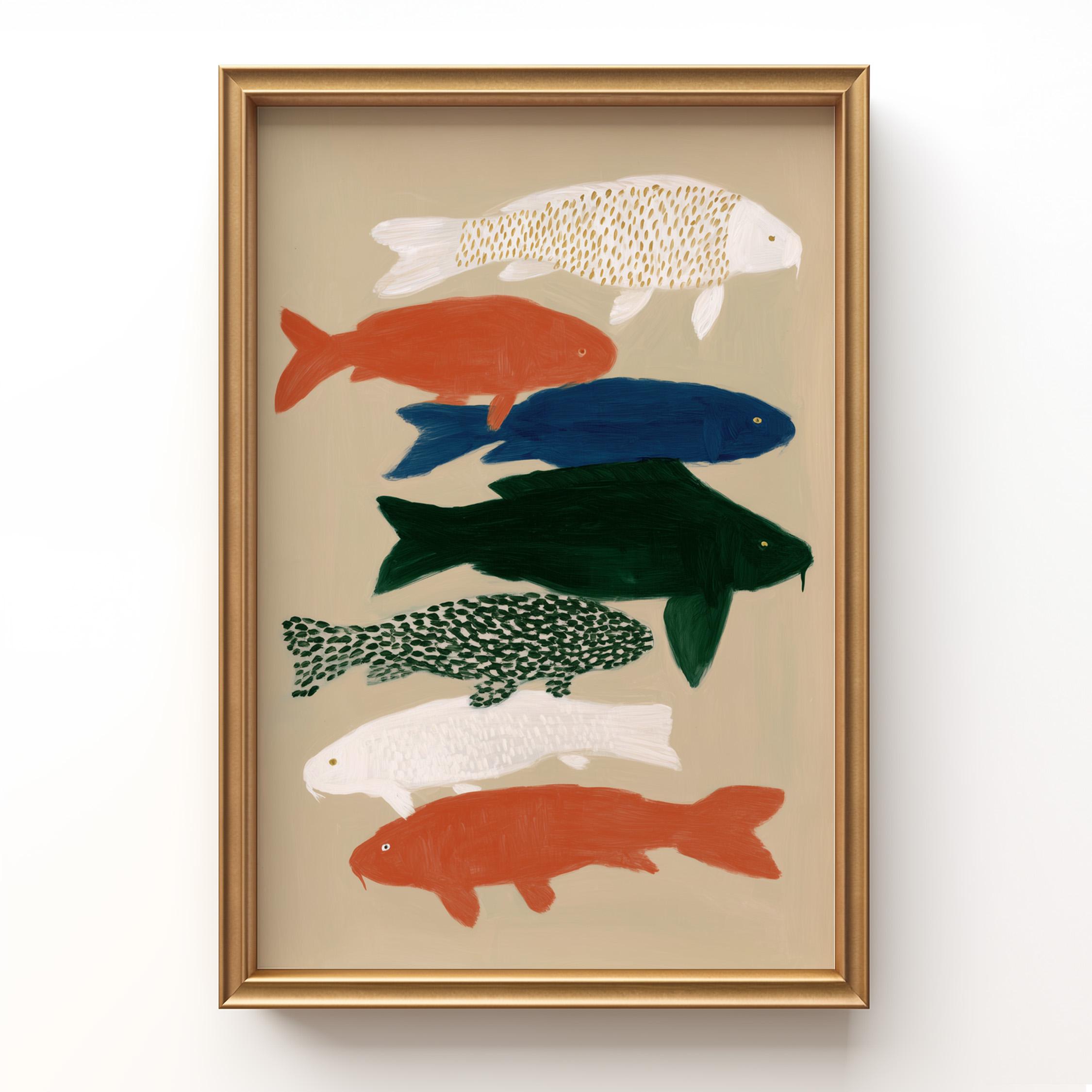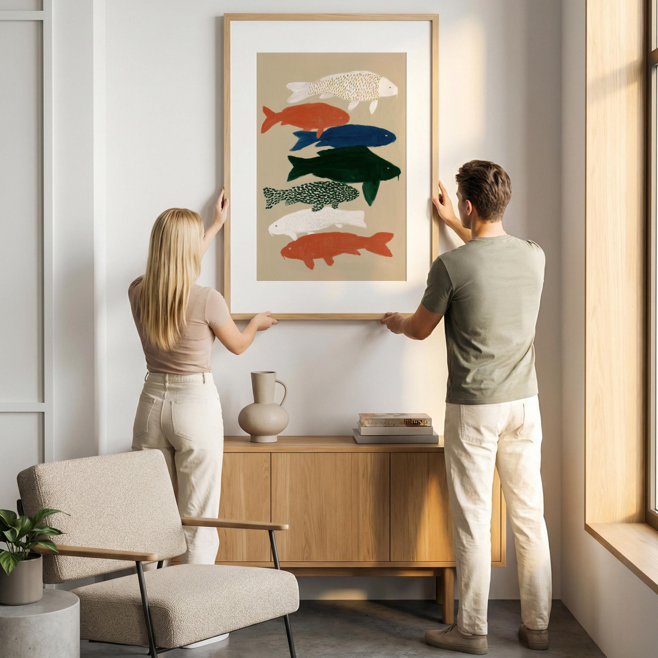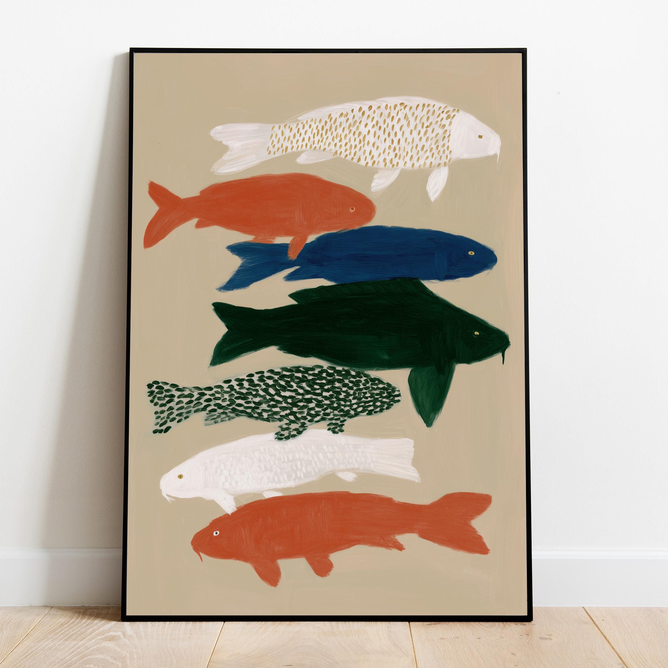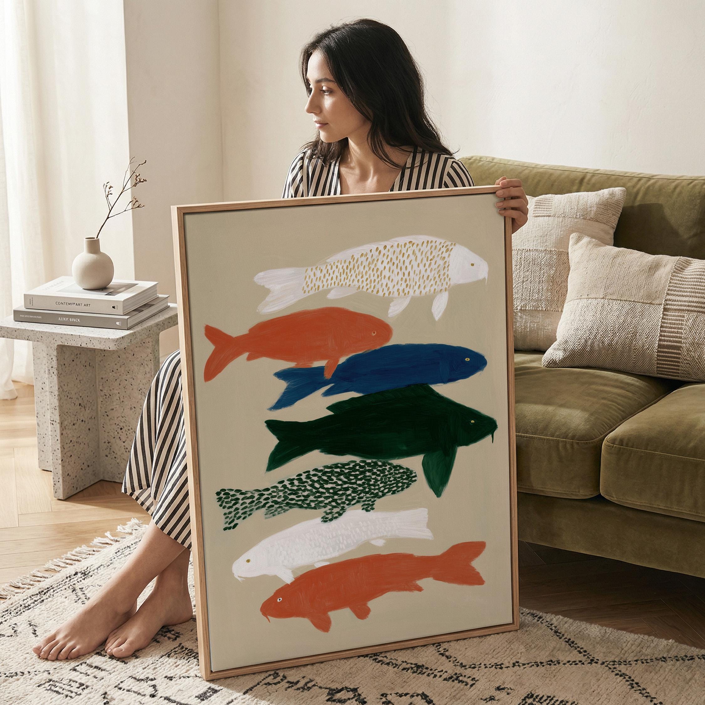 Transform your space with this serene koi fish wall art print featuring seven hand-painted koi in calming colors against a neutral backdrop. Perfect for creating a peaceful retreat in bedrooms, bathrooms, living rooms, or meditation spaces with Japanese-inspired style. Brings tranquil Zen energy and Japandi minimalism to your home with flowing movement and earthy tones.