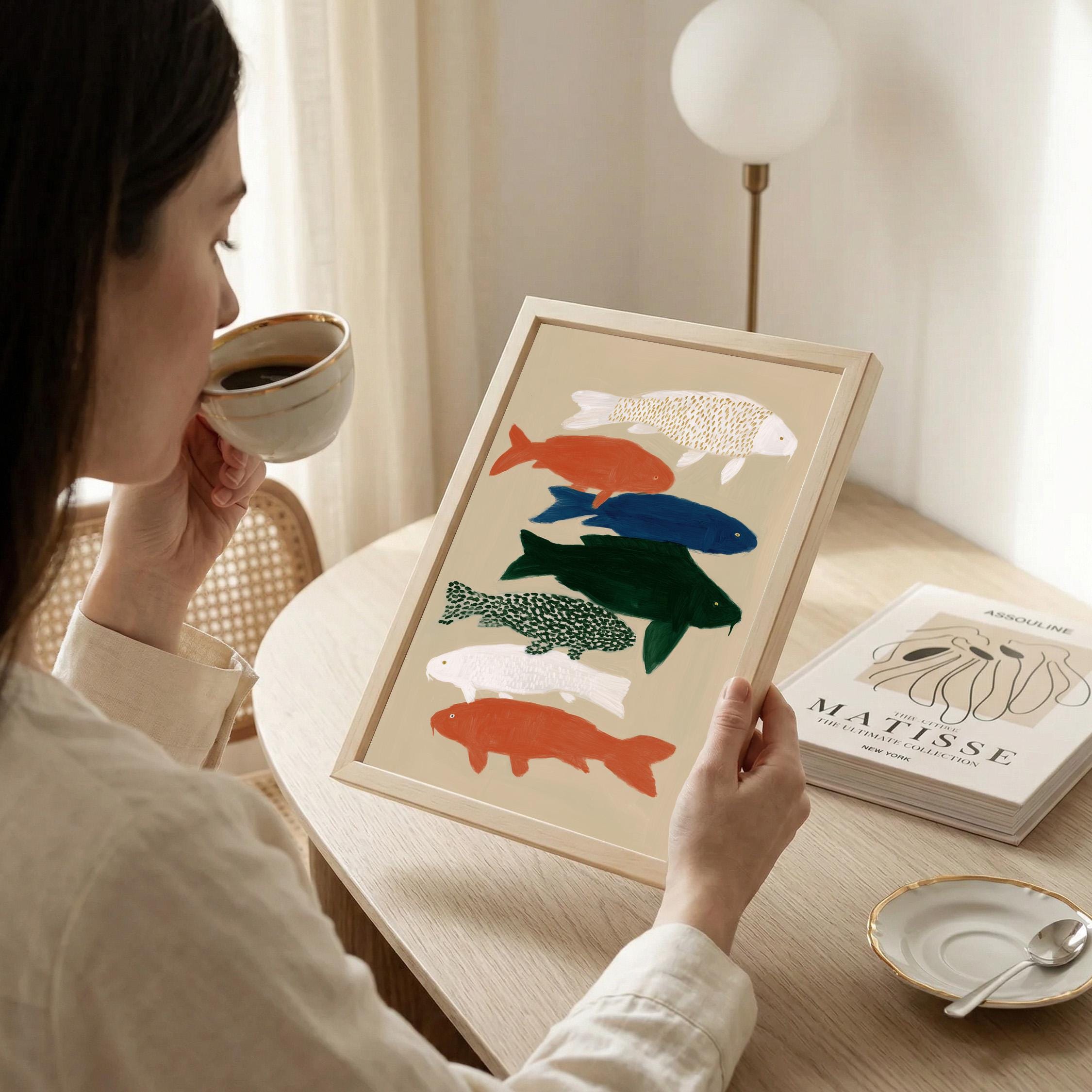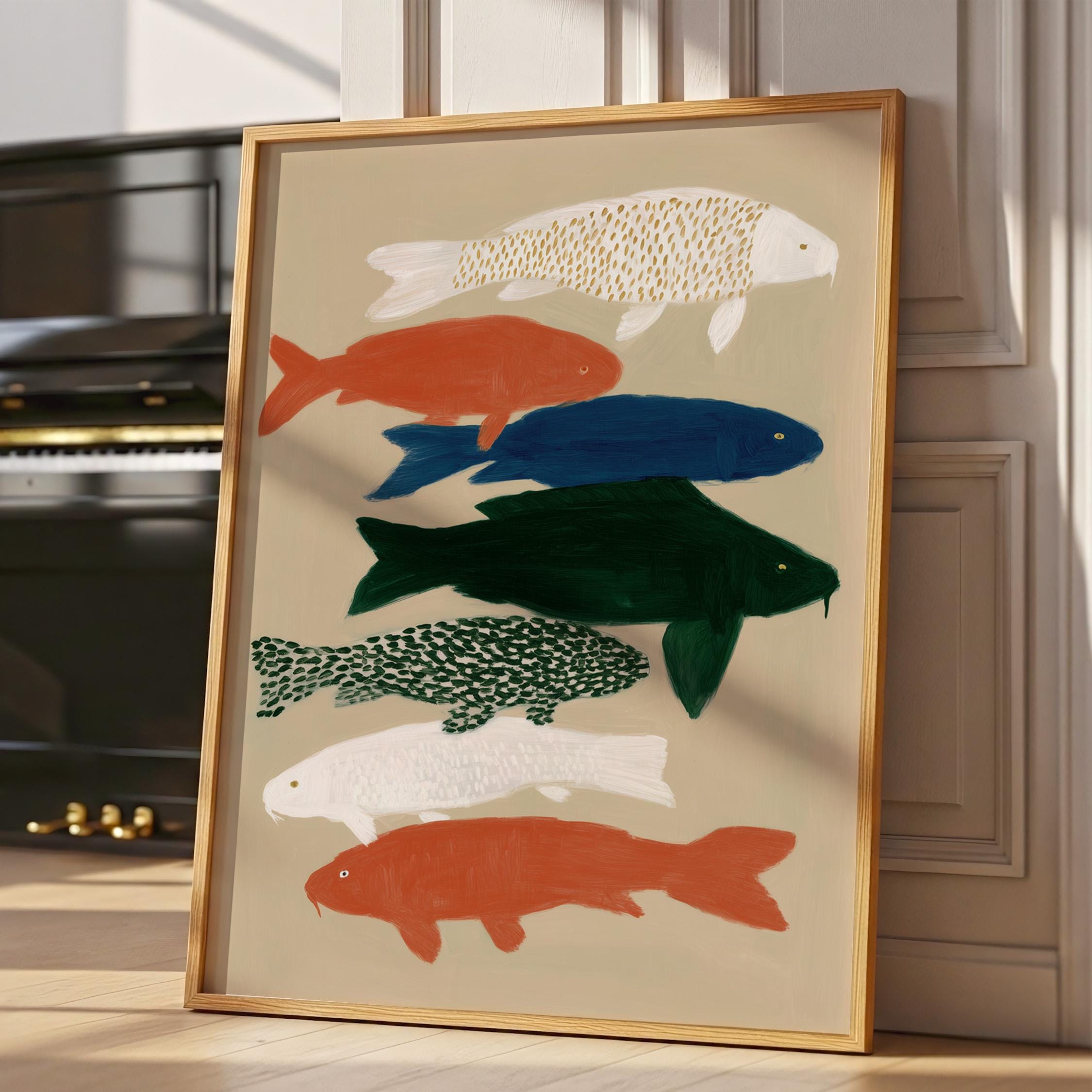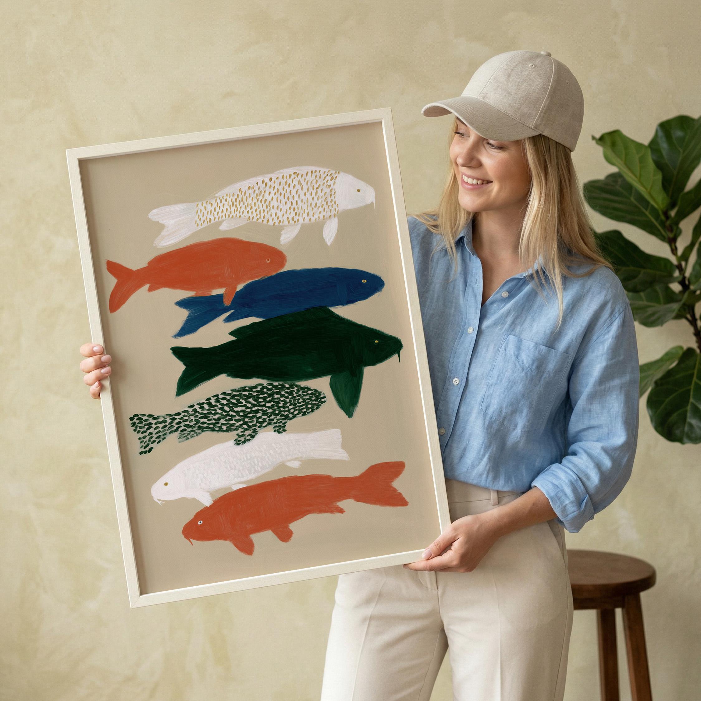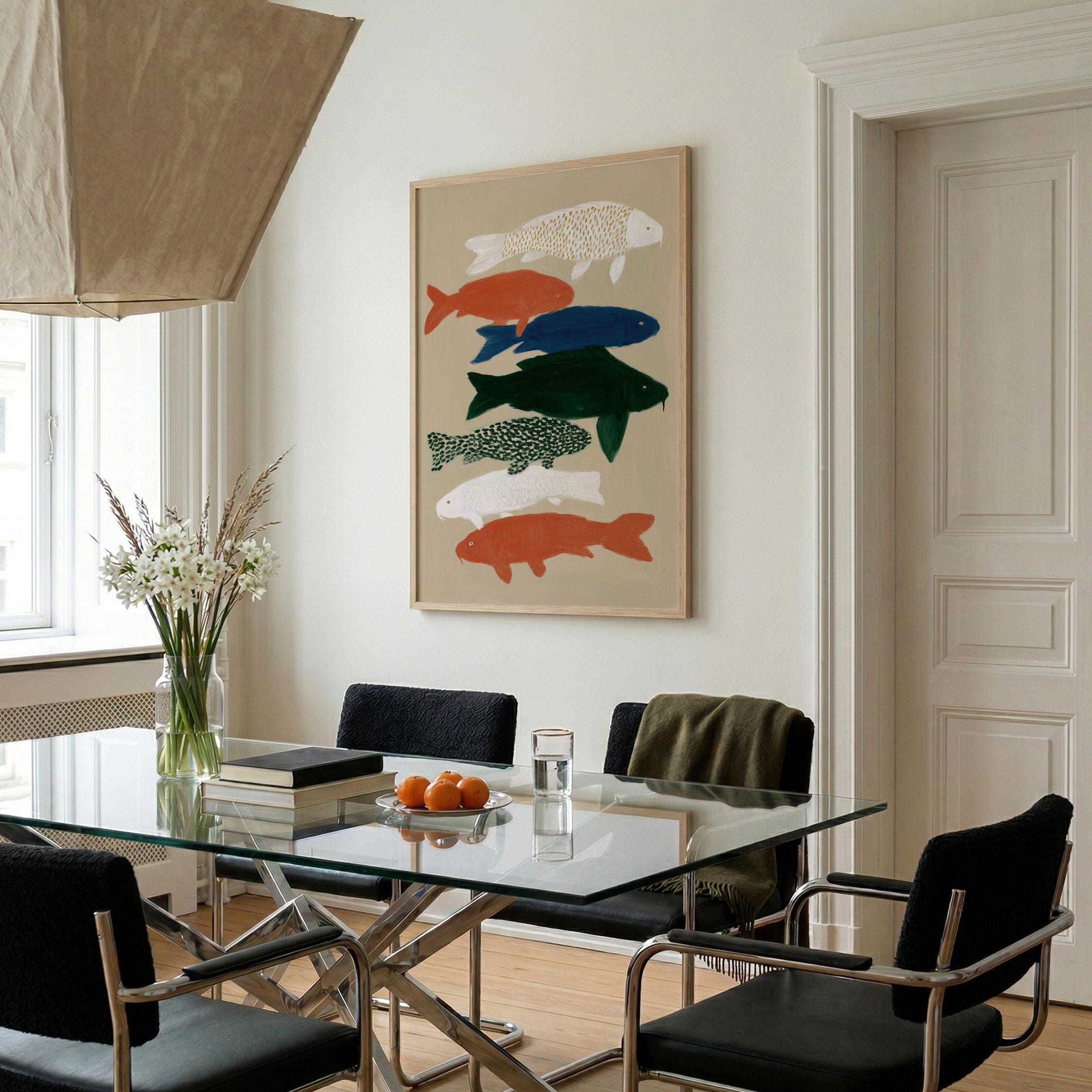 Transform your space with this serene koi fish wall art print featuring seven hand-painted koi in calming colors against a neutral backdrop. Perfect for creating a peaceful retreat in bedrooms, bathrooms, living rooms, or meditation spaces with Japanese-inspired style. Brings tranquil Zen energy and Japandi minimalism to your home with flowing movement and earthy tones.