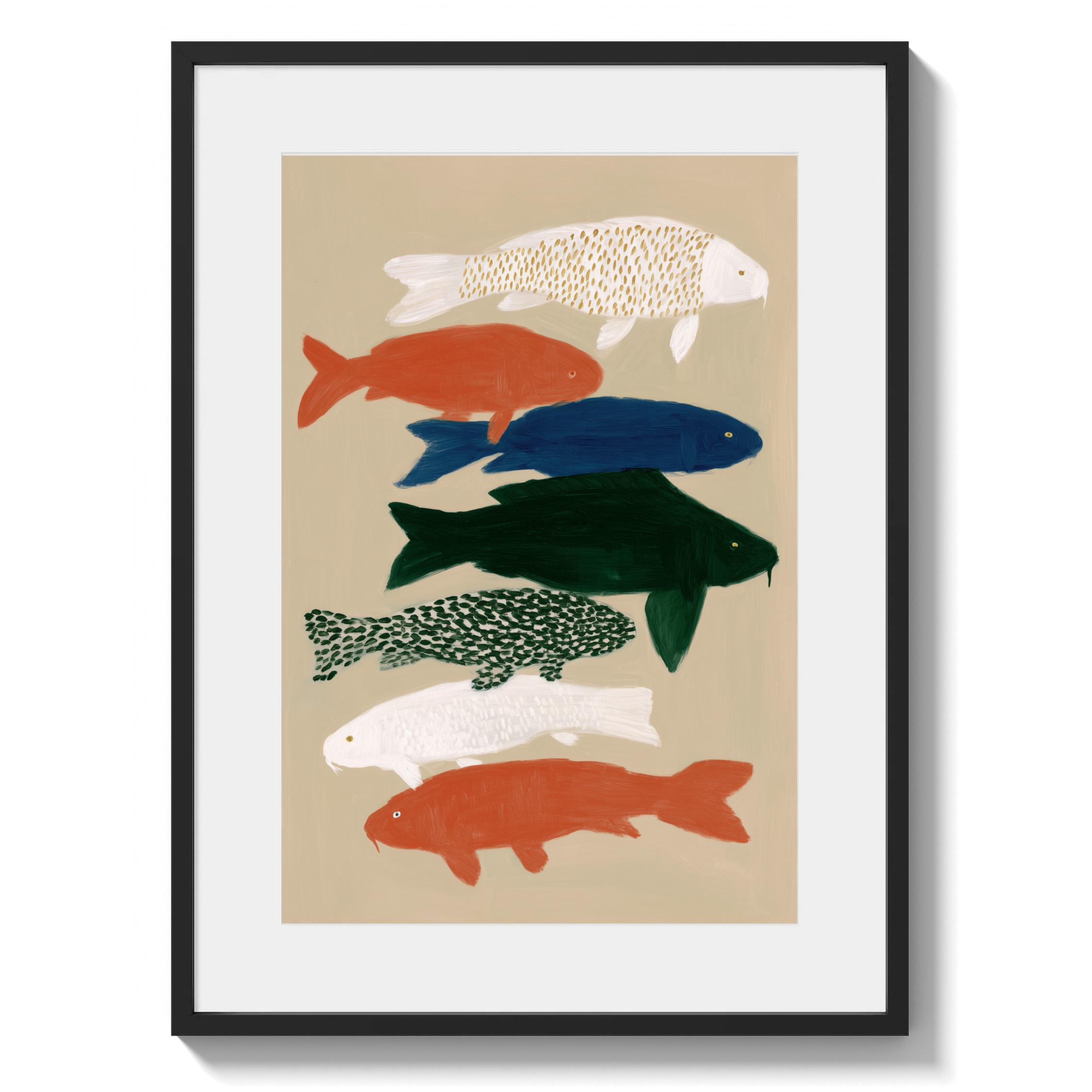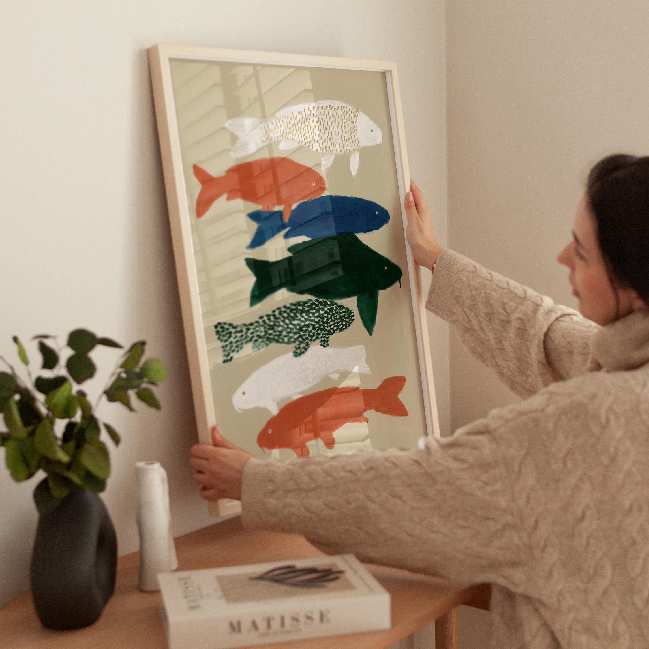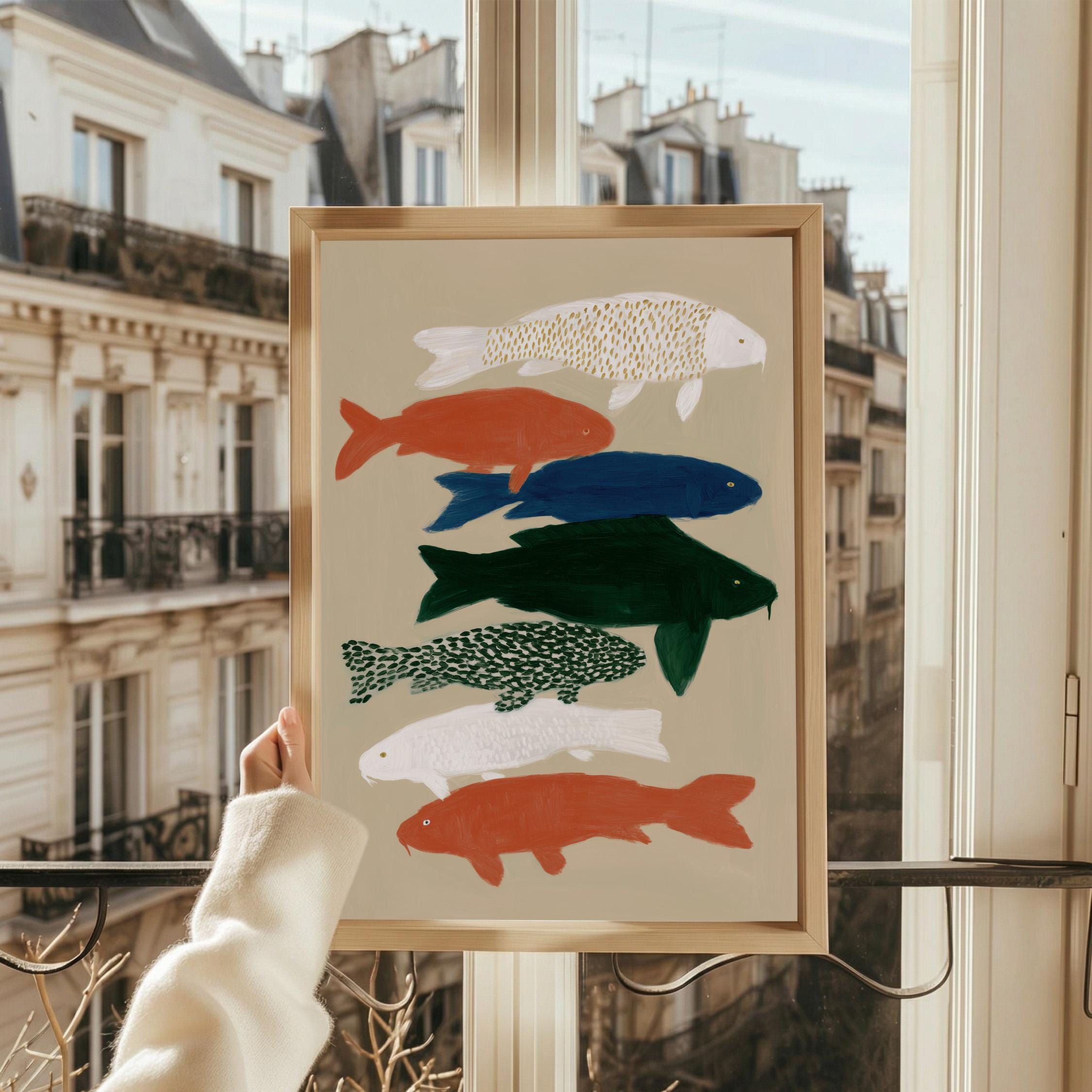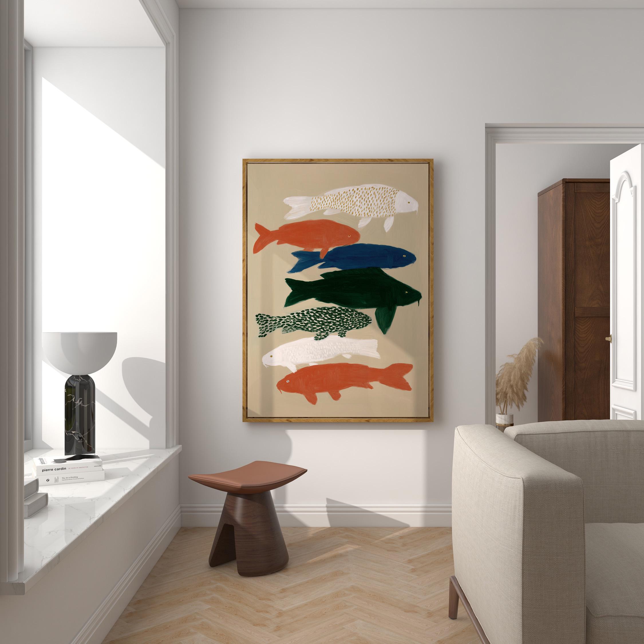 Transform your space with this serene koi fish wall art print featuring seven hand-painted koi in calming colors against a neutral backdrop. Perfect for creating a peaceful retreat in bedrooms, bathrooms, living rooms, or meditation spaces with Japanese-inspired style. Brings tranquil Zen energy and Japandi minimalism to your home with flowing movement and earthy tones.