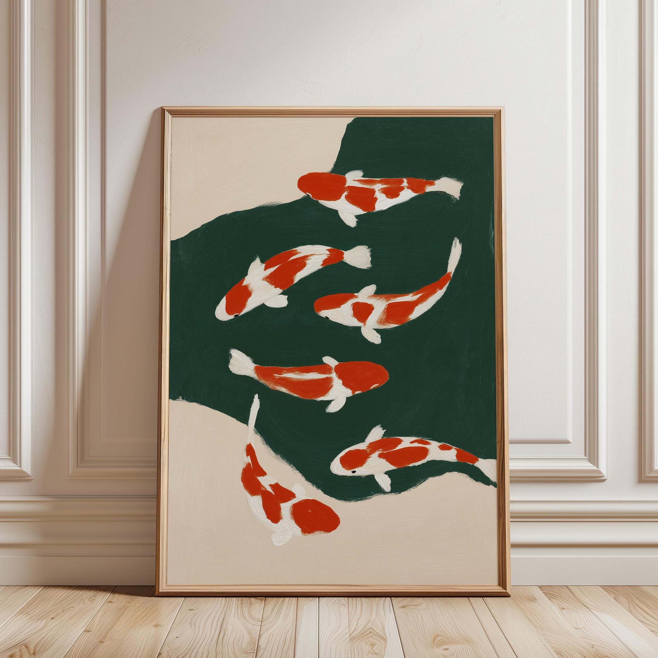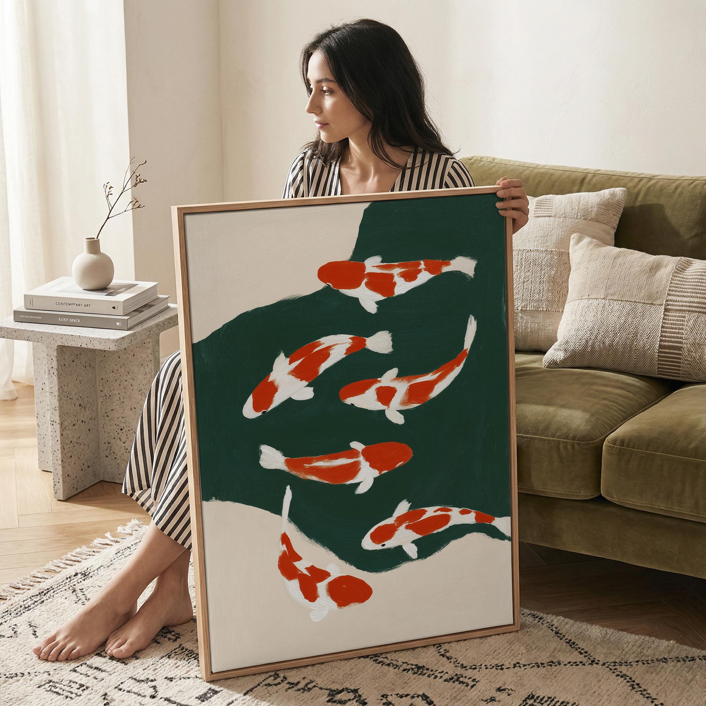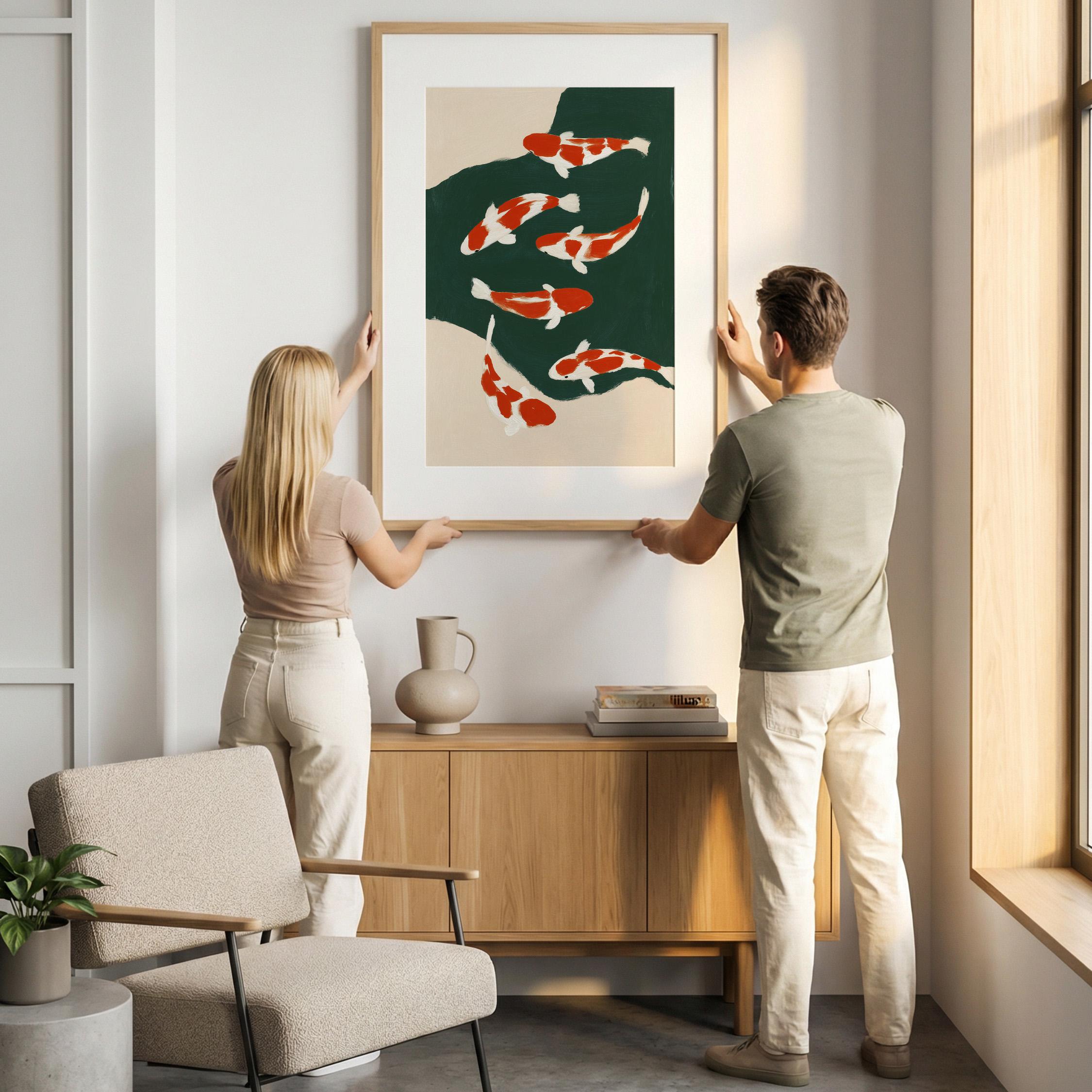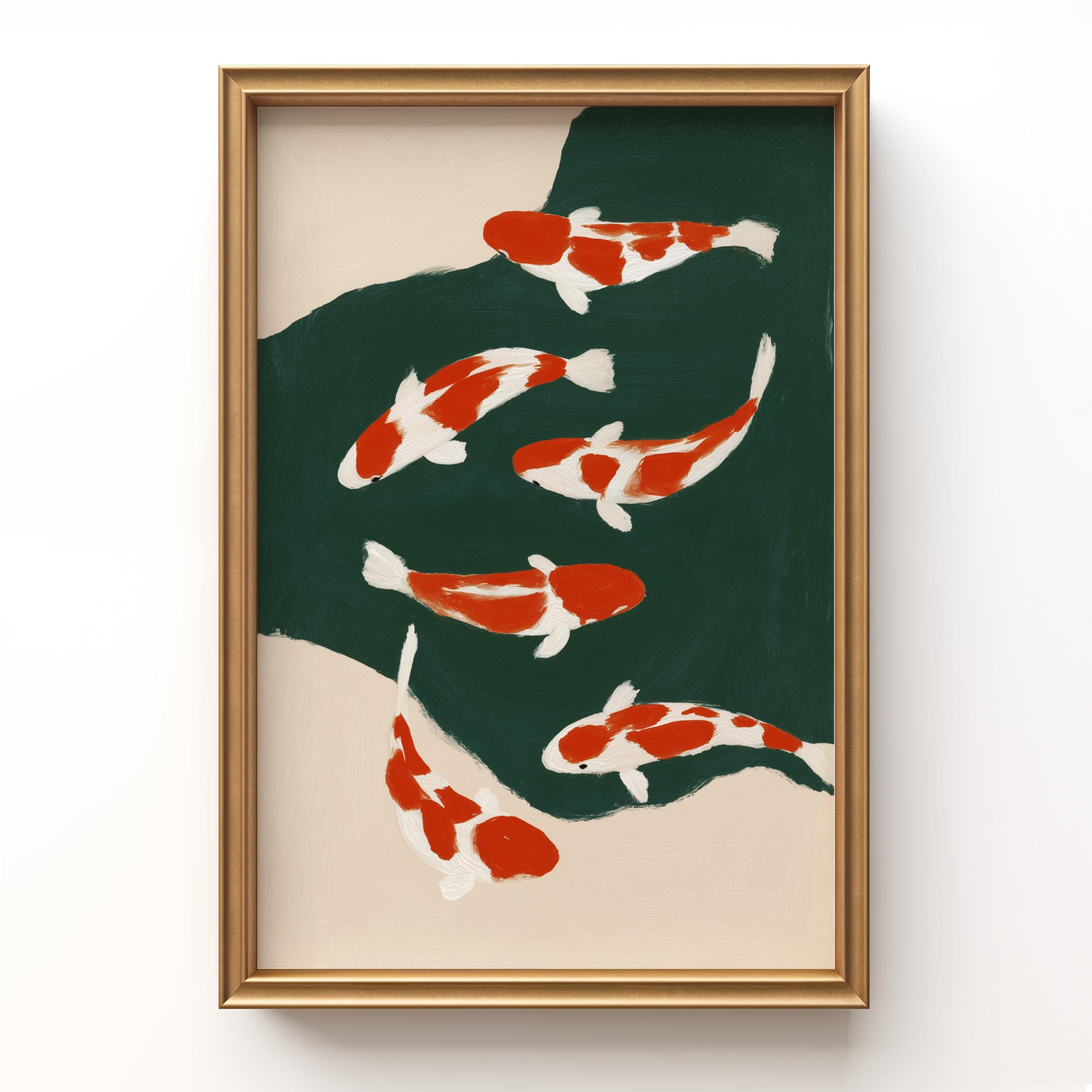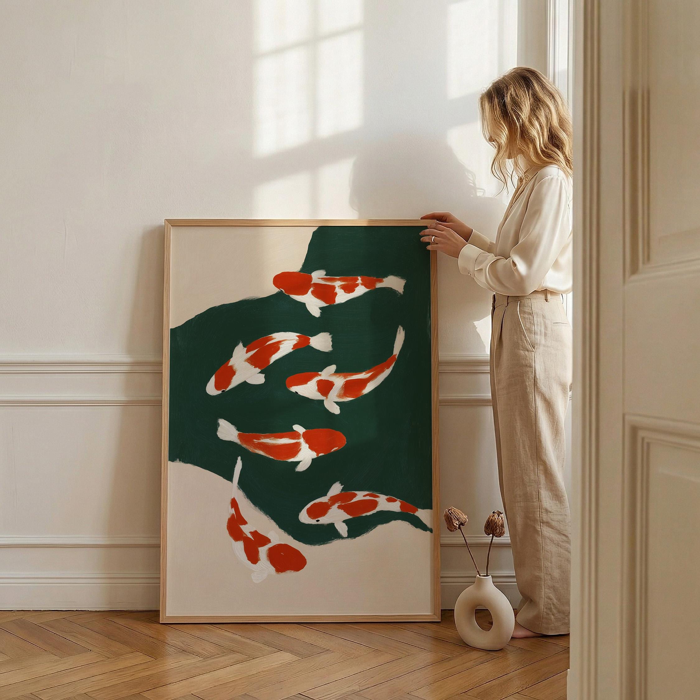 Transform your space with this serene koi fish wall art print featuring elegant orange and white koi swimming in a tranquil green pond. Perfect for living rooms, bedrooms, or meditation spaces seeking a peaceful Japandi aesthetic. This minimalist painting brings calm, zen energy and Asian-inspired beauty to any modern or traditional interior.
