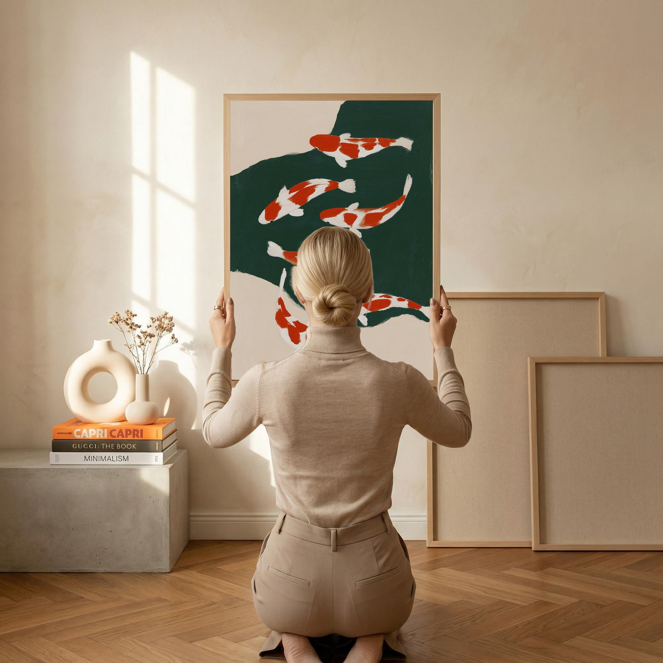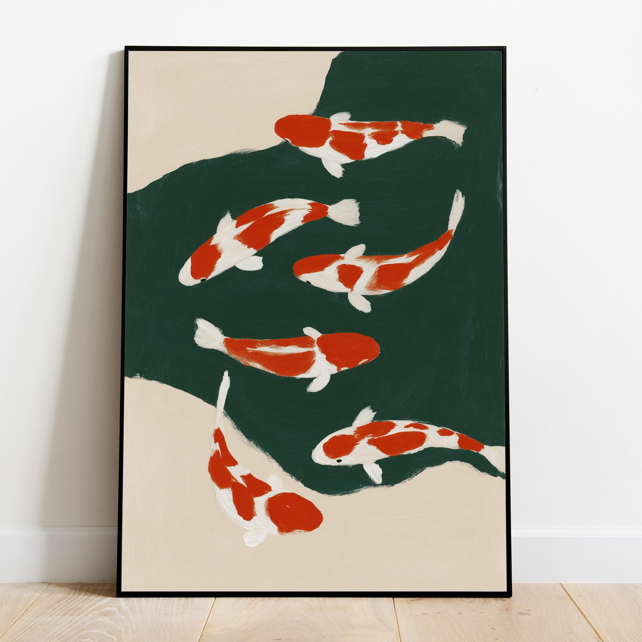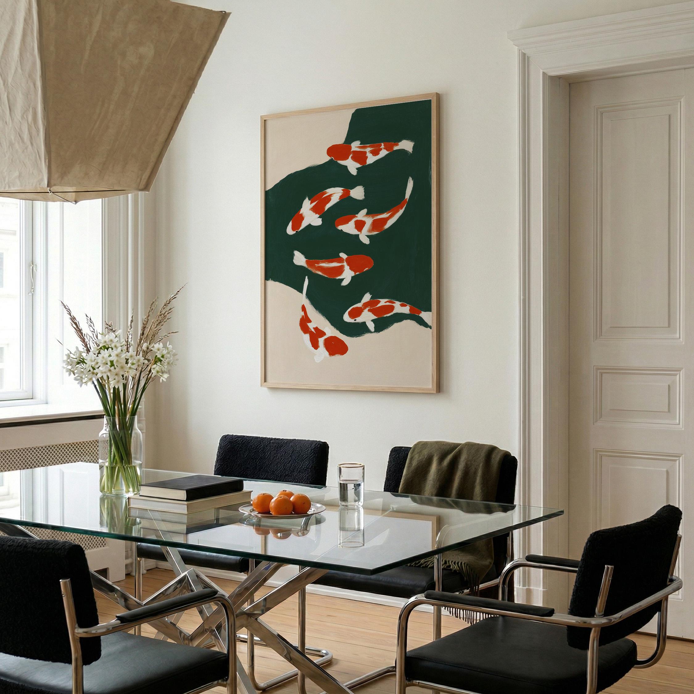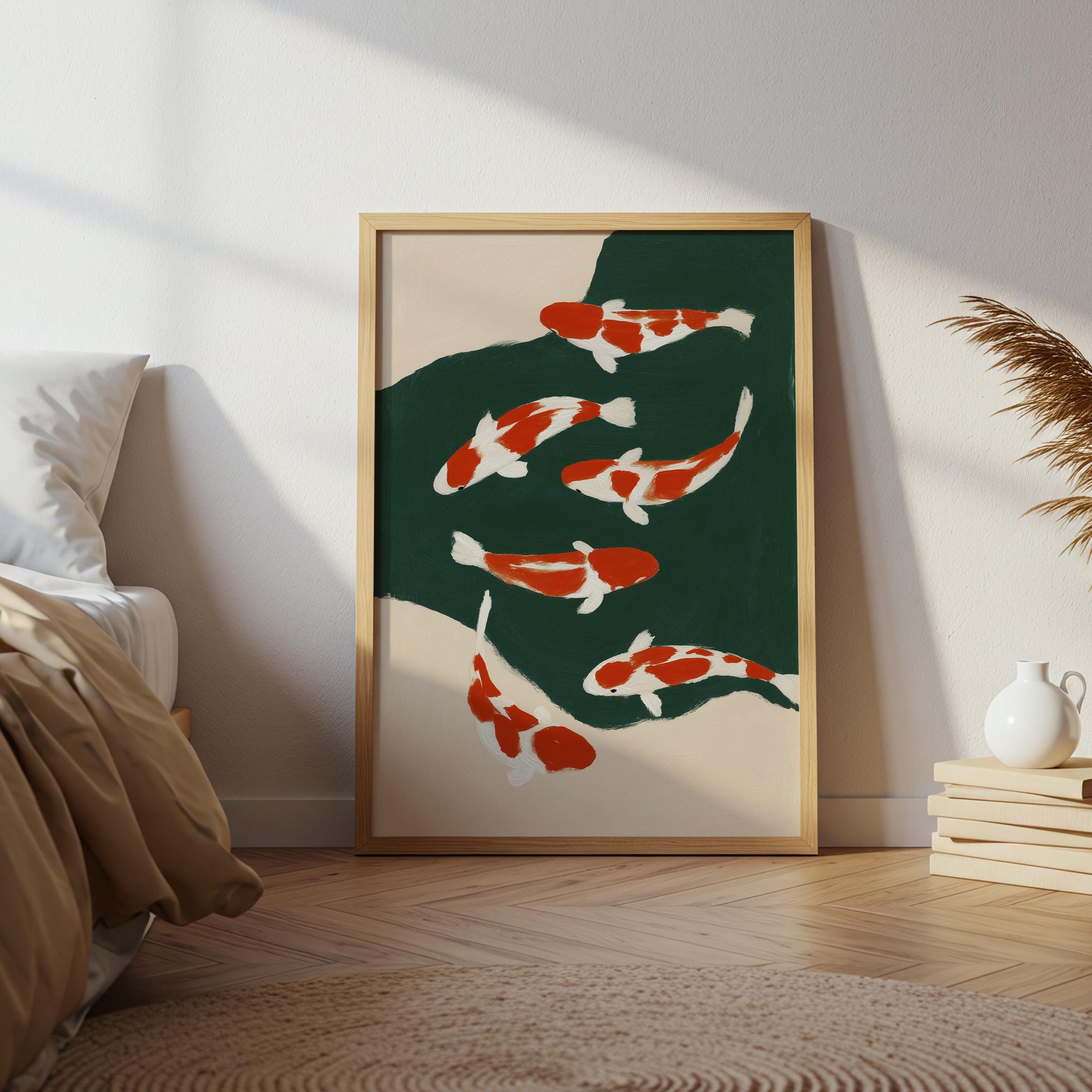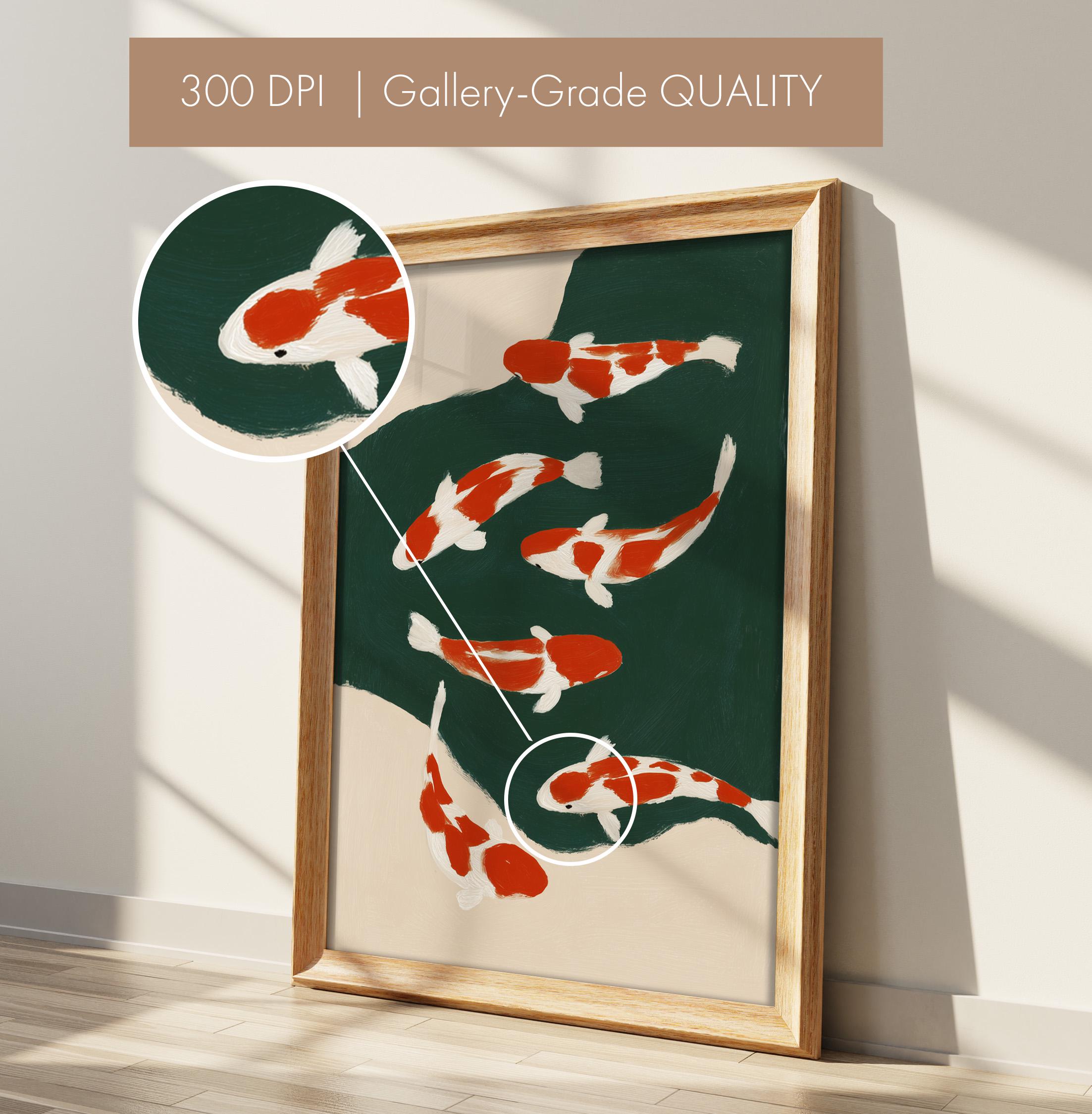 Transform your space with this serene koi fish wall art print featuring elegant orange and white koi swimming in a tranquil green pond. Perfect for living rooms, bedrooms, or meditation spaces seeking a peaceful Japandi aesthetic. This minimalist painting brings calm, zen energy and Asian-inspired beauty to any modern or traditional interior.
