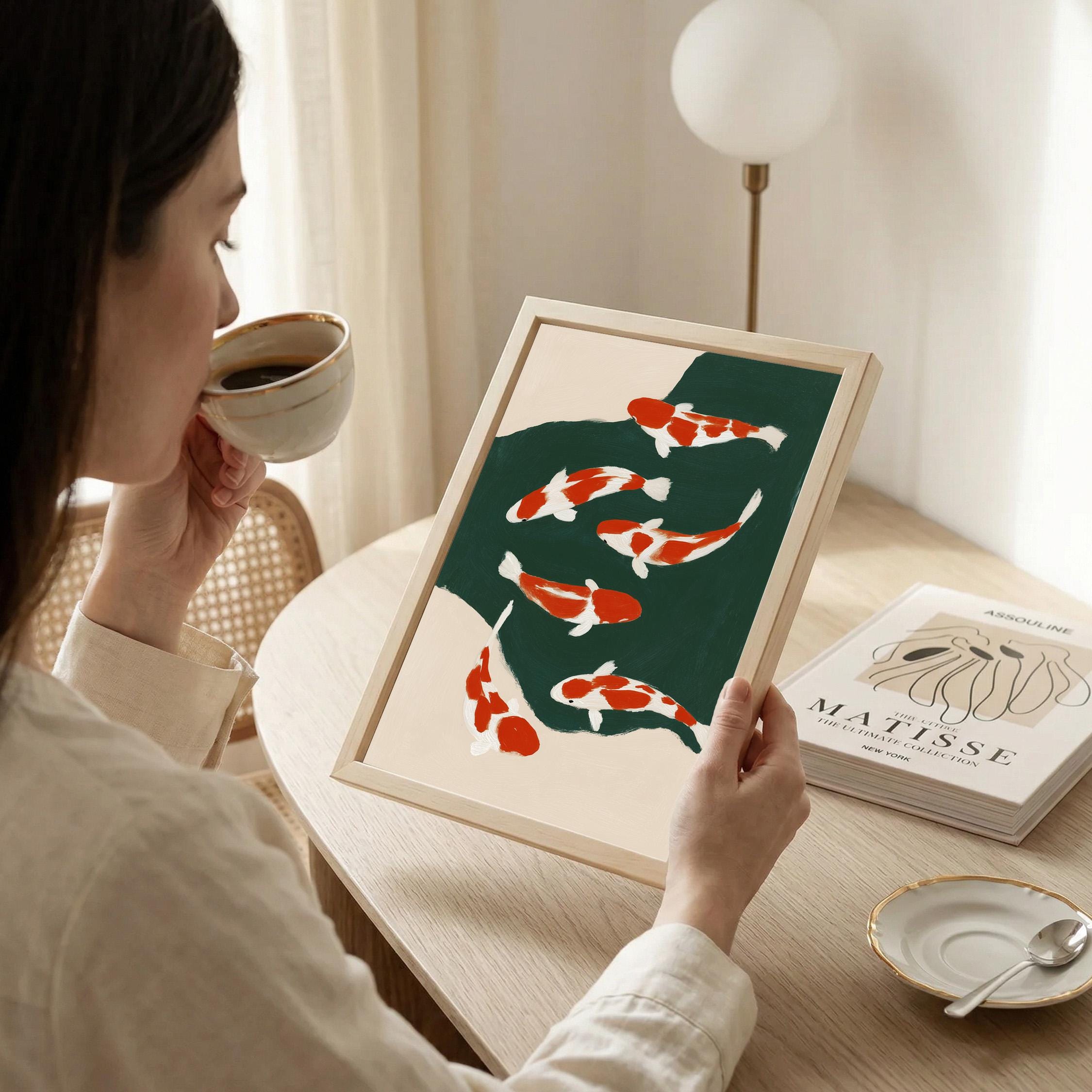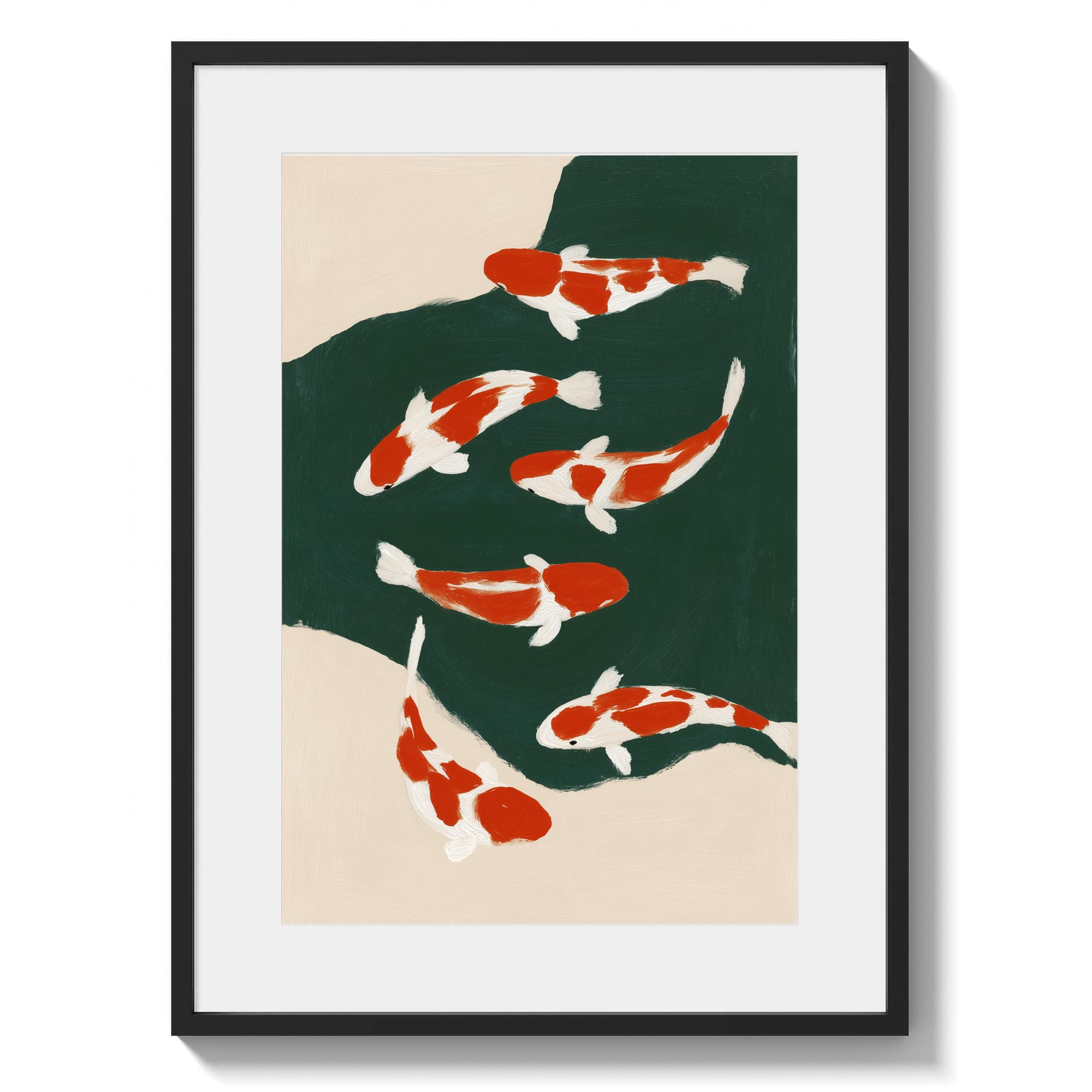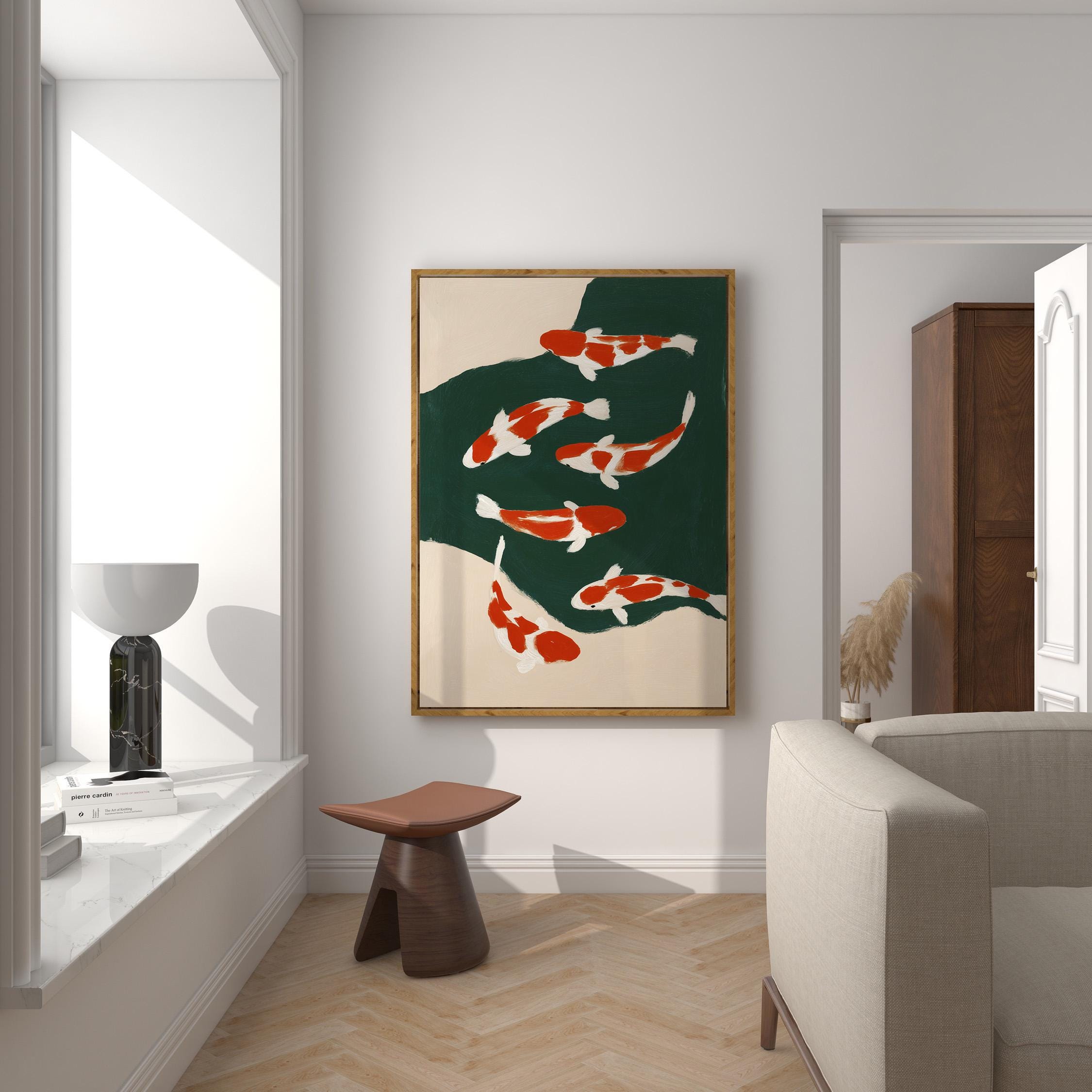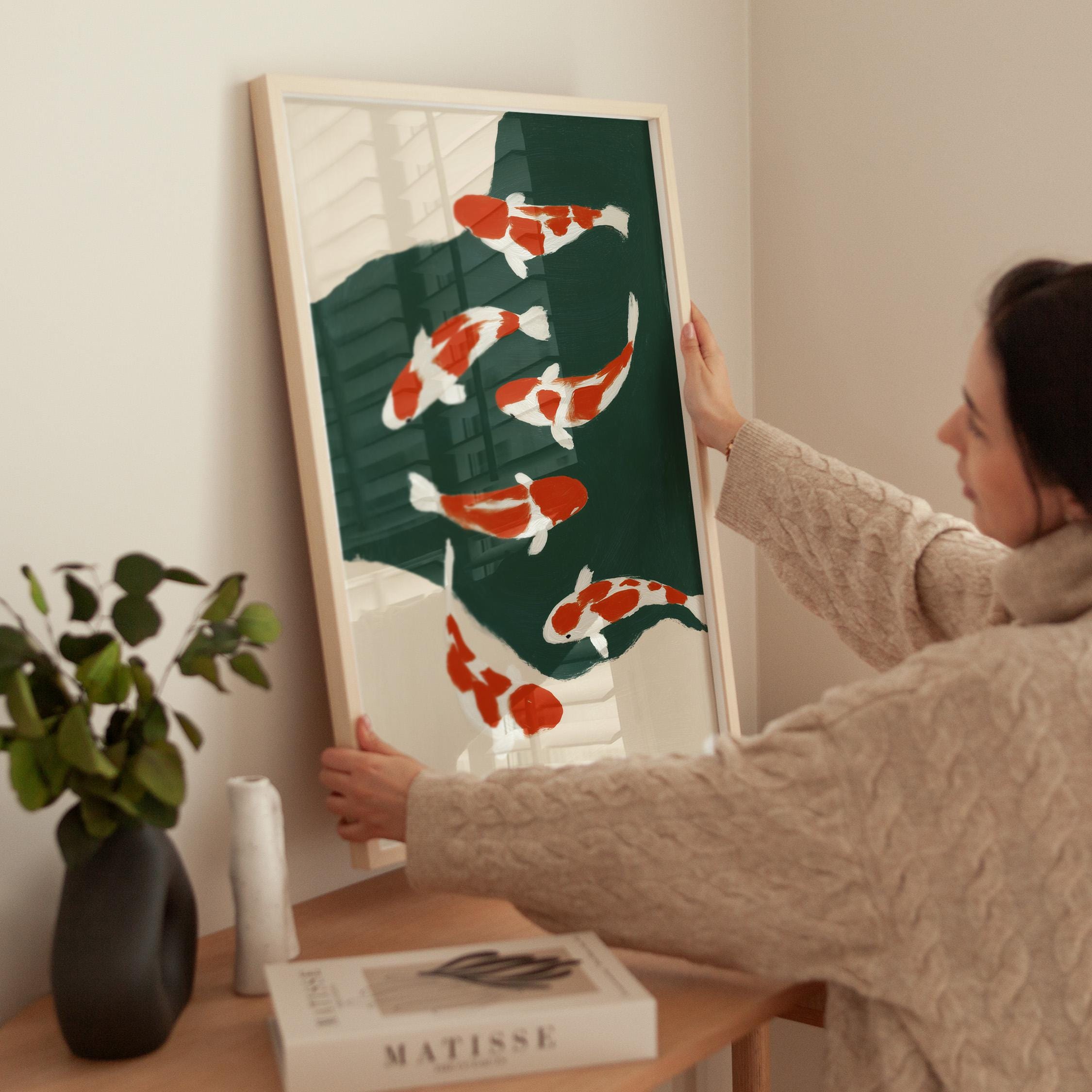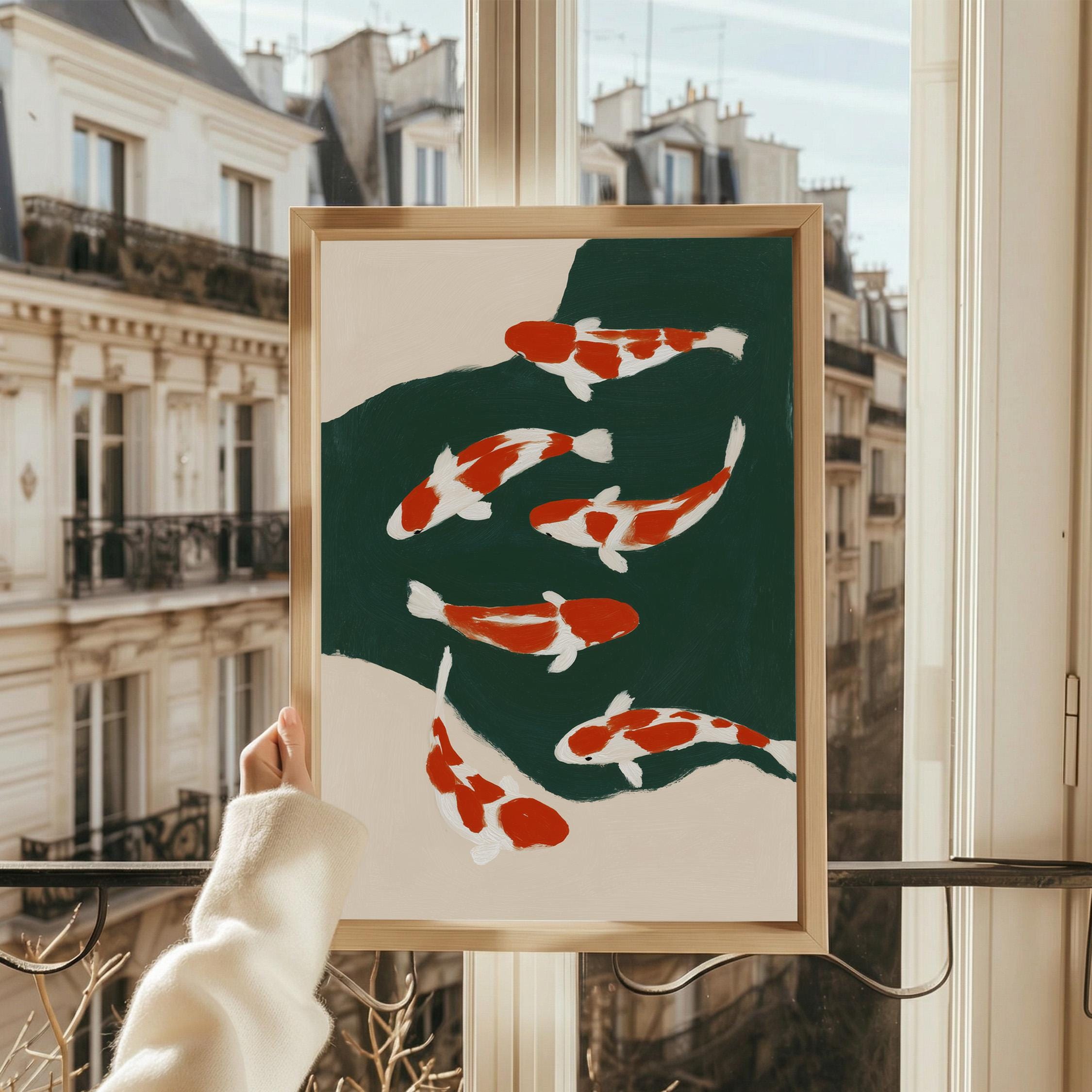 Transform your space with this serene koi fish wall art print featuring elegant orange and white koi swimming in a tranquil green pond. Perfect for living rooms, bedrooms, or meditation spaces seeking a peaceful Japandi aesthetic. This minimalist painting brings calm, zen energy and Asian-inspired beauty to any modern or traditional interior.