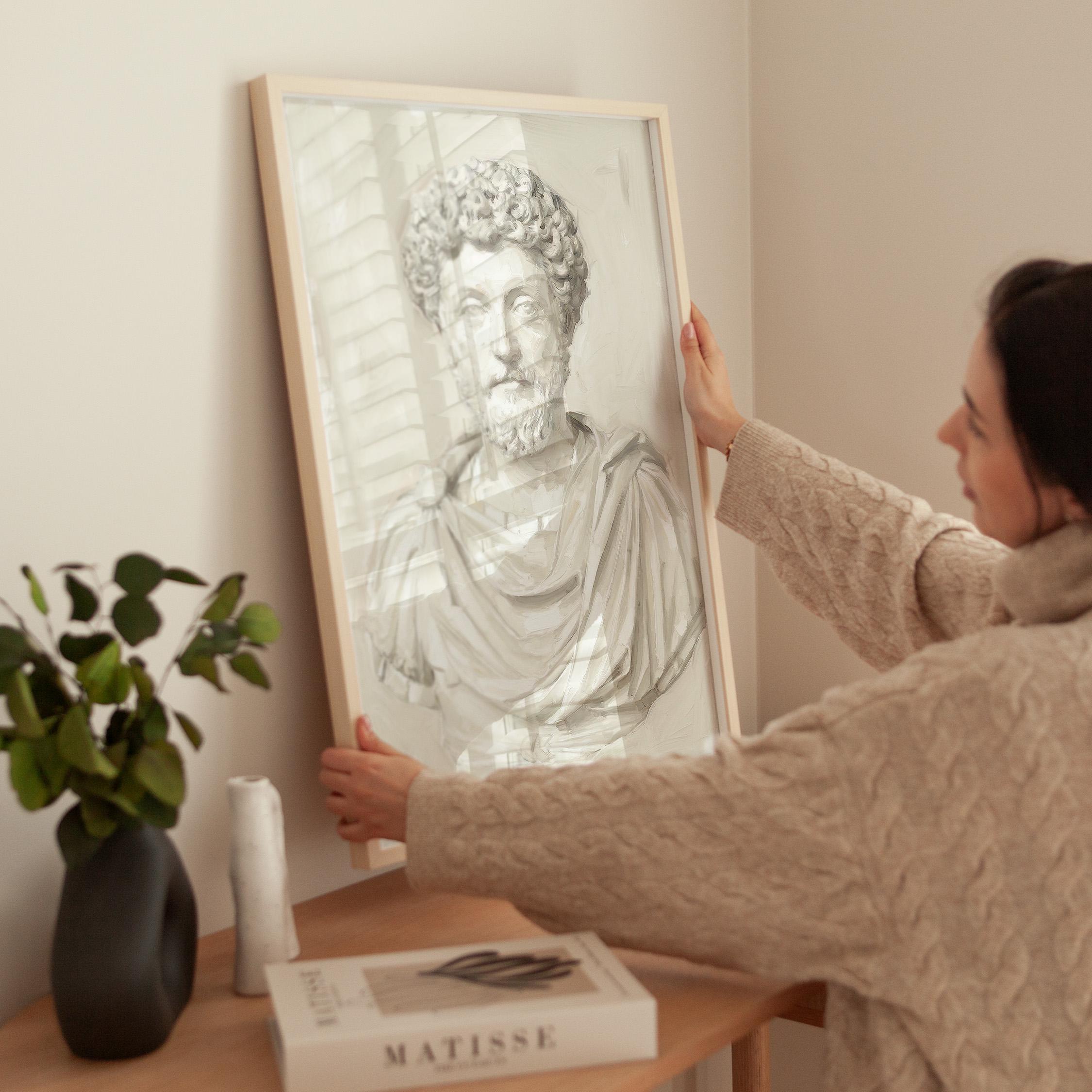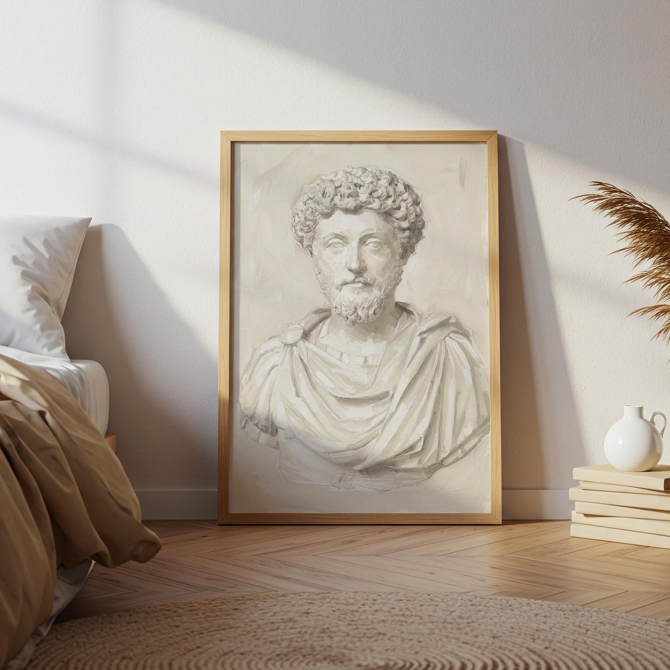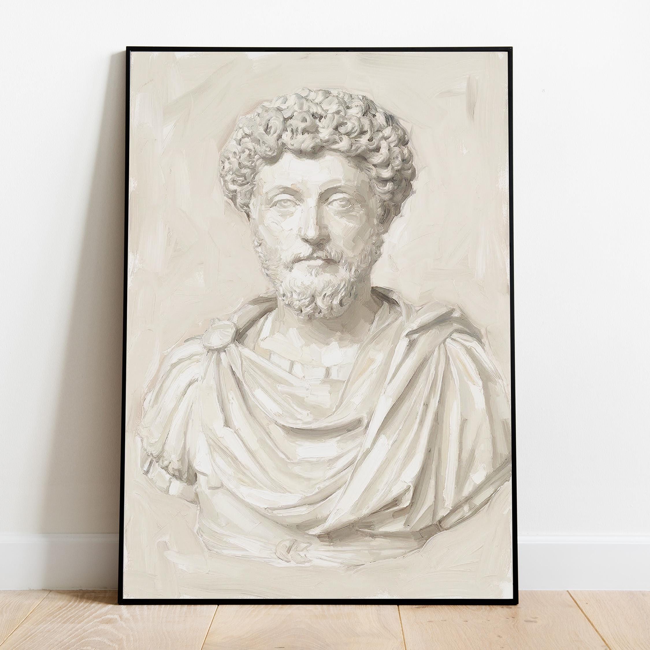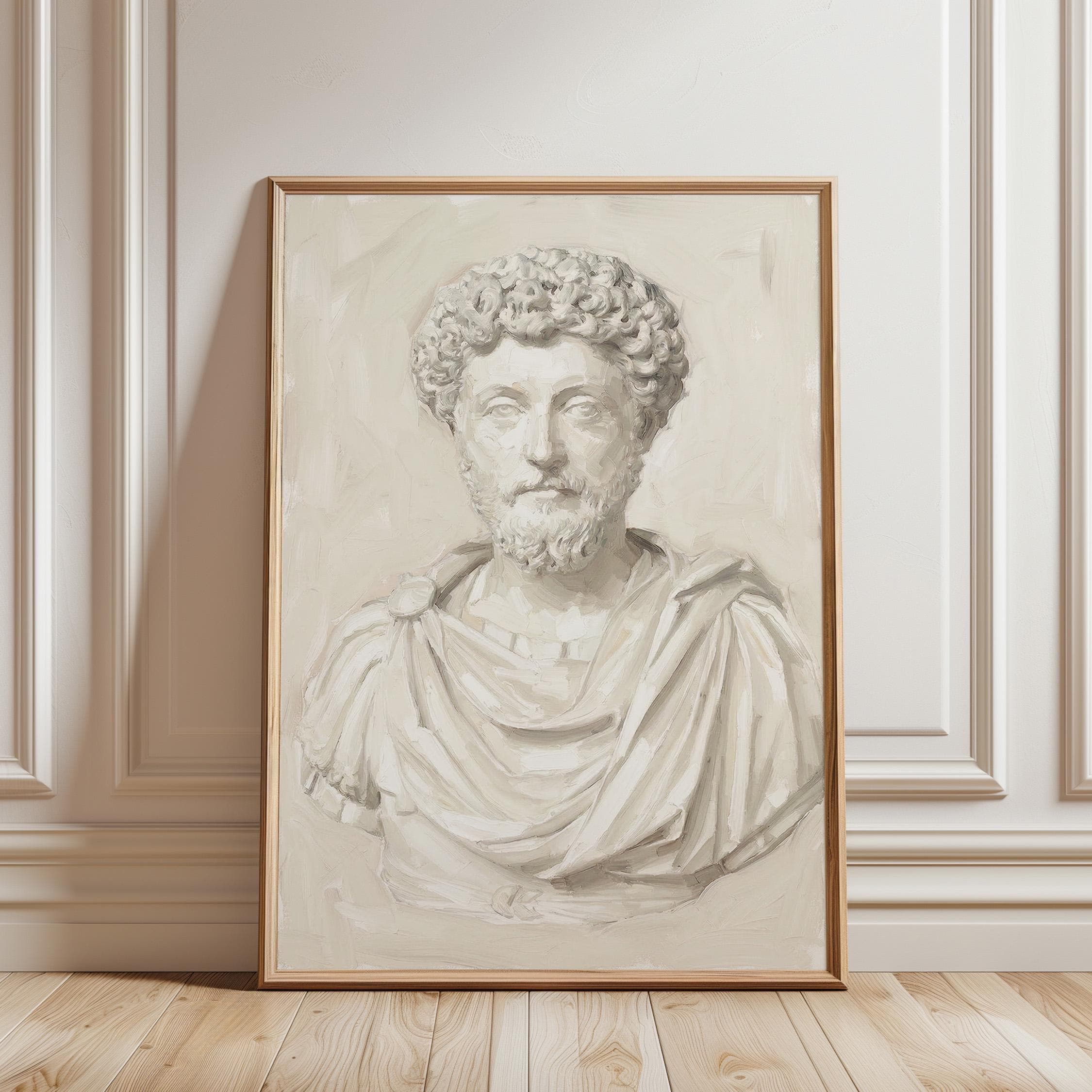This Marcus Aurelius wall art print features a beautifully rendered oil painting of the iconic Roman emperor and Stoic philosopher in soft neutral tones.