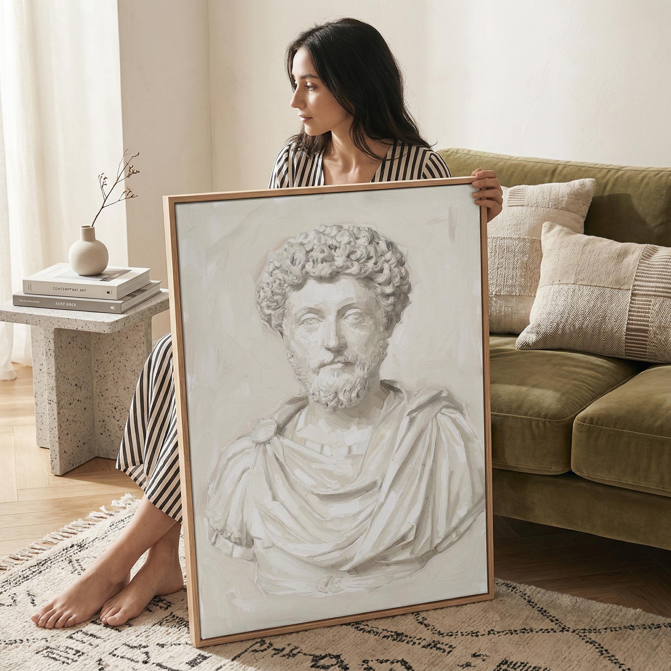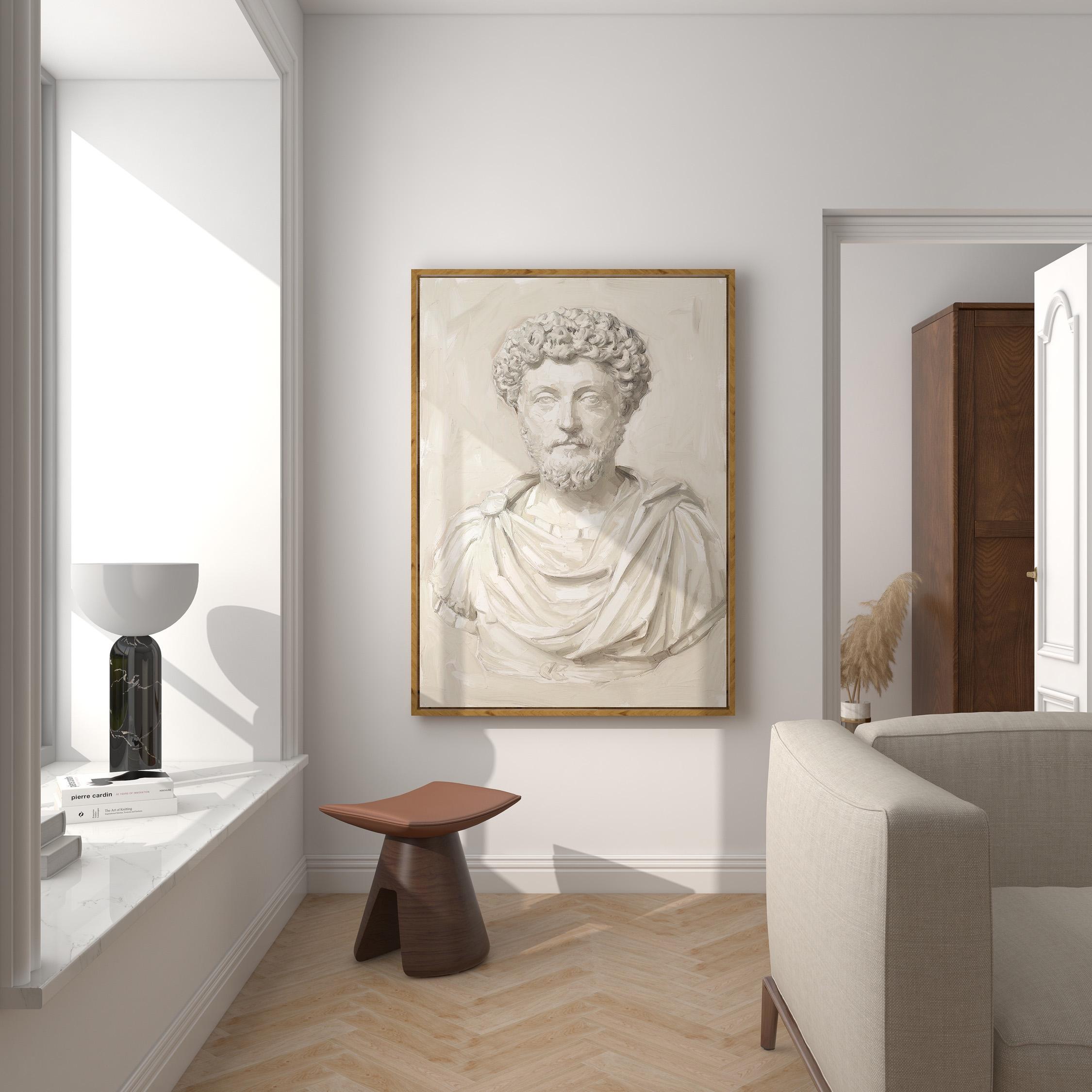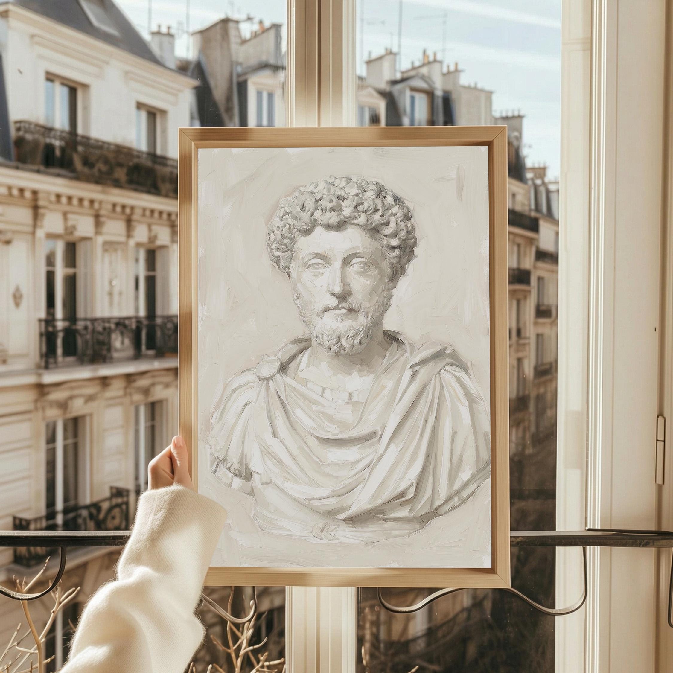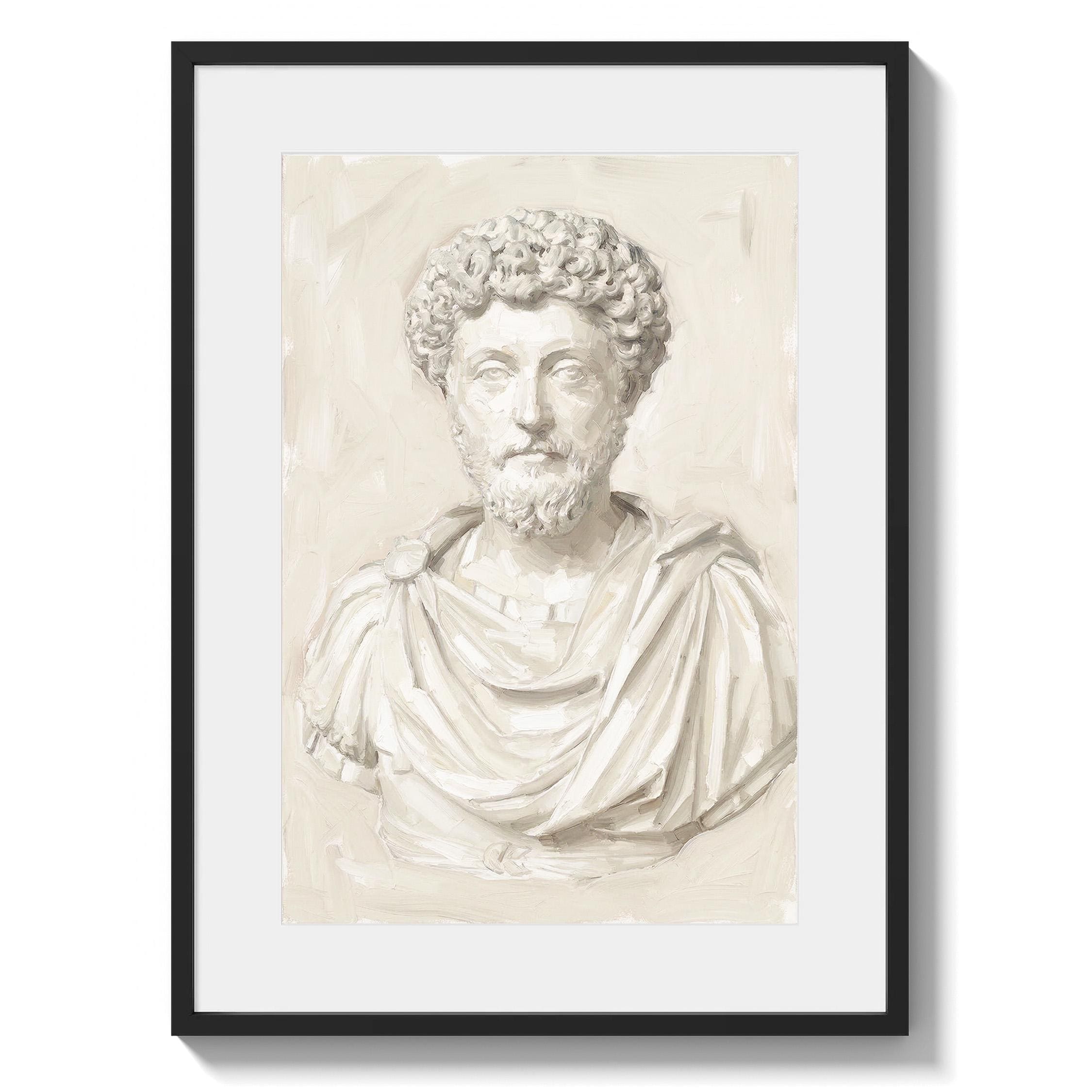This Marcus Aurelius wall art print features a beautifully rendered oil painting of the iconic Roman emperor and Stoic philosopher in soft neutral tones.