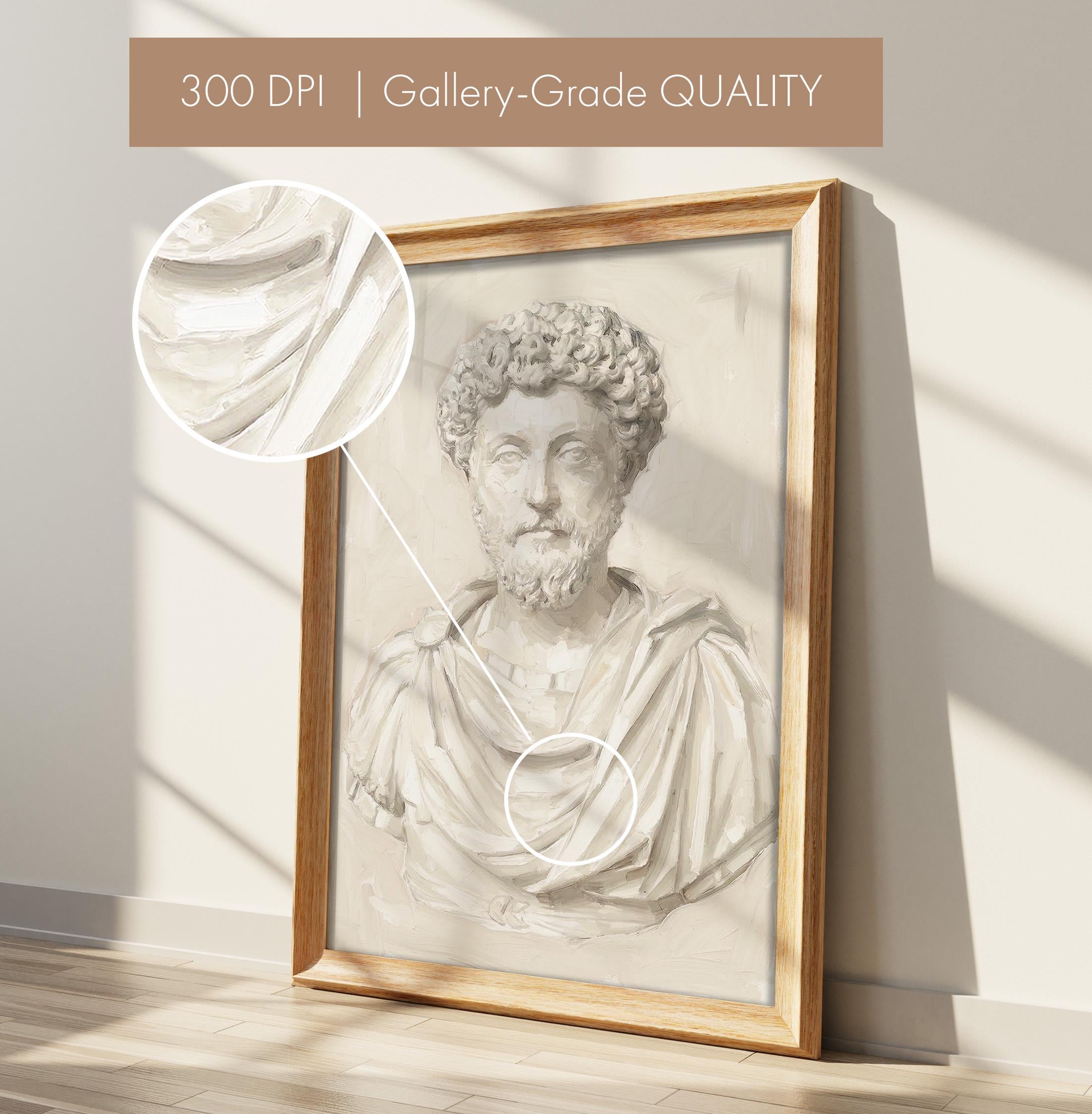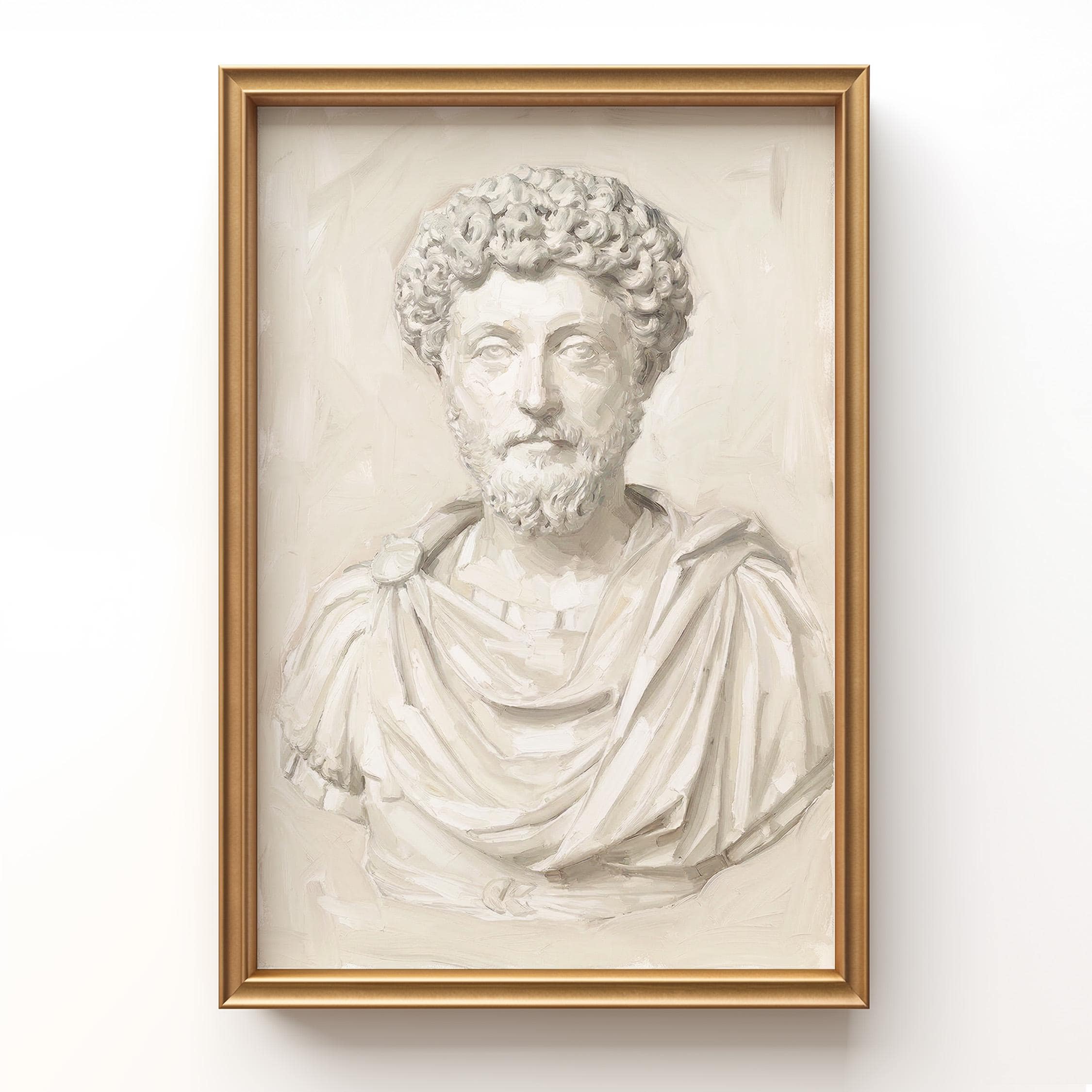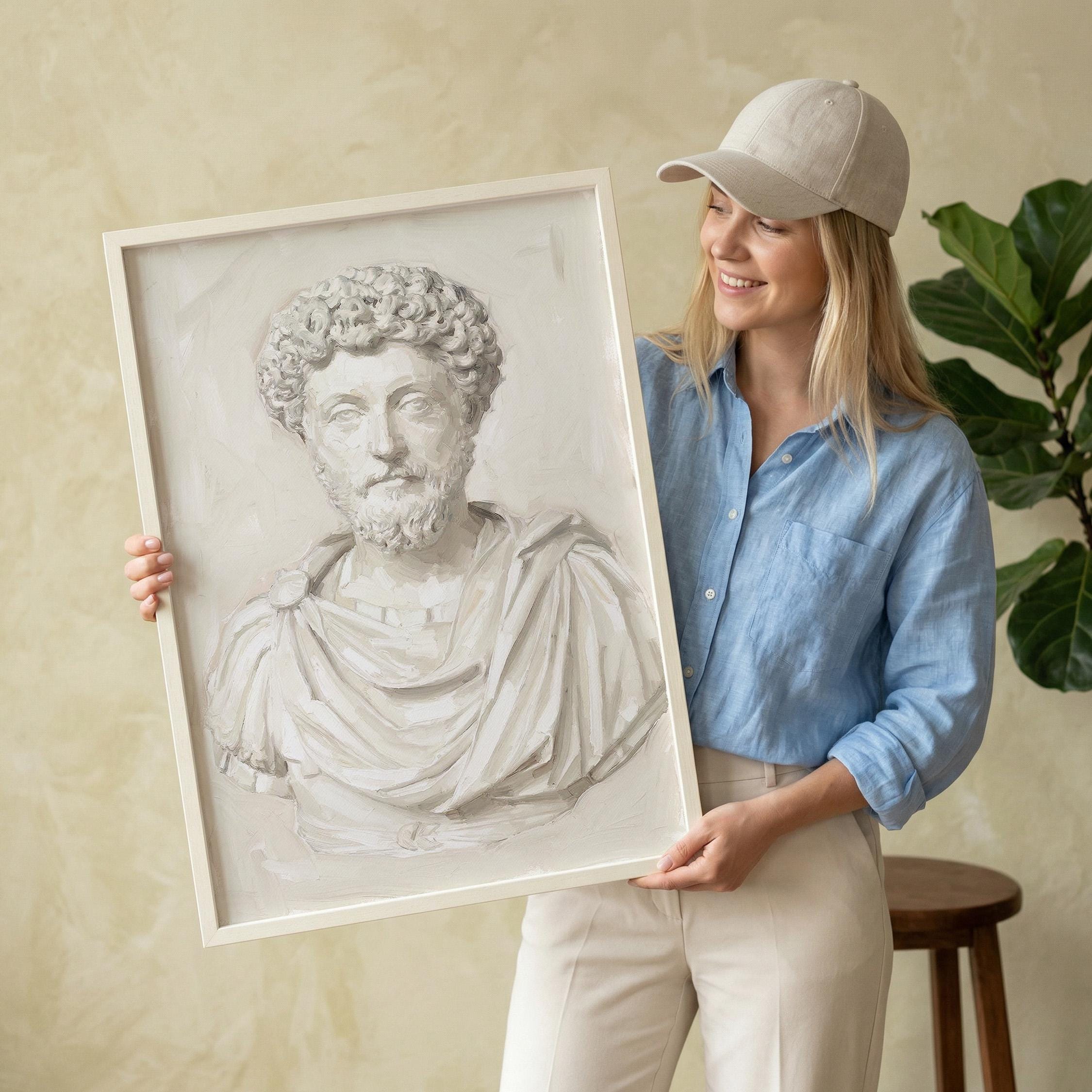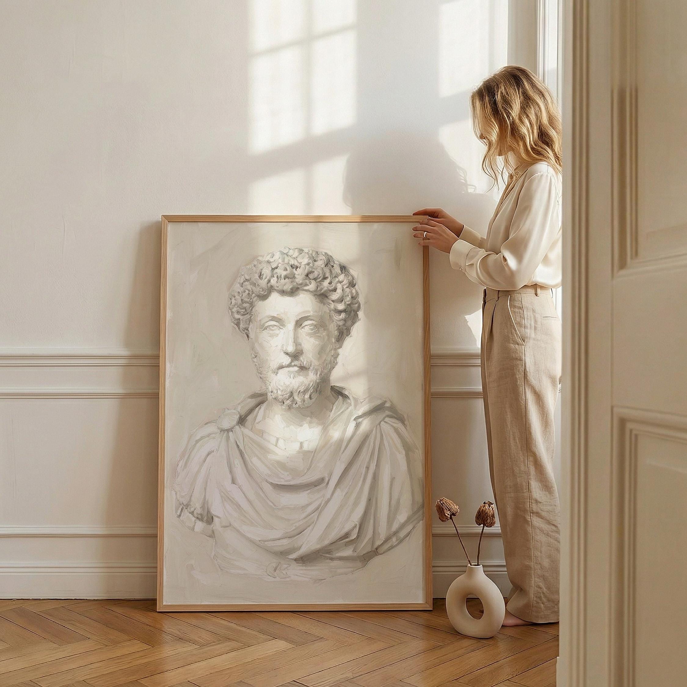 This Marcus Aurelius wall art print features a beautifully rendered oil painting of the iconic Roman emperor and Stoic philosopher in soft neutral tones.
