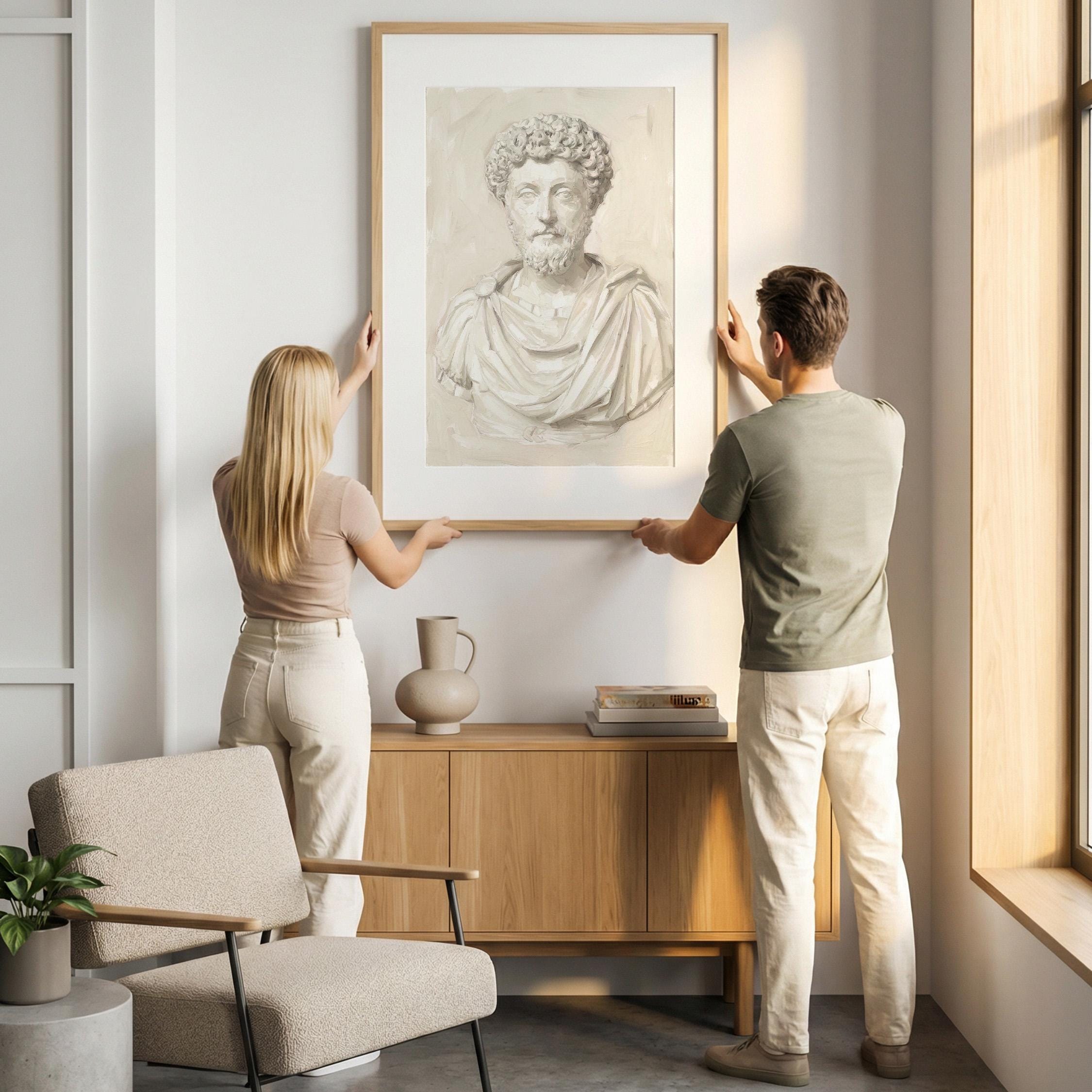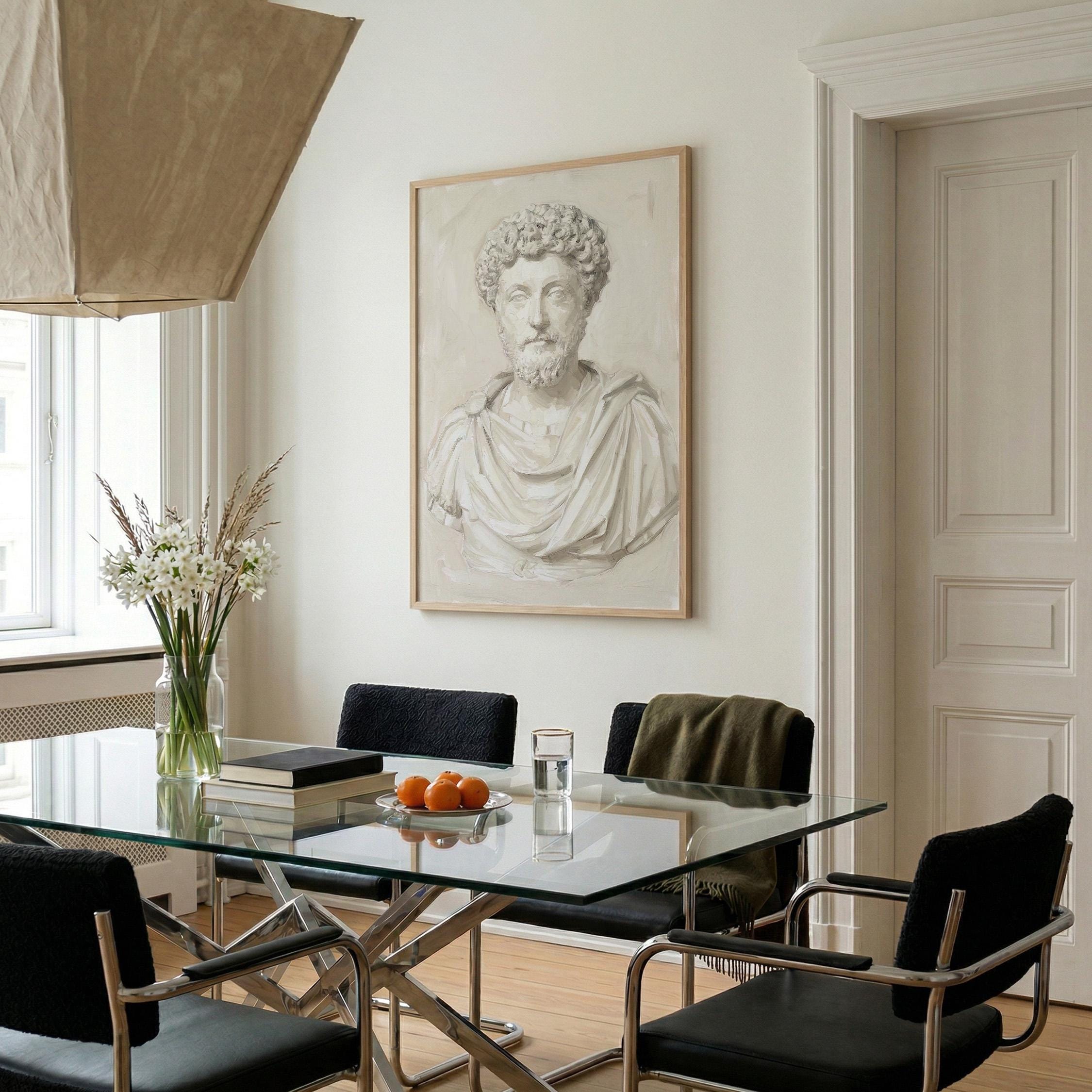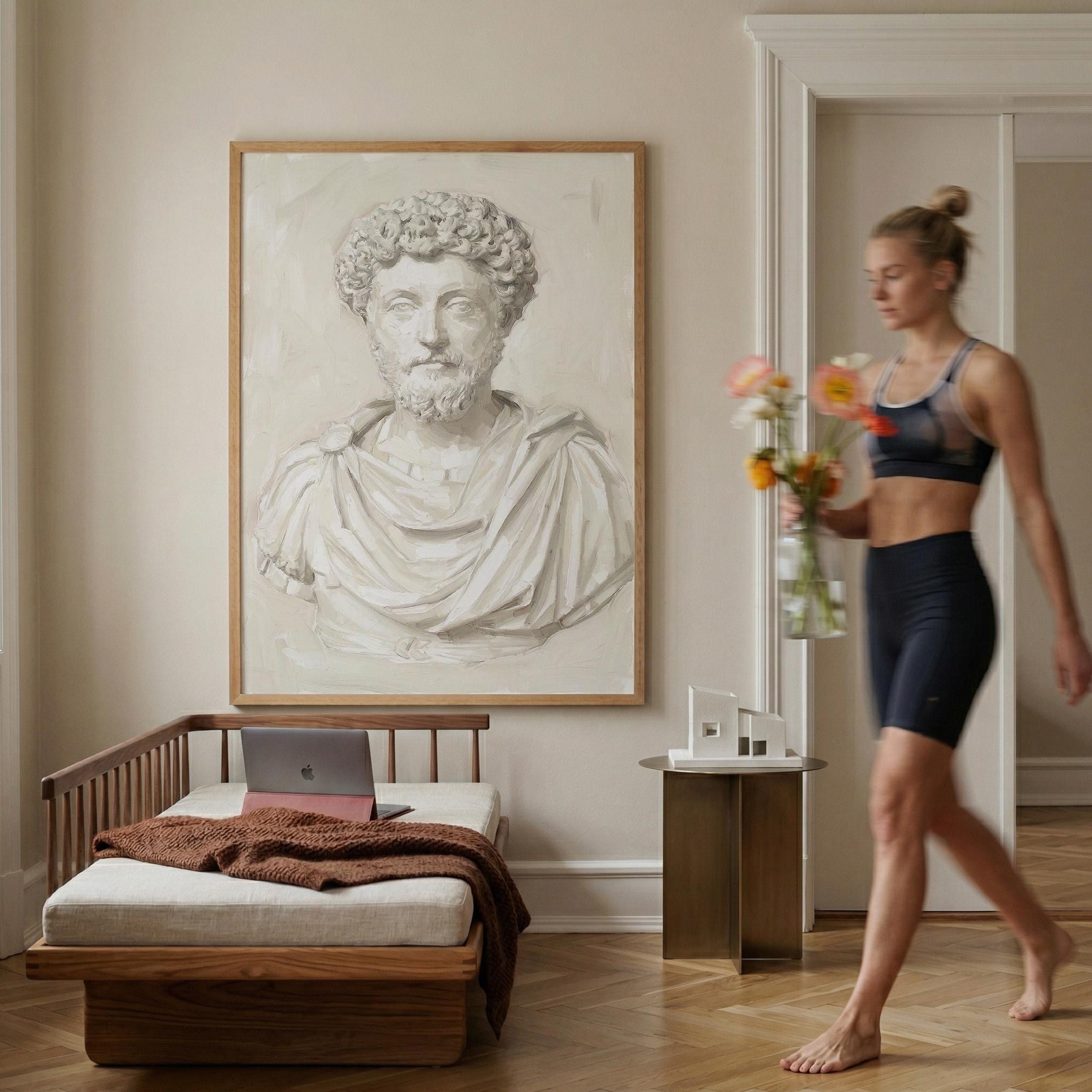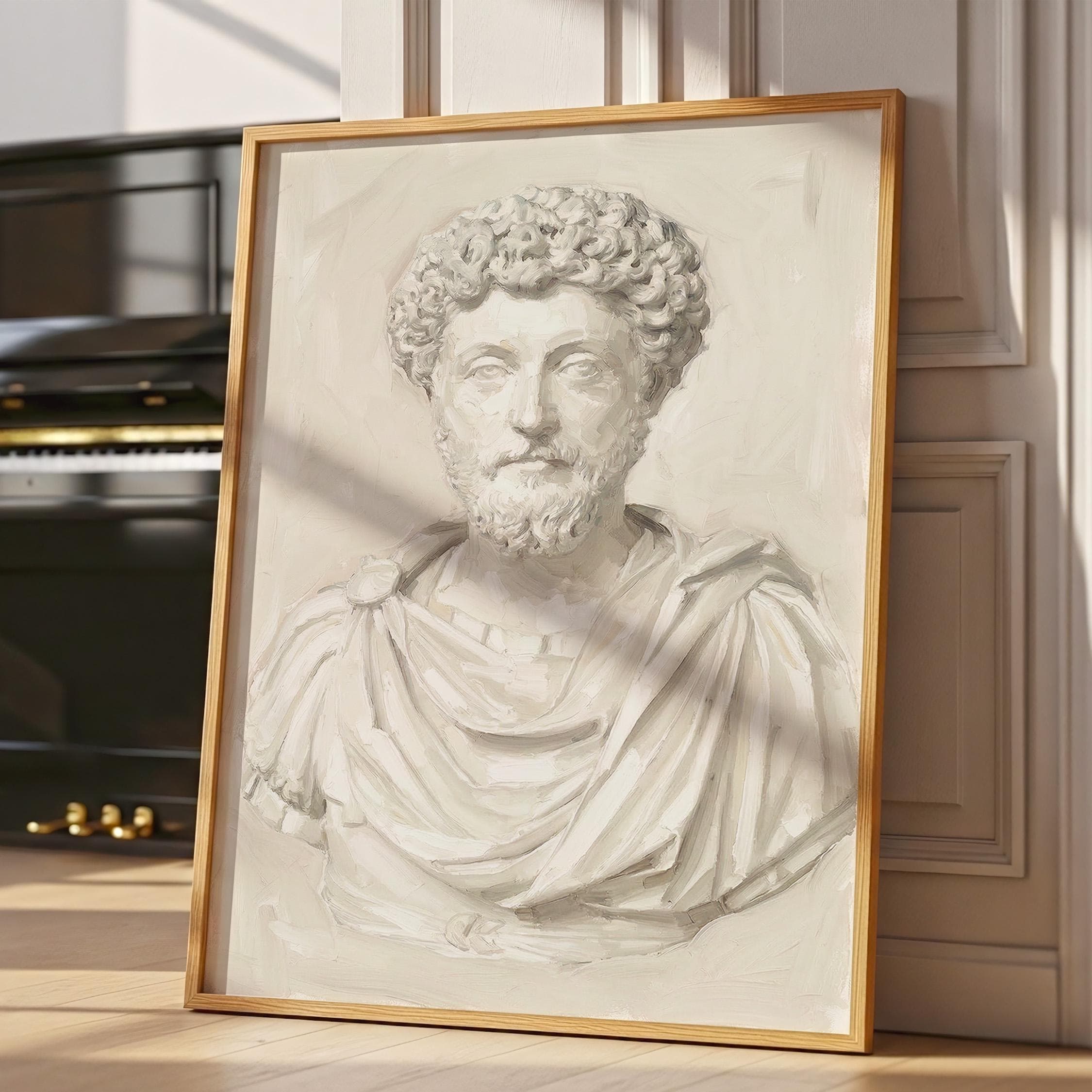 This Marcus Aurelius wall art print features a beautifully rendered oil painting of the iconic Roman emperor and Stoic philosopher in soft neutral tones.