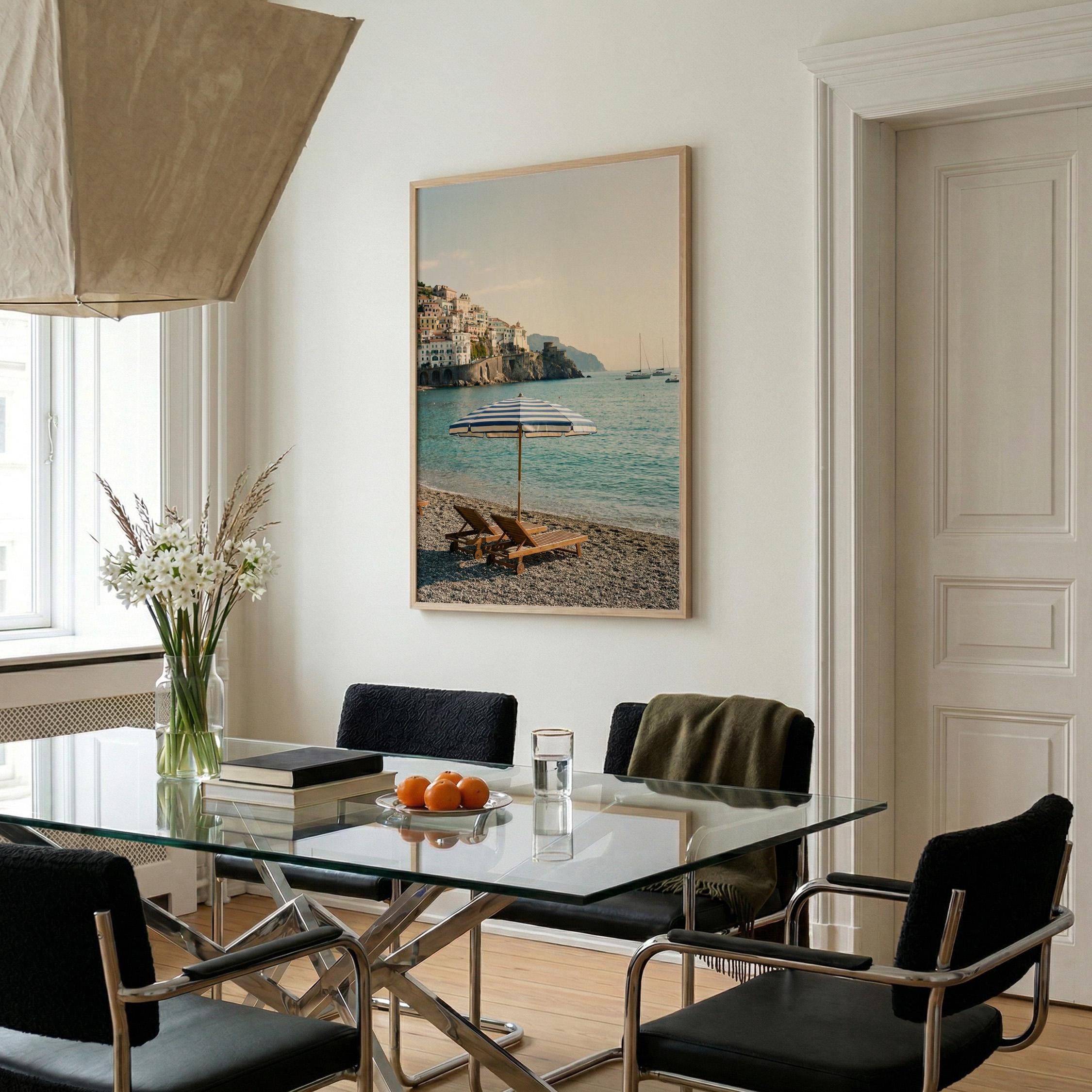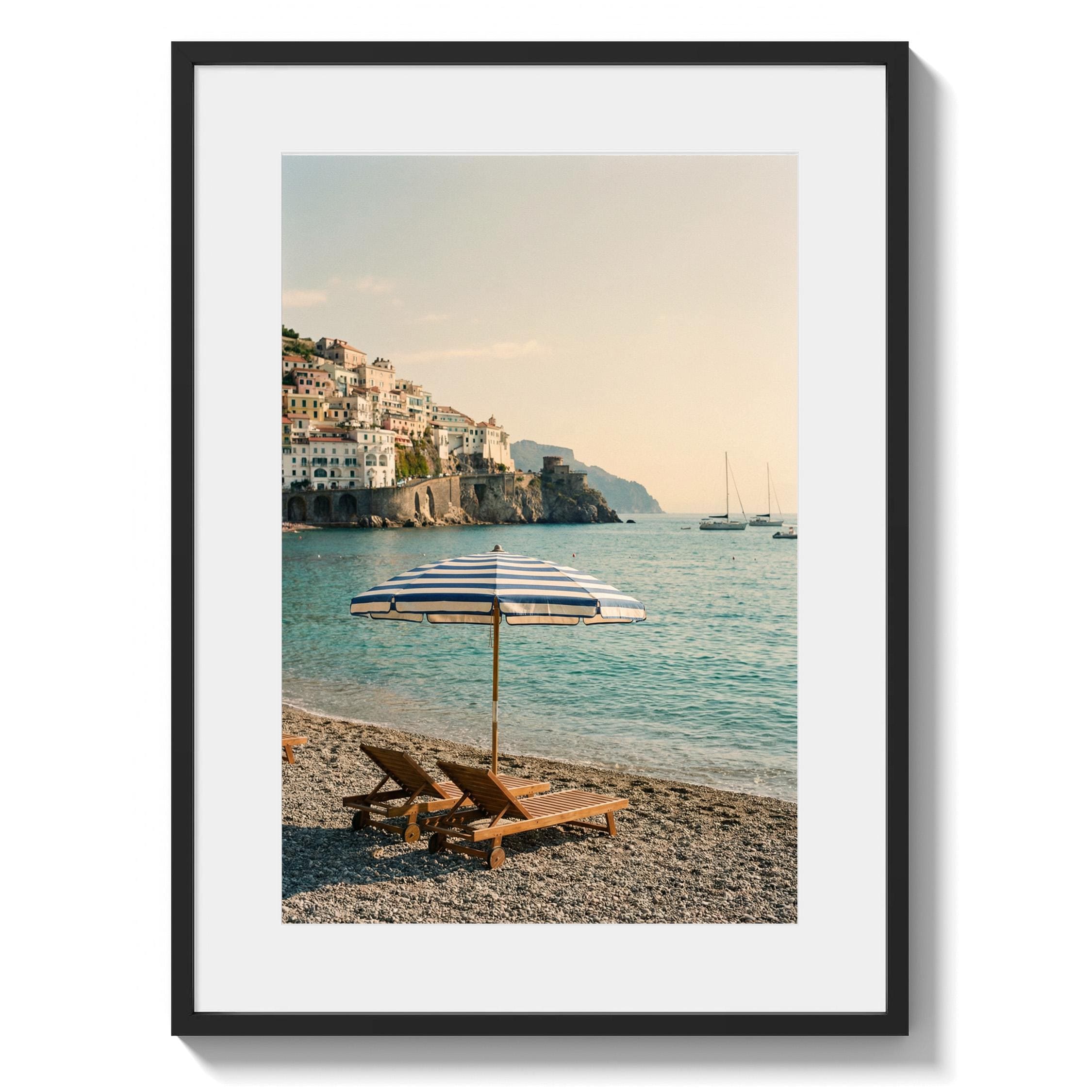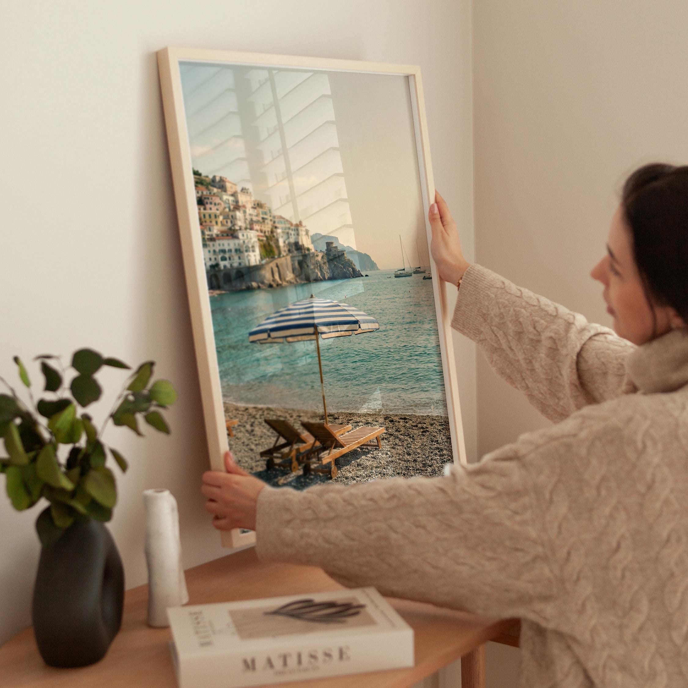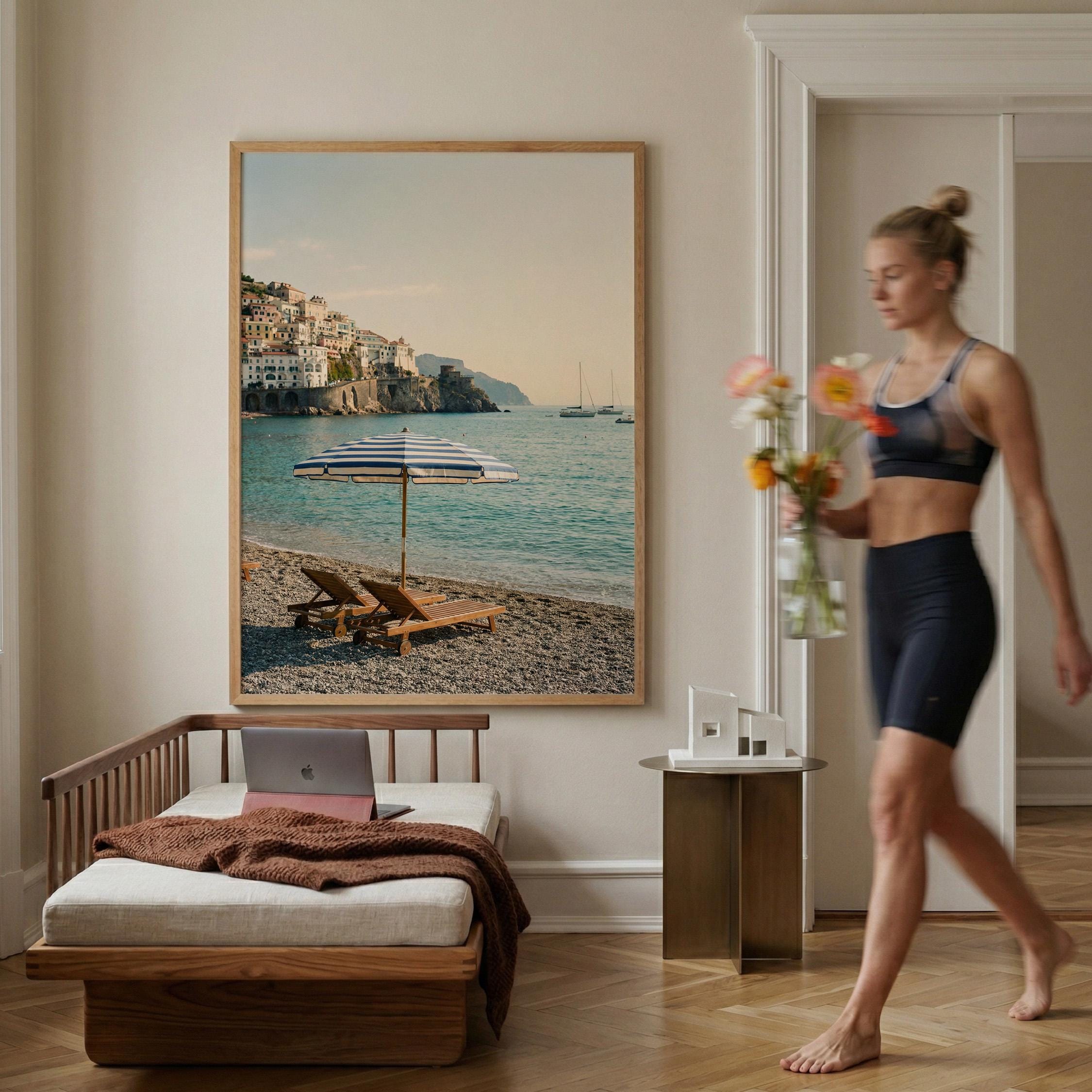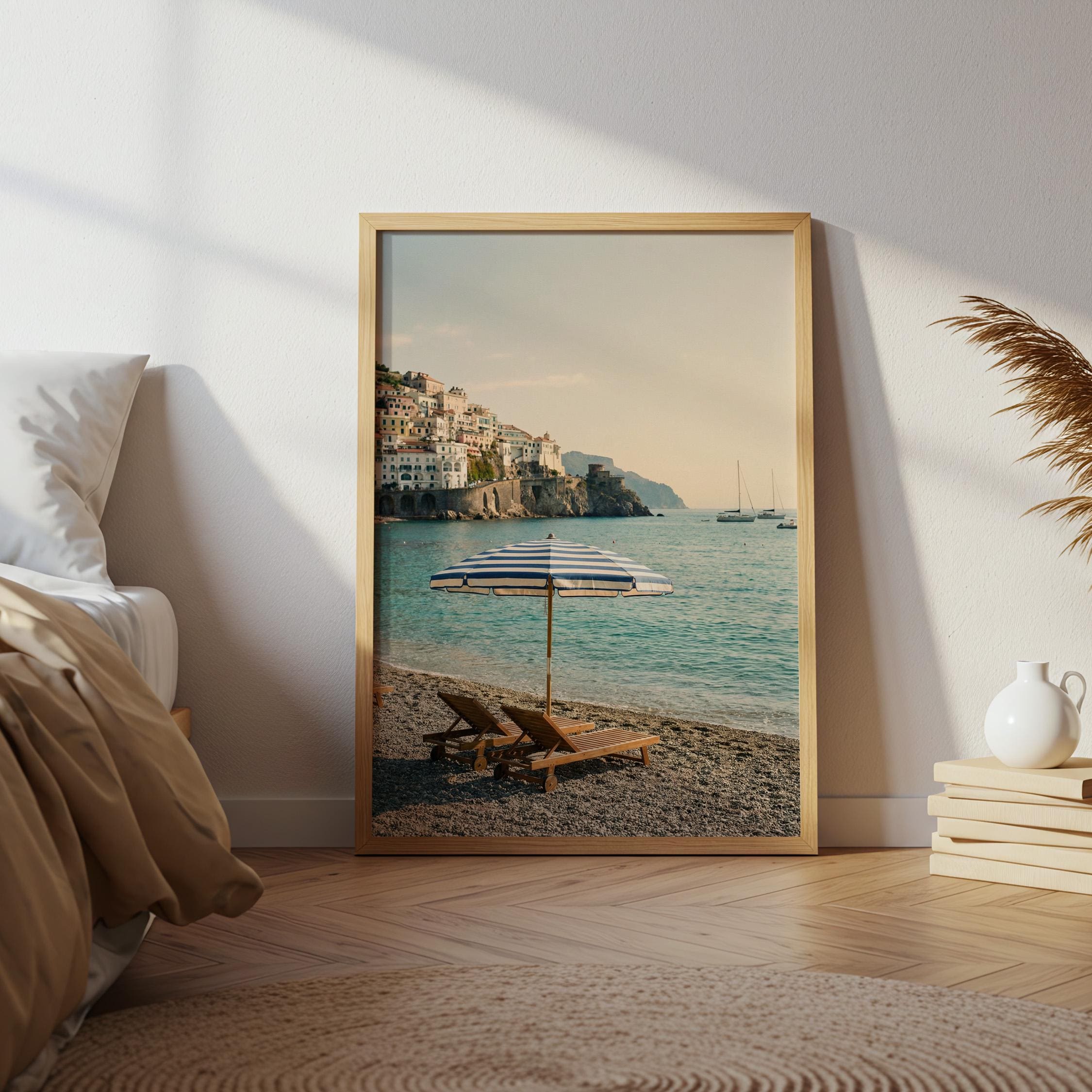 Amalfi Coast Beach Print captures the serene beauty of an Italian seaside escape with turquoise waters, striped umbrella, and cliffside village views. Perfect for living rooms, bedrooms, or offices that crave coastal elegance and Mediterranean wanderlust vibes.
