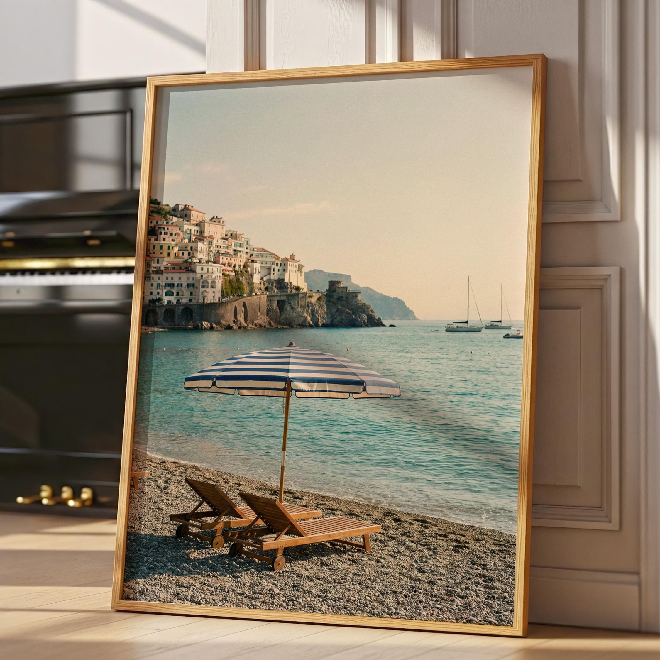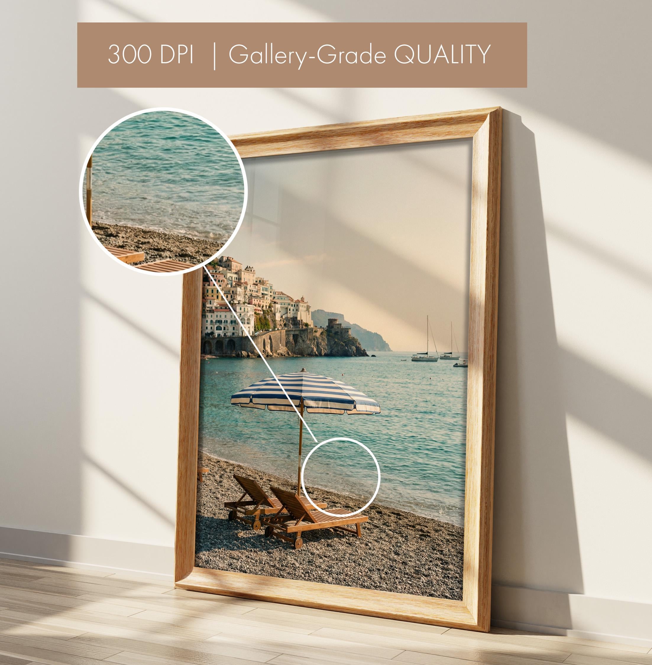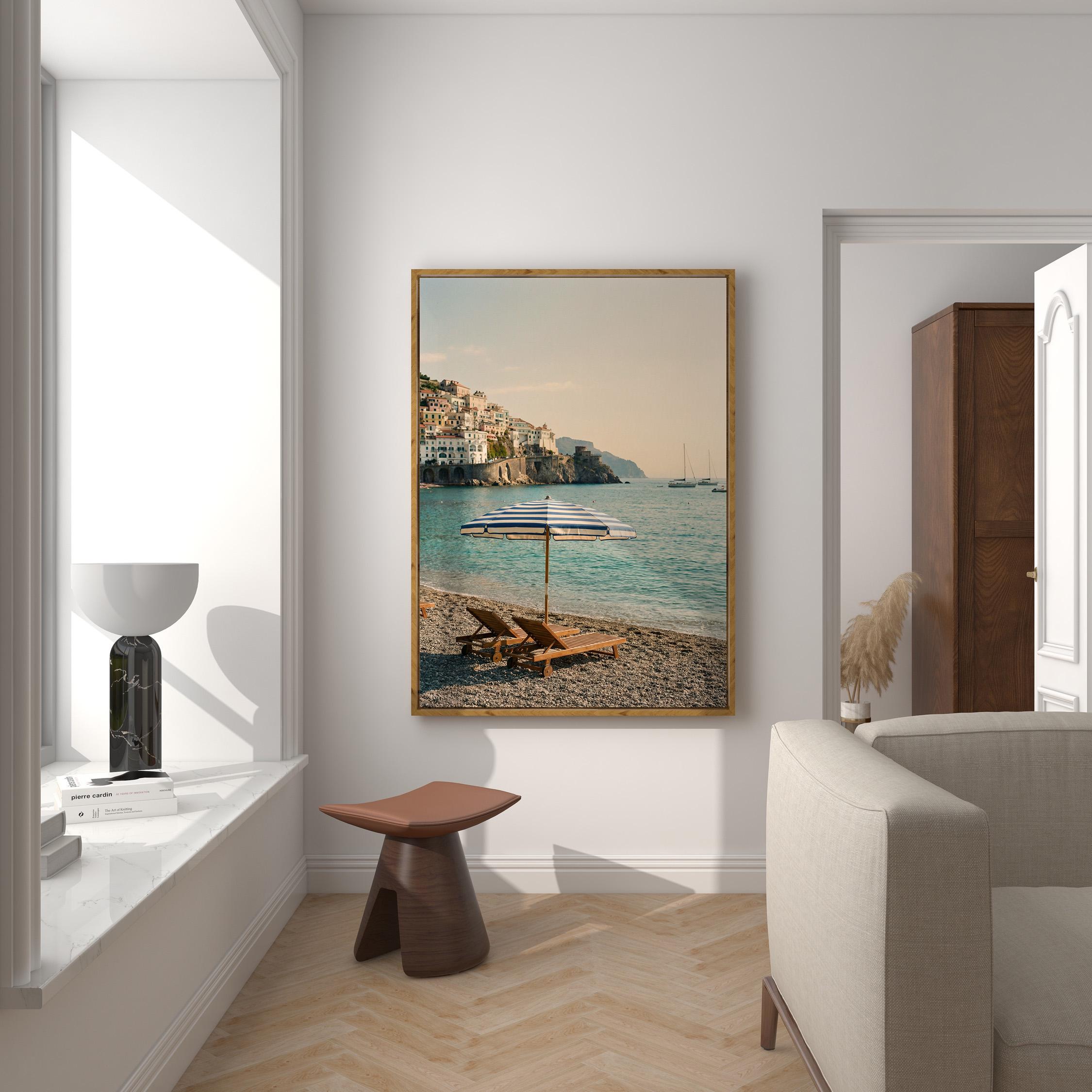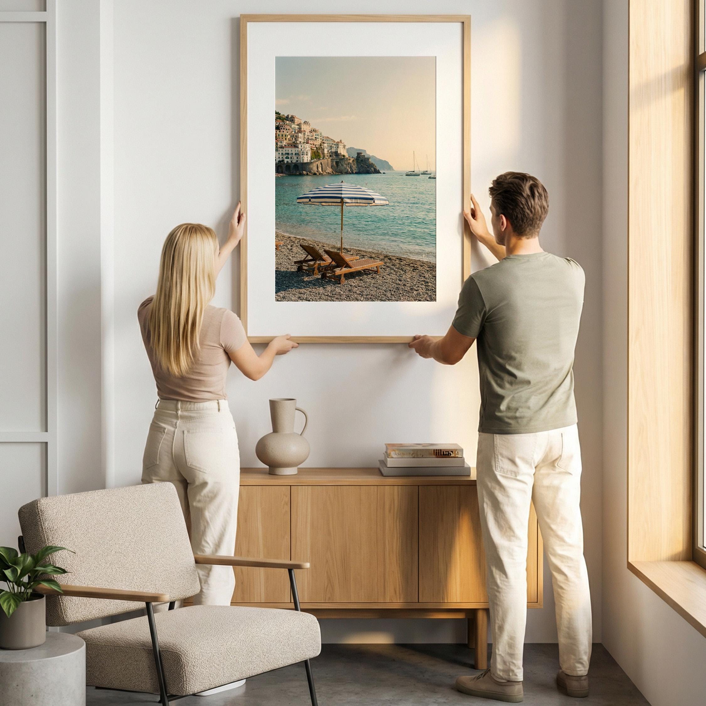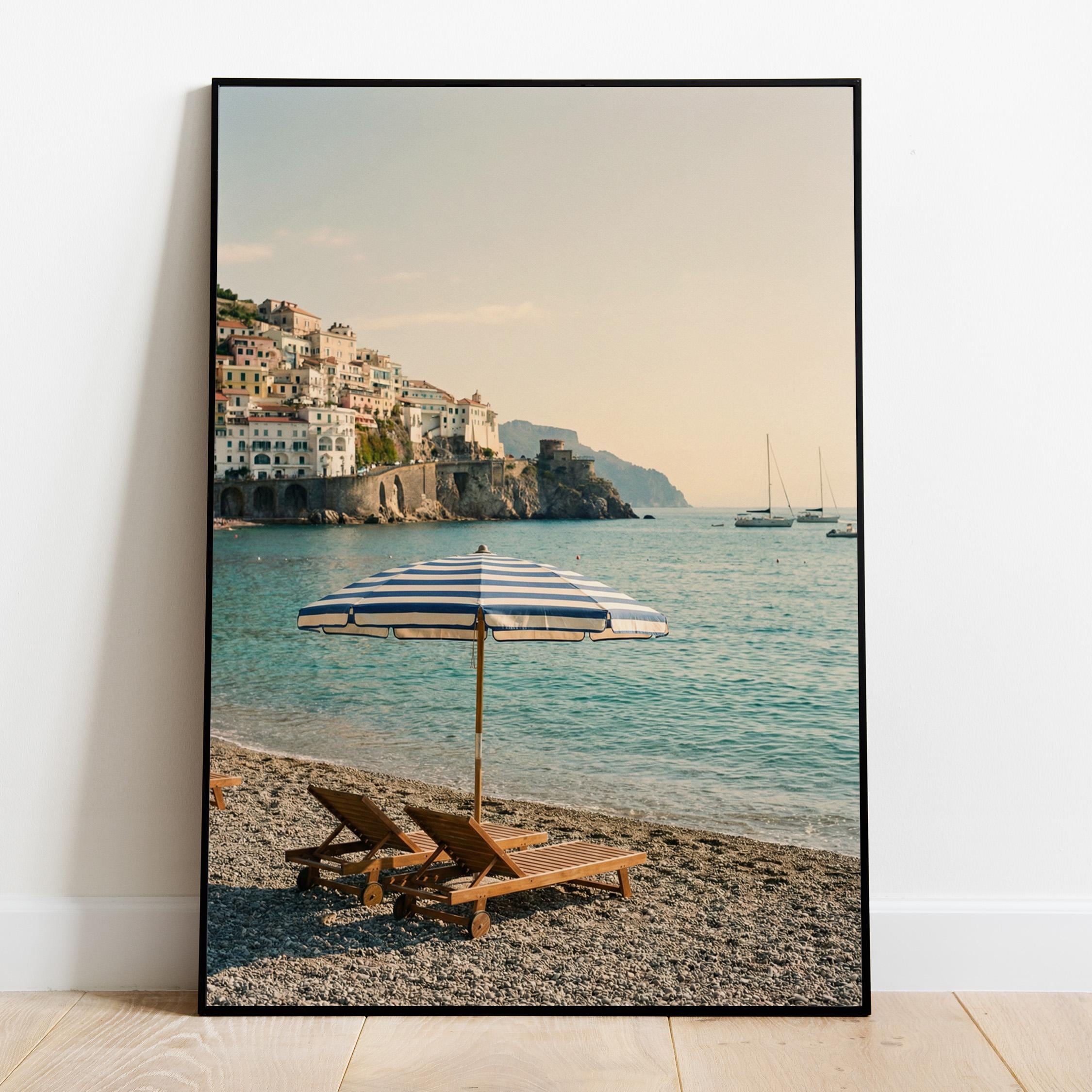 Amalfi Coast Beach Print captures the serene beauty of an Italian seaside escape with turquoise waters, striped umbrella, and cliffside village views. Perfect for living rooms, bedrooms, or offices that crave coastal elegance and Mediterranean wanderlust vibes.