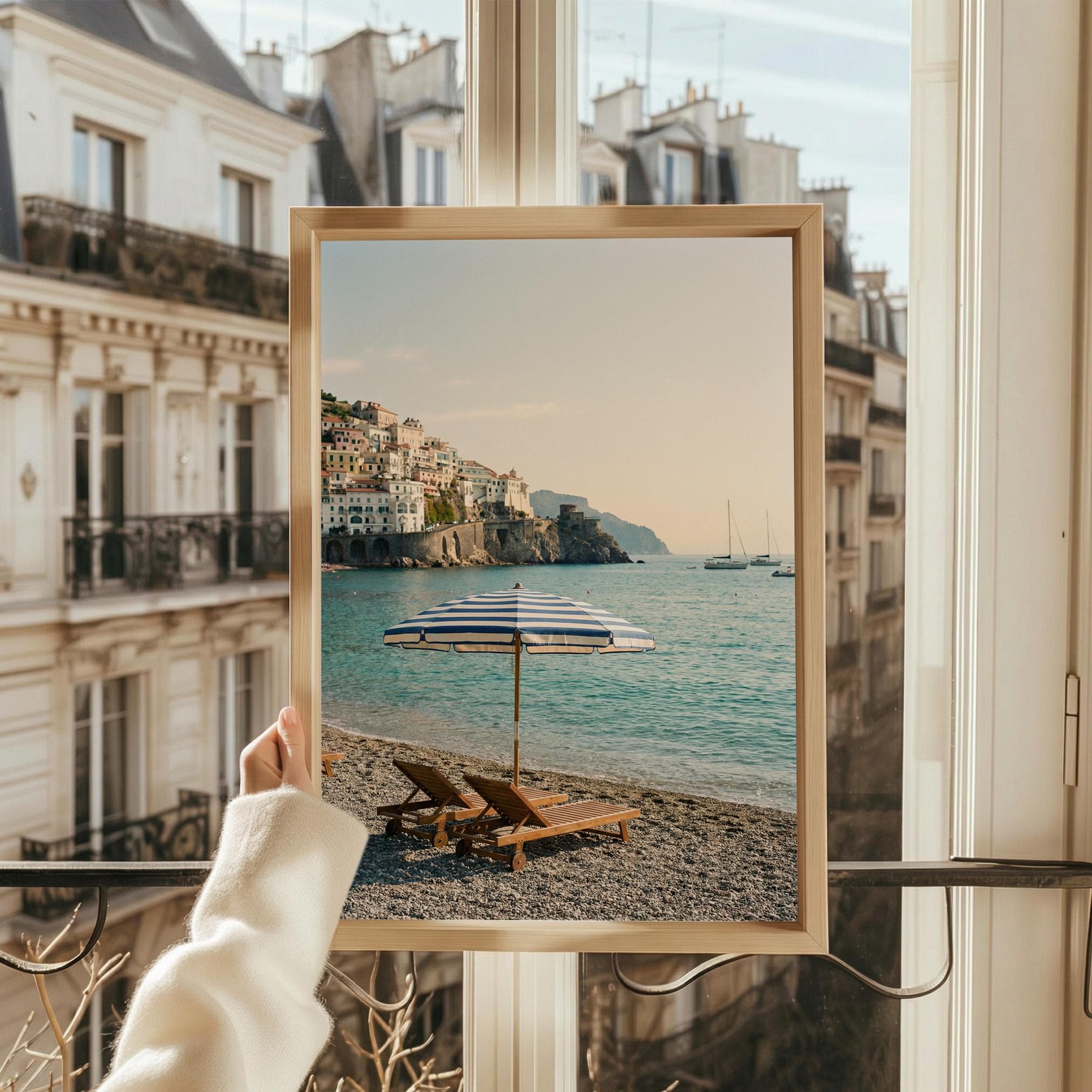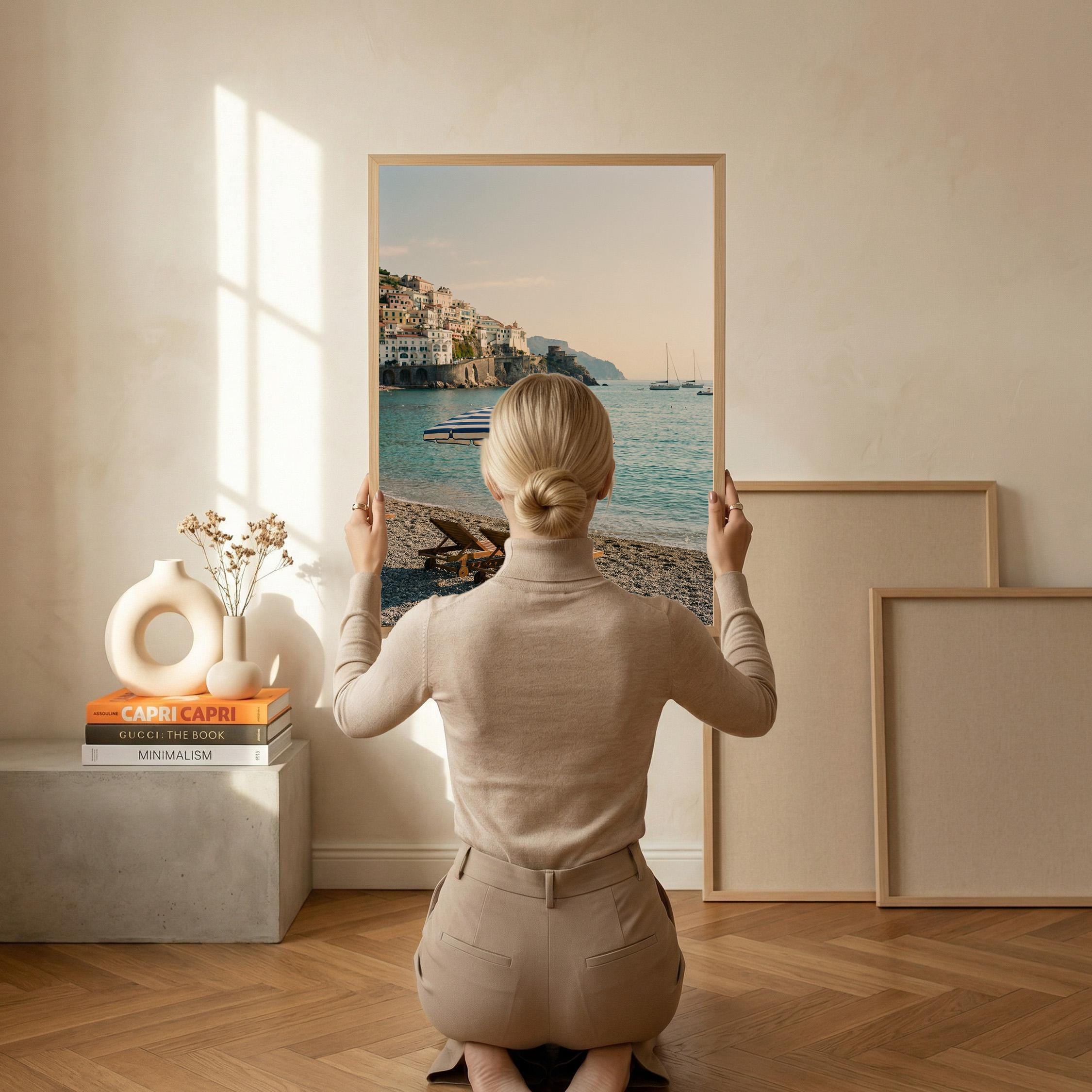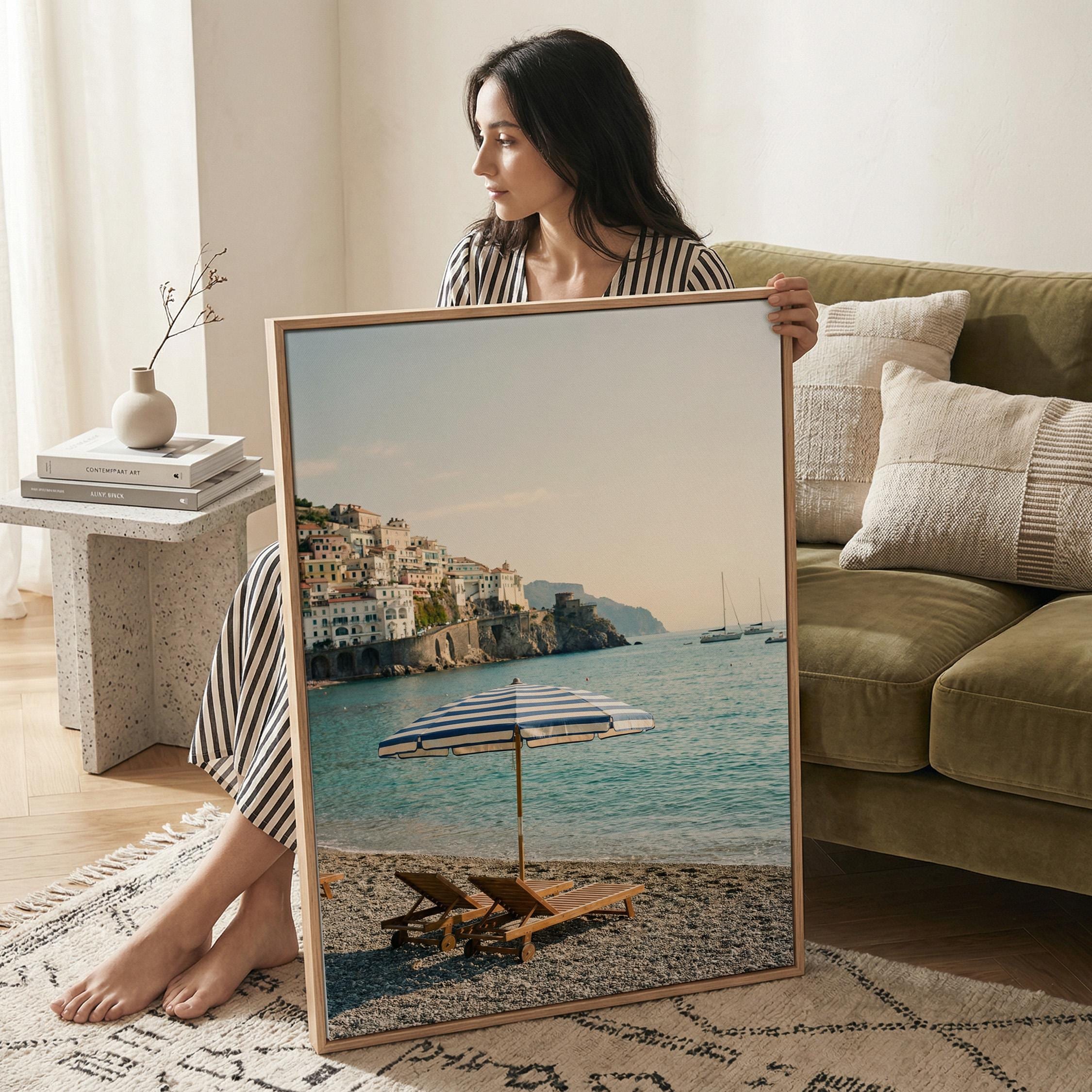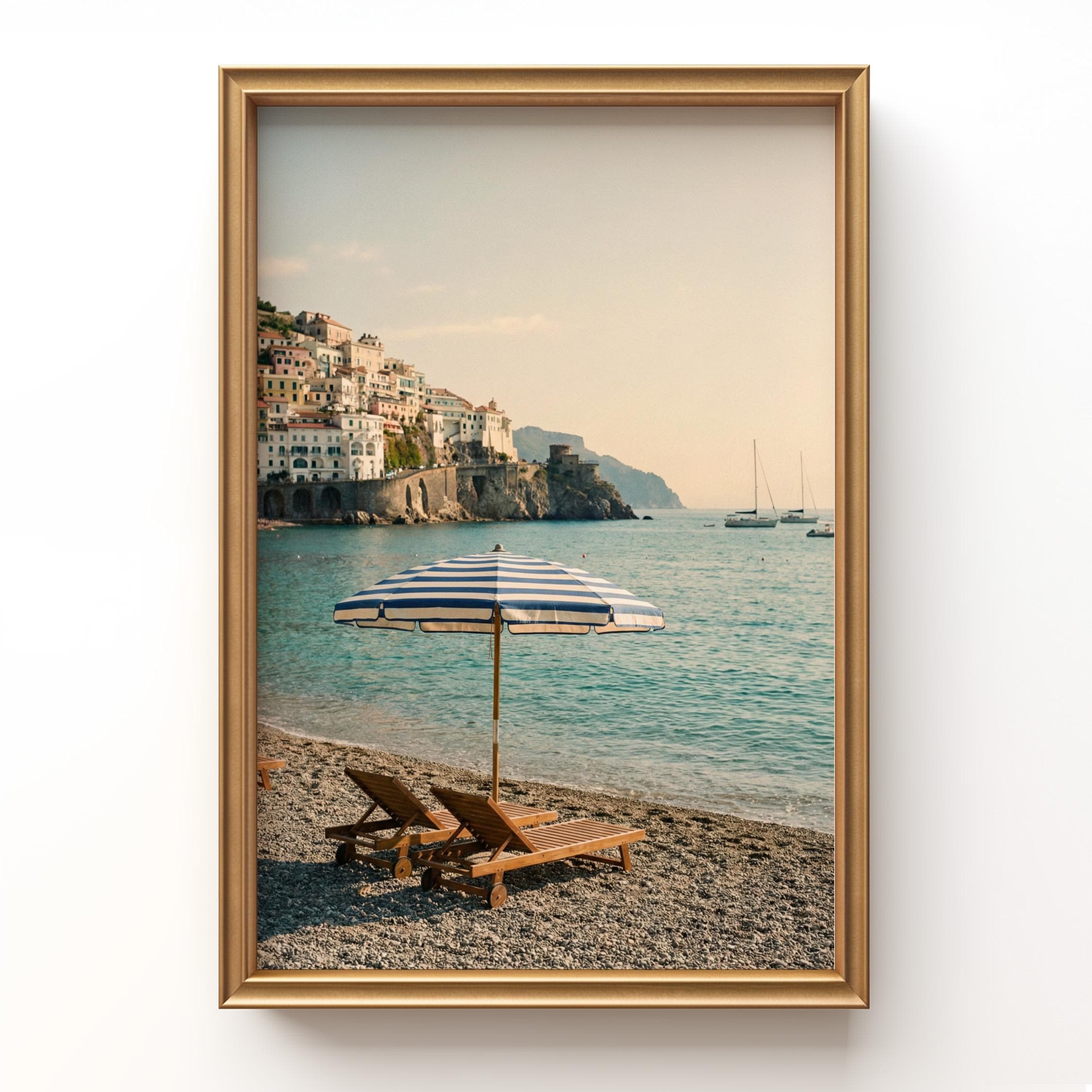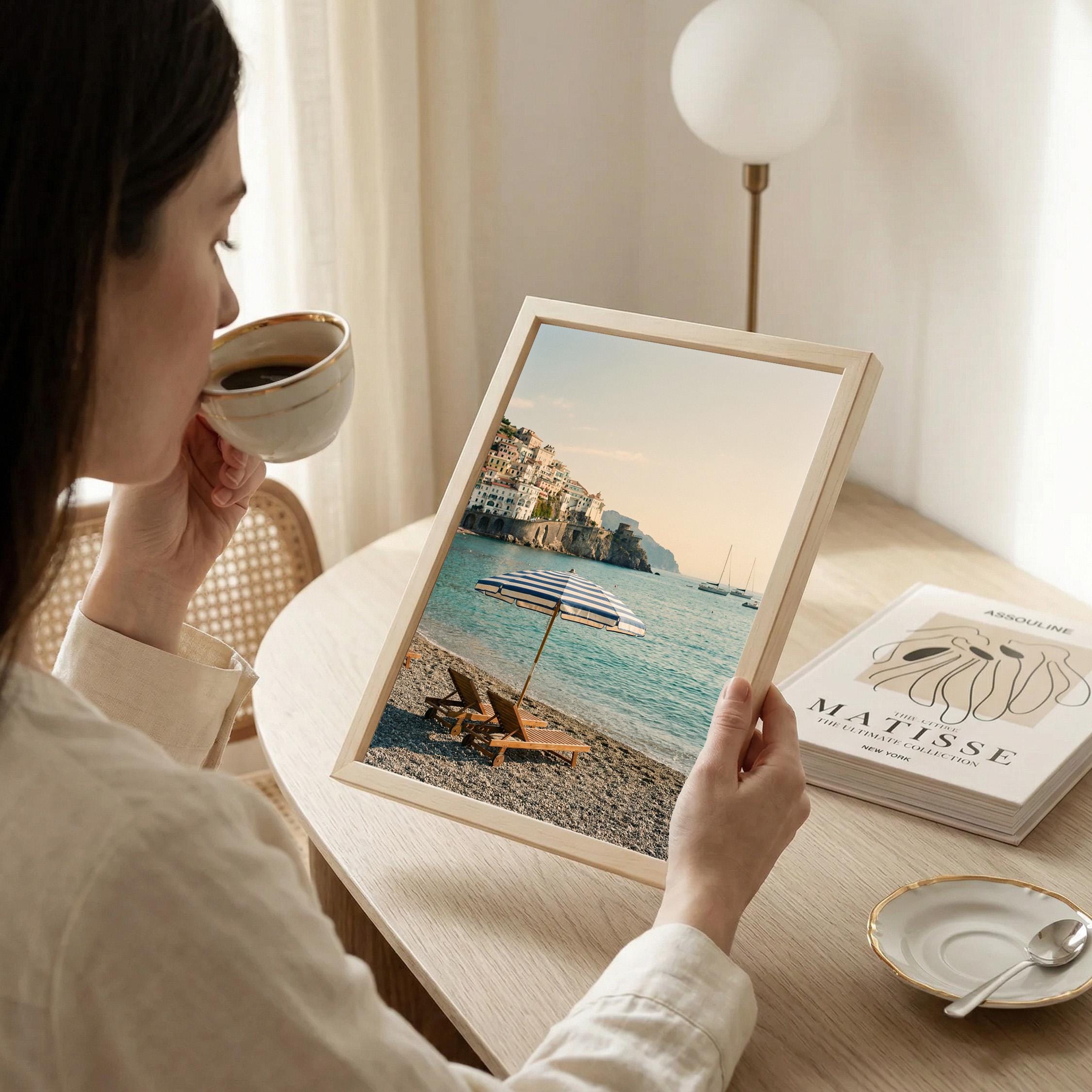 Amalfi Coast Beach Print captures the serene beauty of an Italian seaside escape with turquoise waters, striped umbrella, and cliffside village views. Perfect for living rooms, bedrooms, or offices that crave coastal elegance and Mediterranean wanderlust vibes.