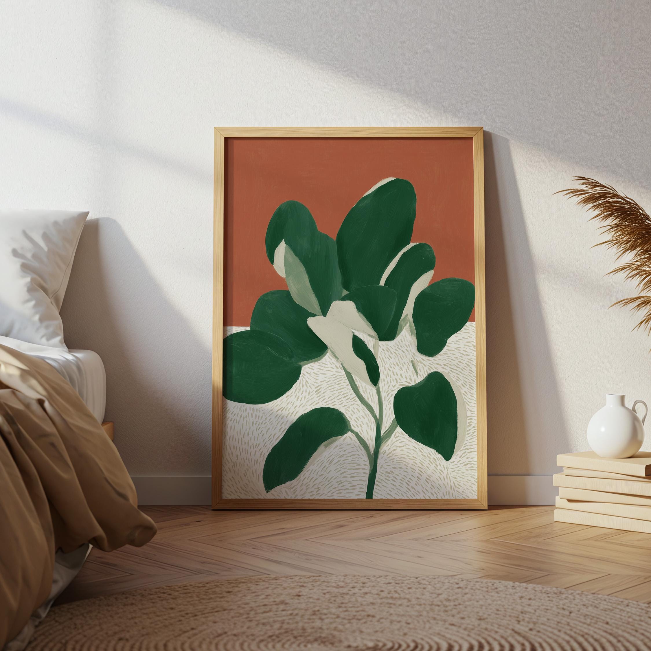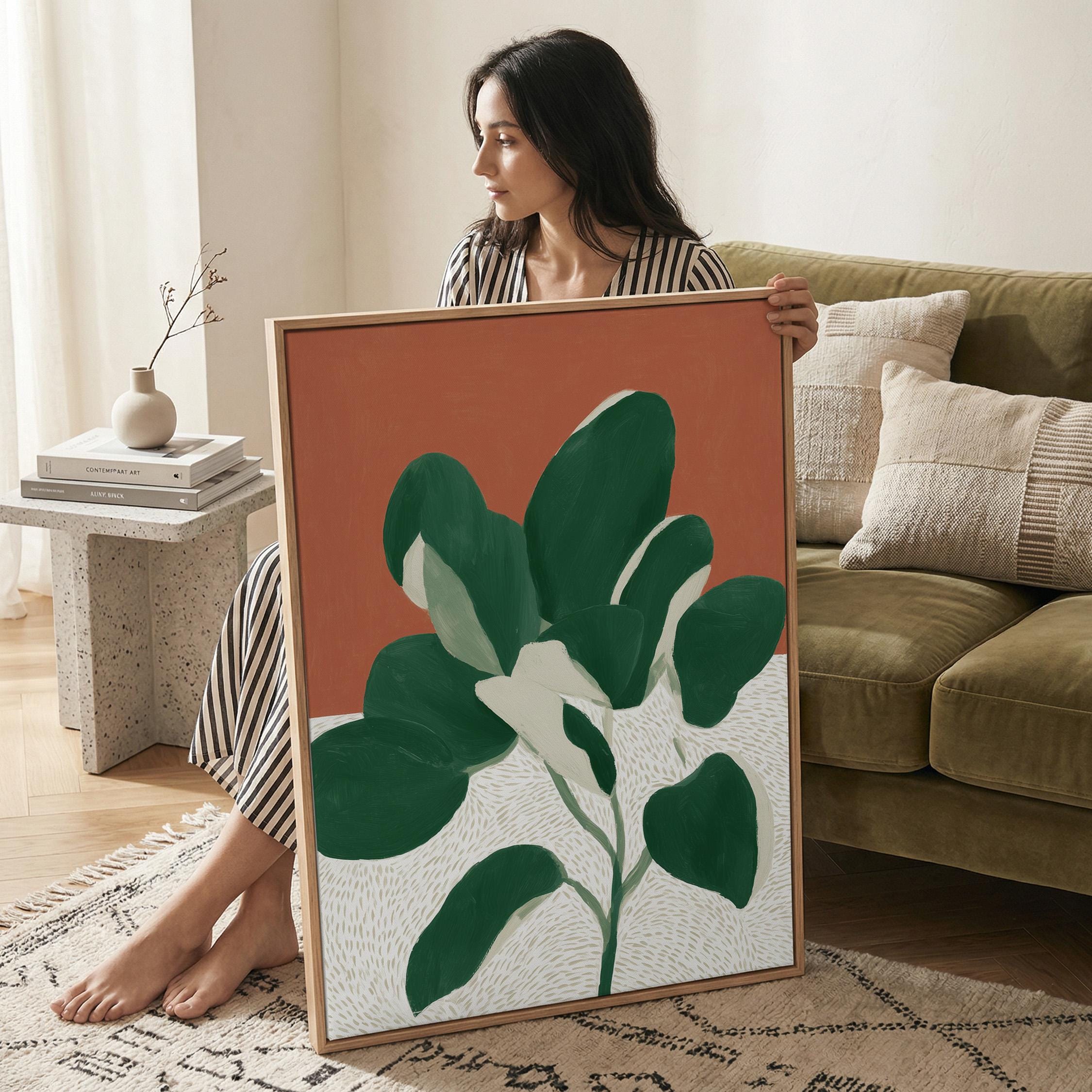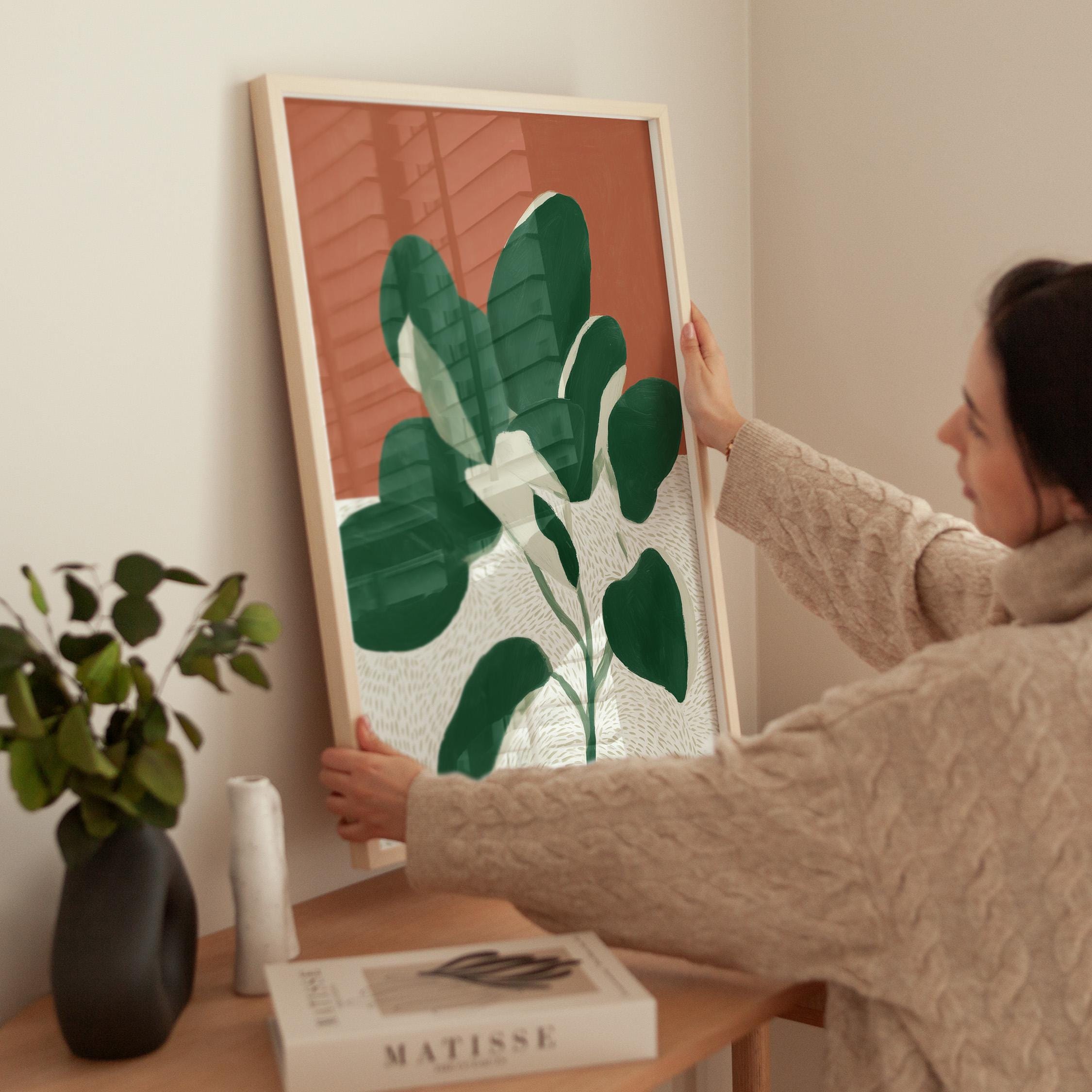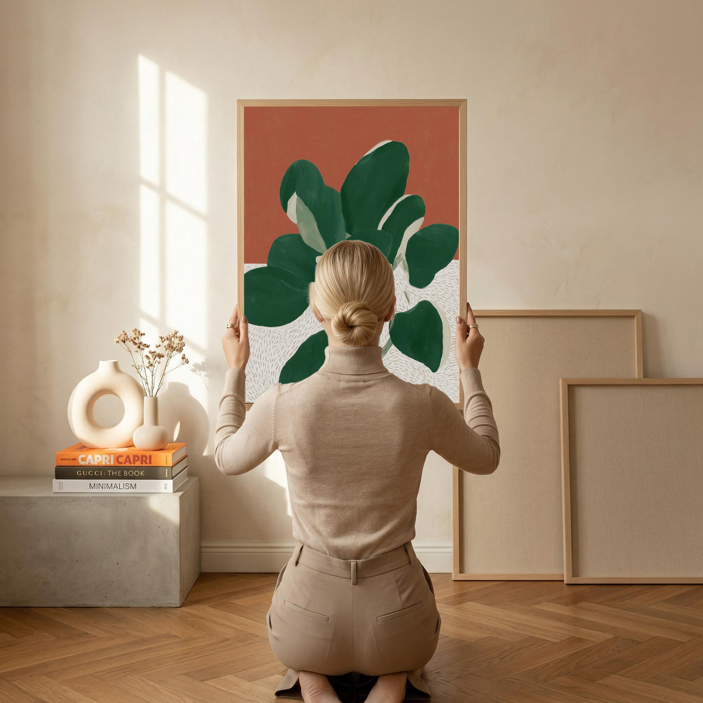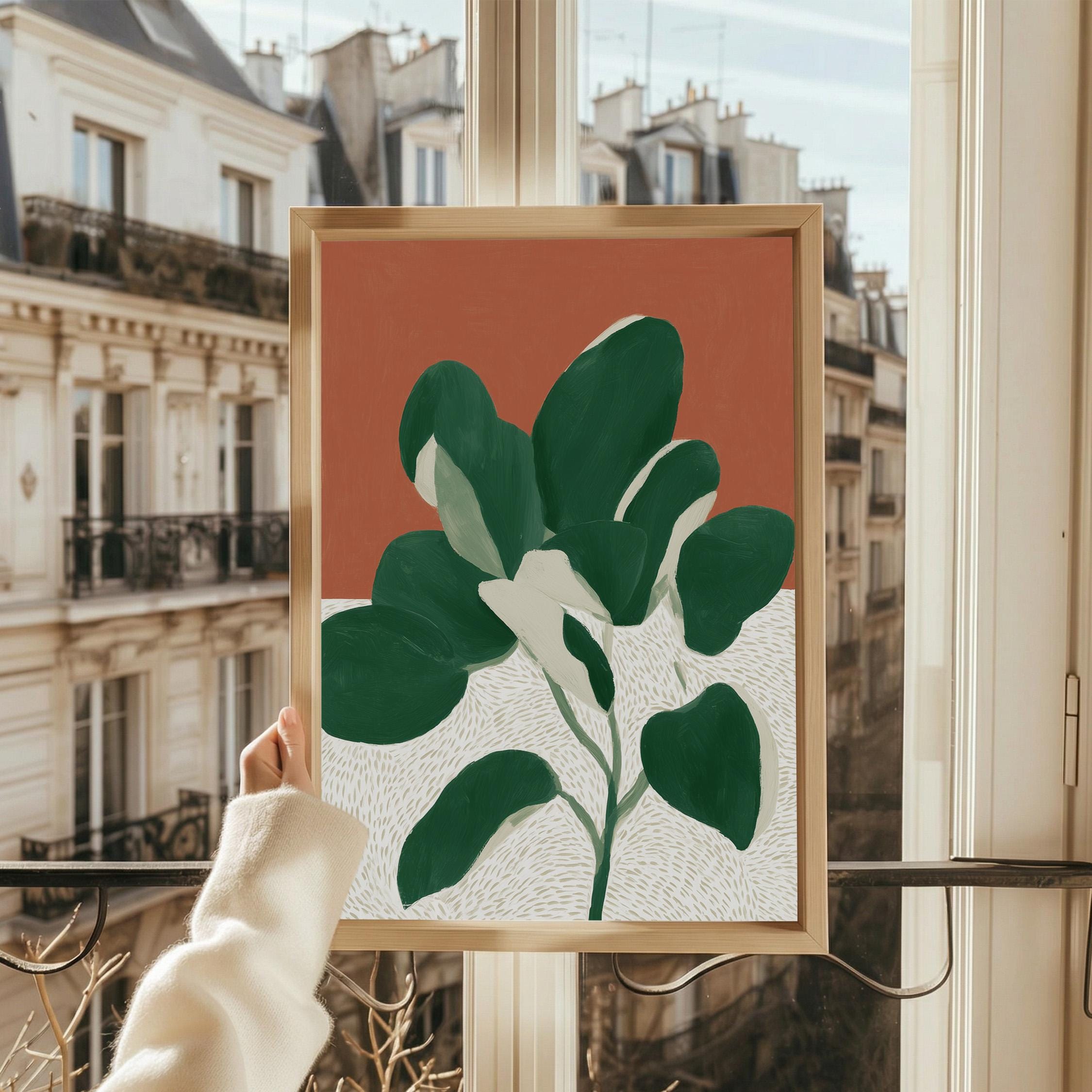 Bold monstera plant wall art with rich terracotta and deep green hues creates instant visual impact in any space. Perfect for modern boho living rooms, bedrooms, or offices seeking that effortless tropical minimalist vibe.