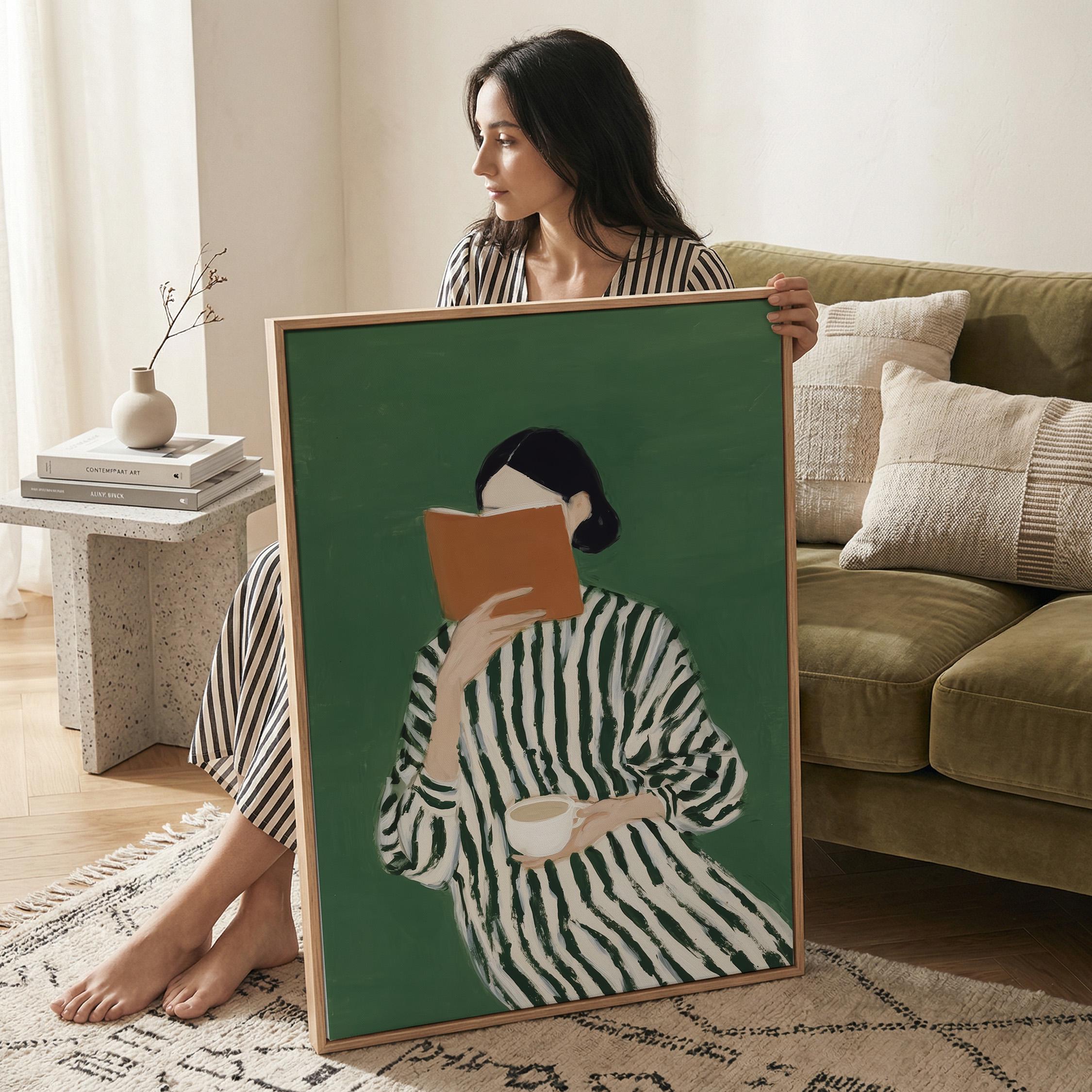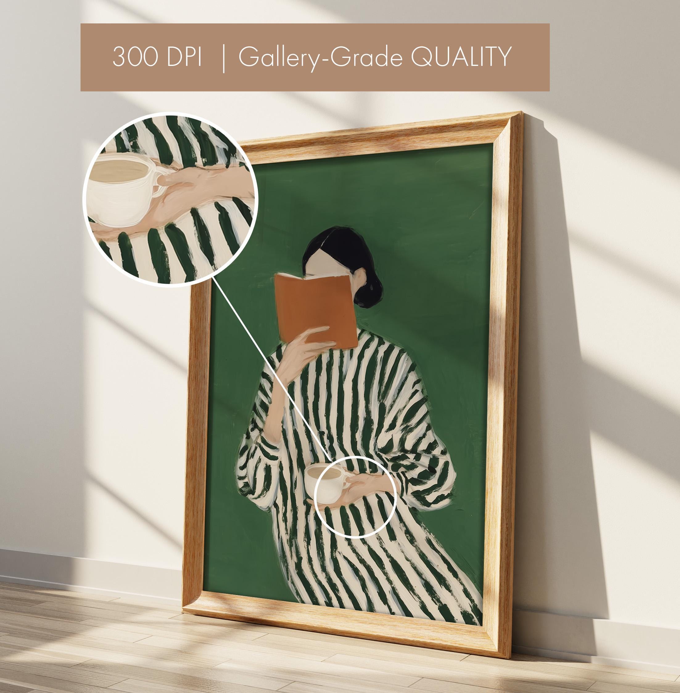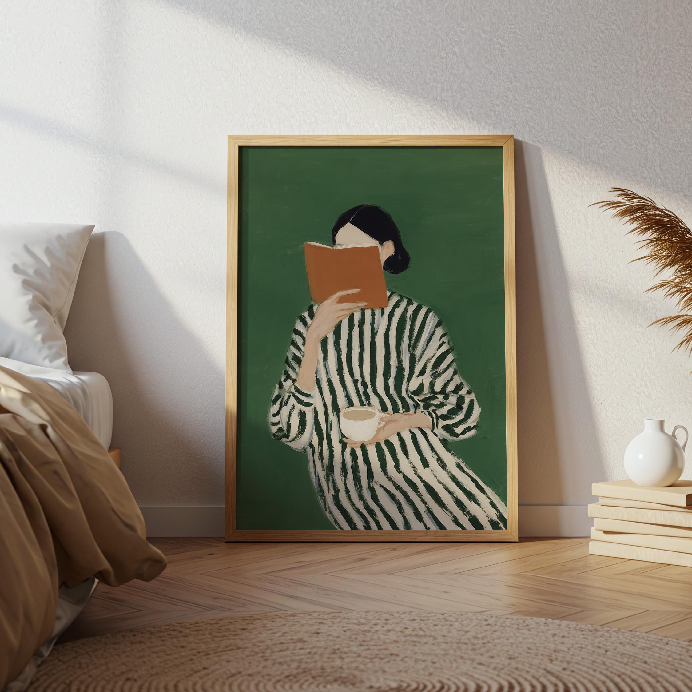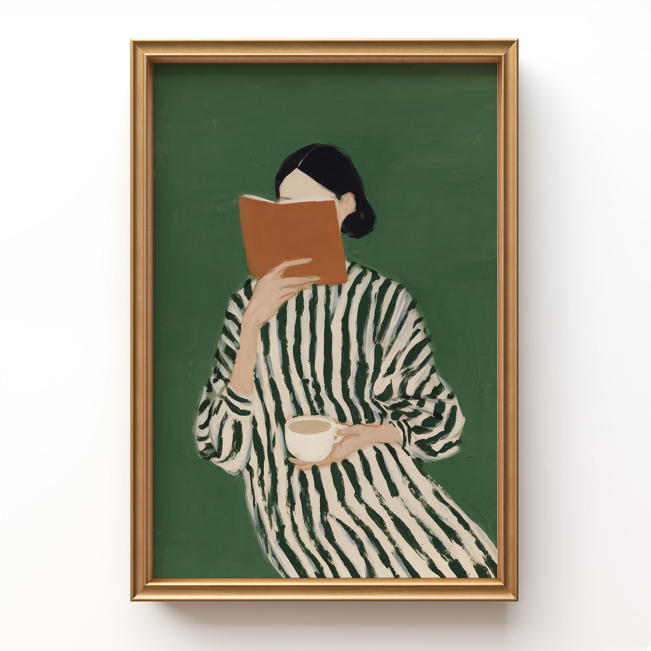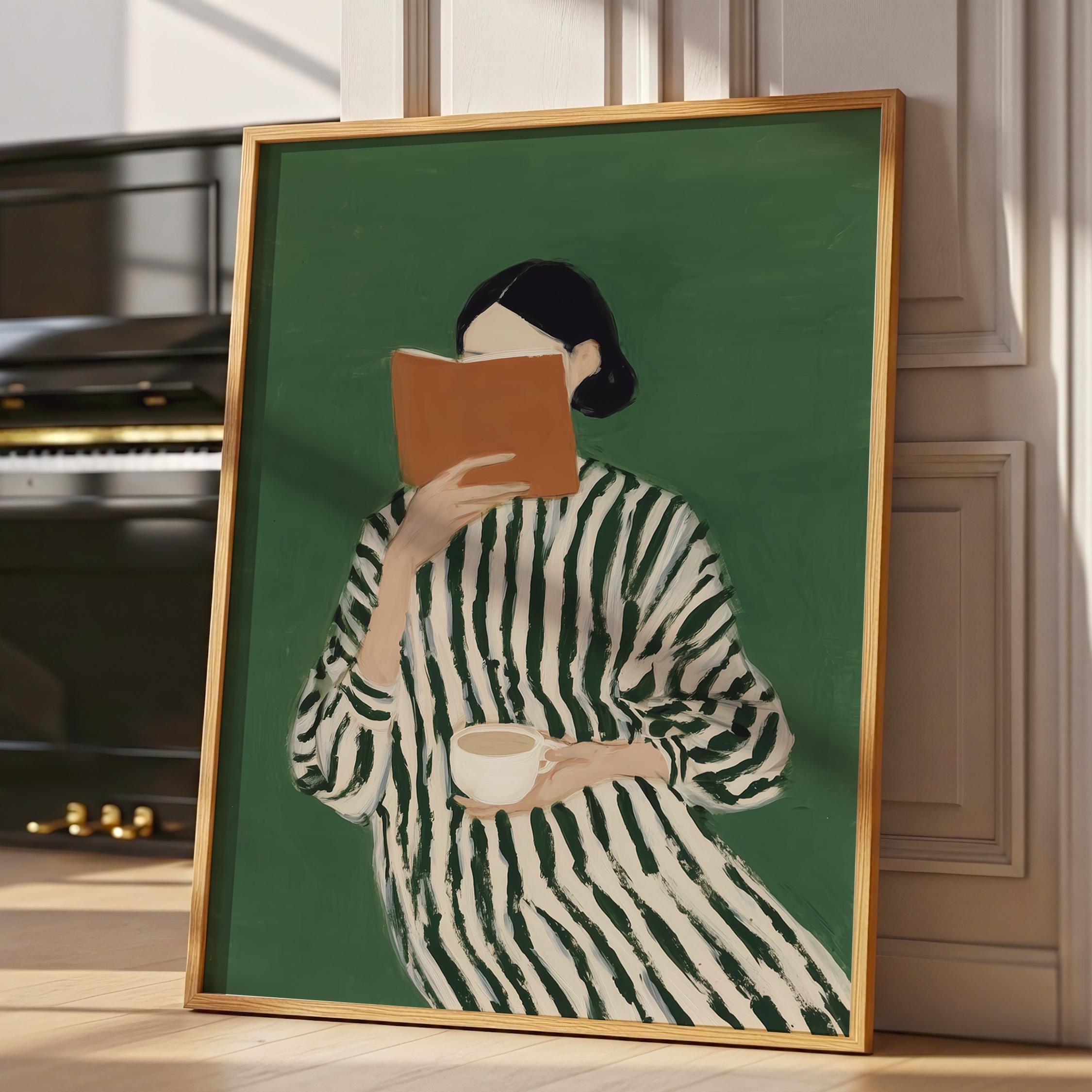 A serene woman lost in a book with her morning coffee, soft green tones and classic striped dress create timeless reading charm. Perfect for book lovers, home libraries, reading nooks, bedrooms, or office spaces that celebrate quiet moments and literary life.