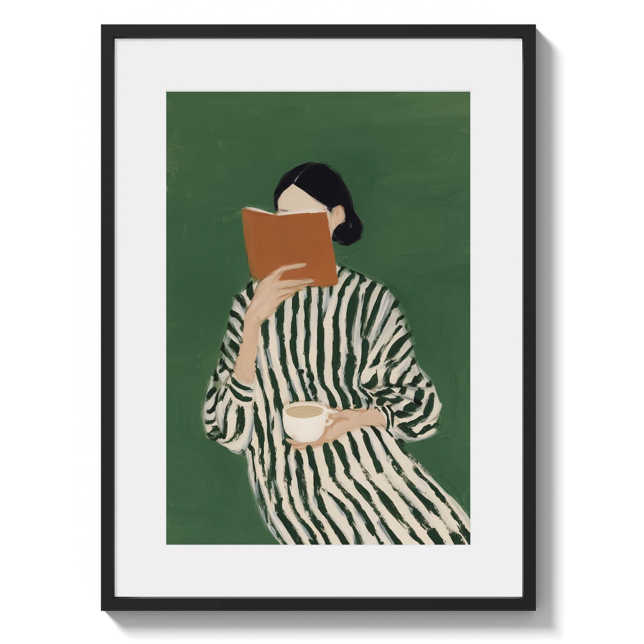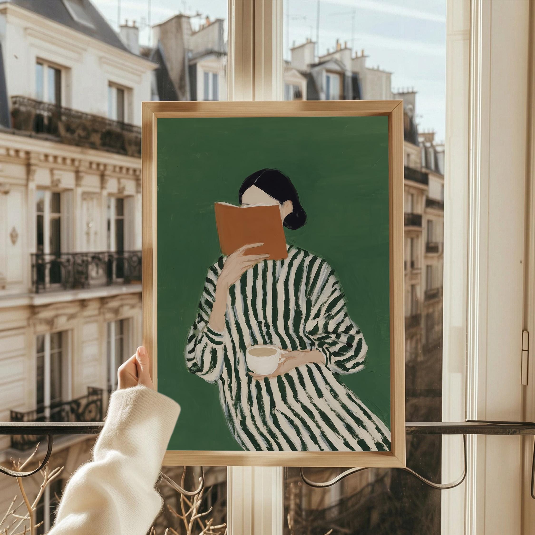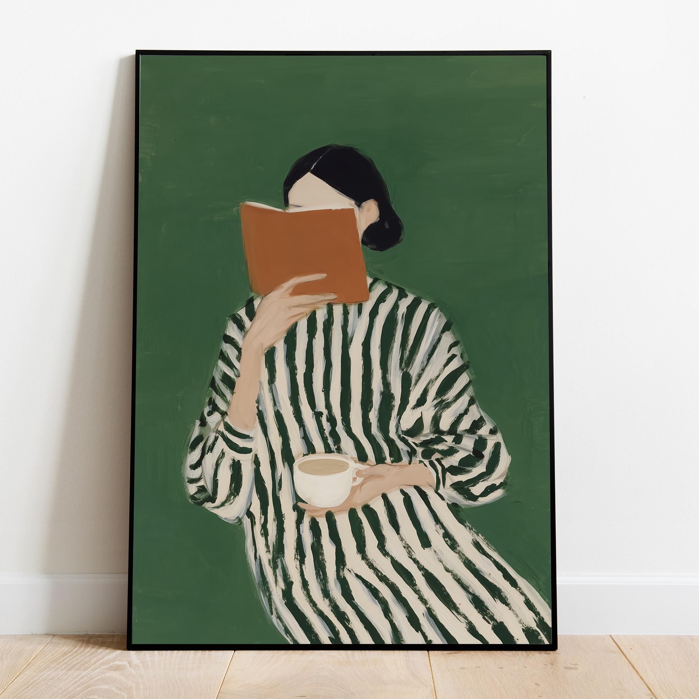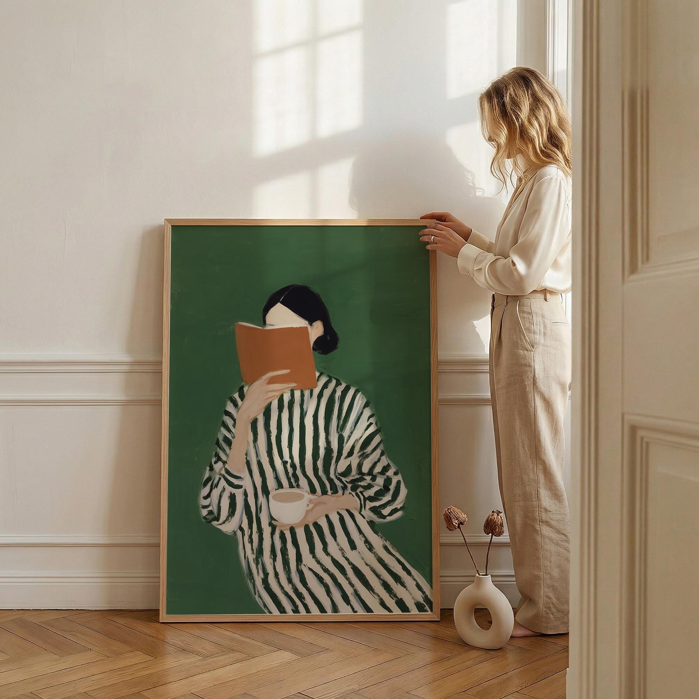 A serene woman lost in a book with her morning coffee, soft green tones and classic striped dress create timeless reading charm. Perfect for book lovers, home libraries, reading nooks, bedrooms, or office spaces that celebrate quiet moments and literary life.