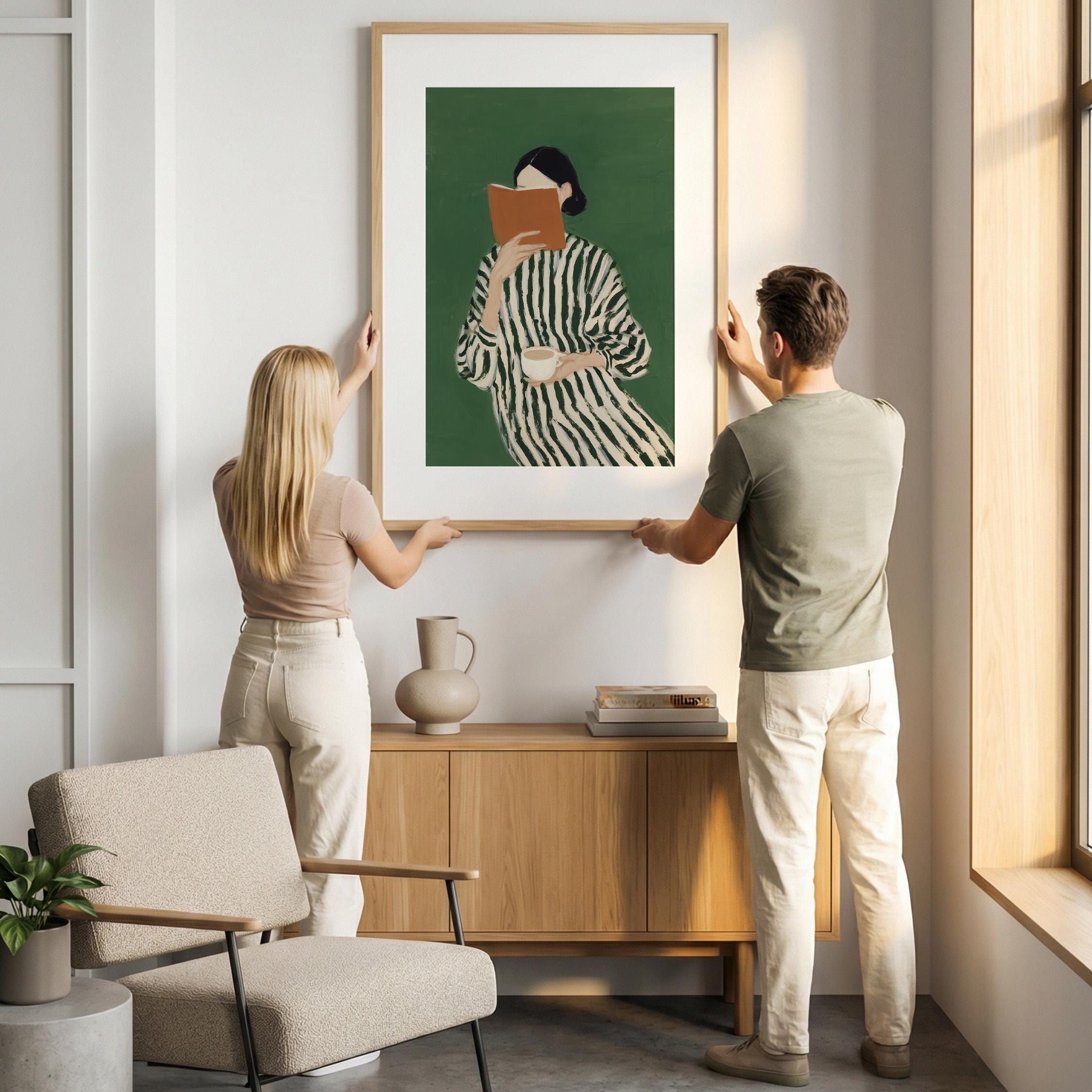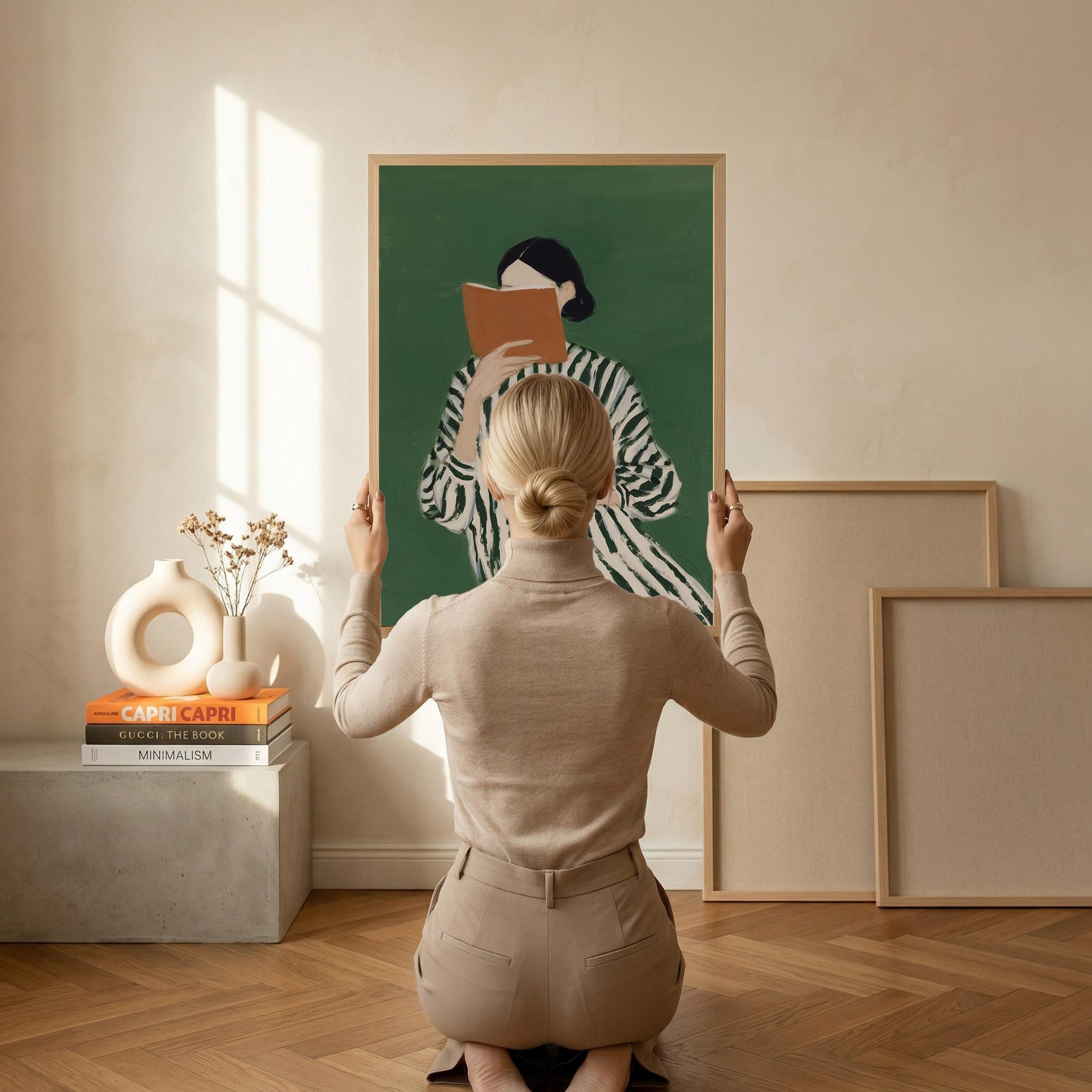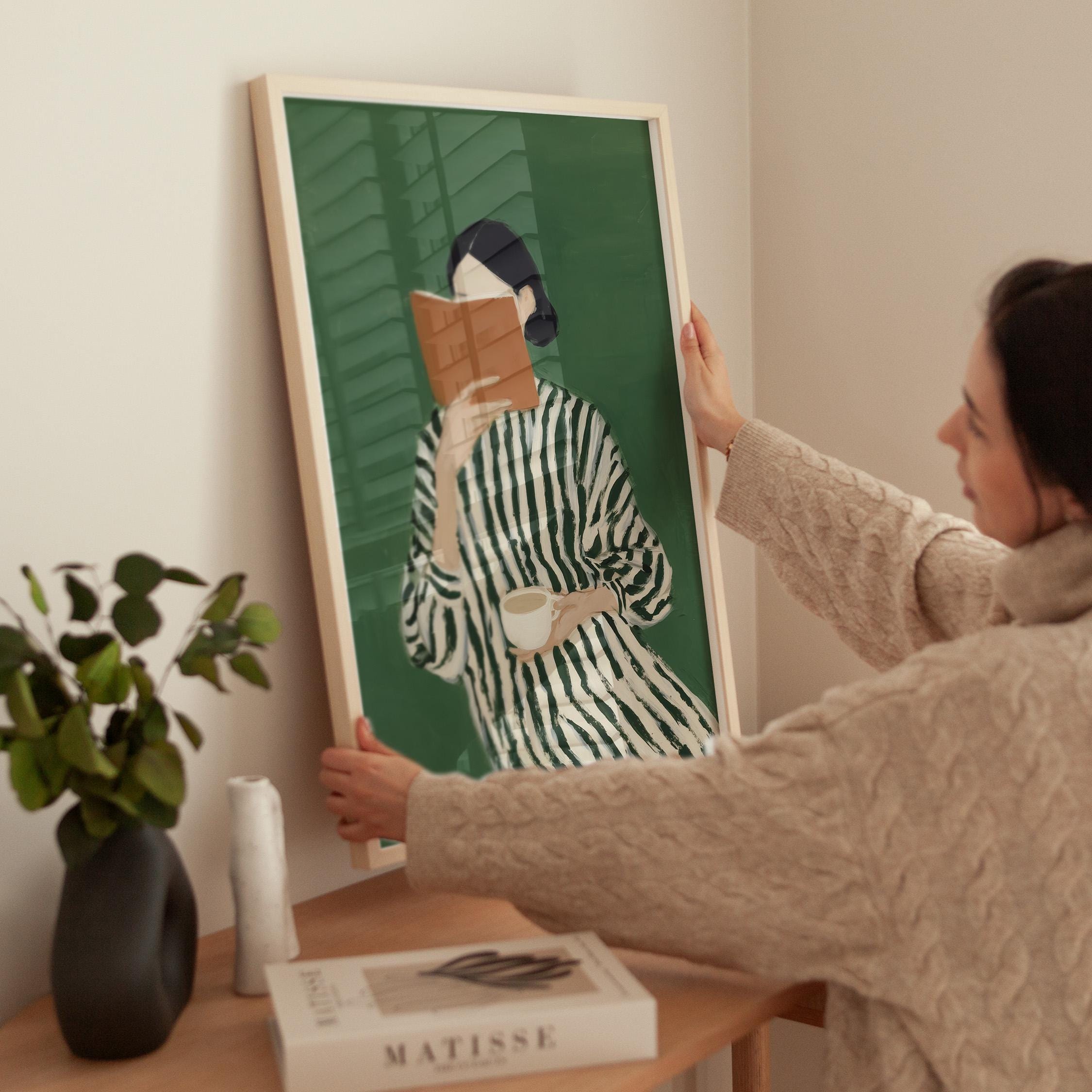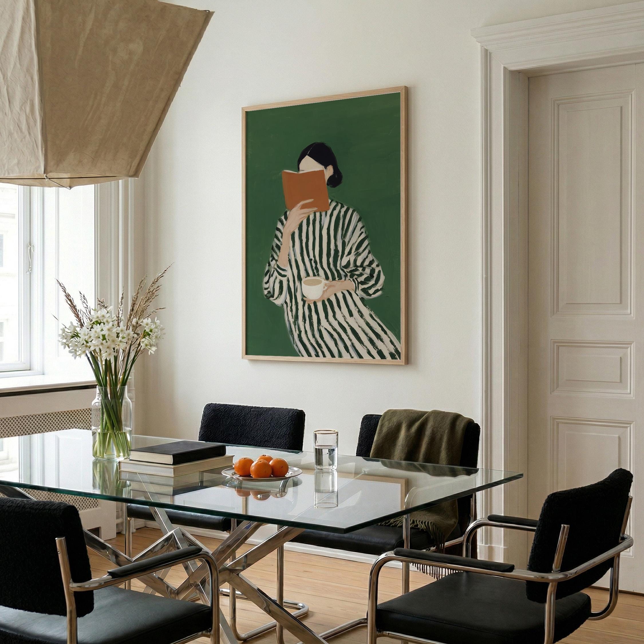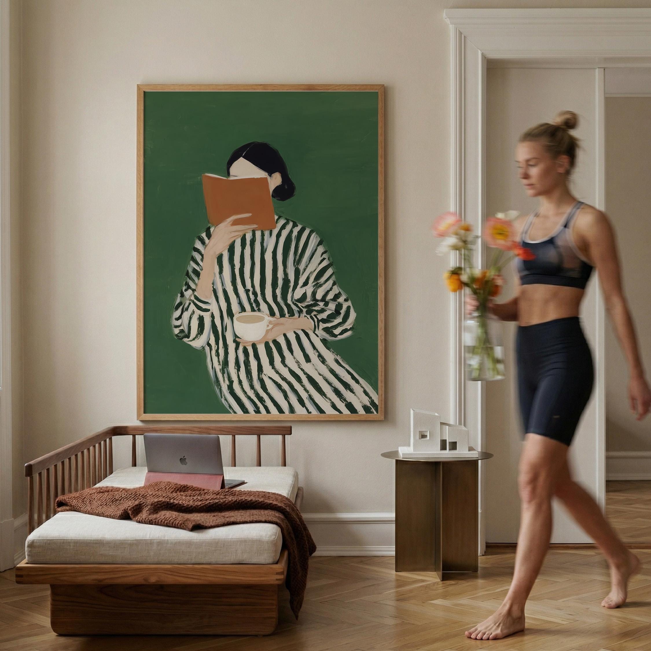 A serene woman lost in a book with her morning coffee, soft green tones and classic striped dress create timeless reading charm. Perfect for book lovers, home libraries, reading nooks, bedrooms, or office spaces that celebrate quiet moments and literary life.