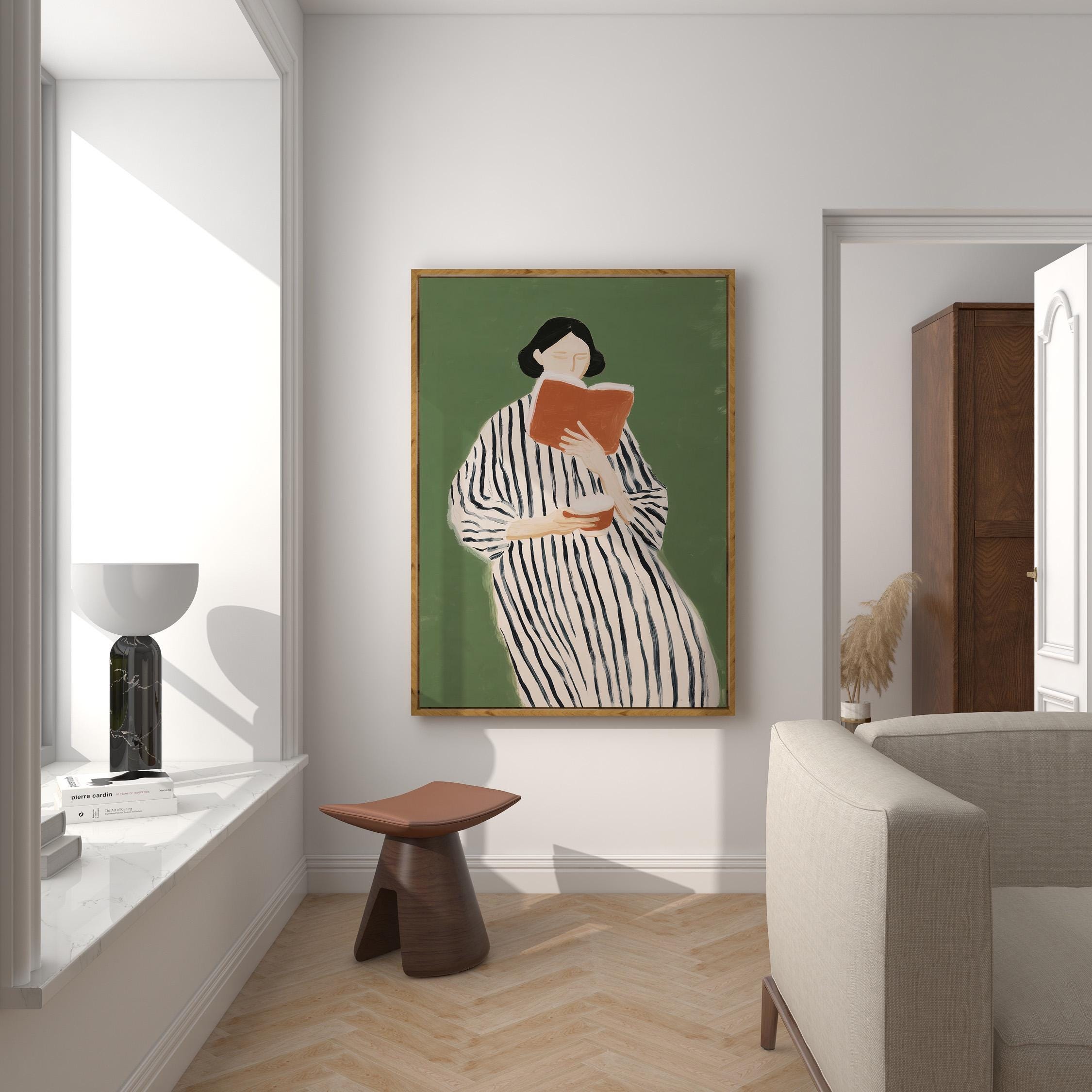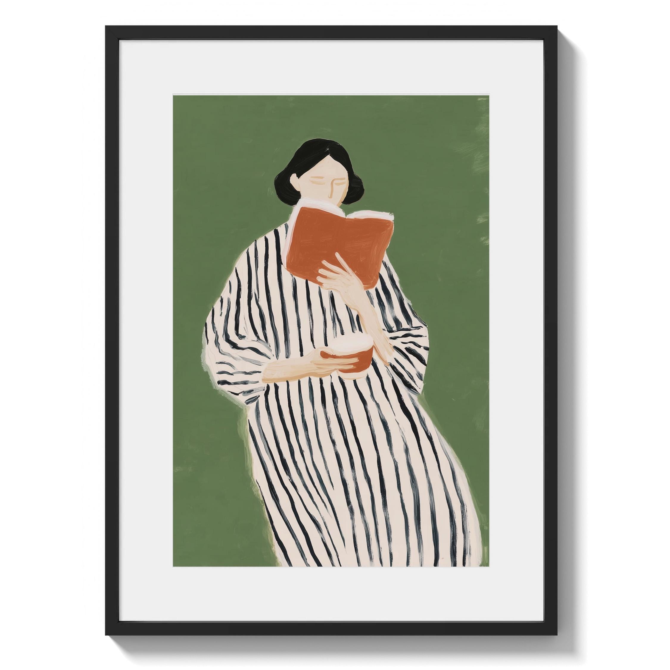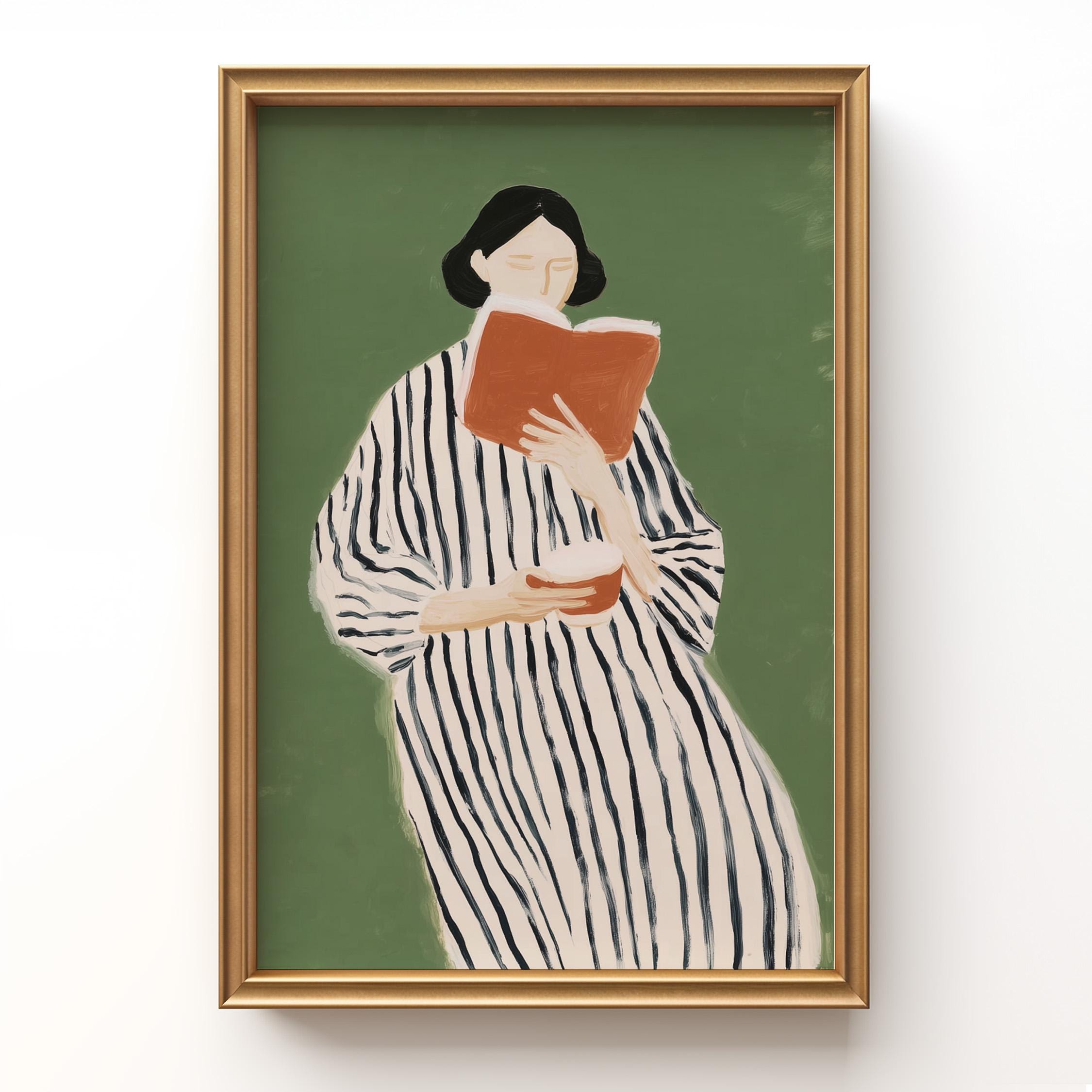 Elegant minimalist portrait of a woman lost in a book, featuring a striking striped dress against a calming sage green background.