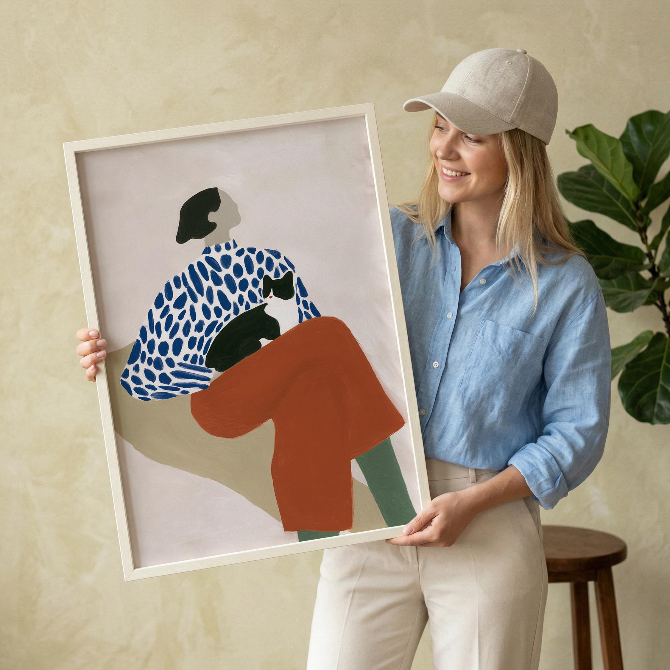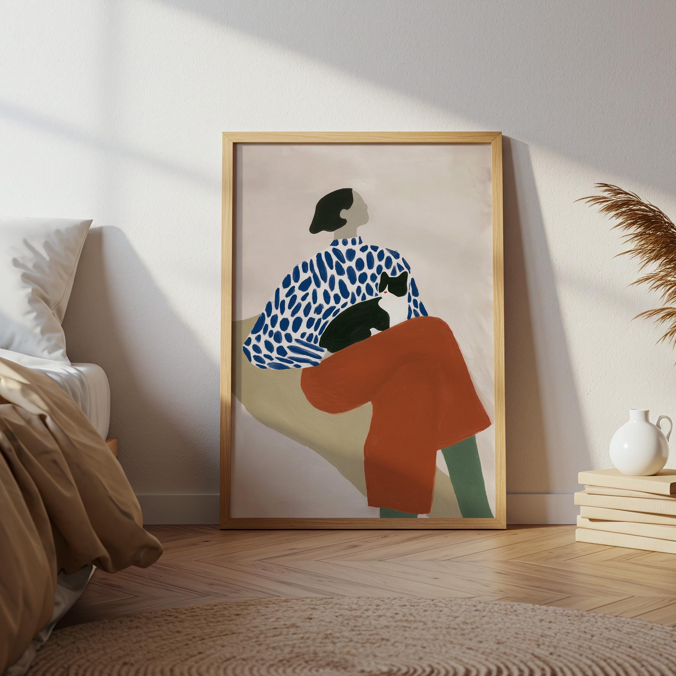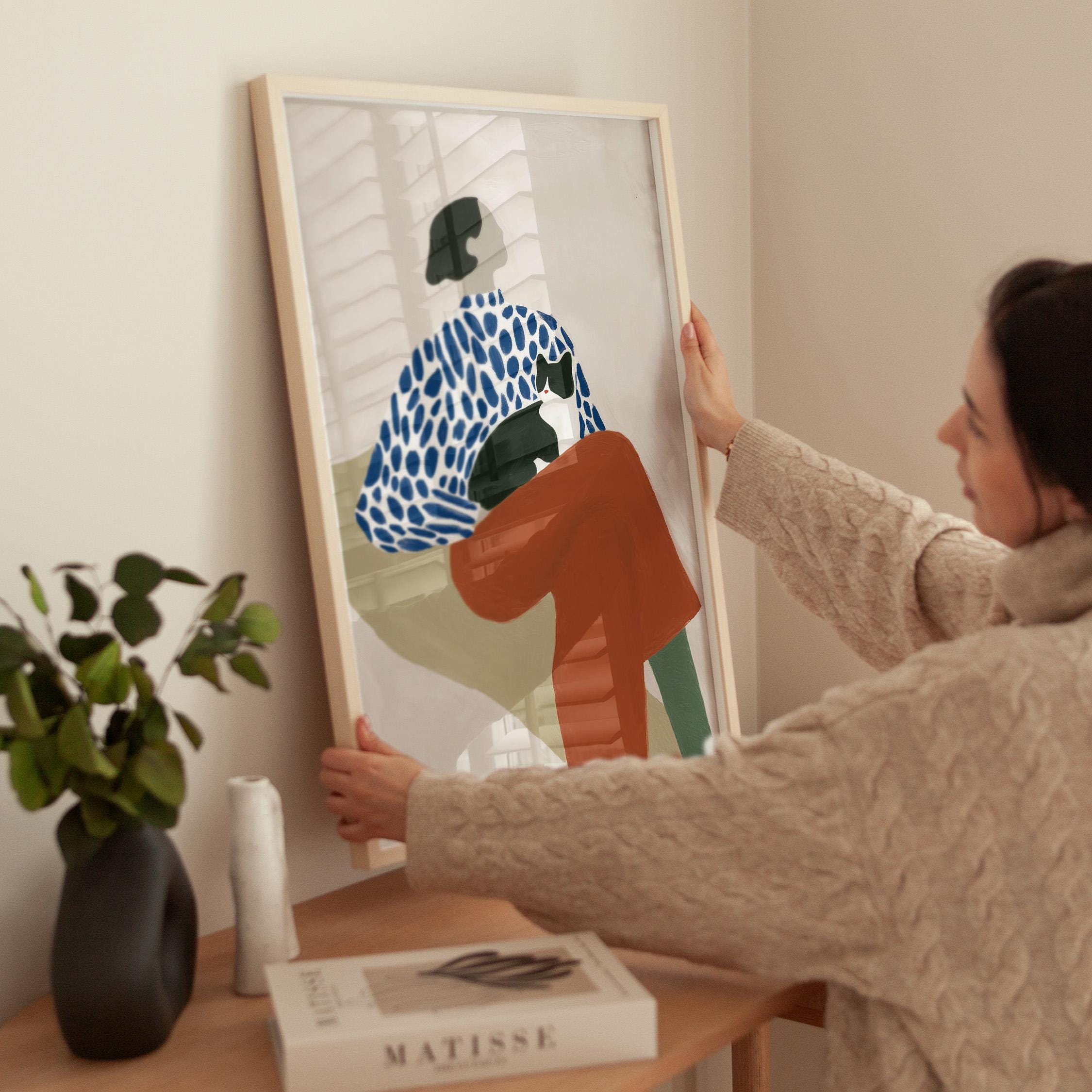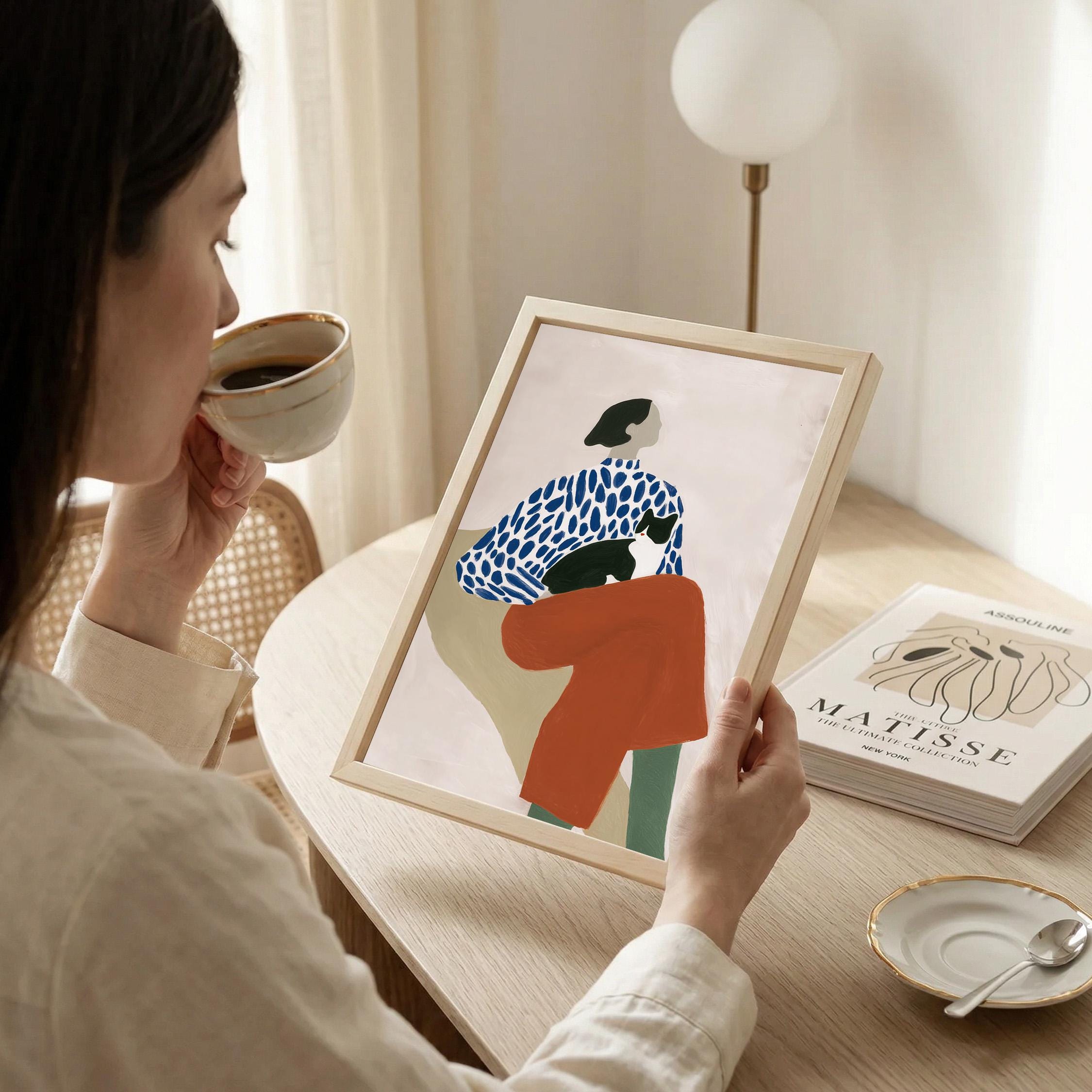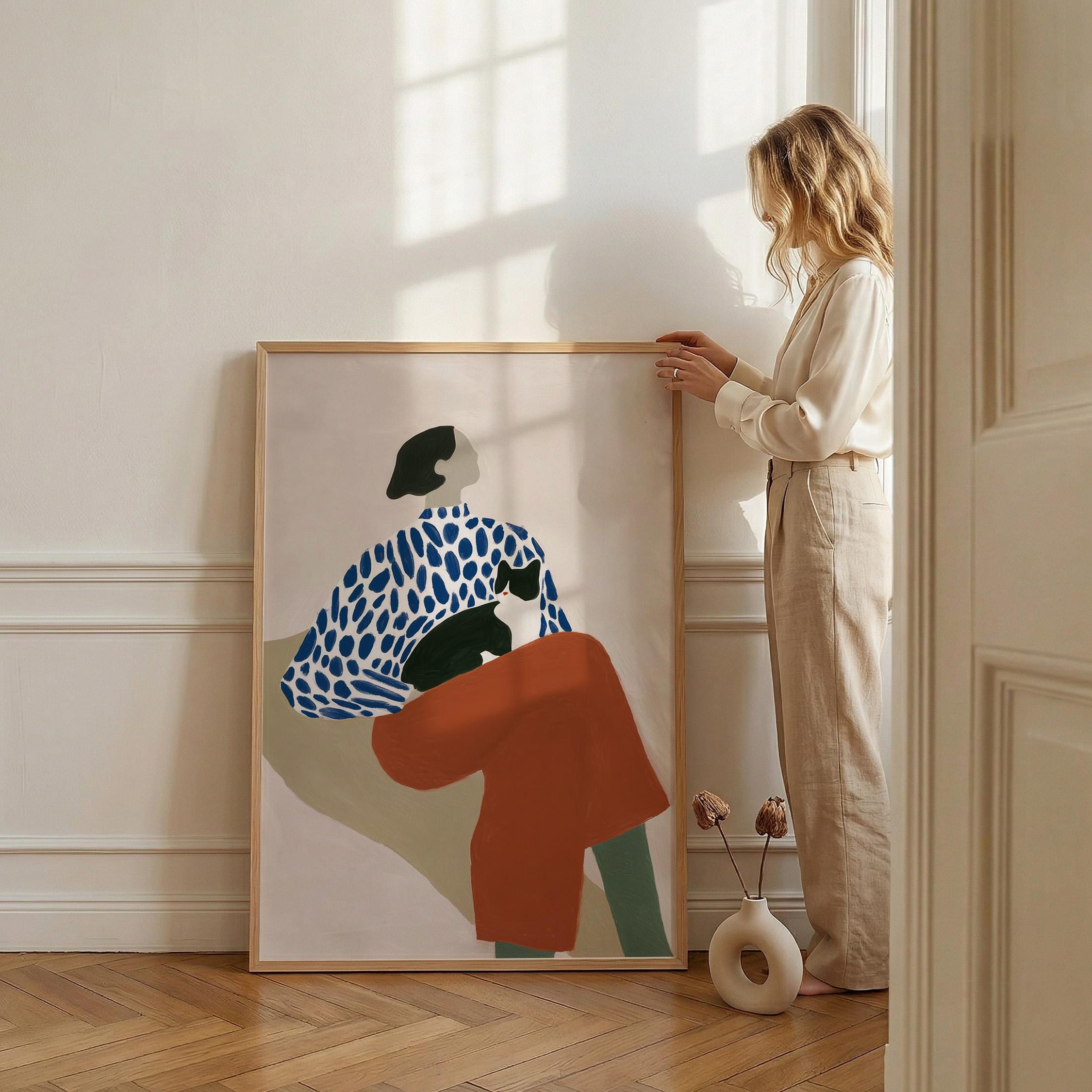 Transform your space with this modern abstract figure holding a cat, bold blue patterns meet warm terracotta in a Matisse-inspired composition. Perfect for cat lovers decorating a living room, bedroom, or reading nook with contemporary minimalist style.