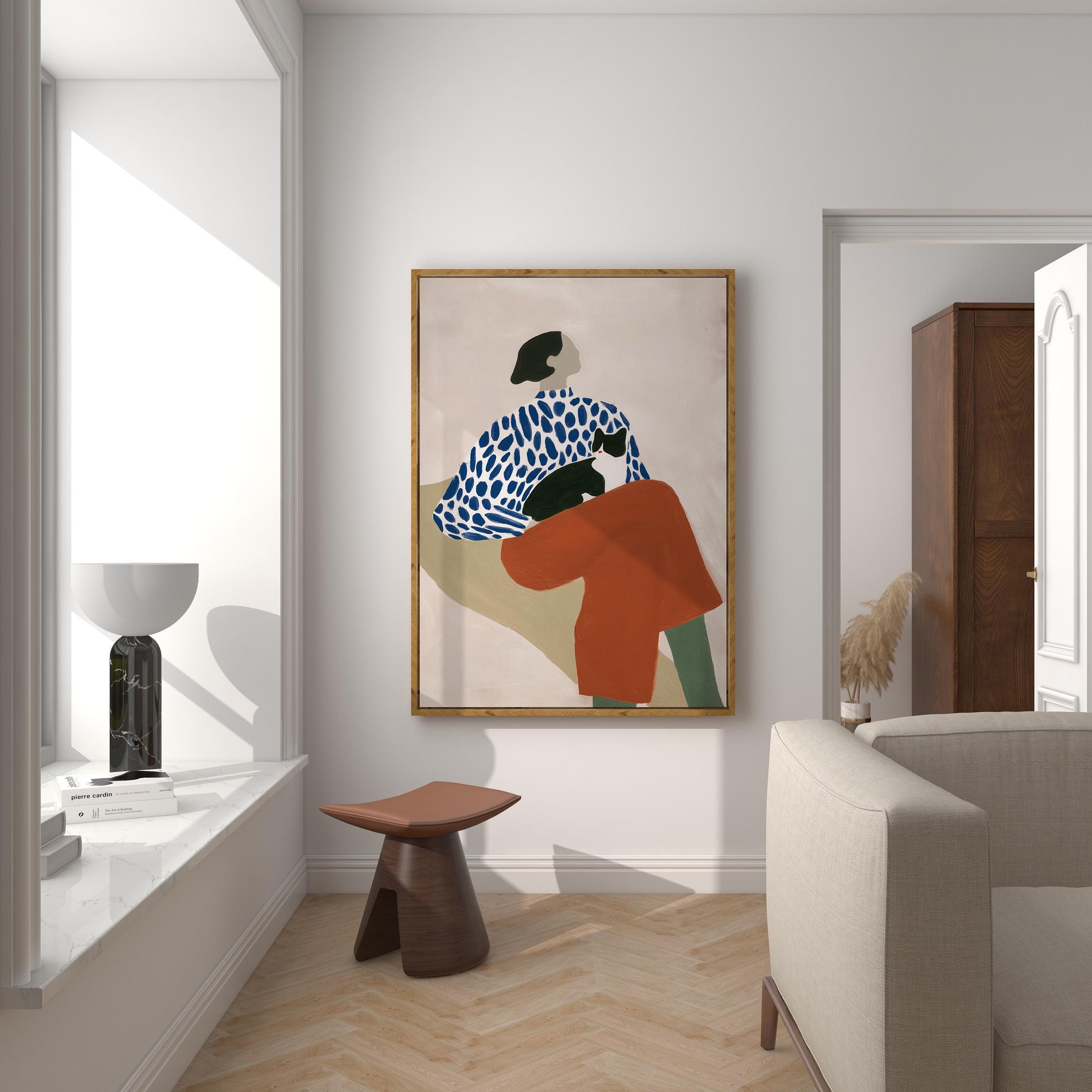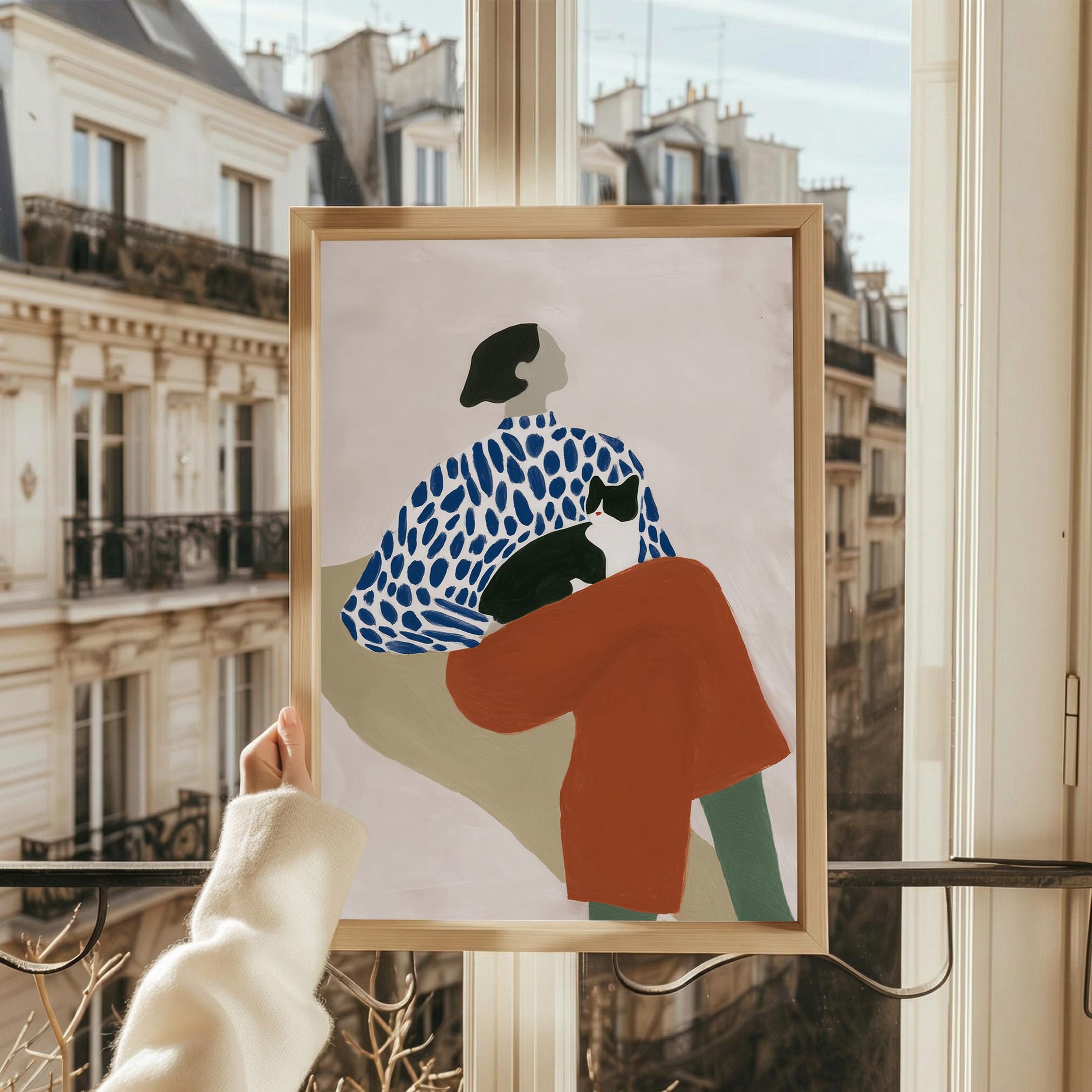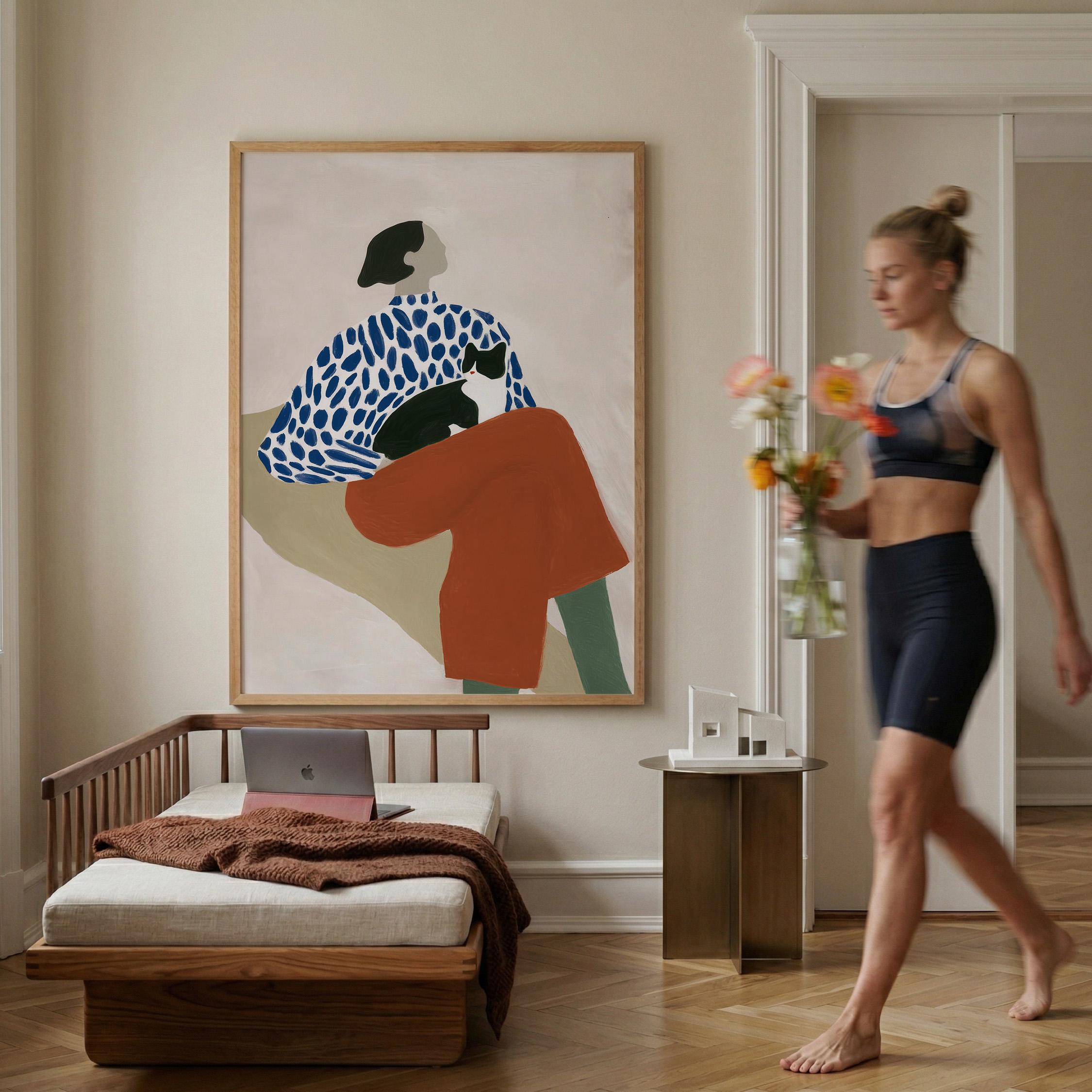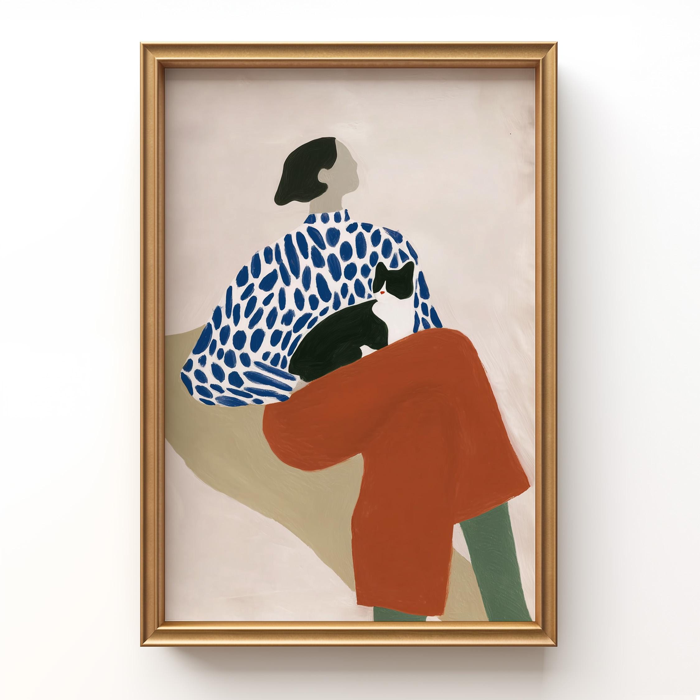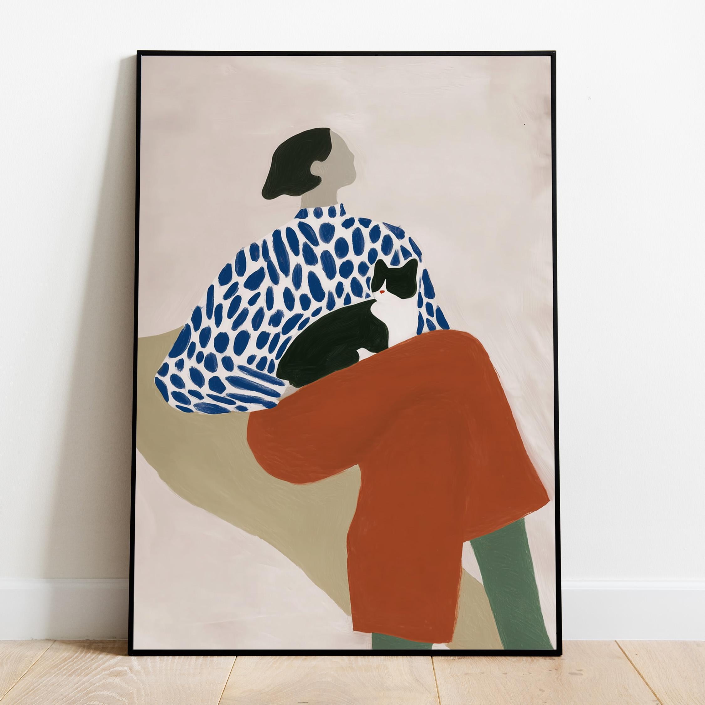 Transform your space with this modern abstract figure holding a cat, bold blue patterns meet warm terracotta in a Matisse-inspired composition. Perfect for cat lovers decorating a living room, bedroom, or reading nook with contemporary minimalist style.