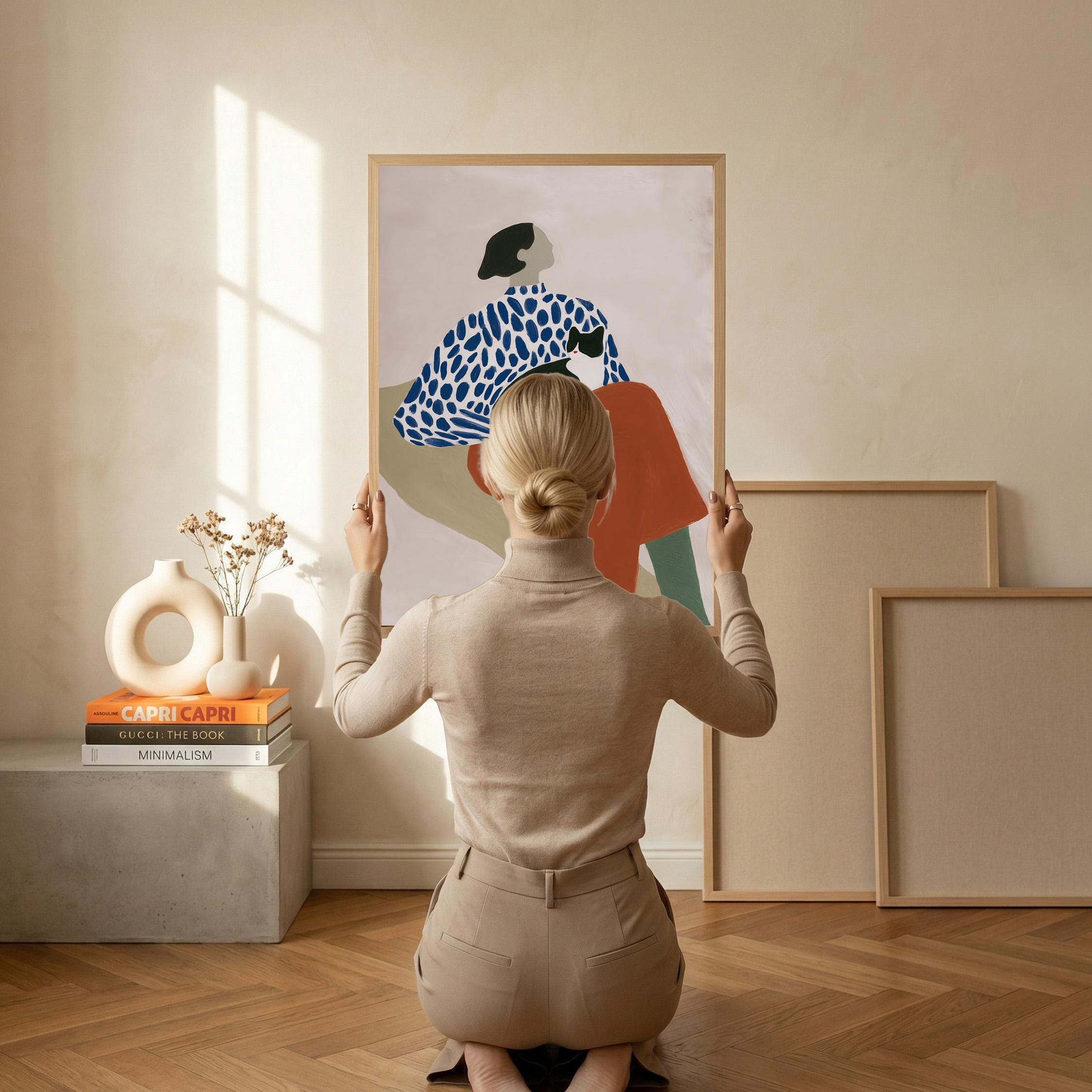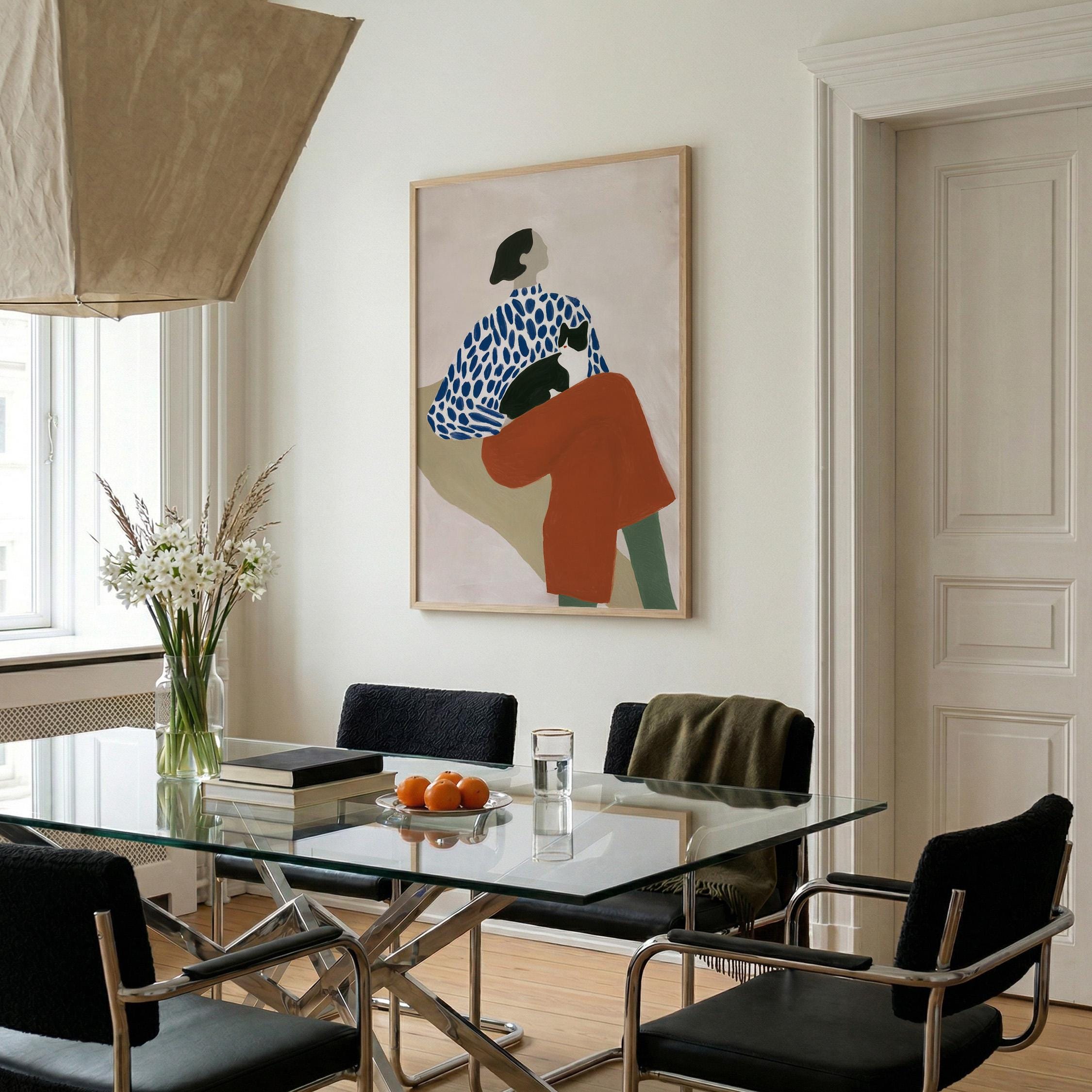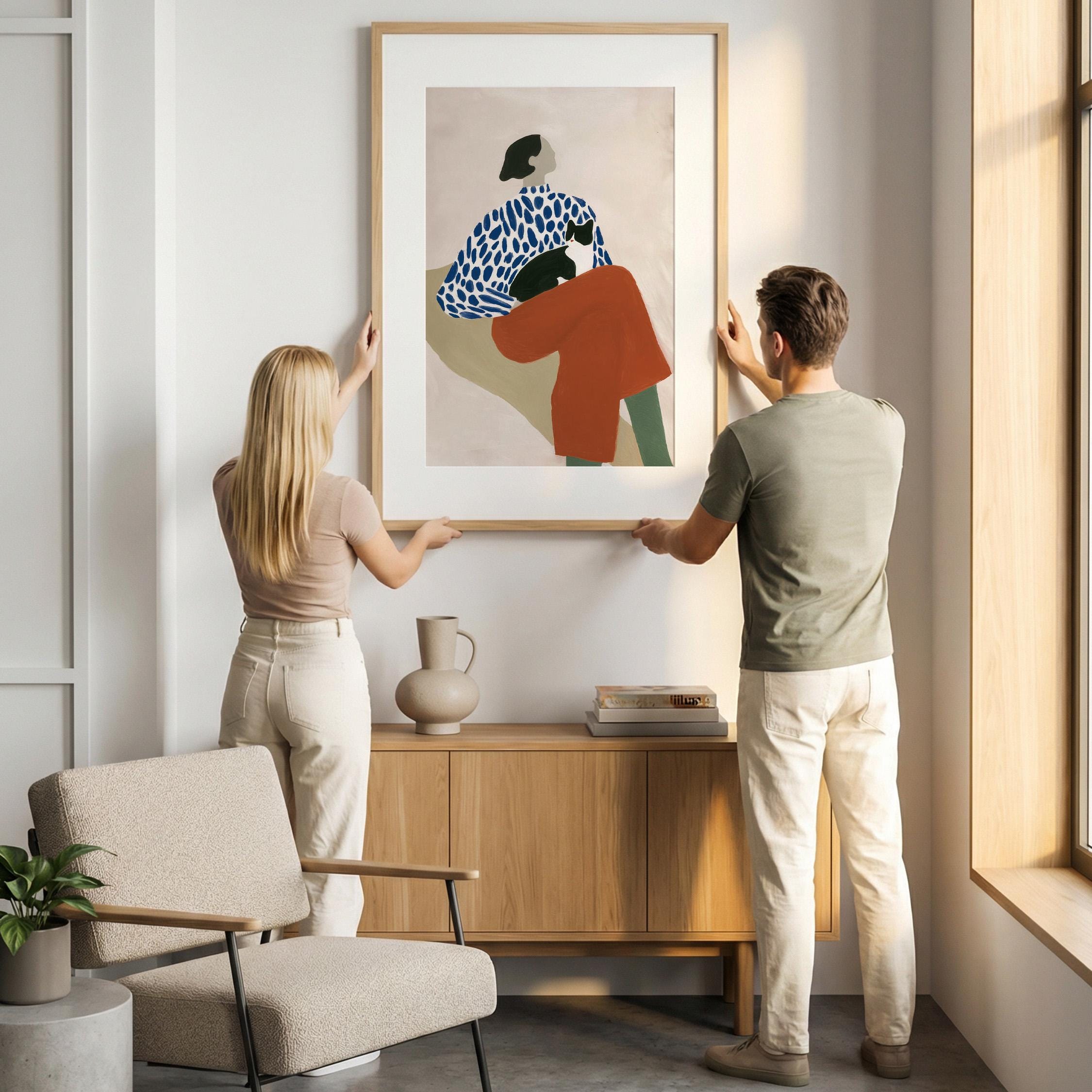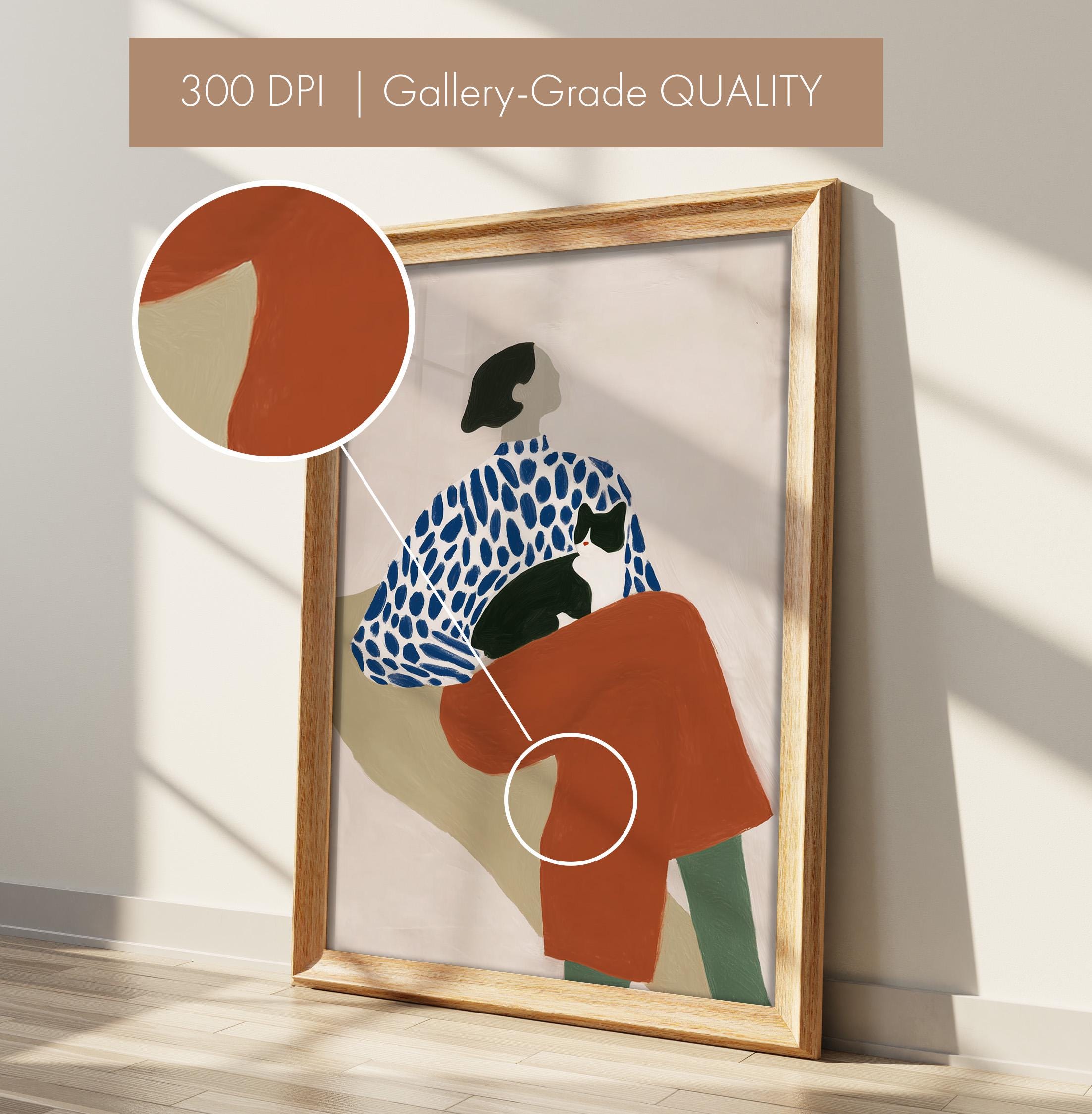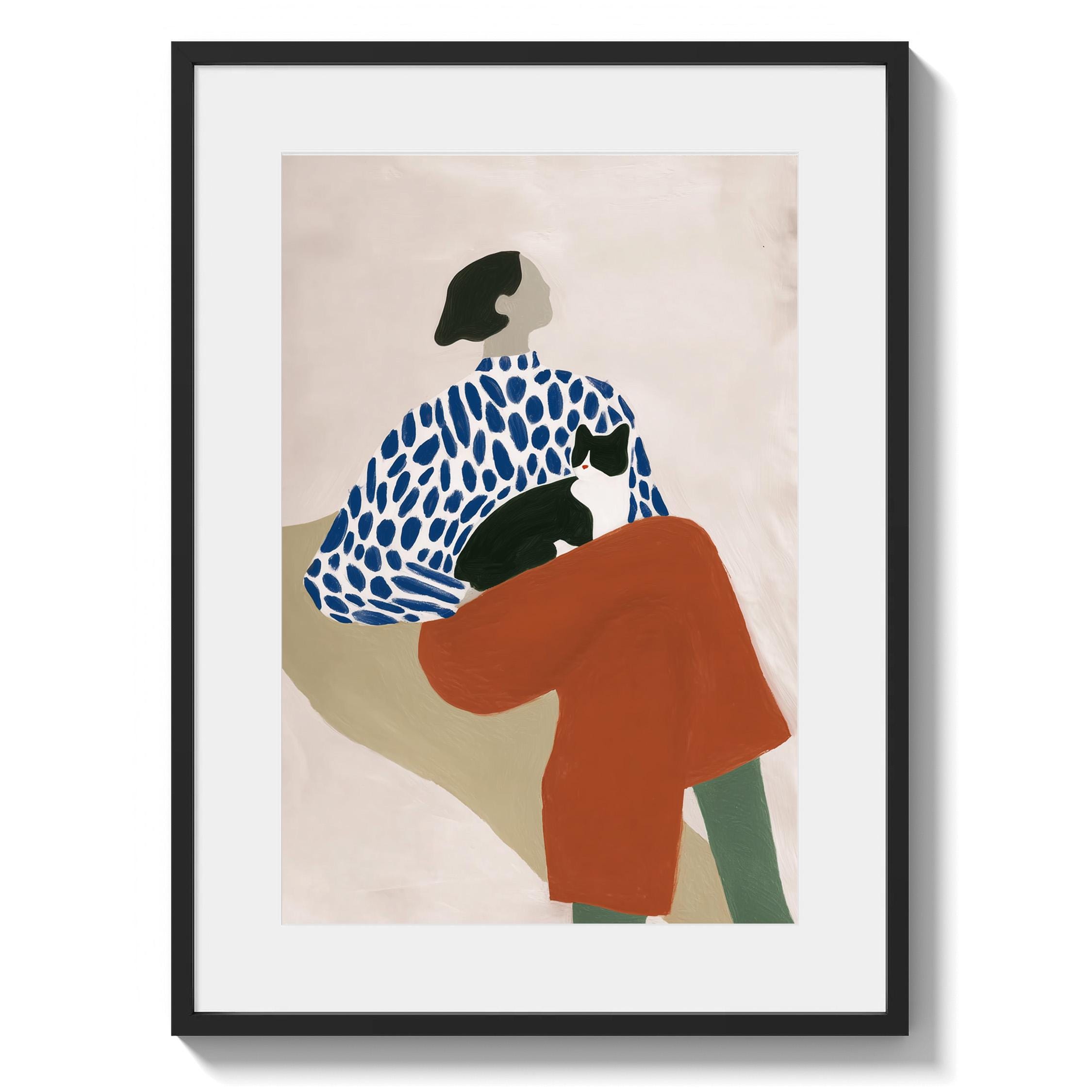 Transform your space with this modern abstract figure holding a cat, bold blue patterns meet warm terracotta in a Matisse-inspired composition. Perfect for cat lovers decorating a living room, bedroom, or reading nook with contemporary minimalist style.