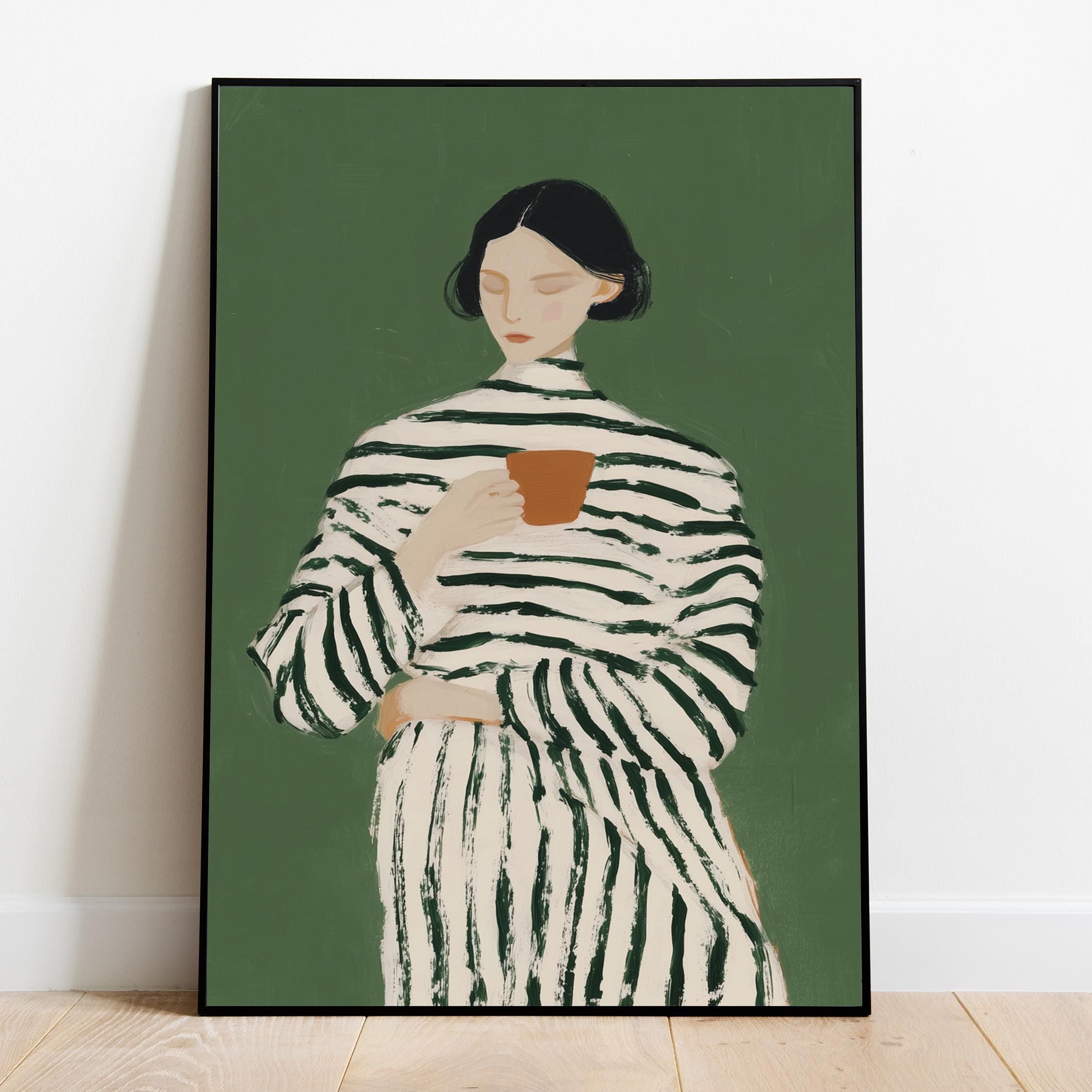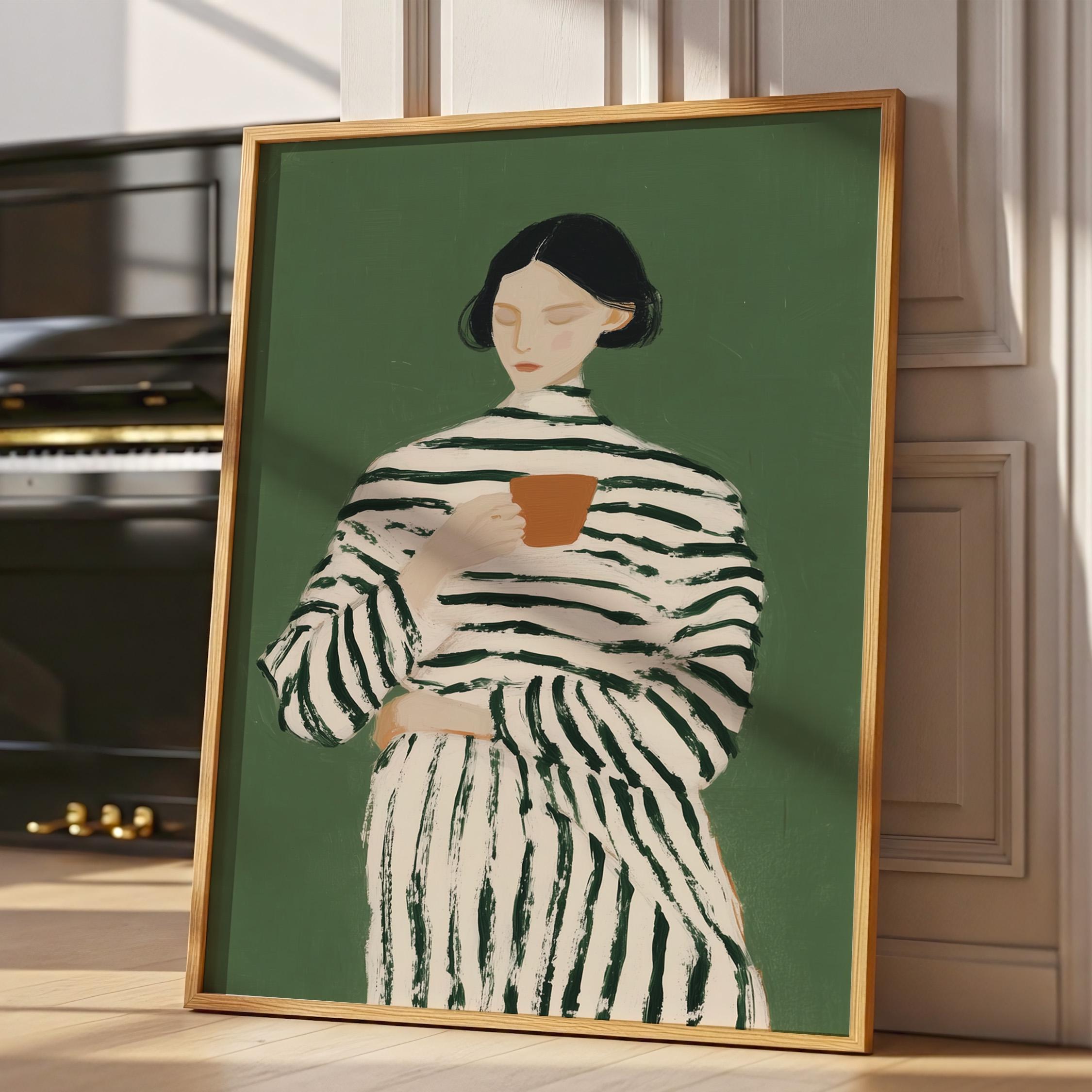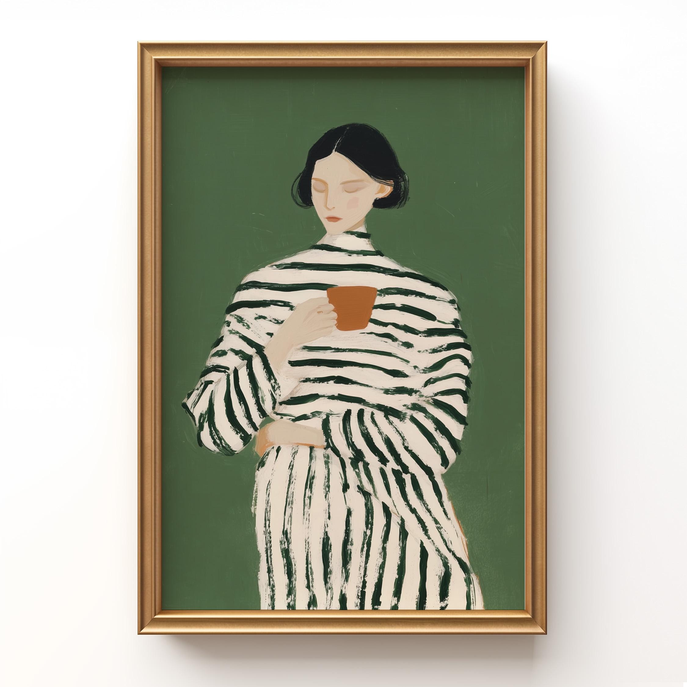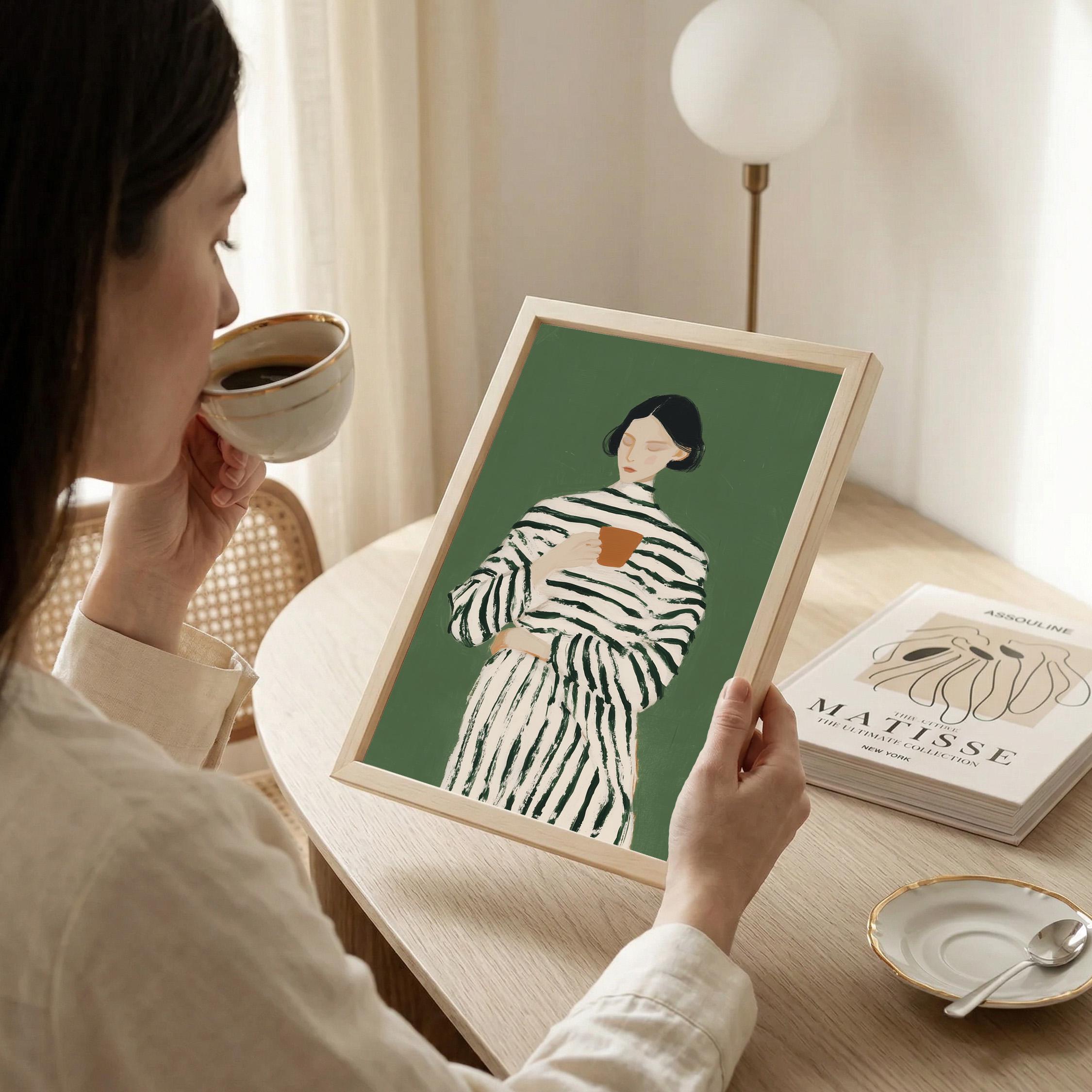 Transform your coffee nook with this serene vintage-style portrait of a woman savoring her morning cup, set against a calming sage green background. Perfect for kitchens, dining rooms, breakfast nooks, or cafe-inspired spaces, ideal for coffee lovers and collectors of modern minimalist figure art.