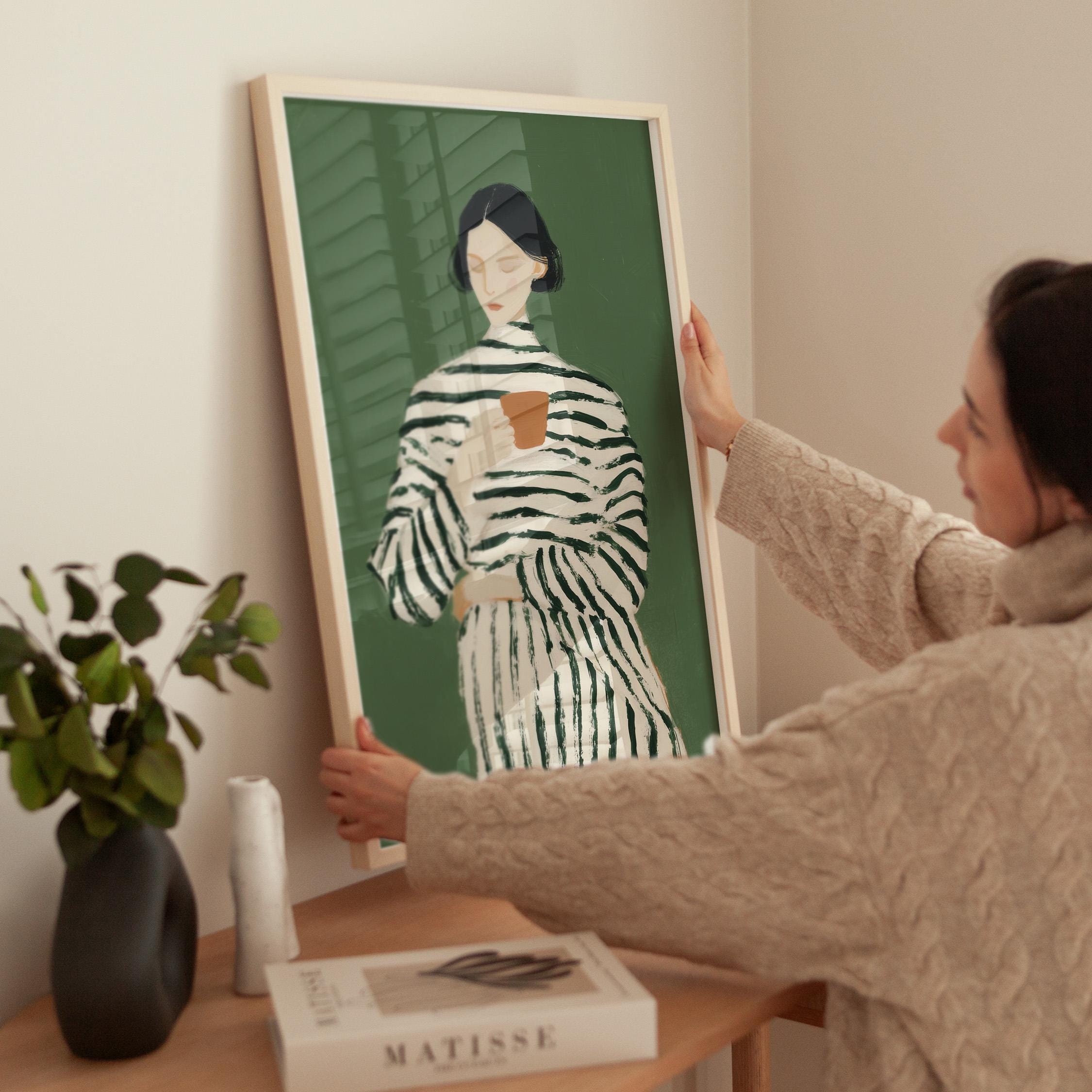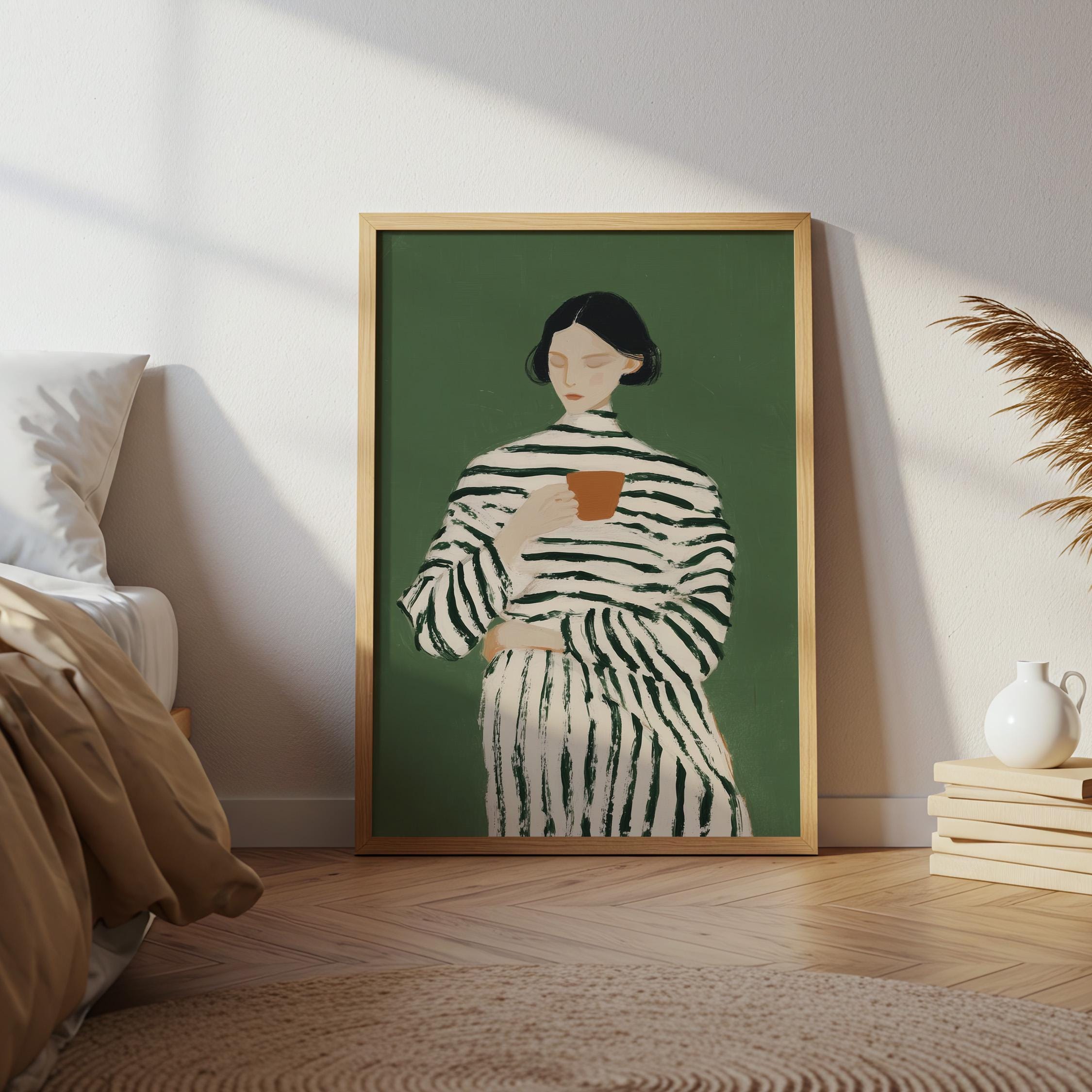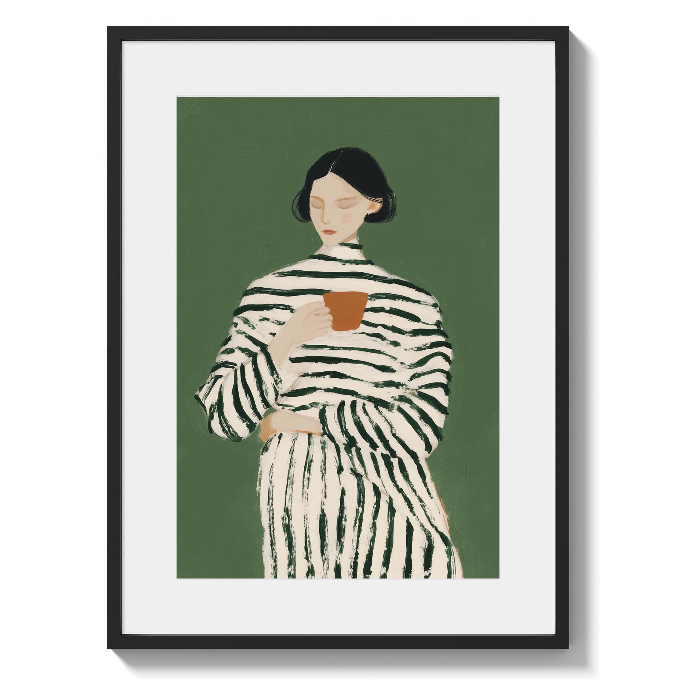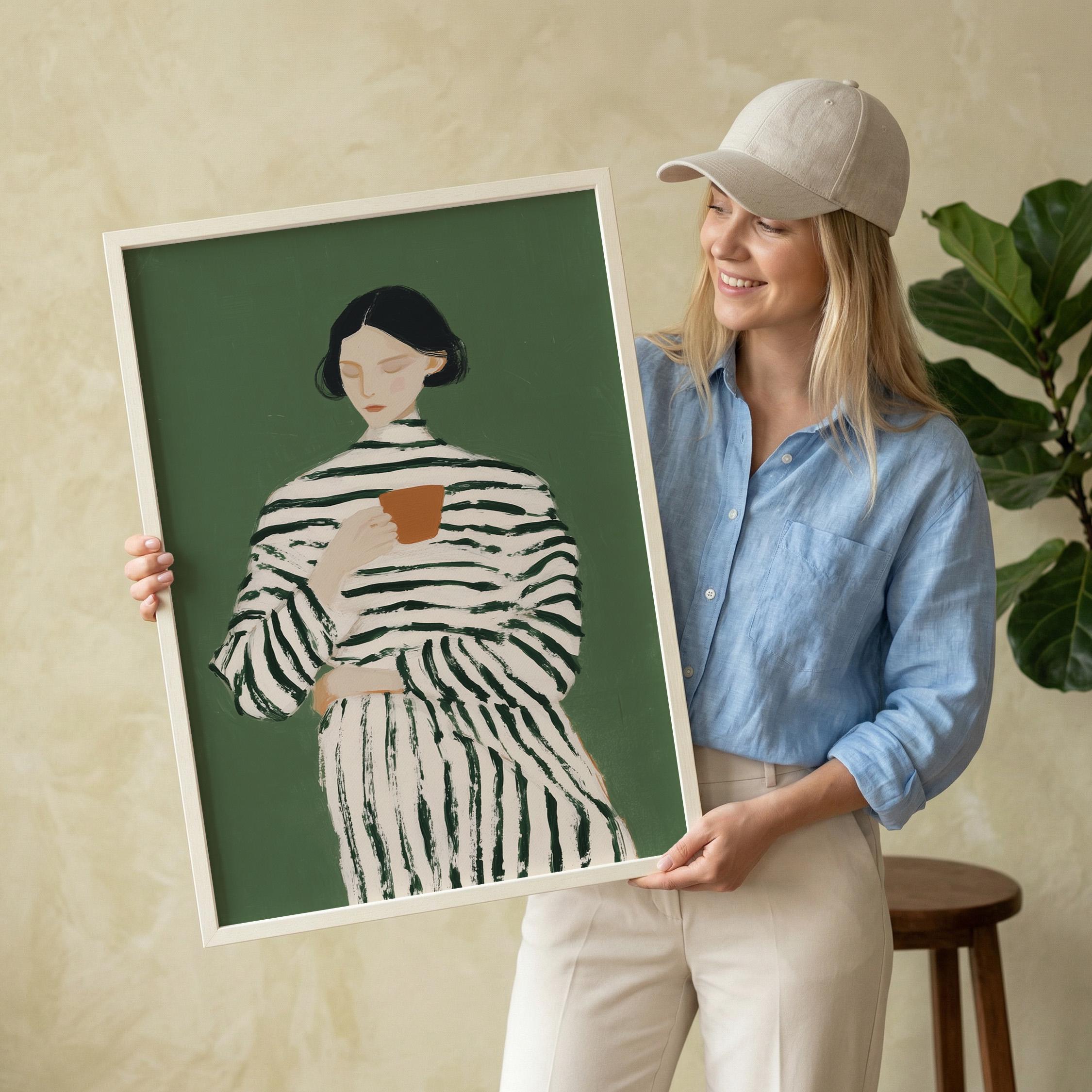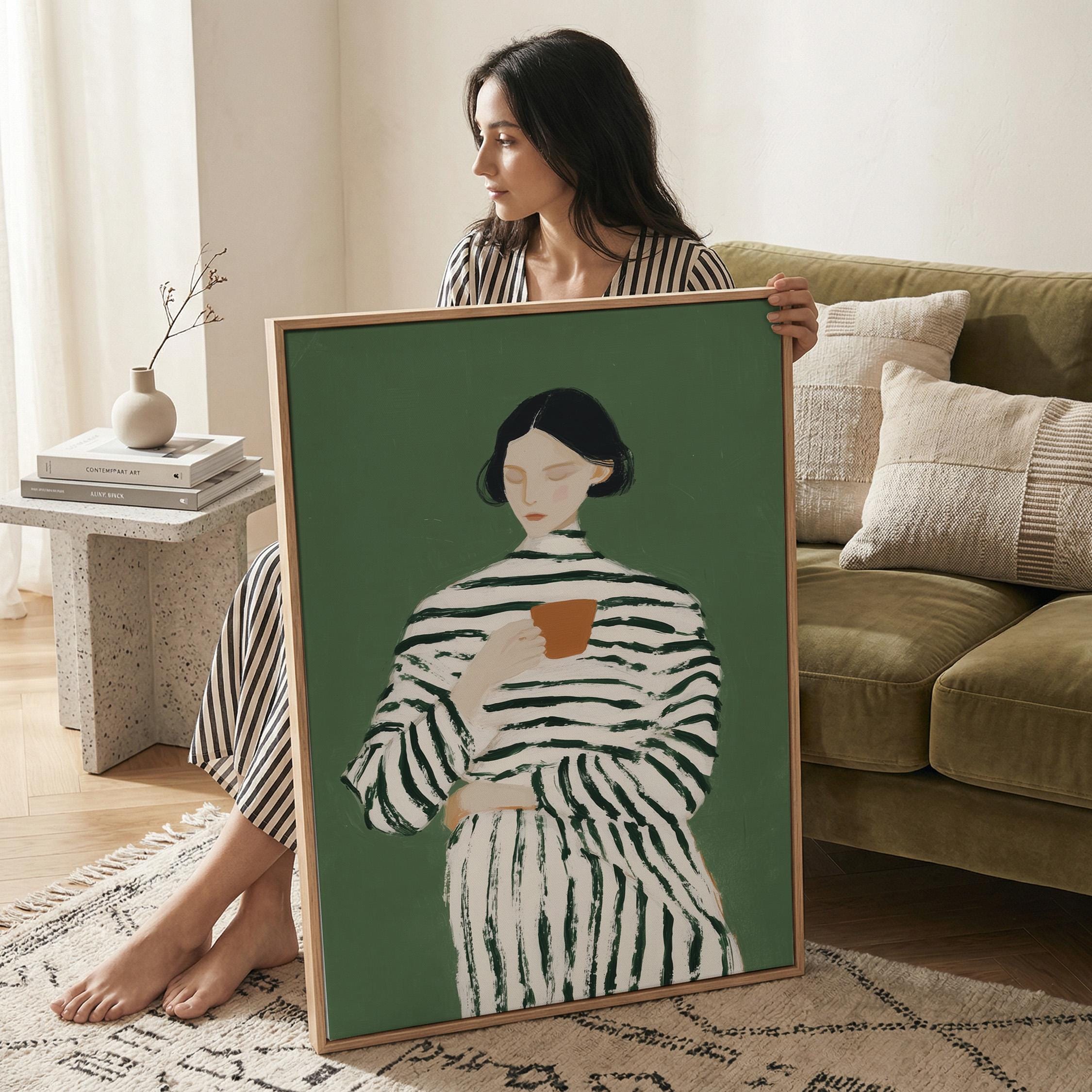 Transform your coffee nook with this serene vintage-style portrait of a woman savoring her morning cup, set against a calming sage green background. Perfect for kitchens, dining rooms, breakfast nooks, or cafe-inspired spaces, ideal for coffee lovers and collectors of modern minimalist figure art.