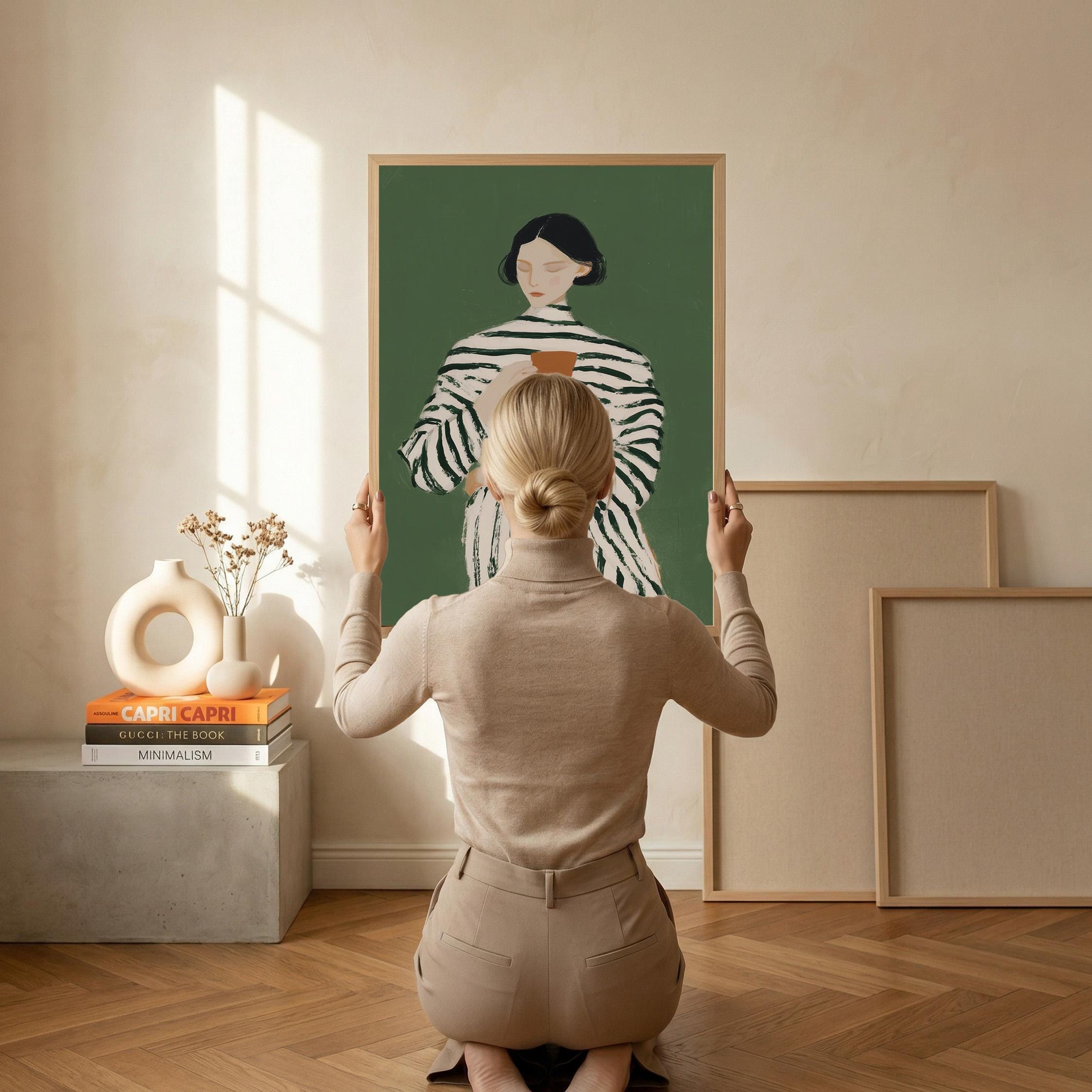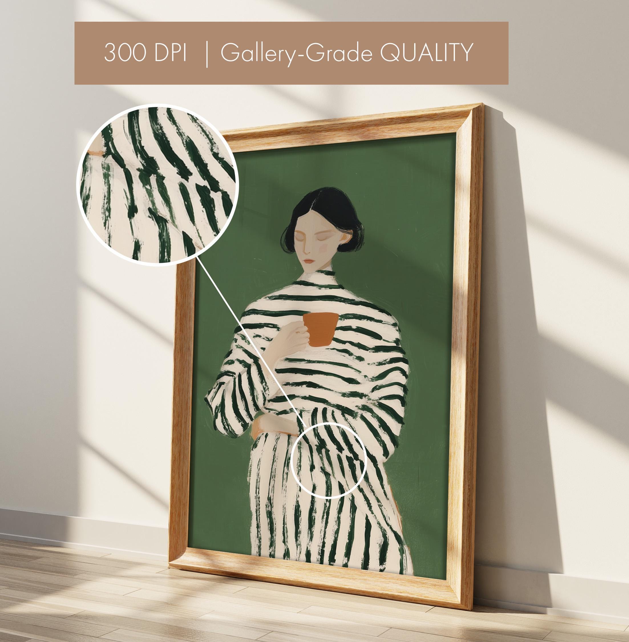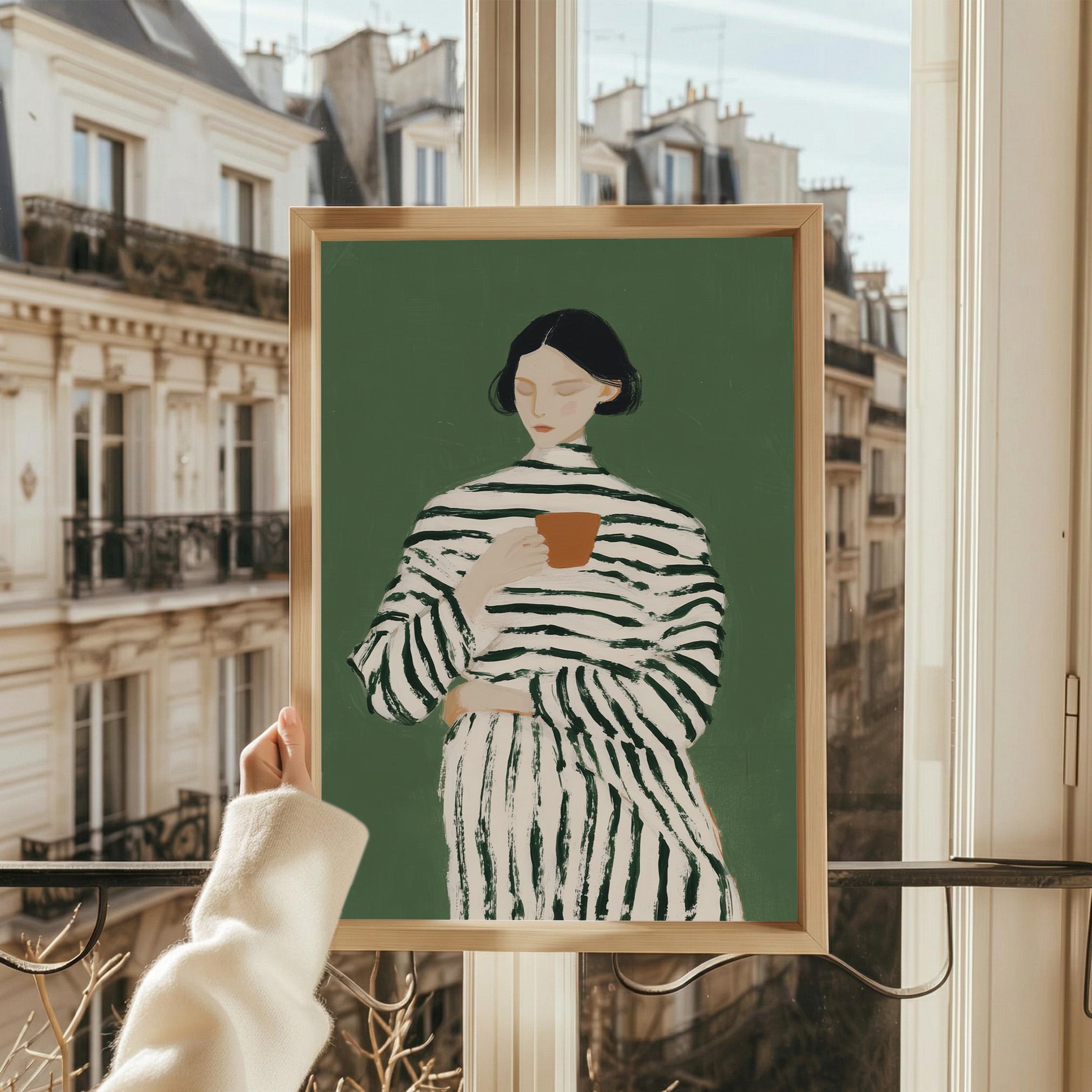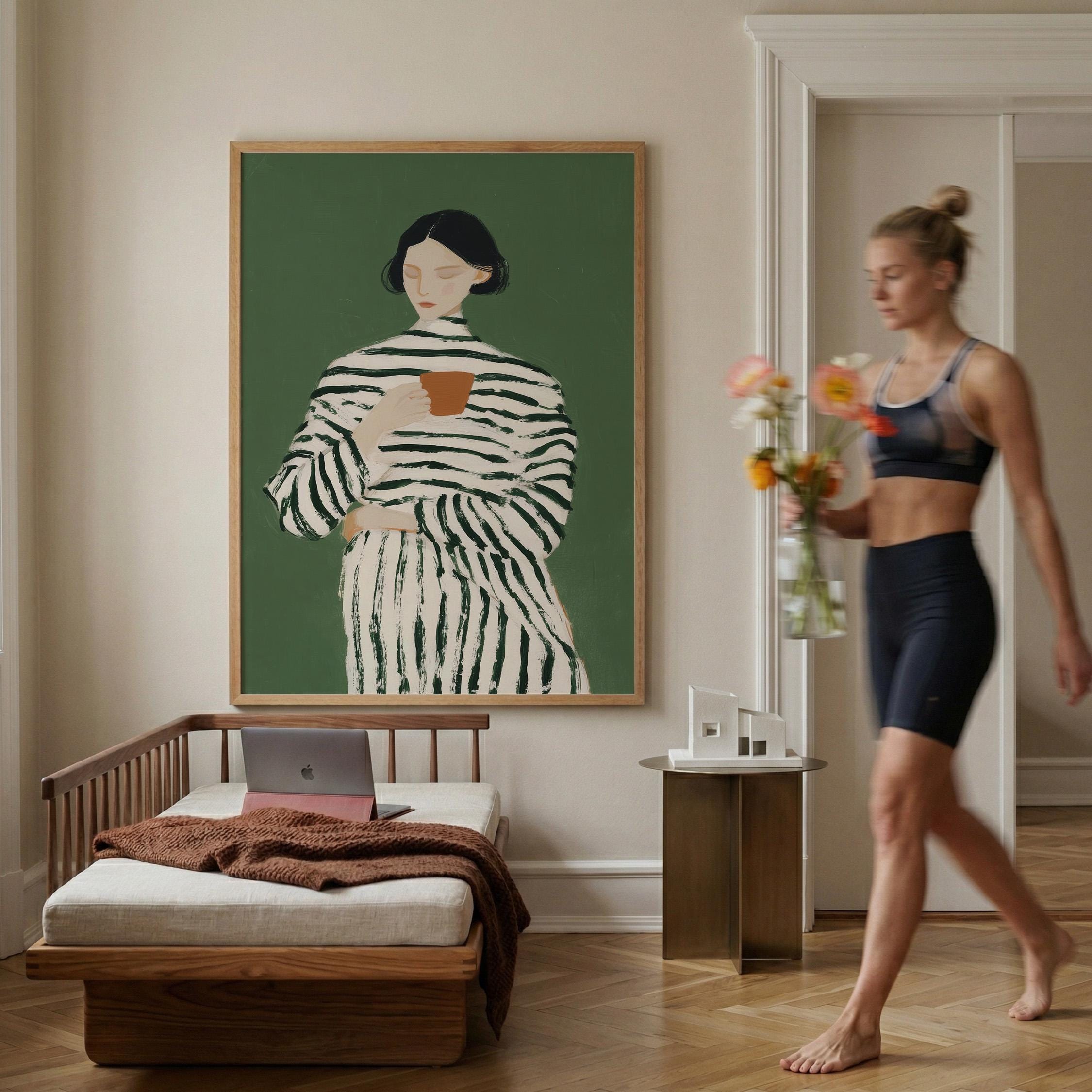 Transform your coffee nook with this serene vintage-style portrait of a woman savoring her morning cup, set against a calming sage green background. Perfect for kitchens, dining rooms, breakfast nooks, or cafe-inspired spaces, ideal for coffee lovers and collectors of modern minimalist figure art.