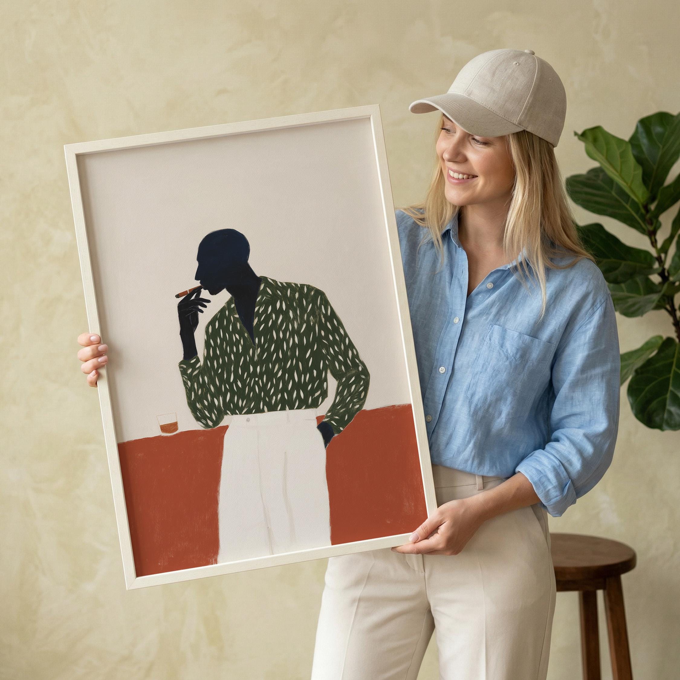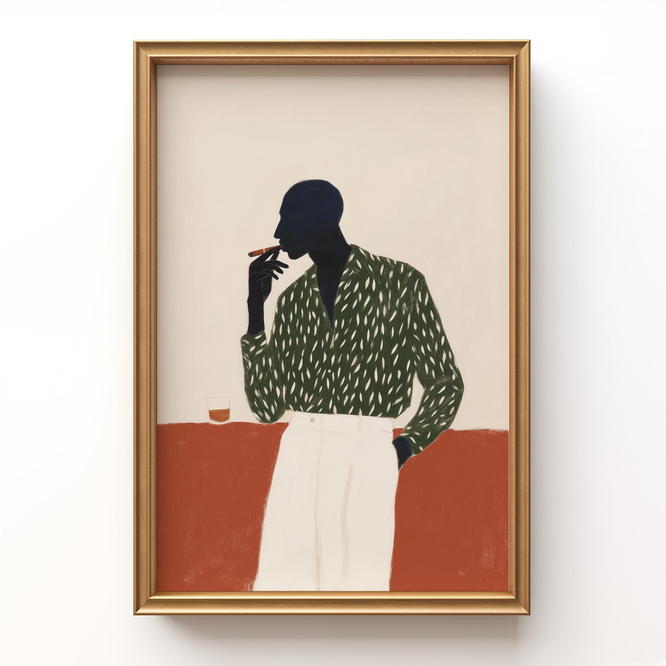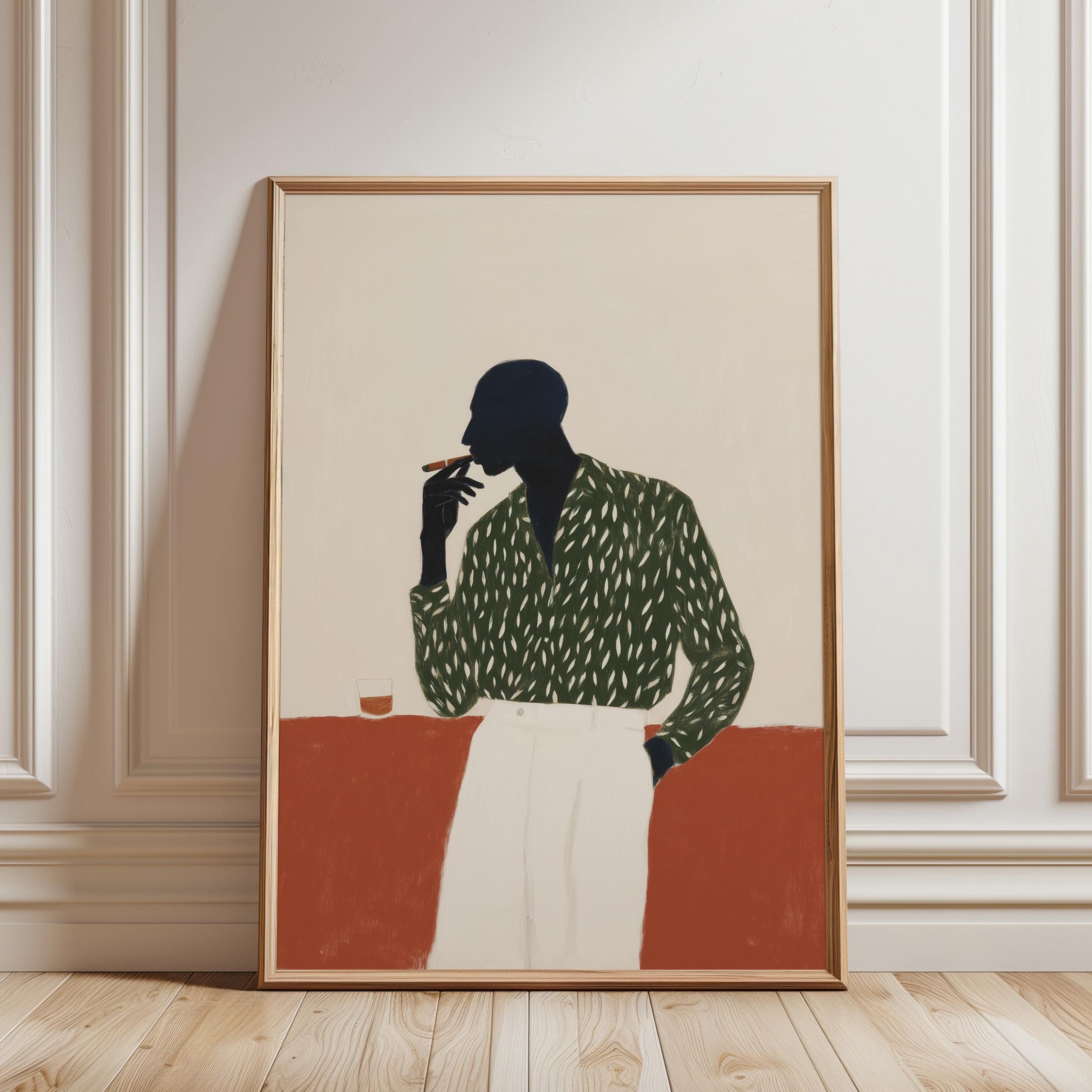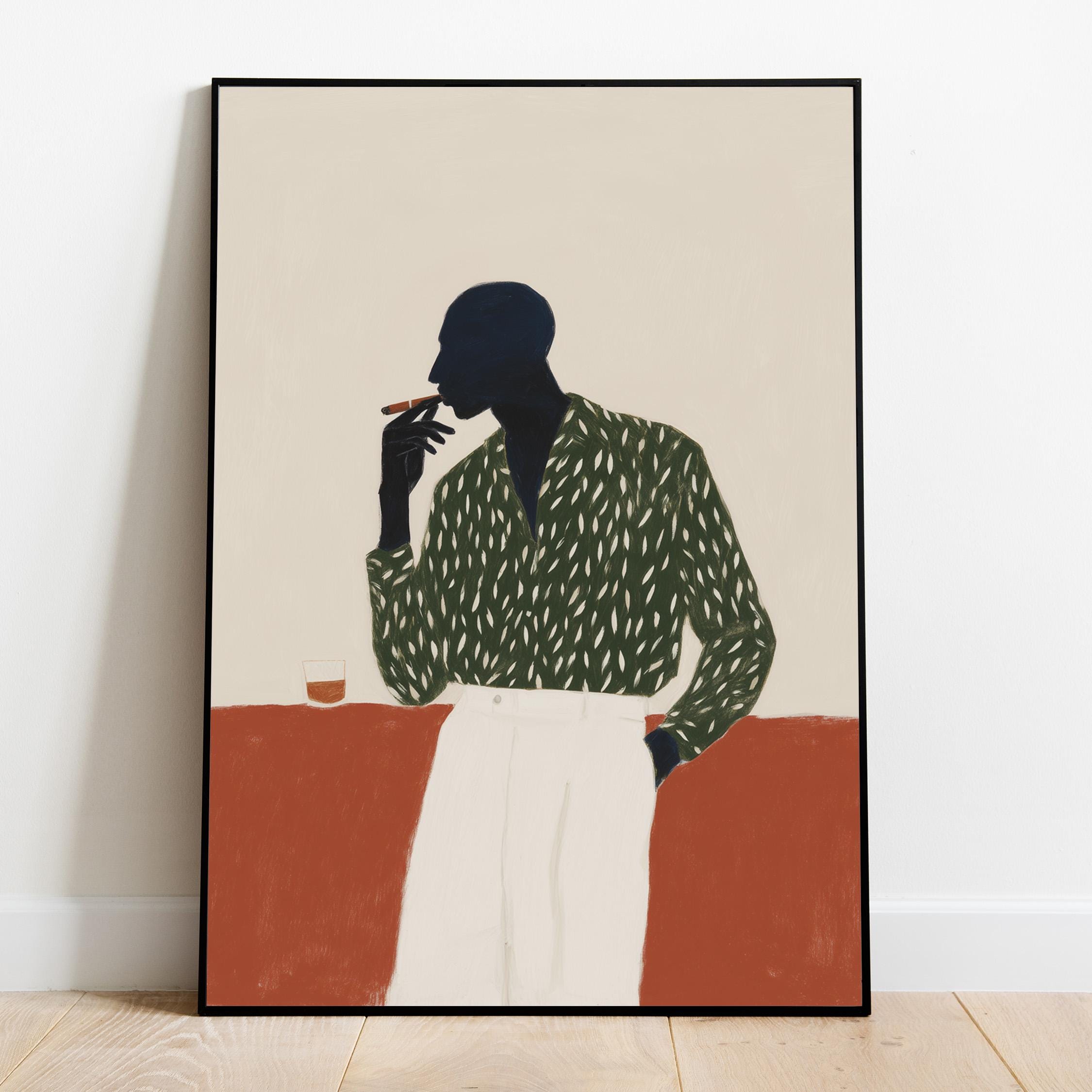 Perfect for masculine spaces like home offices, cigar lounges, man caves, living rooms, or modern bachelor pads seeking refined character. Brings a cool, contemplative mood with retro modernist flair and timeless elegance to any wall.