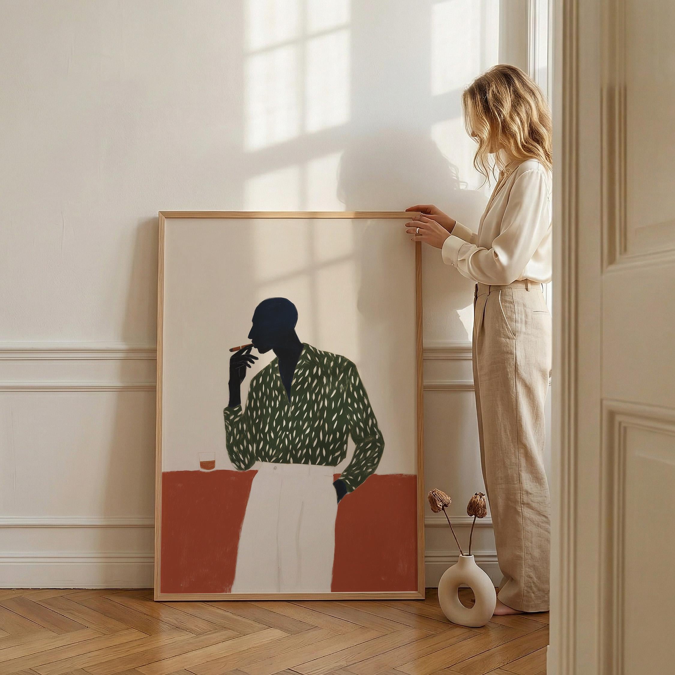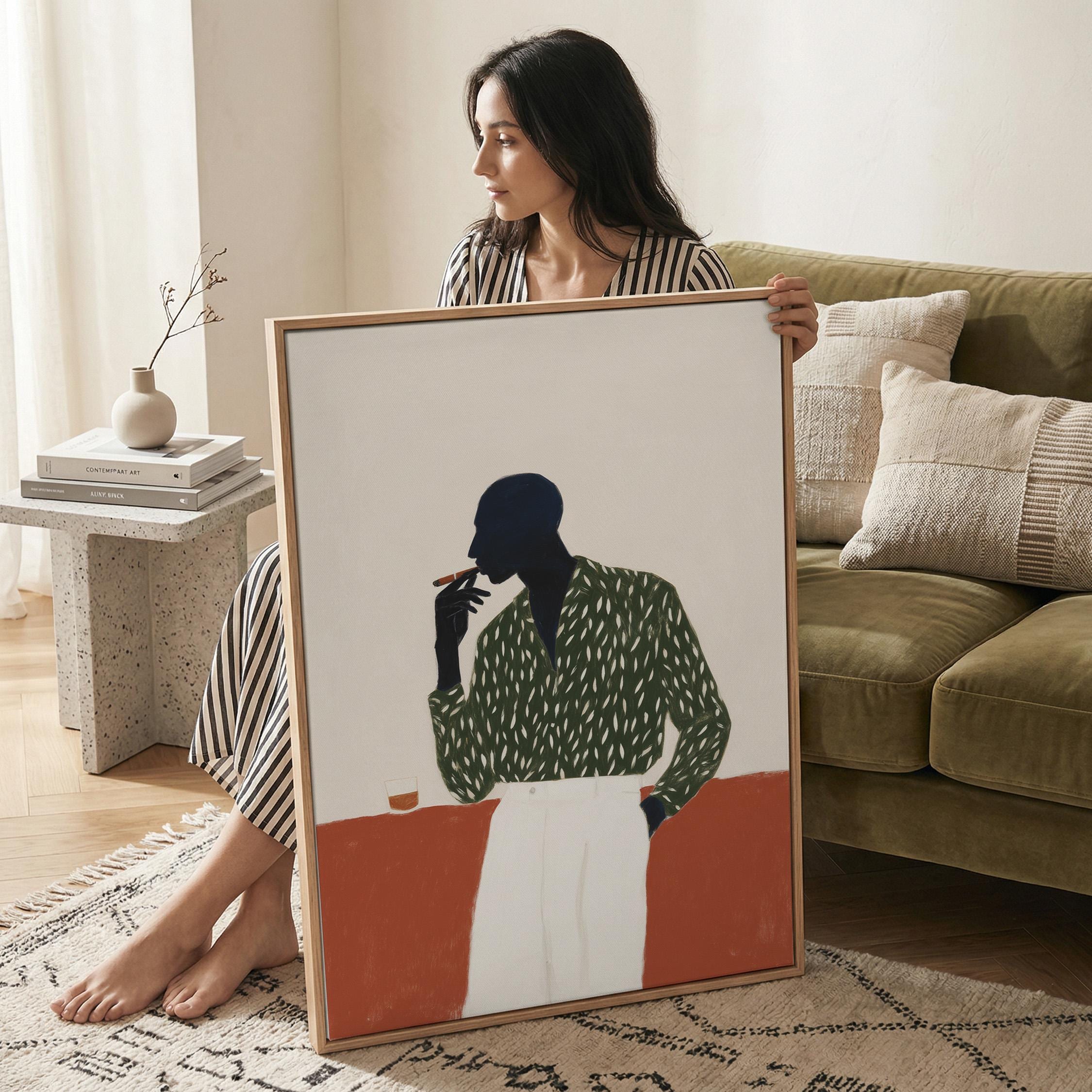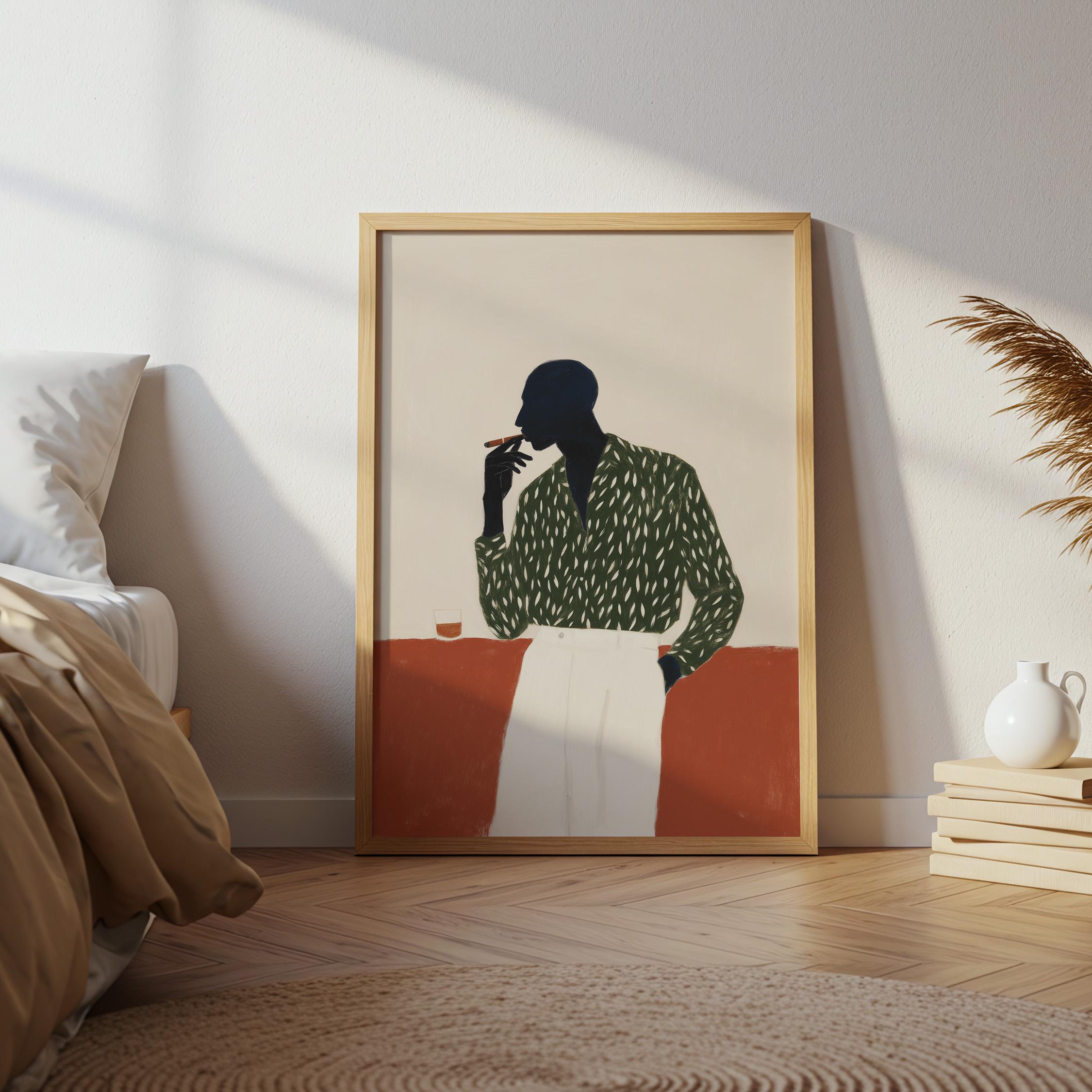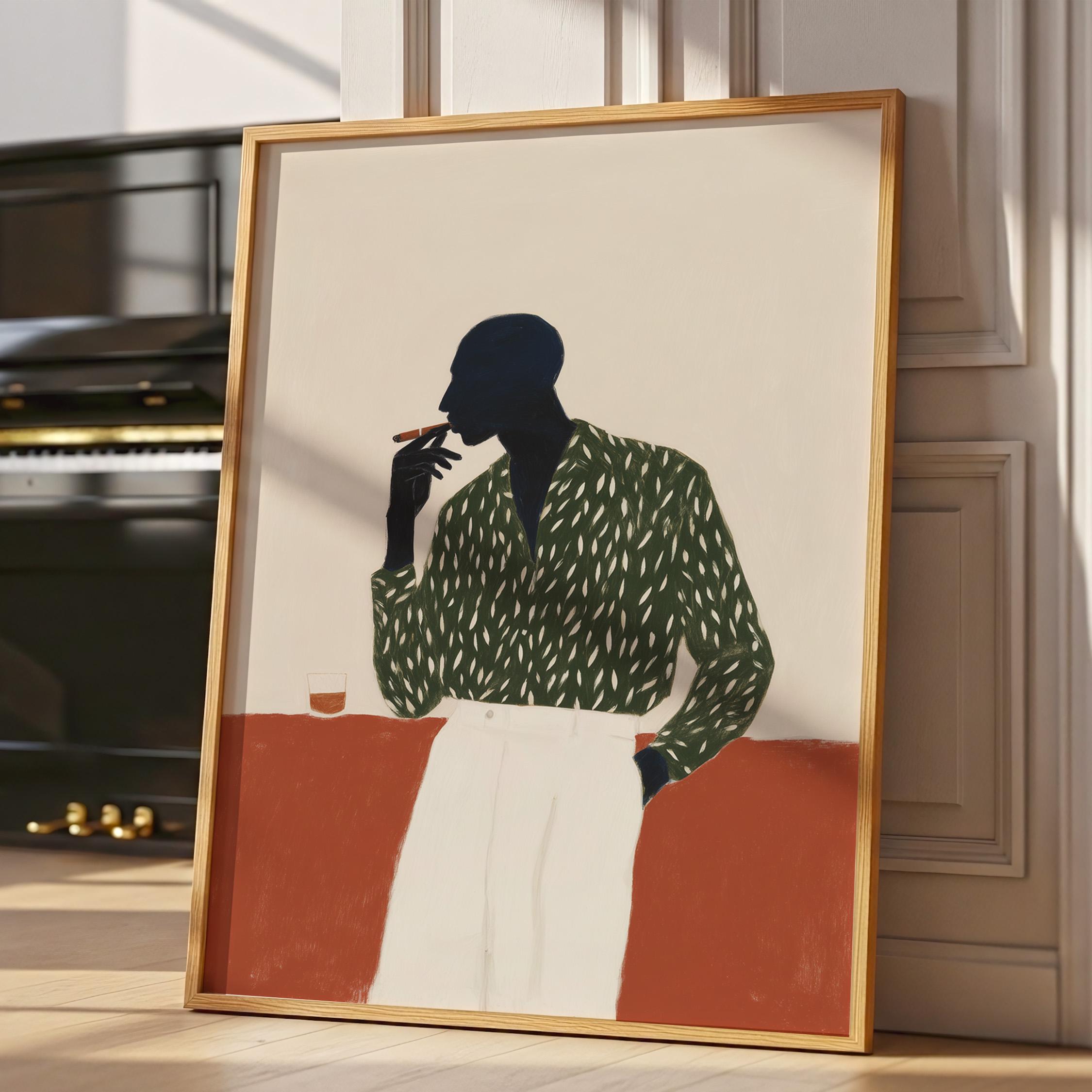 Perfect for masculine spaces like home offices, cigar lounges, man caves, living rooms, or modern bachelor pads seeking refined character. Brings a cool, contemplative mood with retro modernist flair and timeless elegance to any wall.