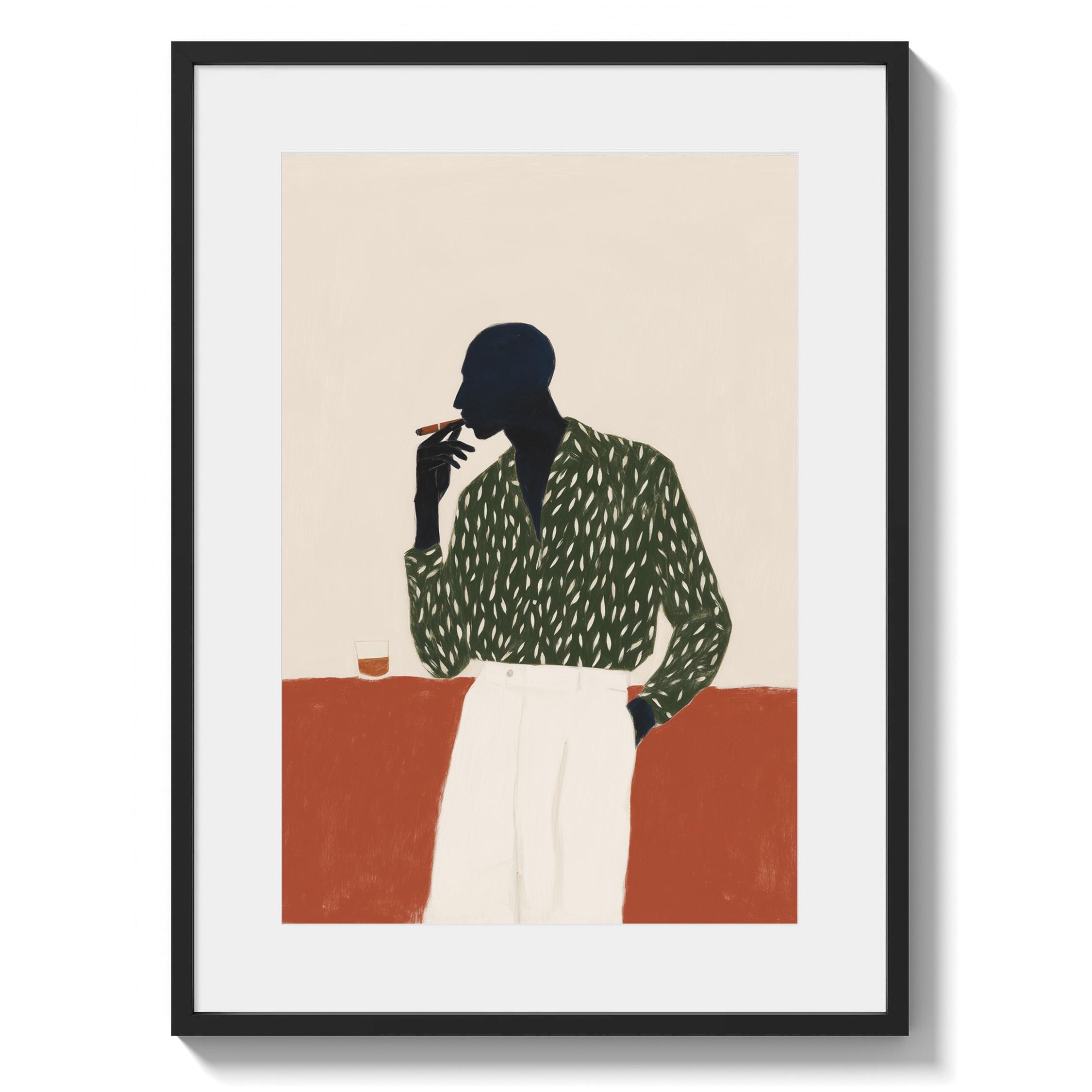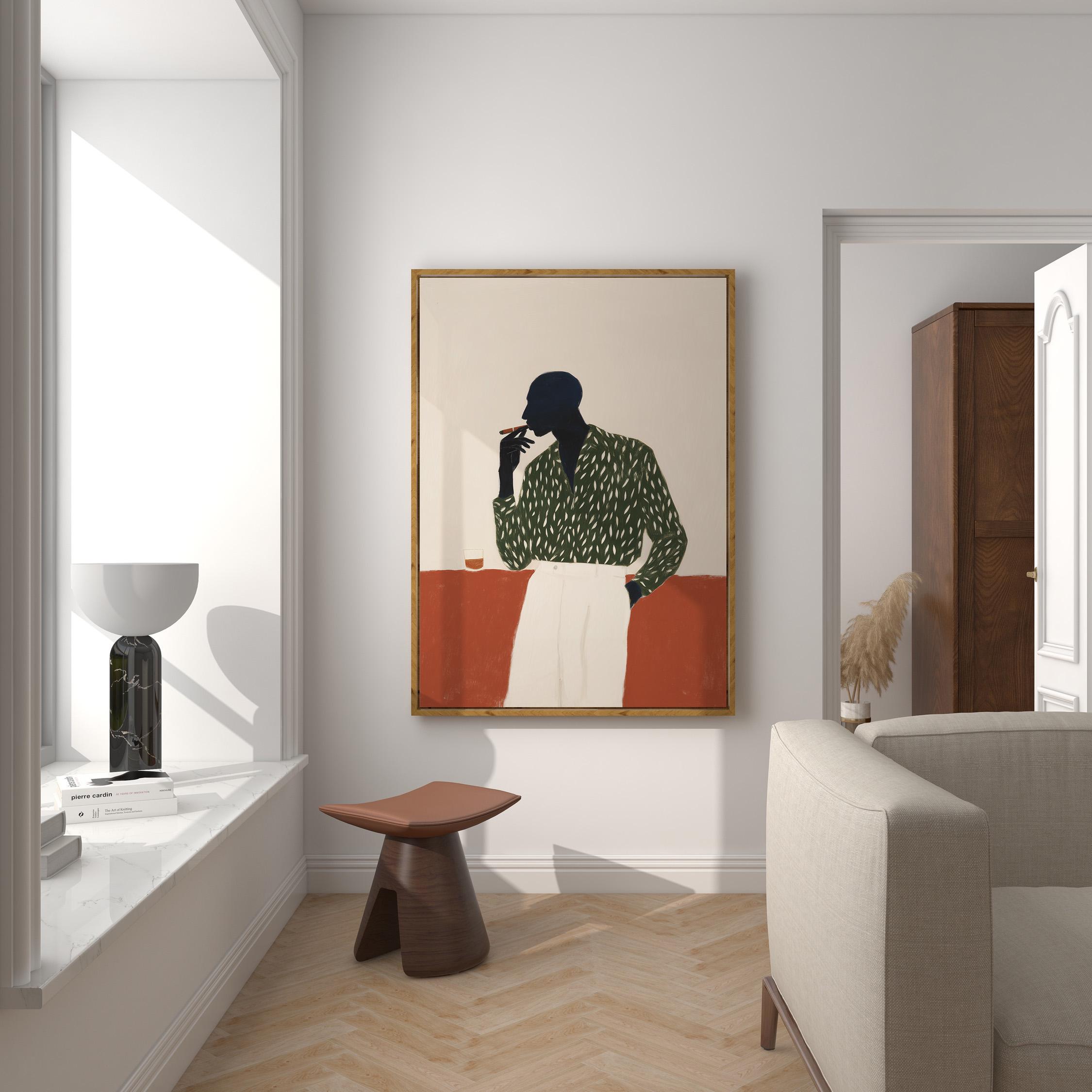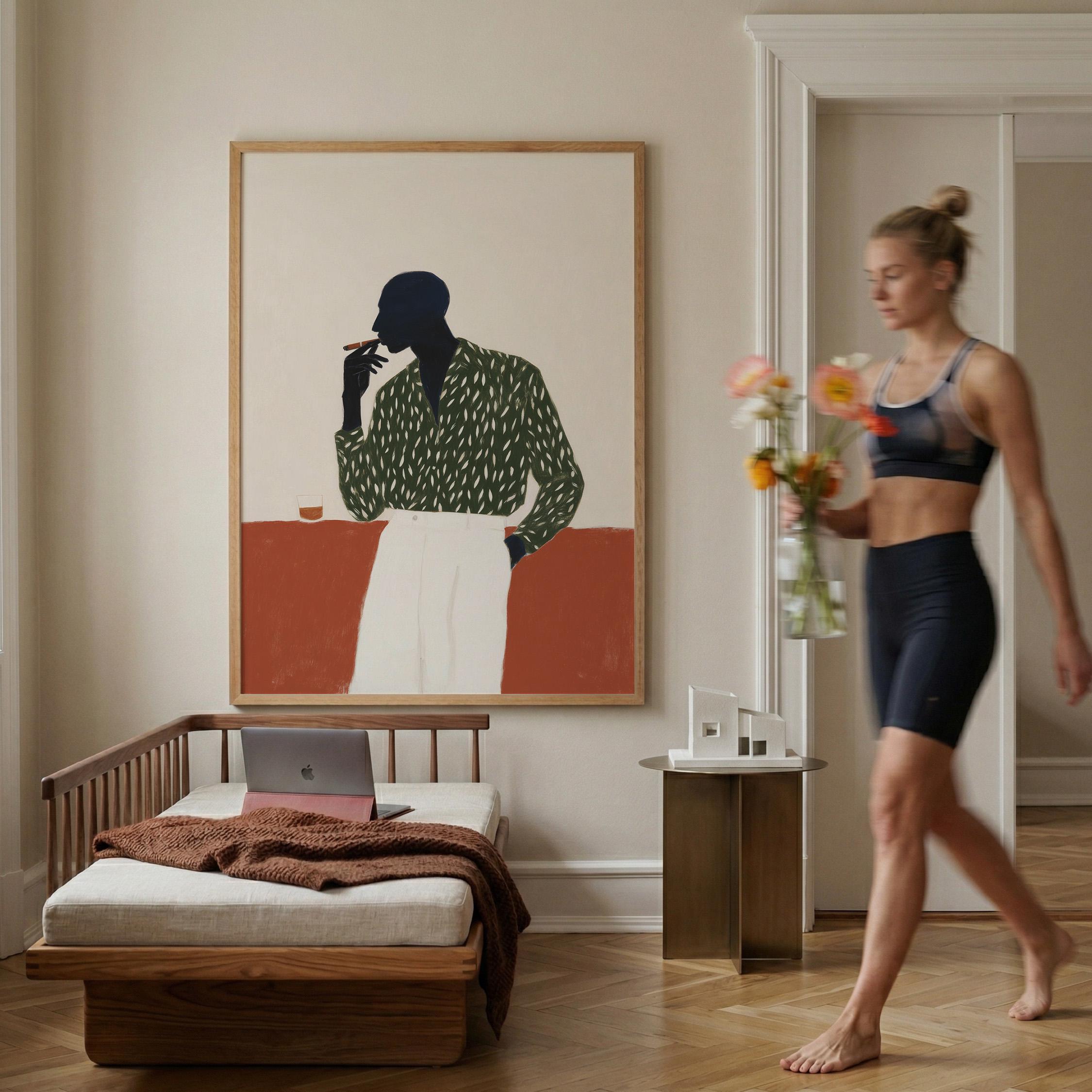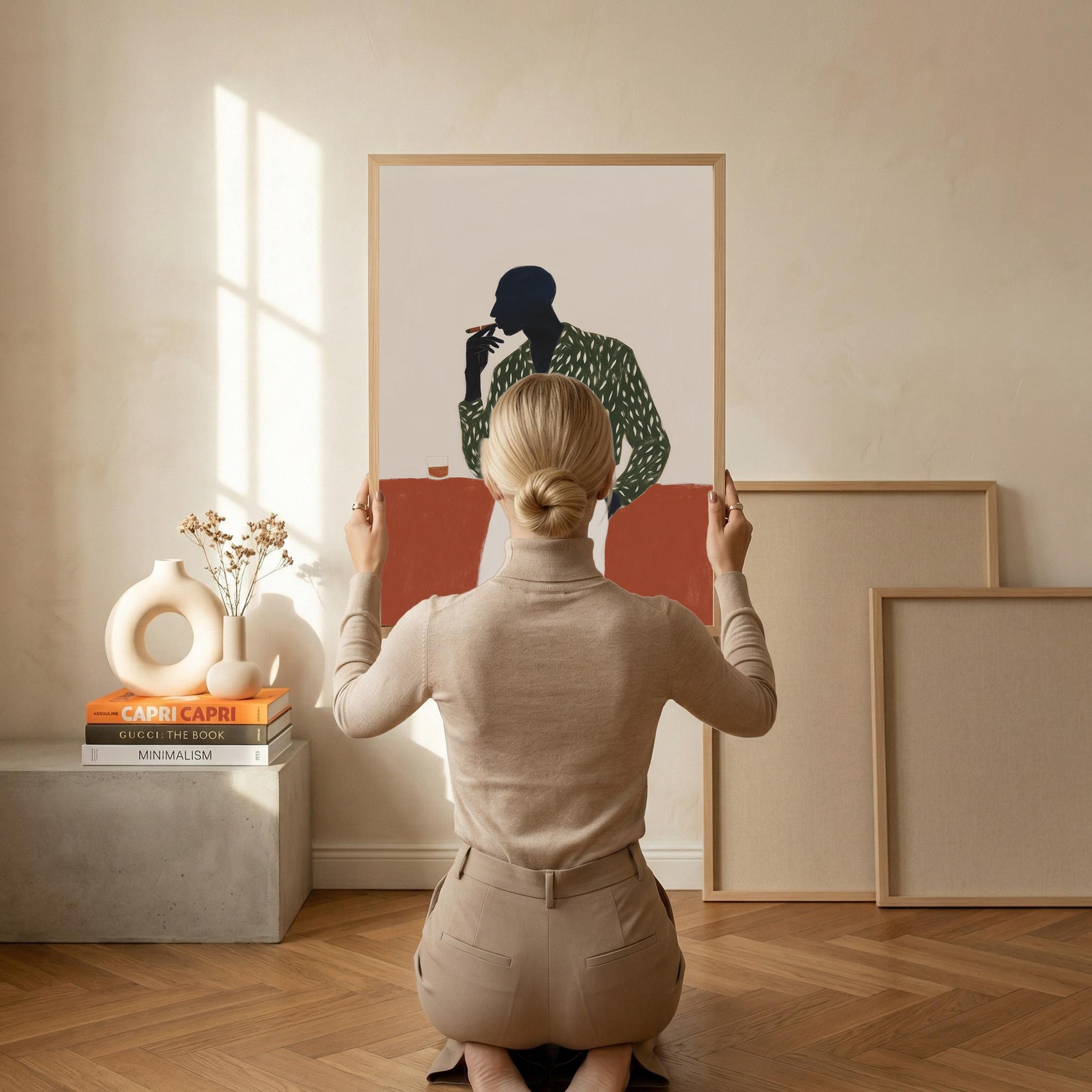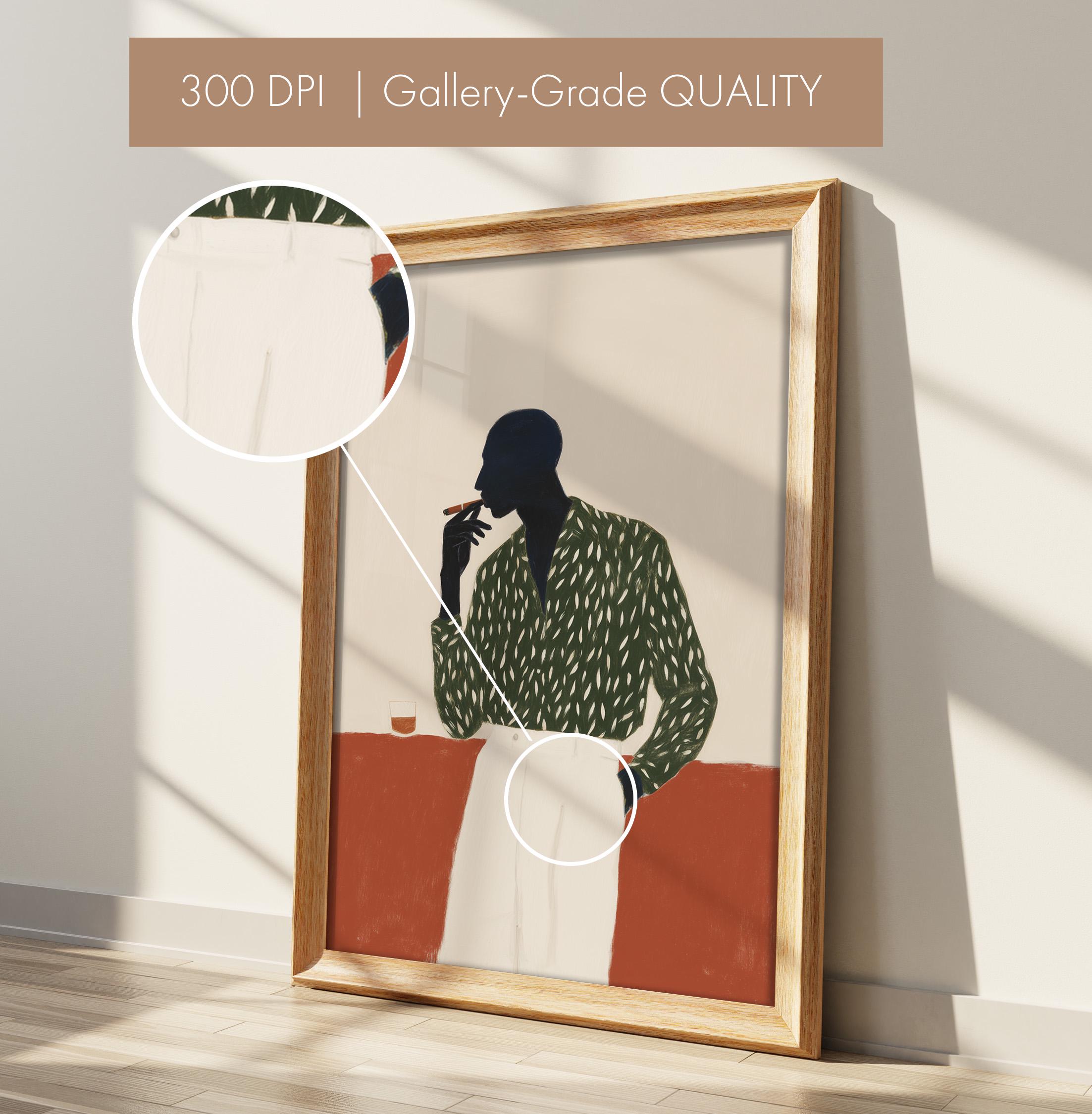 Perfect for masculine spaces like home offices, cigar lounges, man caves, living rooms, or modern bachelor pads seeking refined character. Brings a cool, contemplative mood with retro modernist flair and timeless elegance to any wall.
