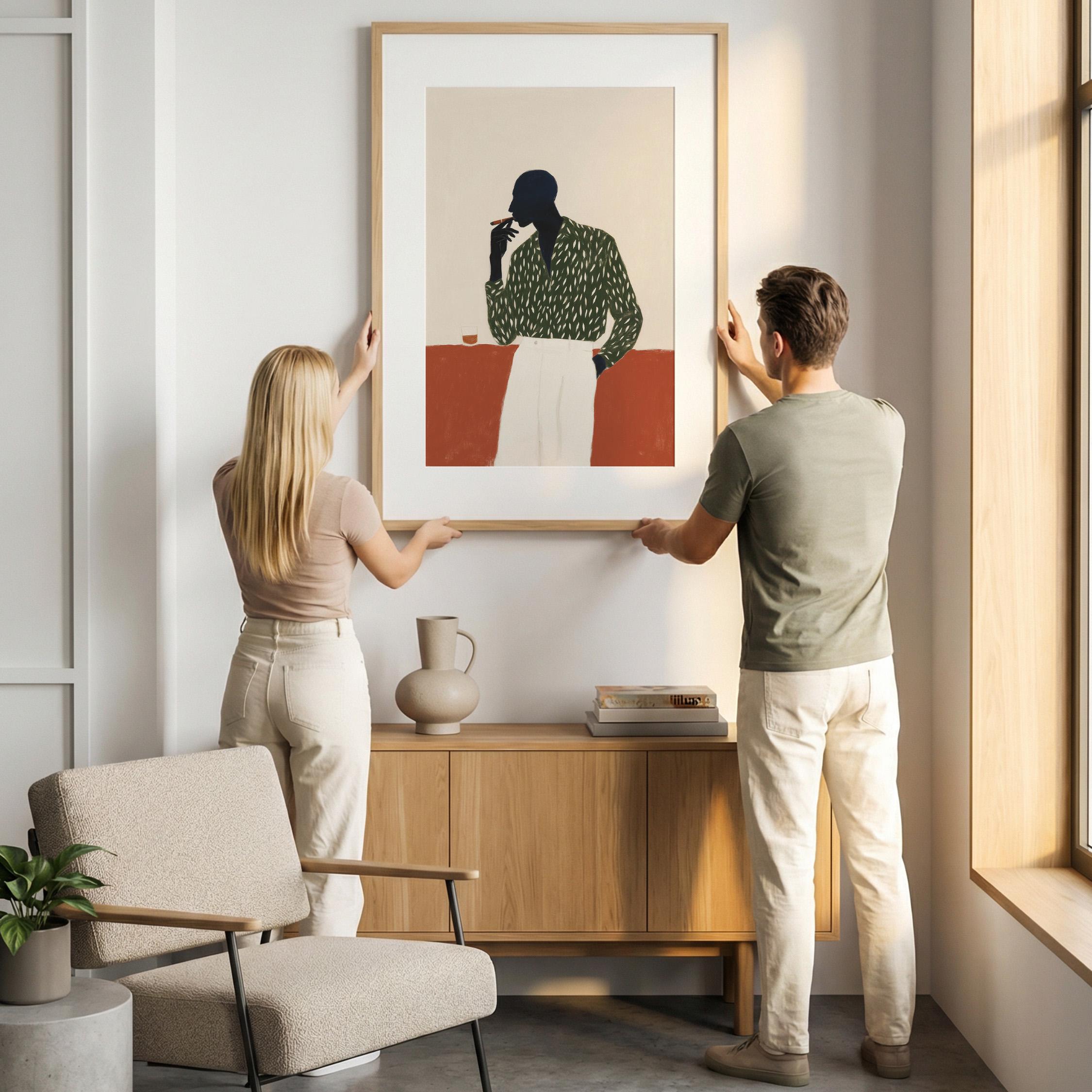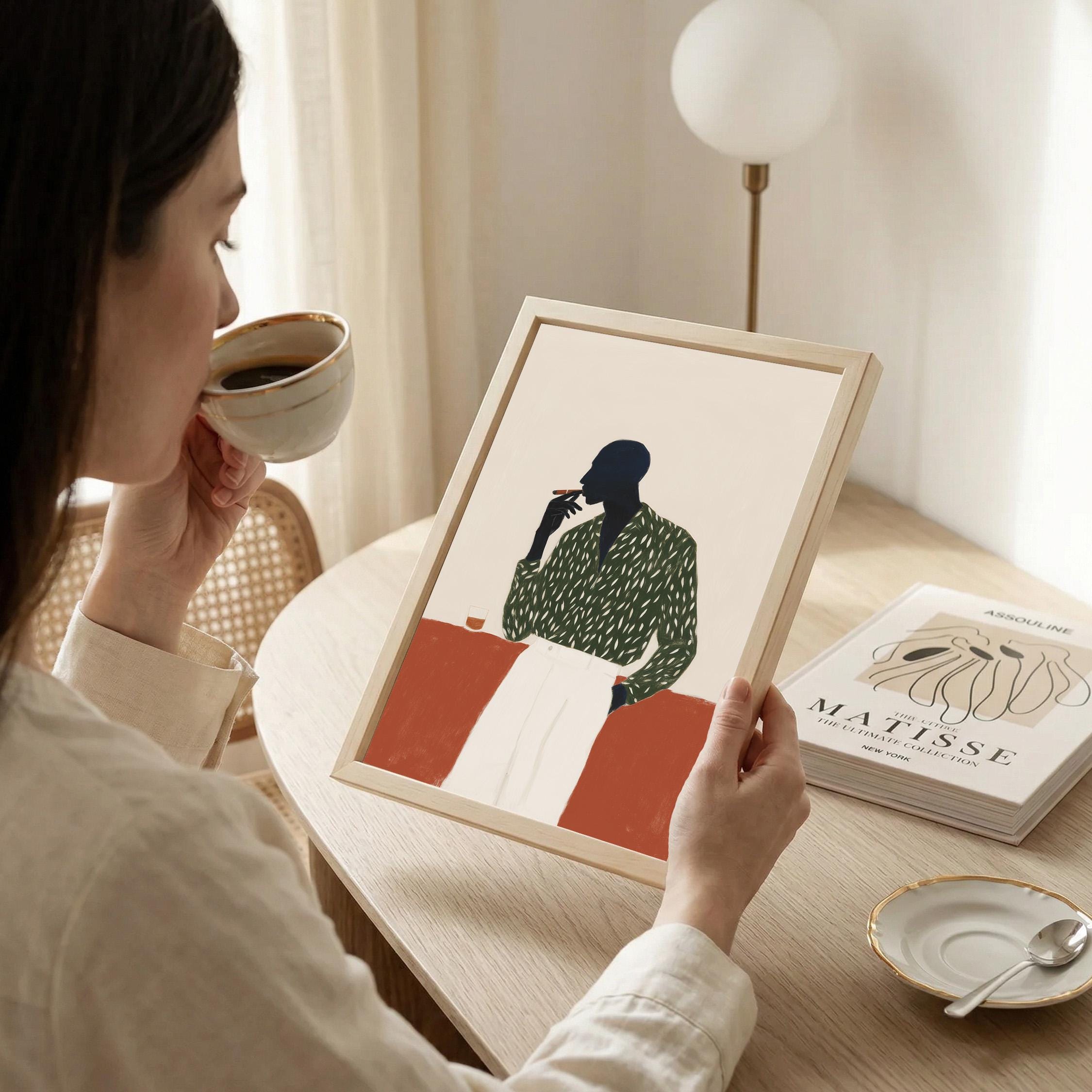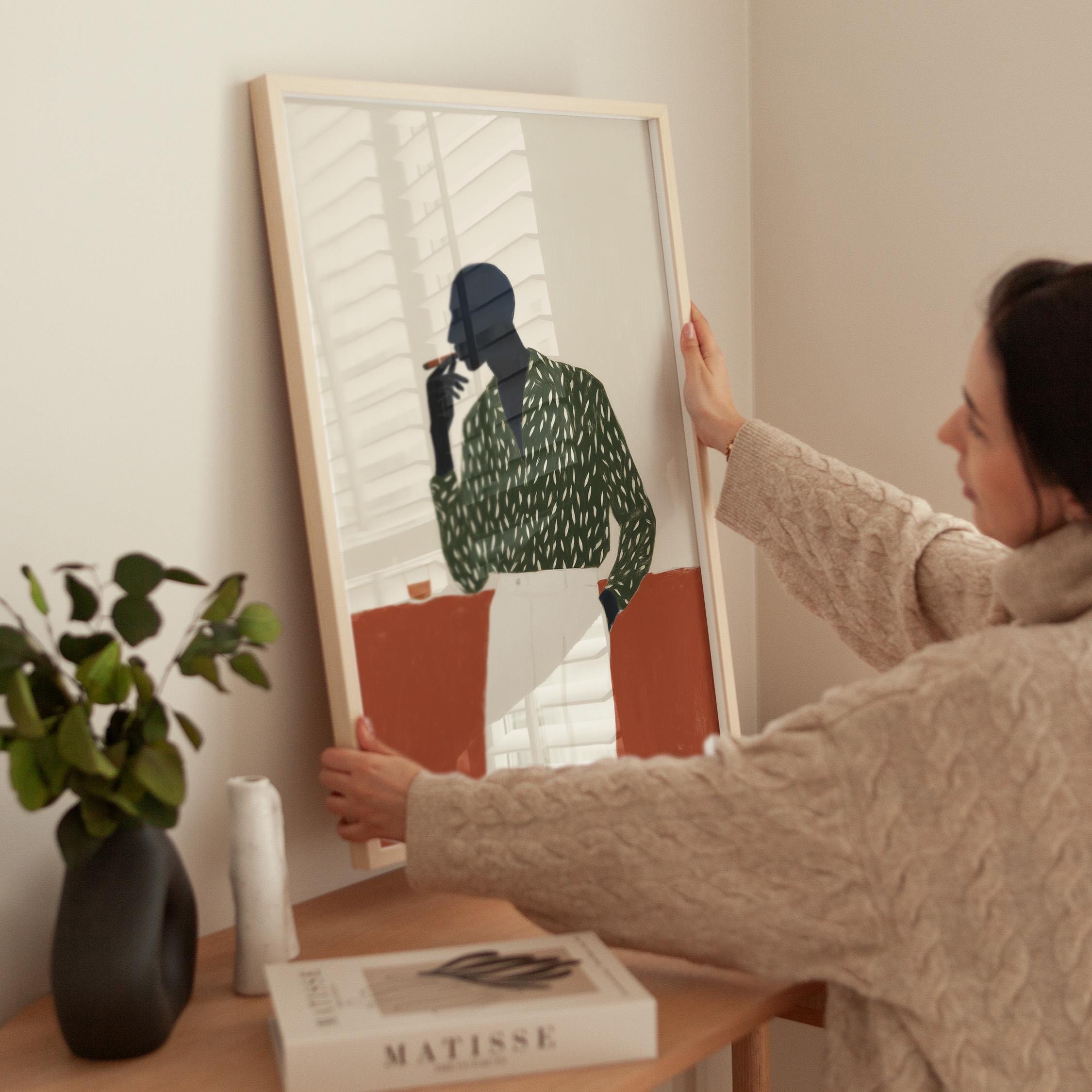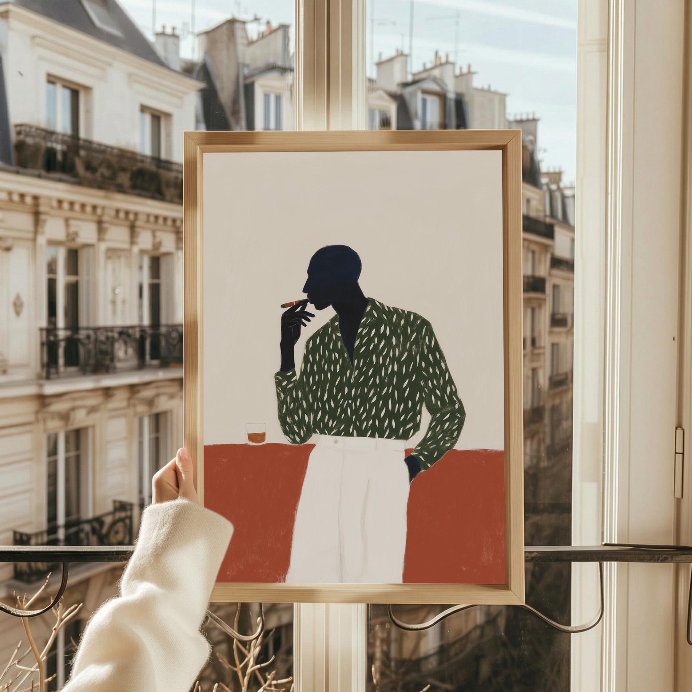 Perfect for masculine spaces like home offices, cigar lounges, man caves, living rooms, or modern bachelor pads seeking refined character. Brings a cool, contemplative mood with retro modernist flair and timeless elegance to any wall.