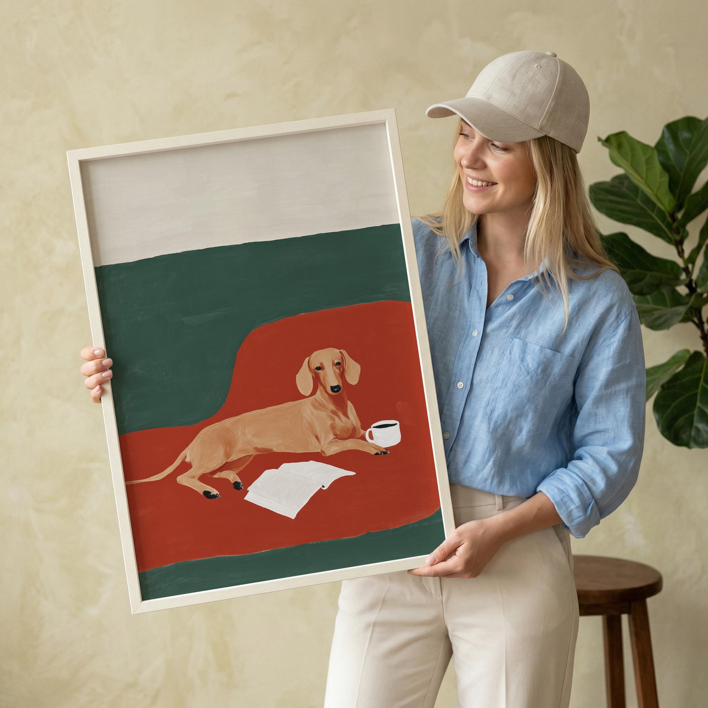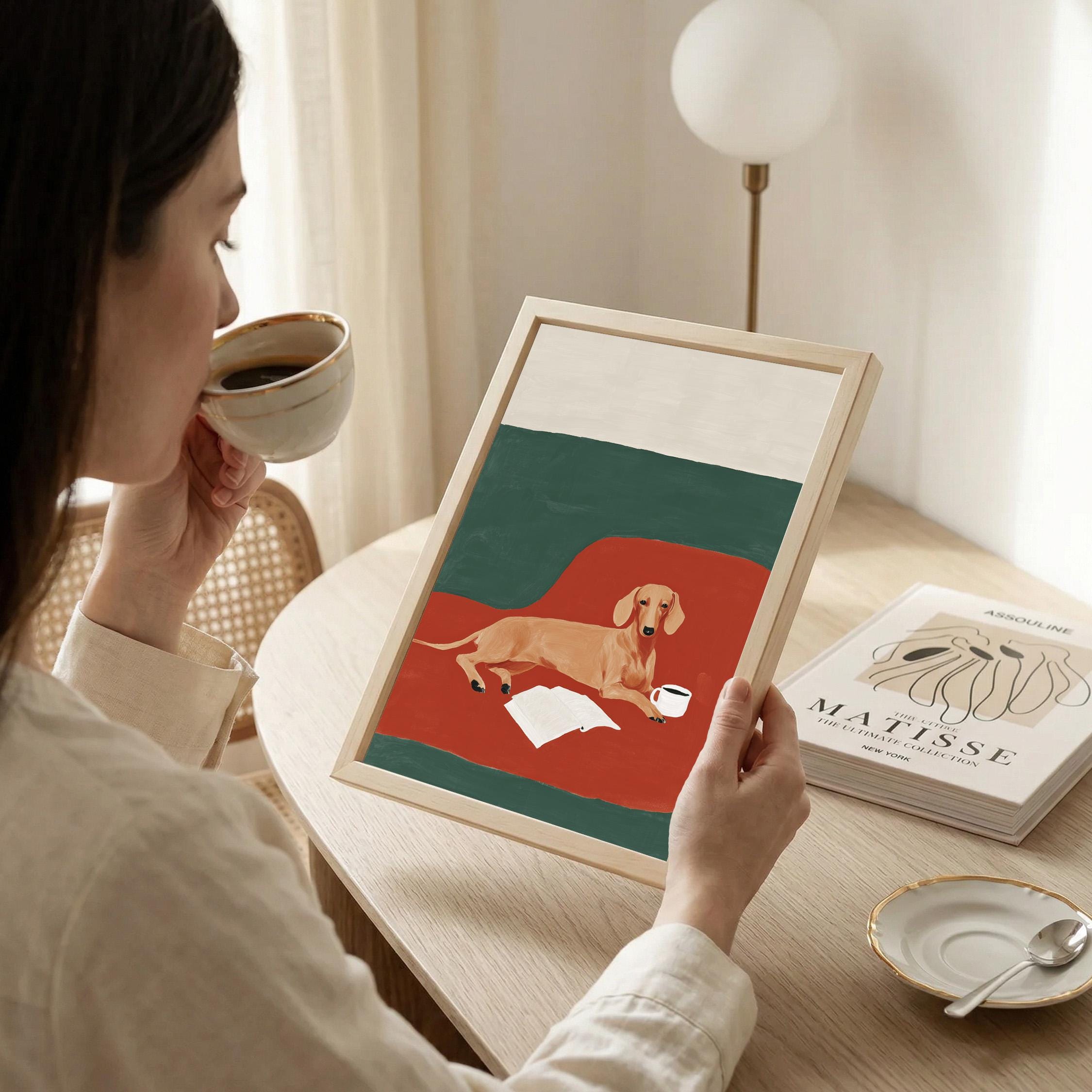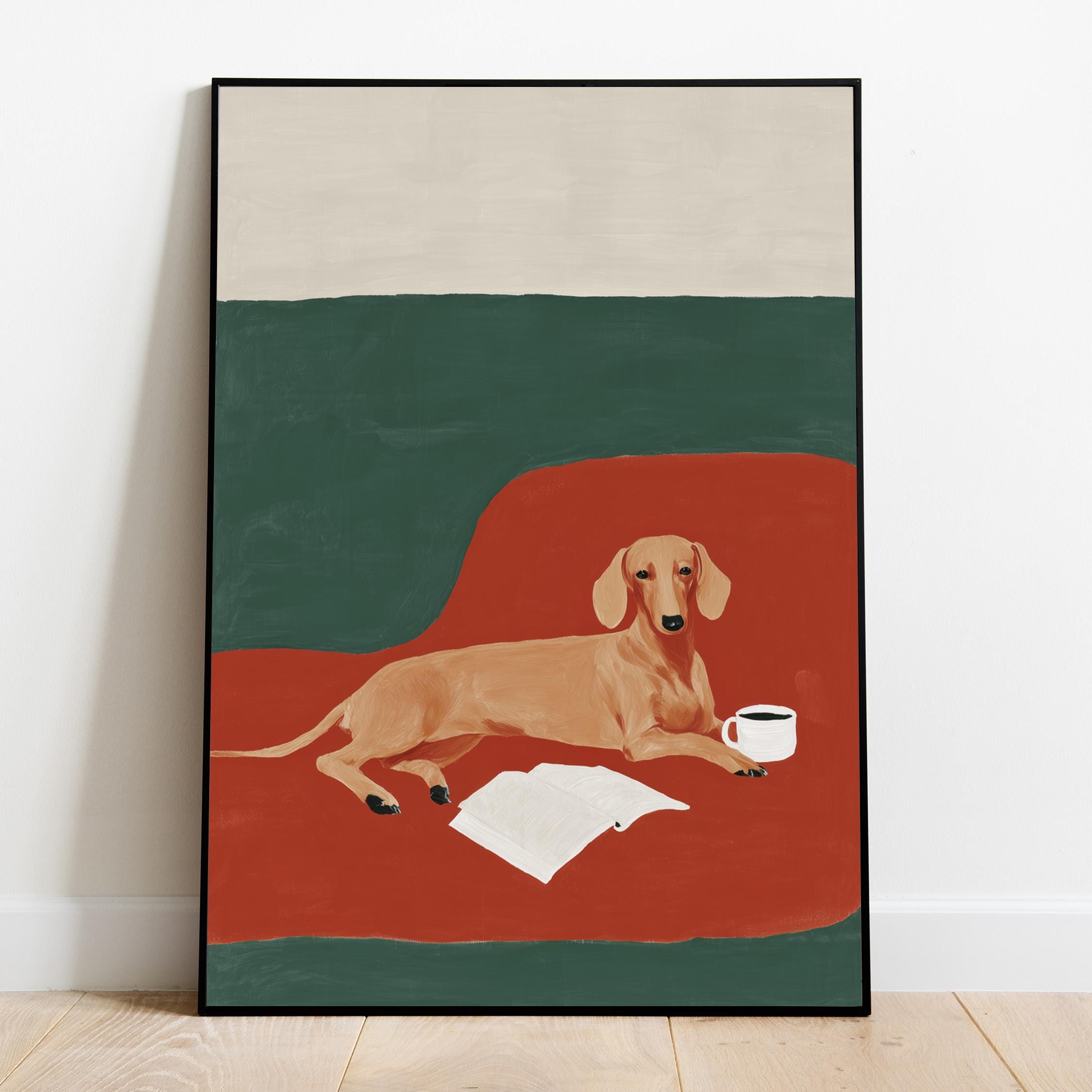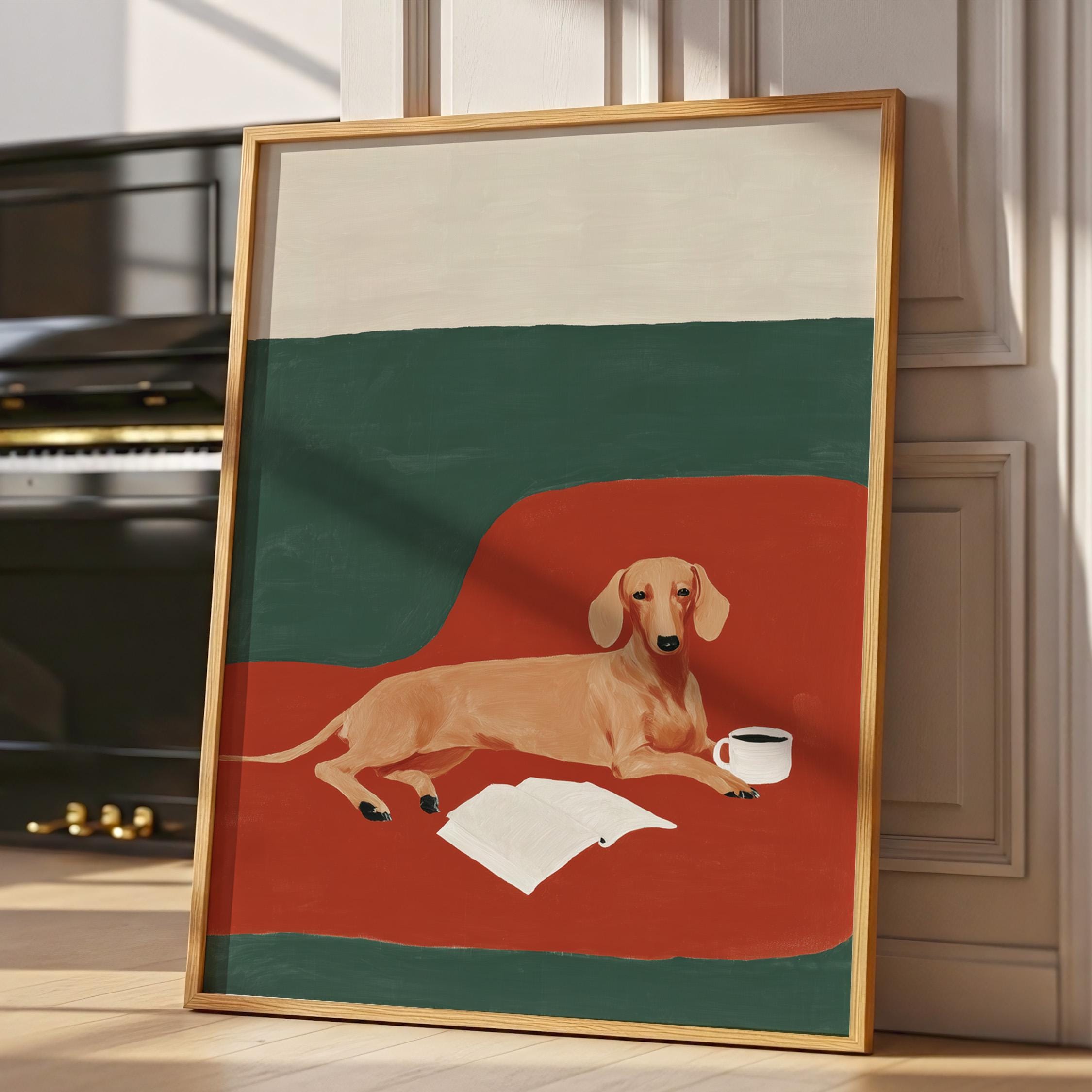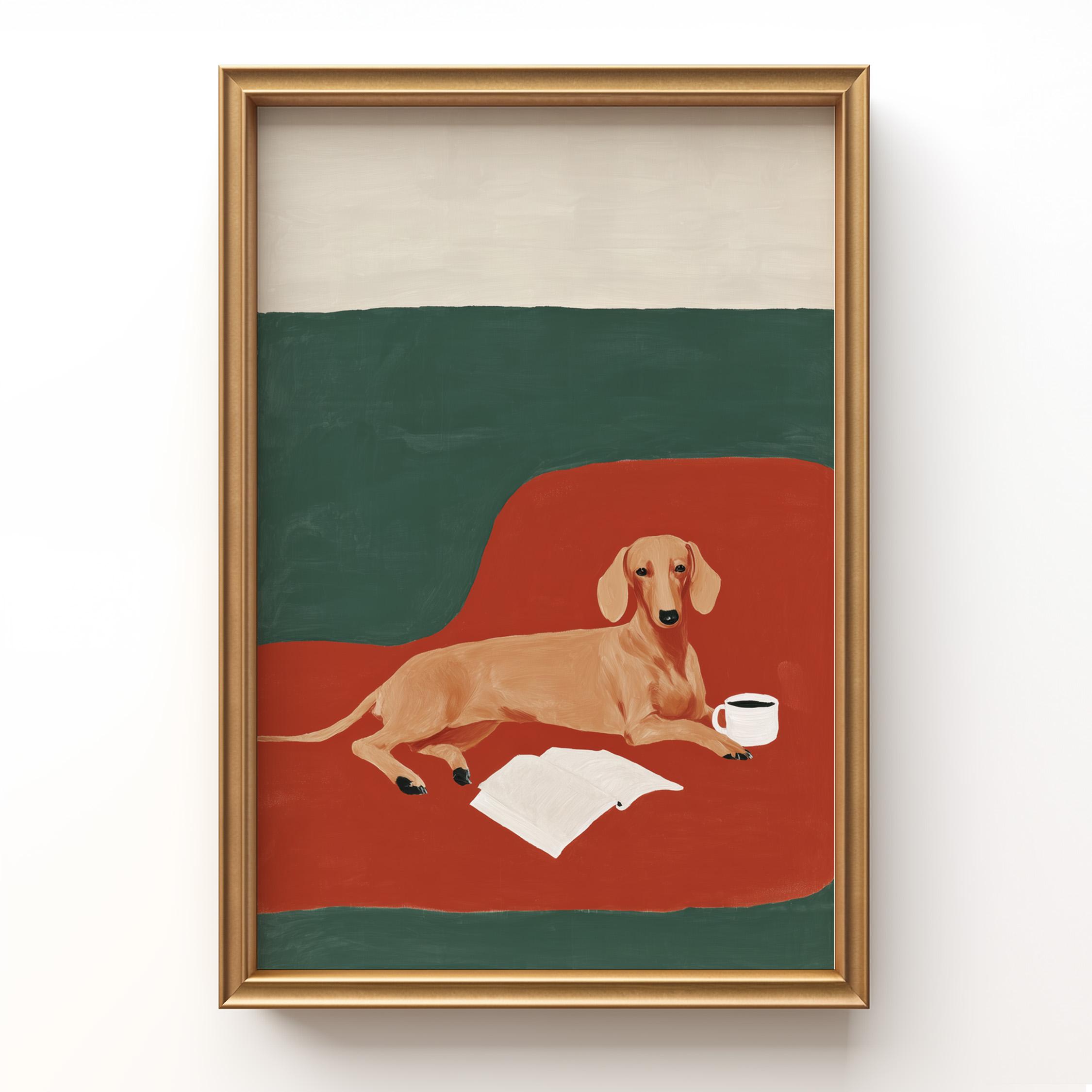This charming dachshund wall art features a relaxed pup enjoying coffee and a good book on a terracotta chair against deep green. Perfect for book lovers, dog parents, home offices, reading nooks, or cozy living room corners that celebrate the simple joys of life.