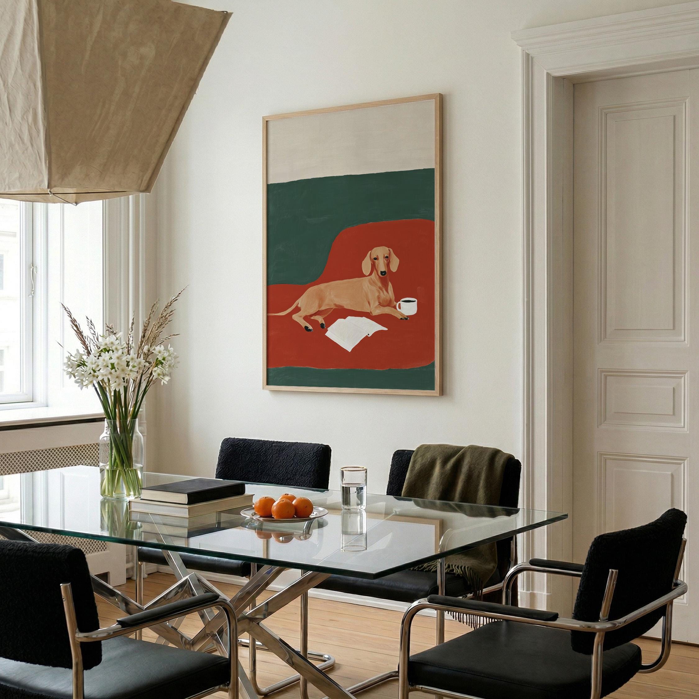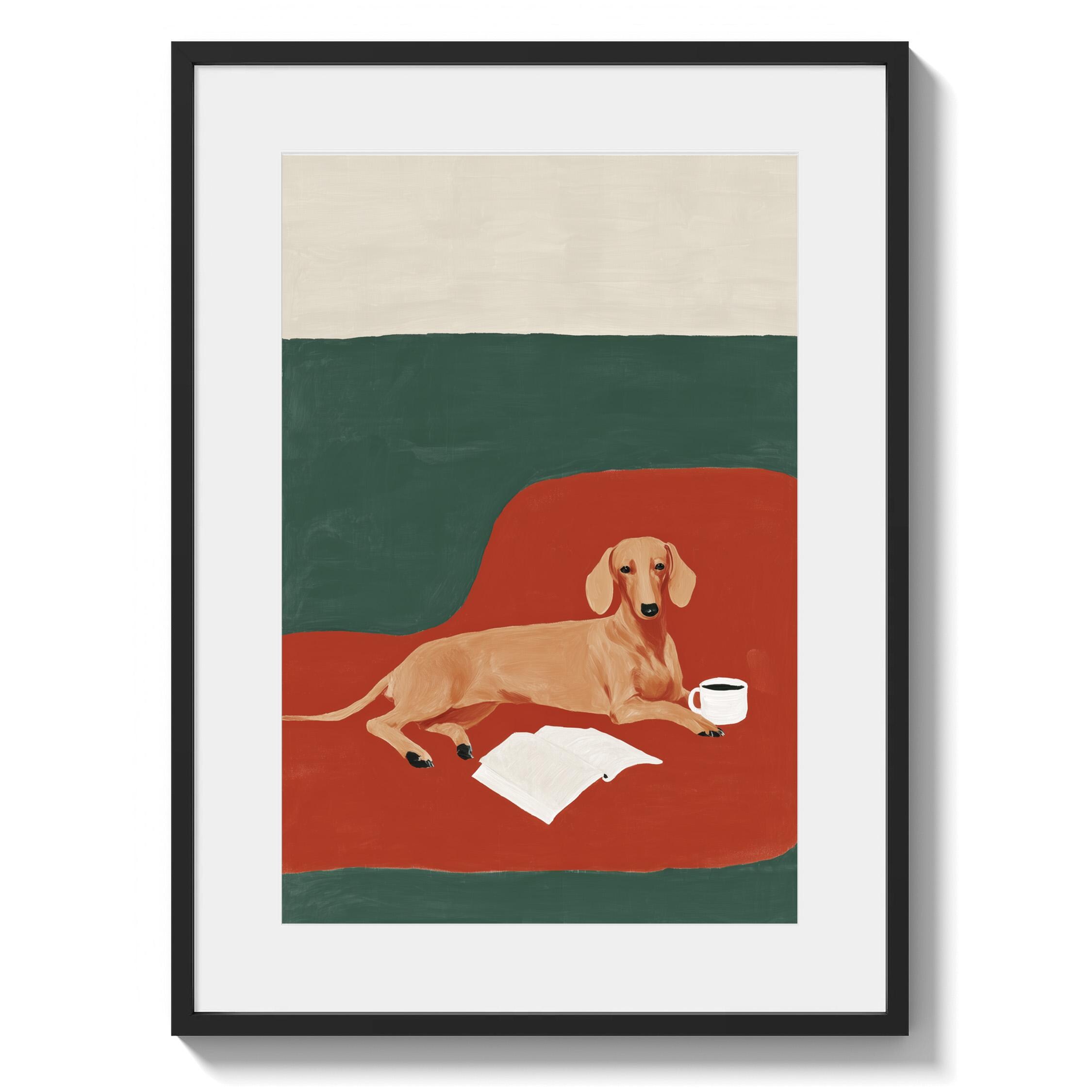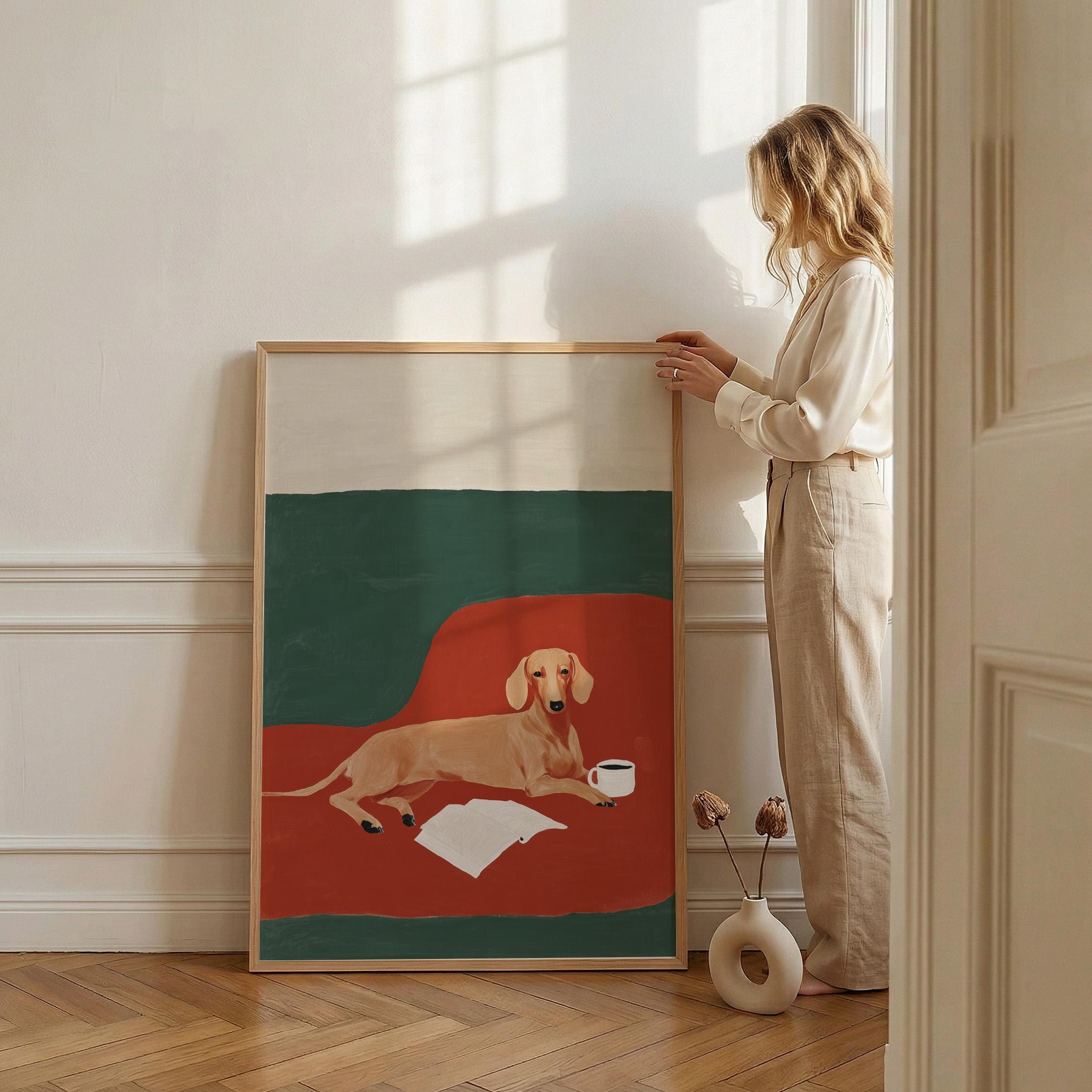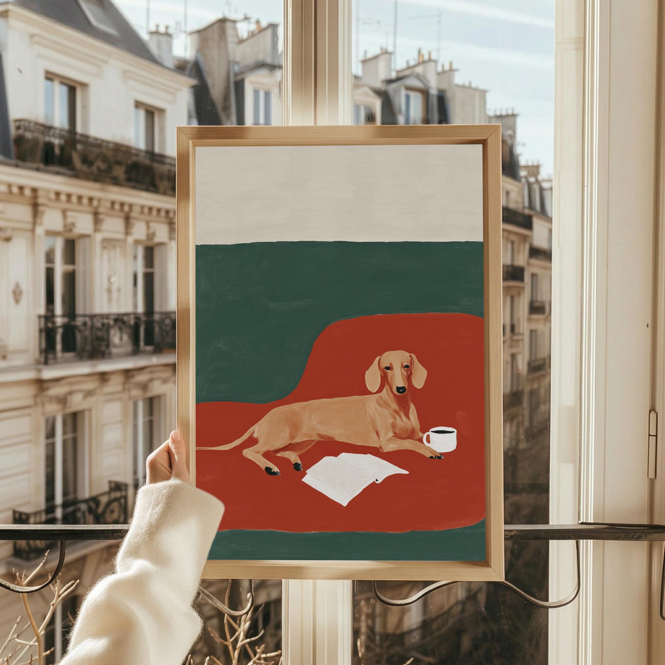 This charming dachshund wall art features a relaxed pup enjoying coffee and a good book on a terracotta chair against deep green. Perfect for book lovers, dog parents, home offices, reading nooks, or cozy living room corners that celebrate the simple joys of life.