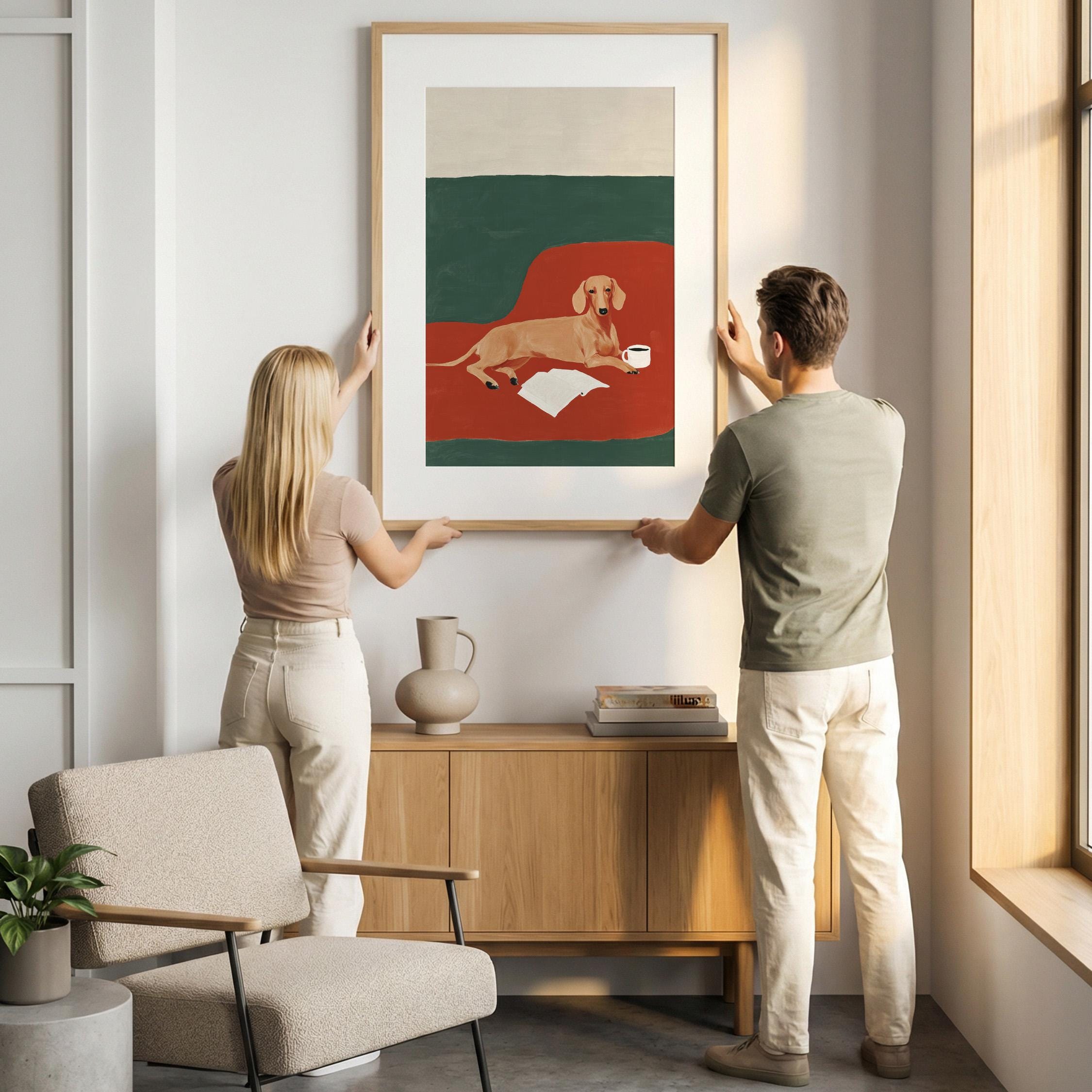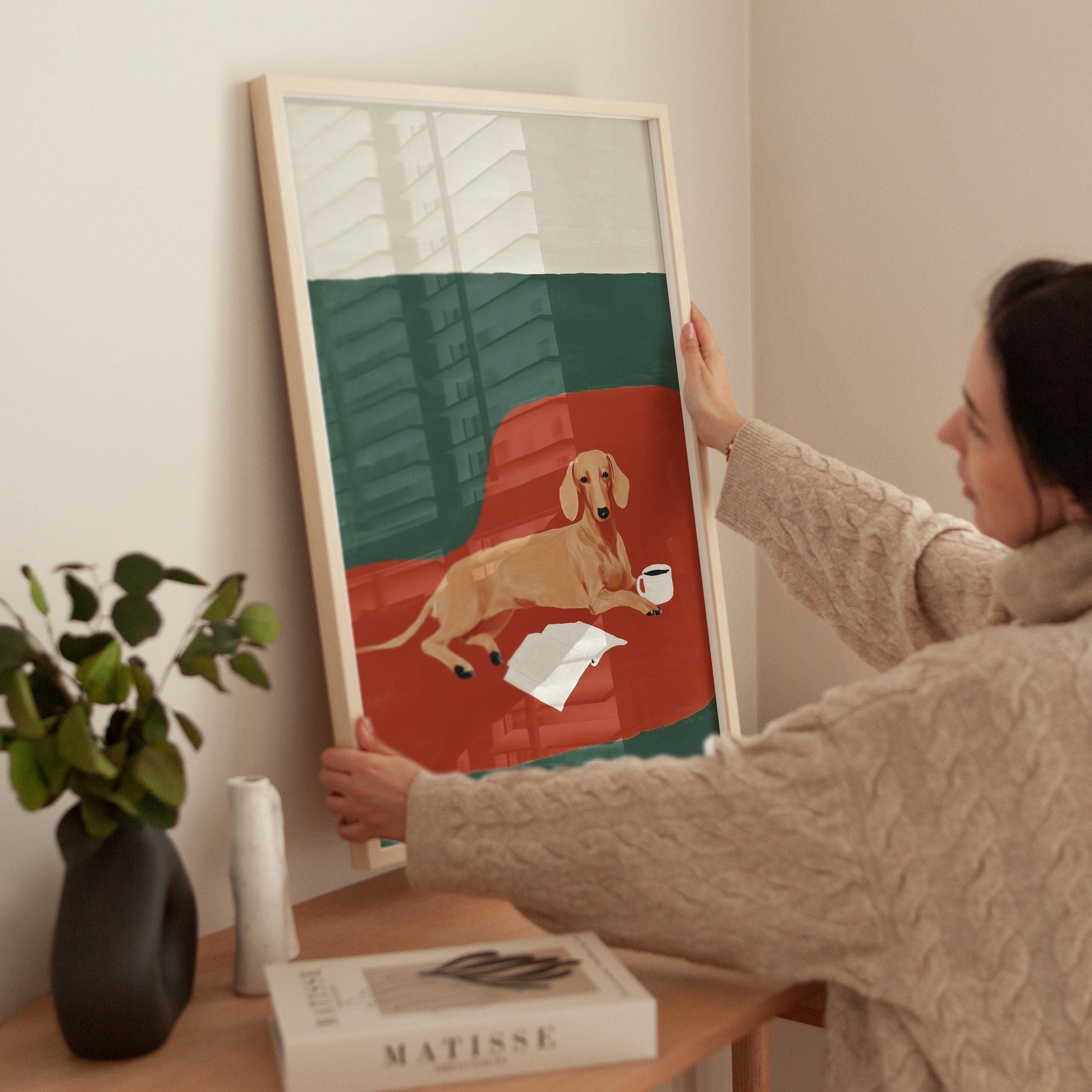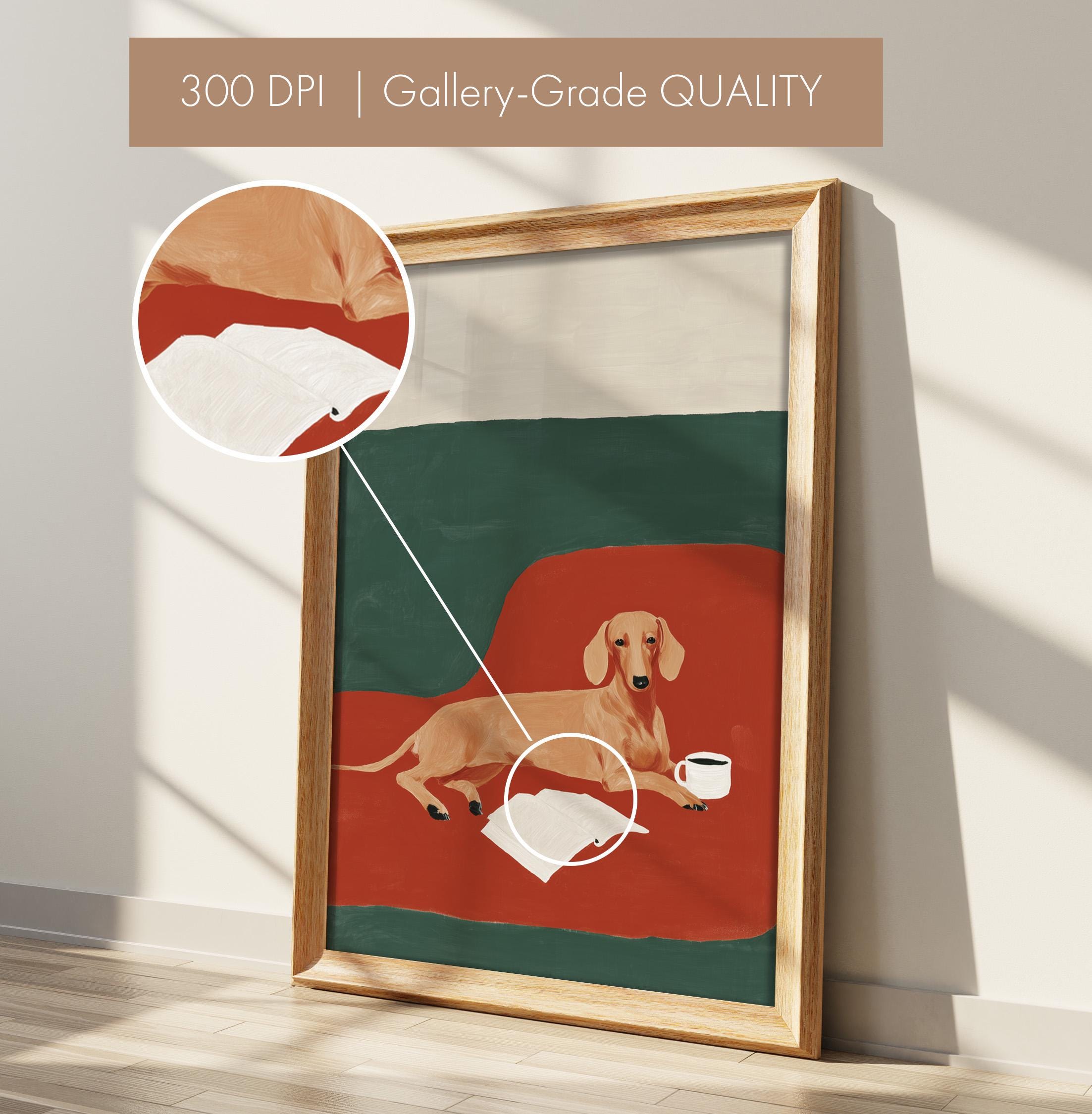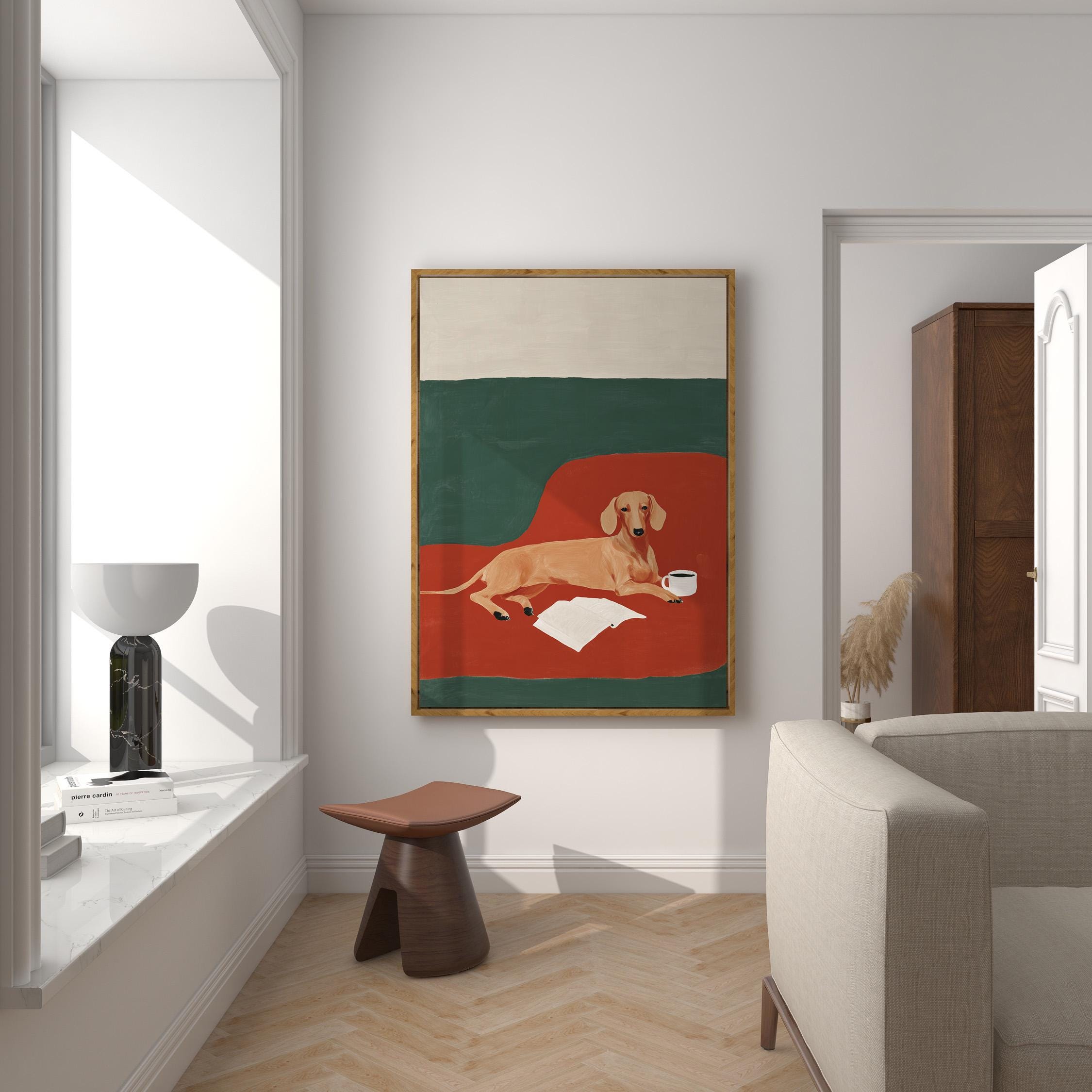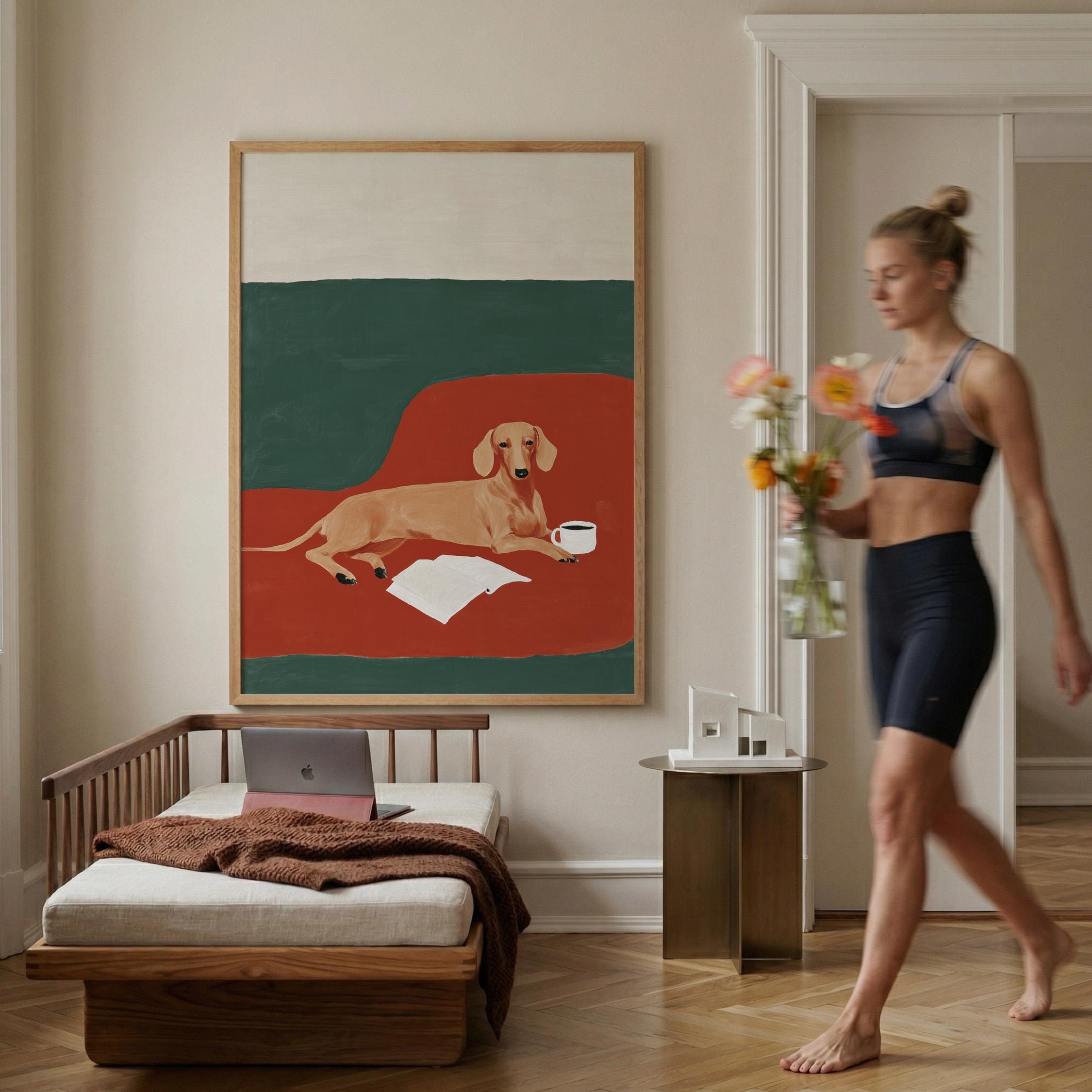 This charming dachshund wall art features a relaxed pup enjoying coffee and a good book on a terracotta chair against deep green. Perfect for book lovers, dog parents, home offices, reading nooks, or cozy living room corners that celebrate the simple joys of life.