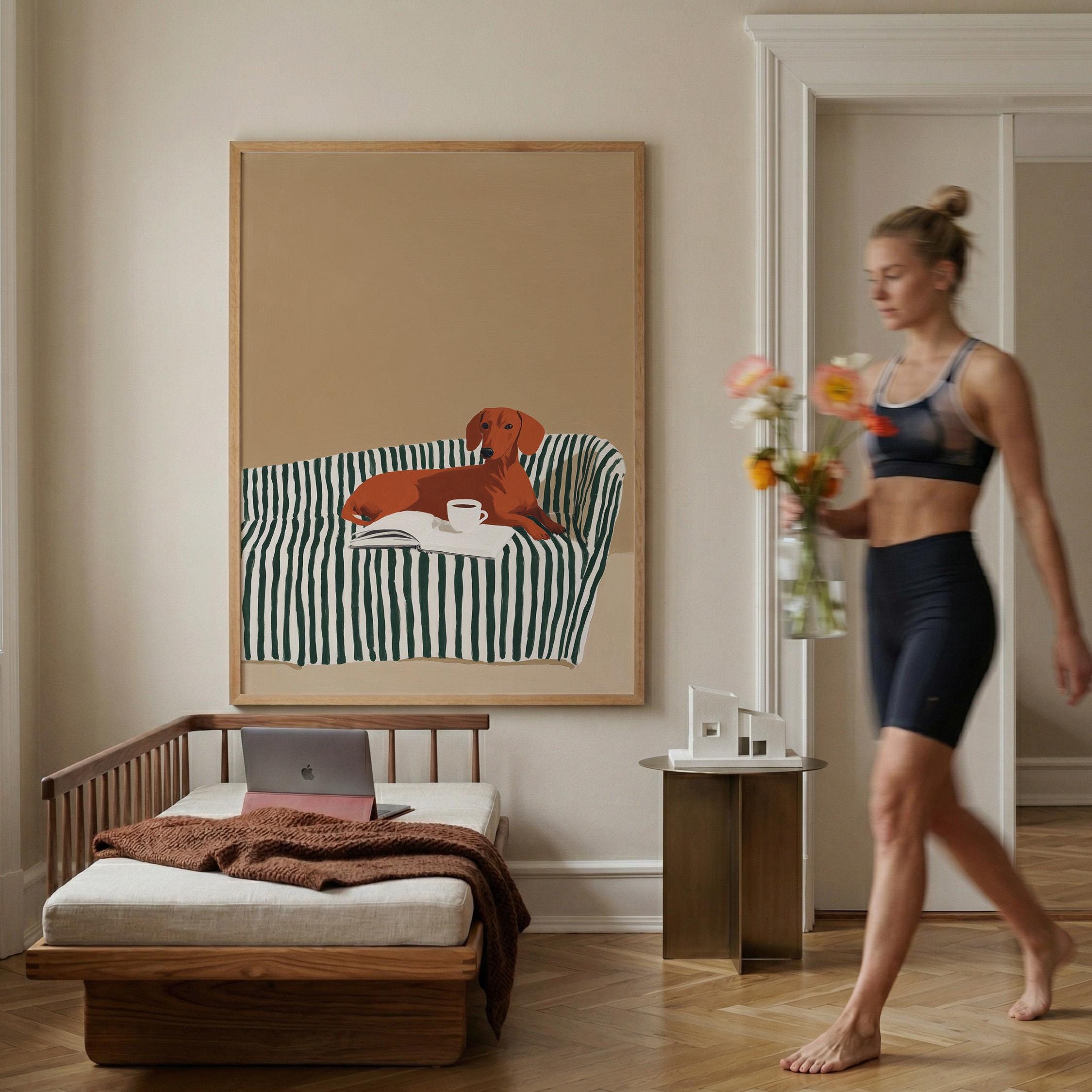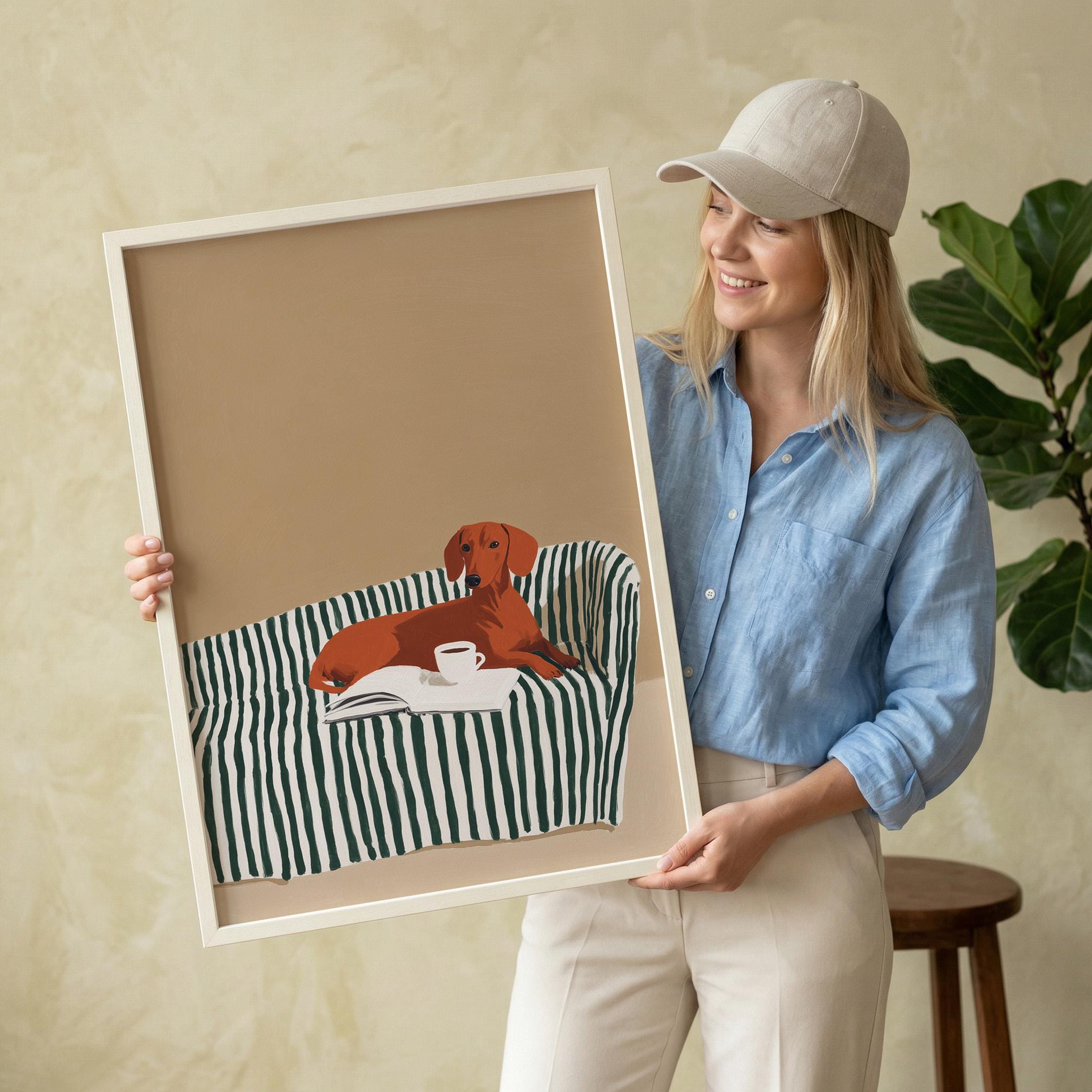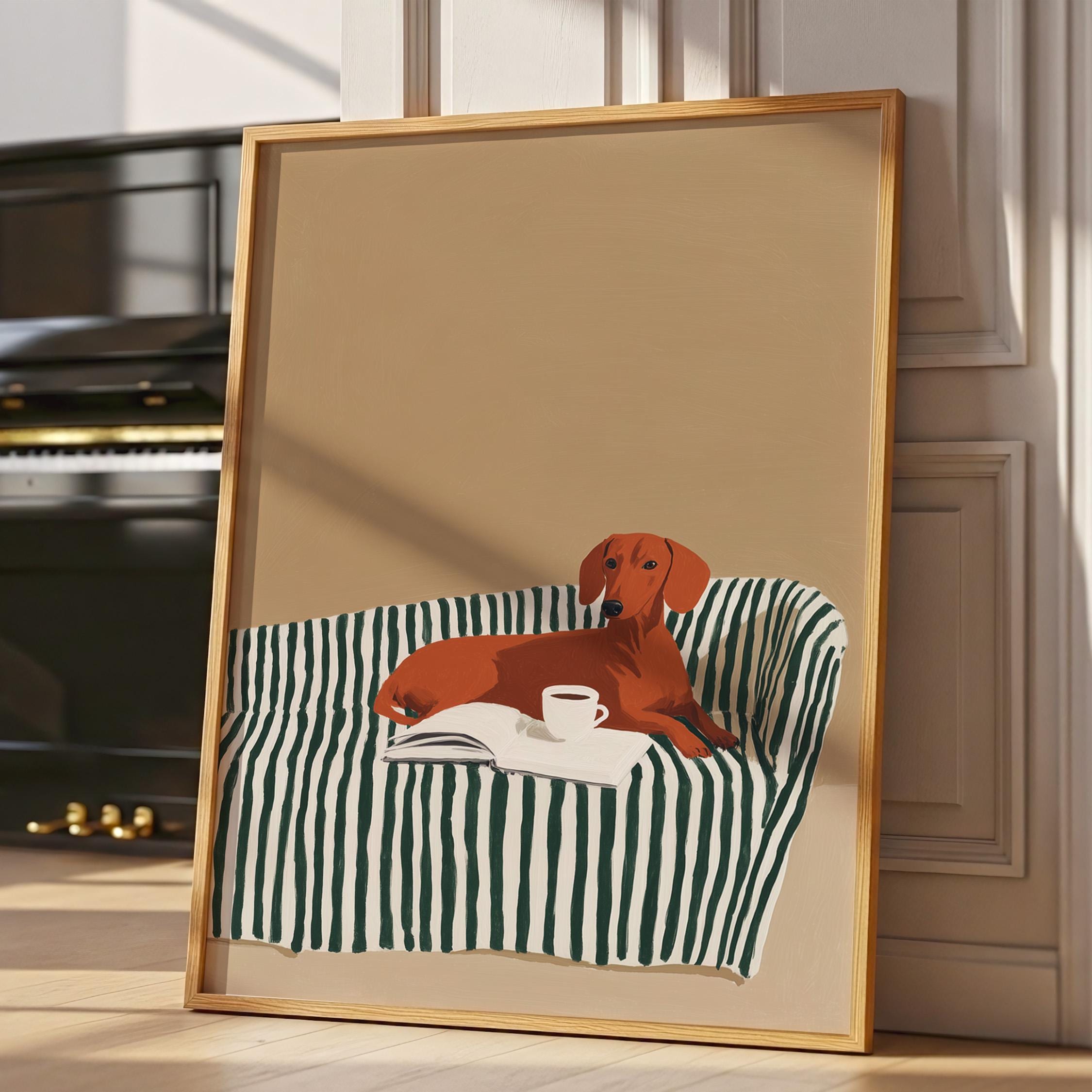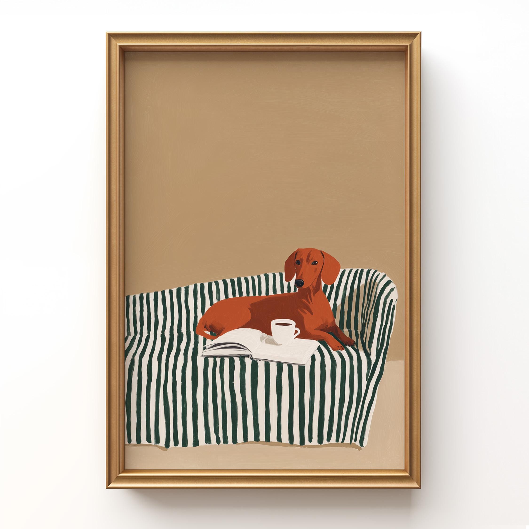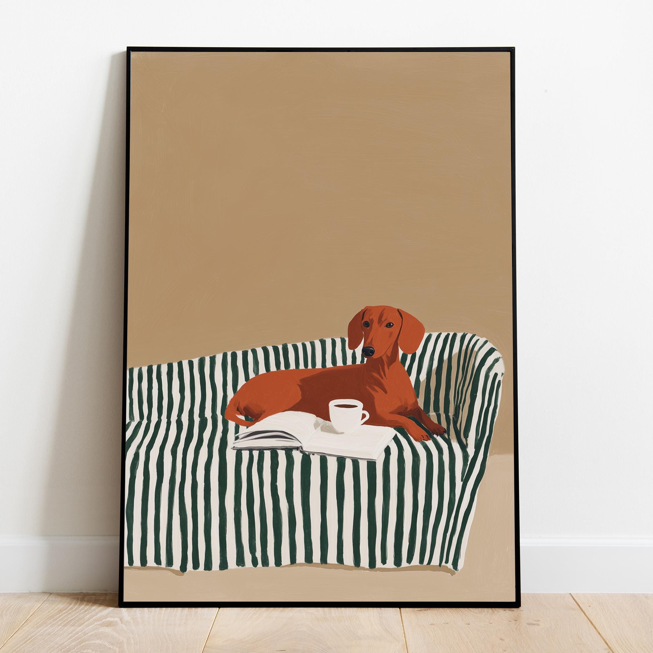 A charming dachshund relaxing on a striped sofa with coffee and a book brings warmth and personality to your walls. Perfect for dog lovers, book enthusiasts, and anyone decorating a living room, bedroom, or reading nook with cozy, modern style.