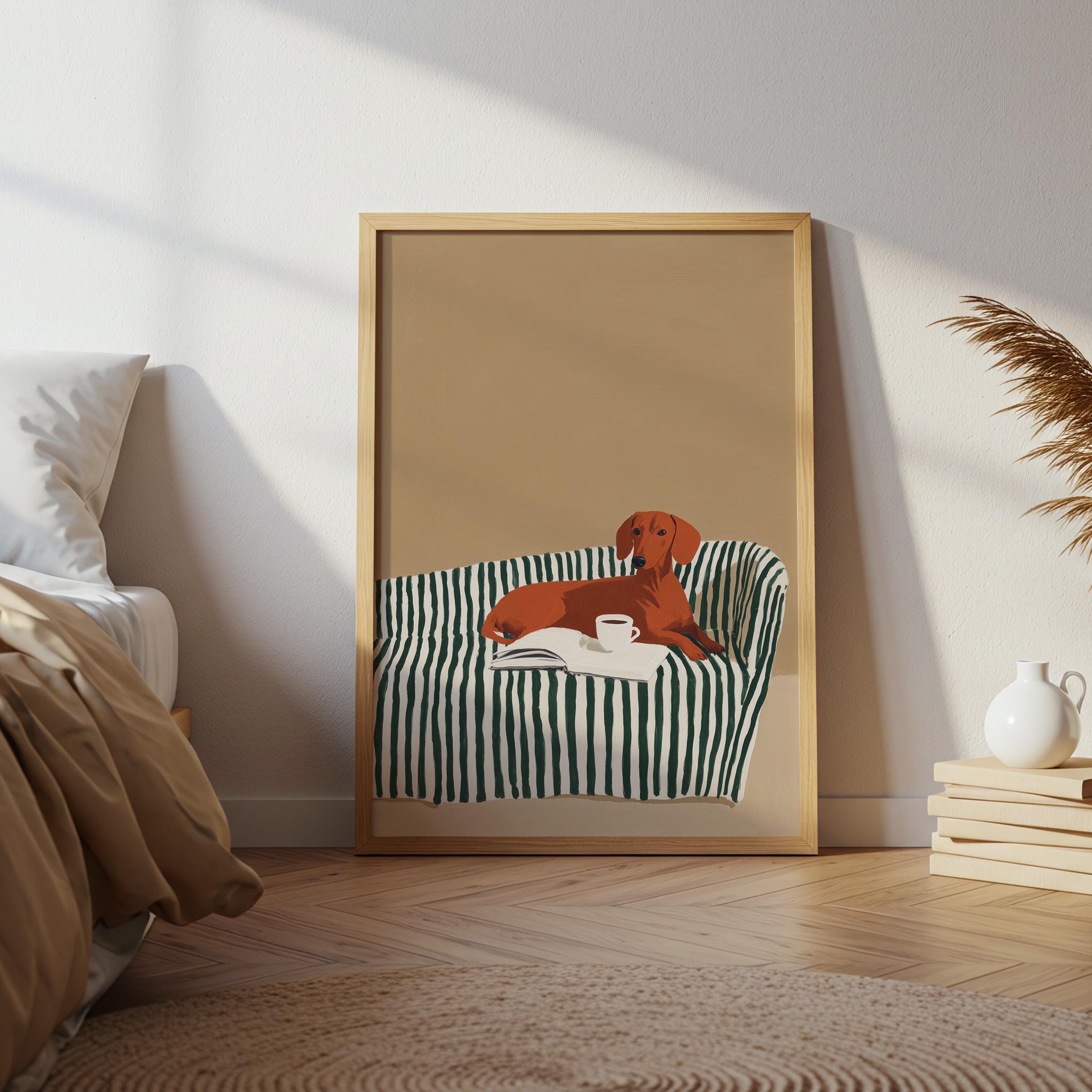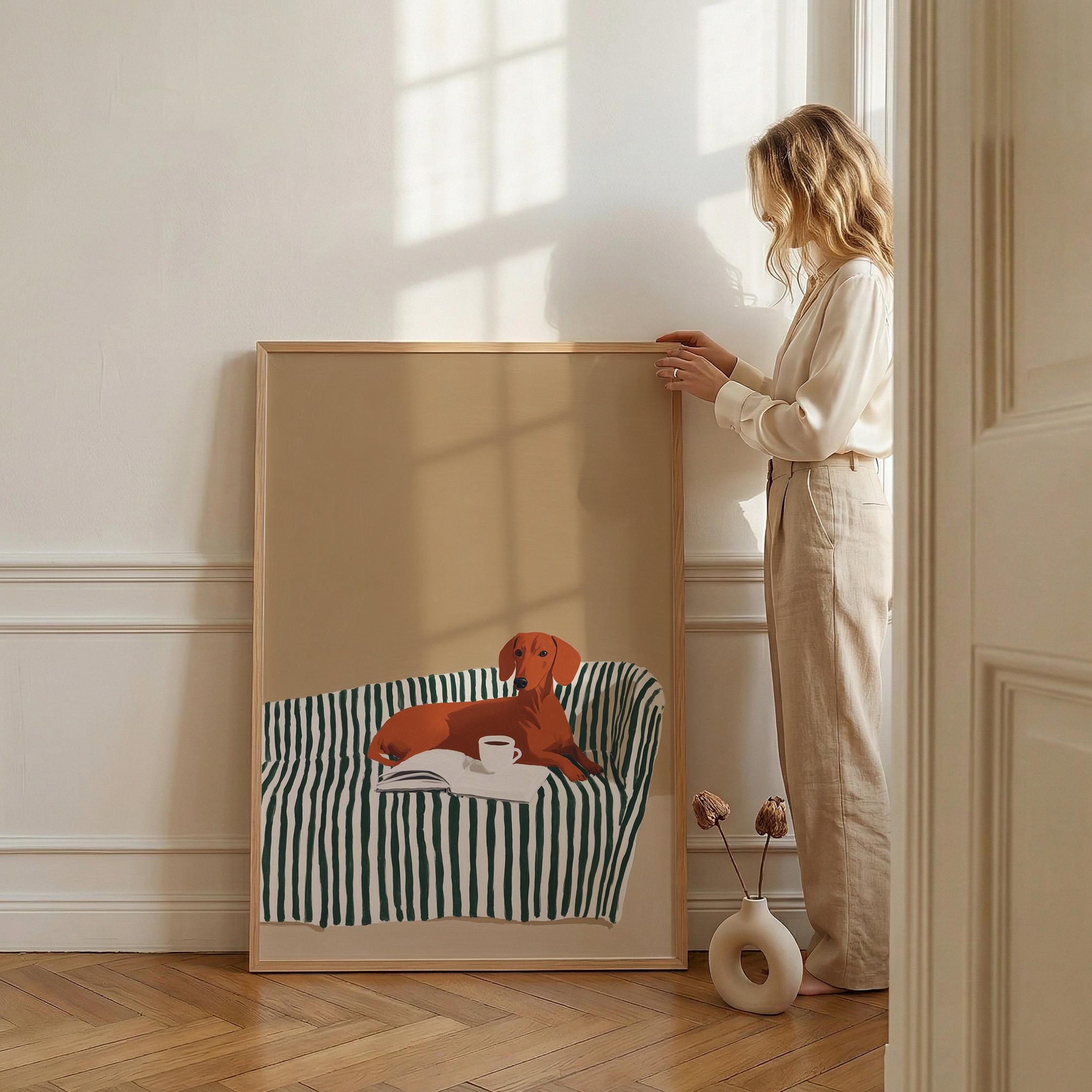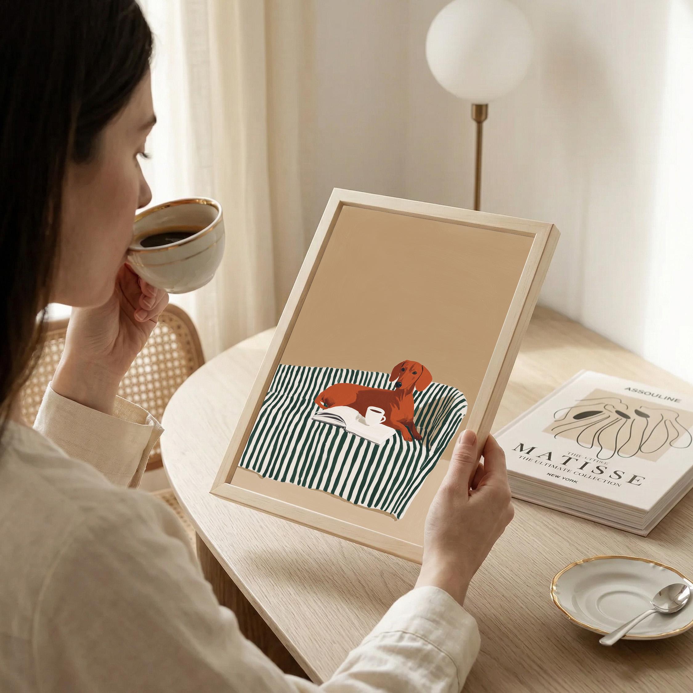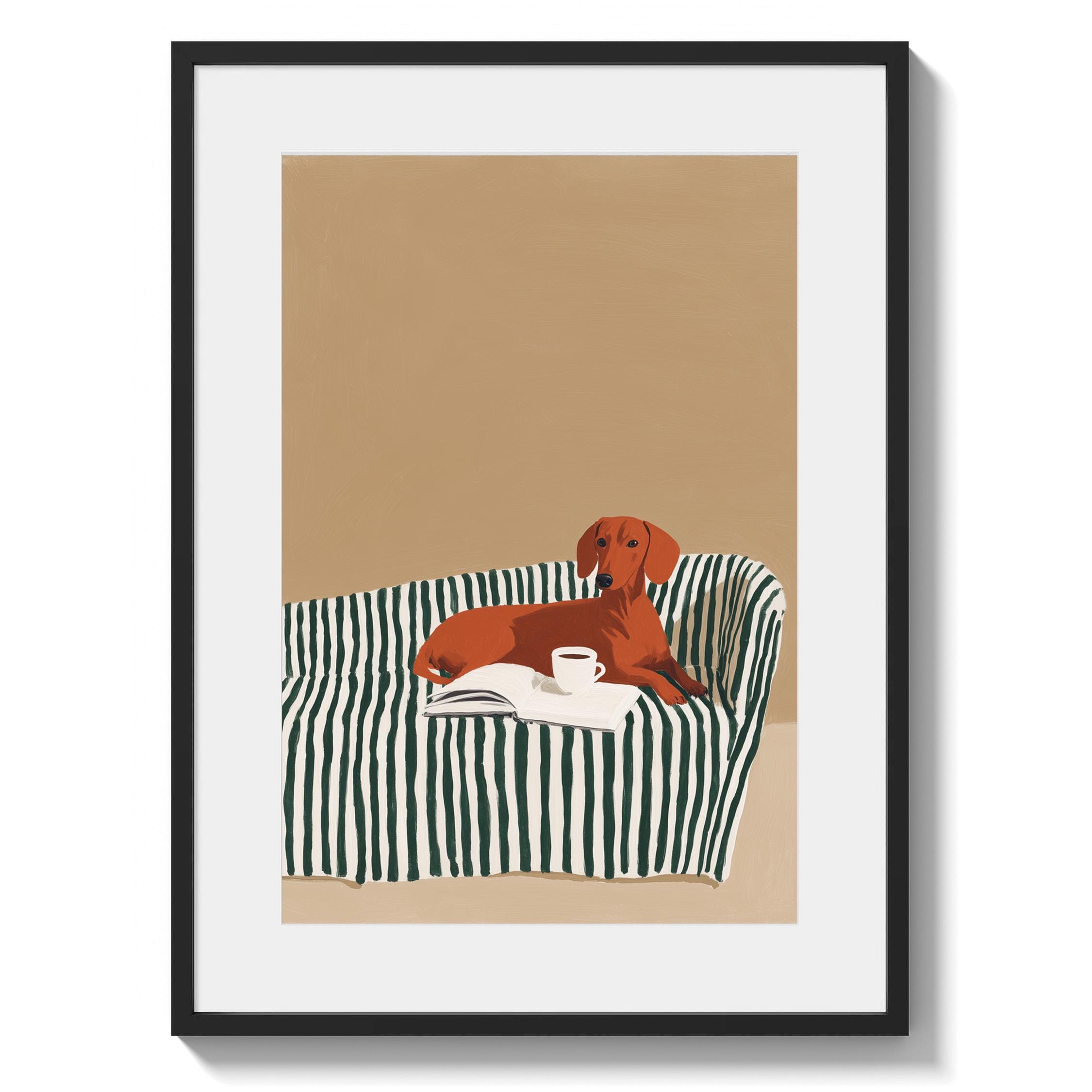 A charming dachshund relaxing on a striped sofa with coffee and a book brings warmth and personality to your walls. Perfect for dog lovers, book enthusiasts, and anyone decorating a living room, bedroom, or reading nook with cozy, modern style.