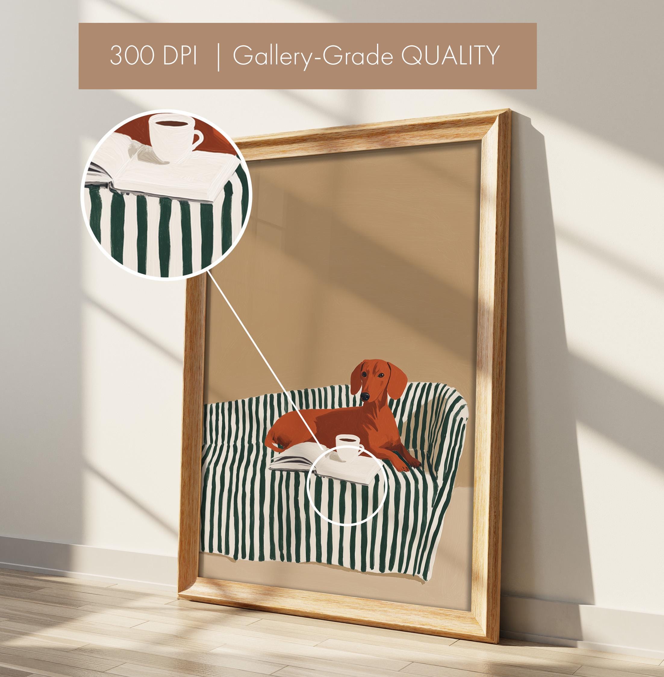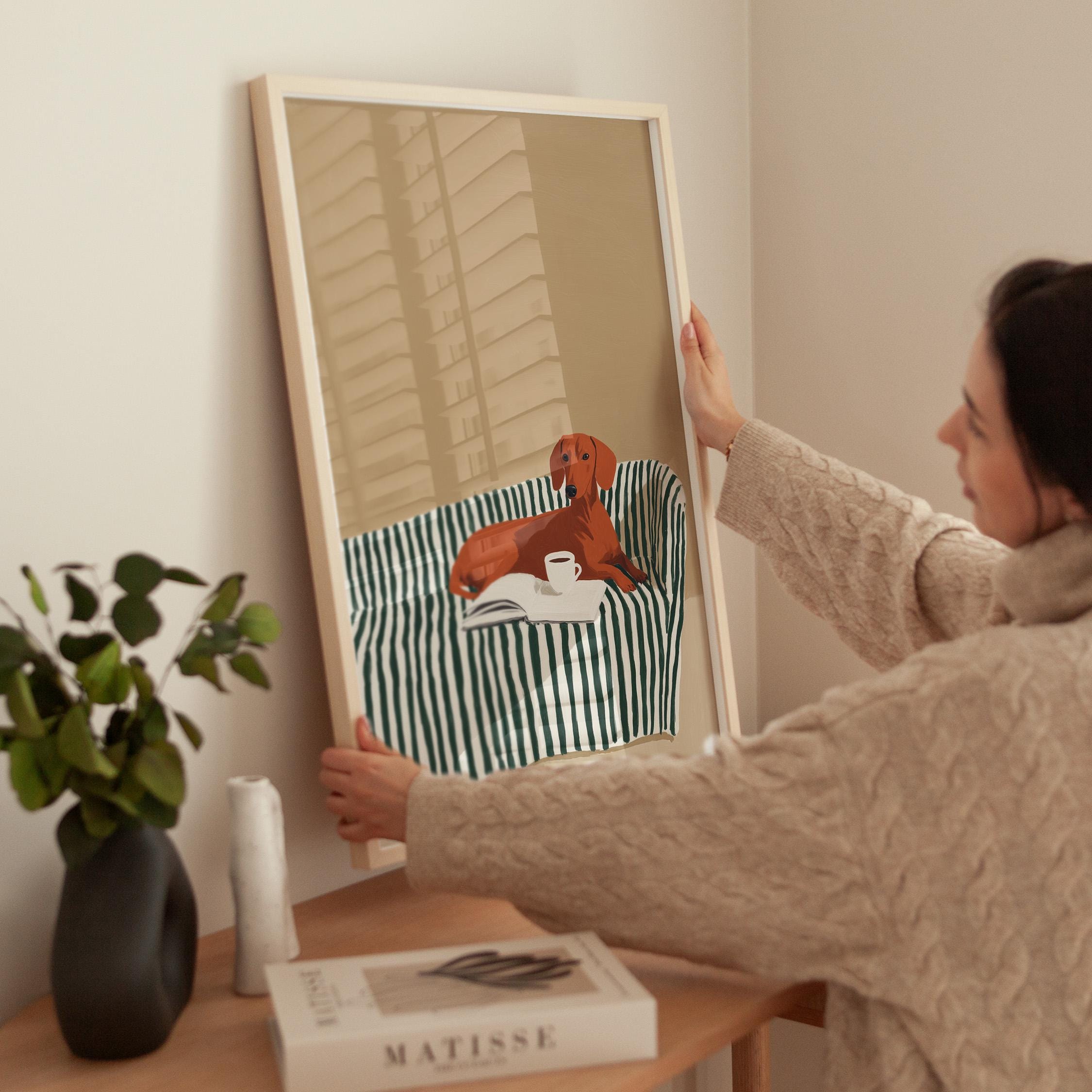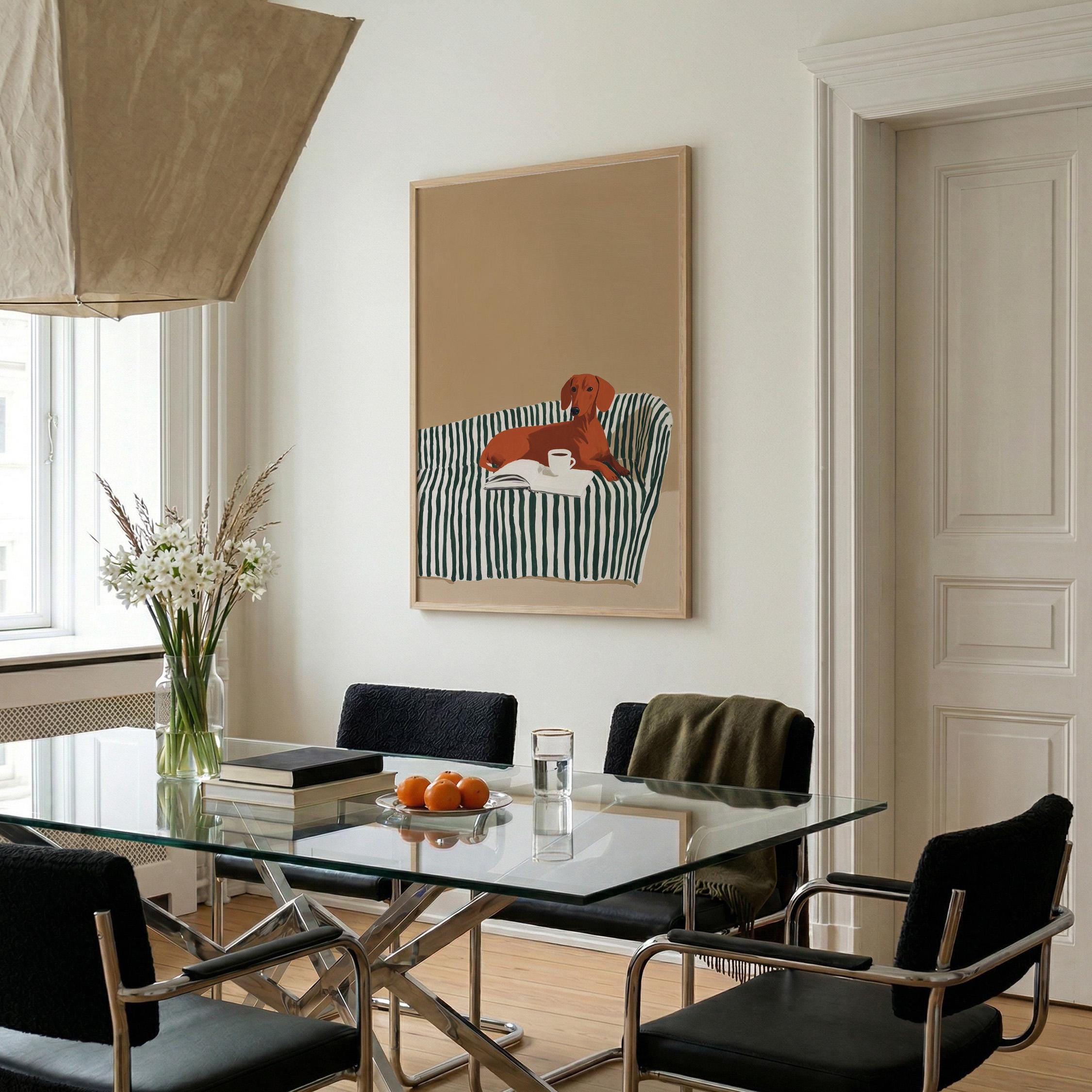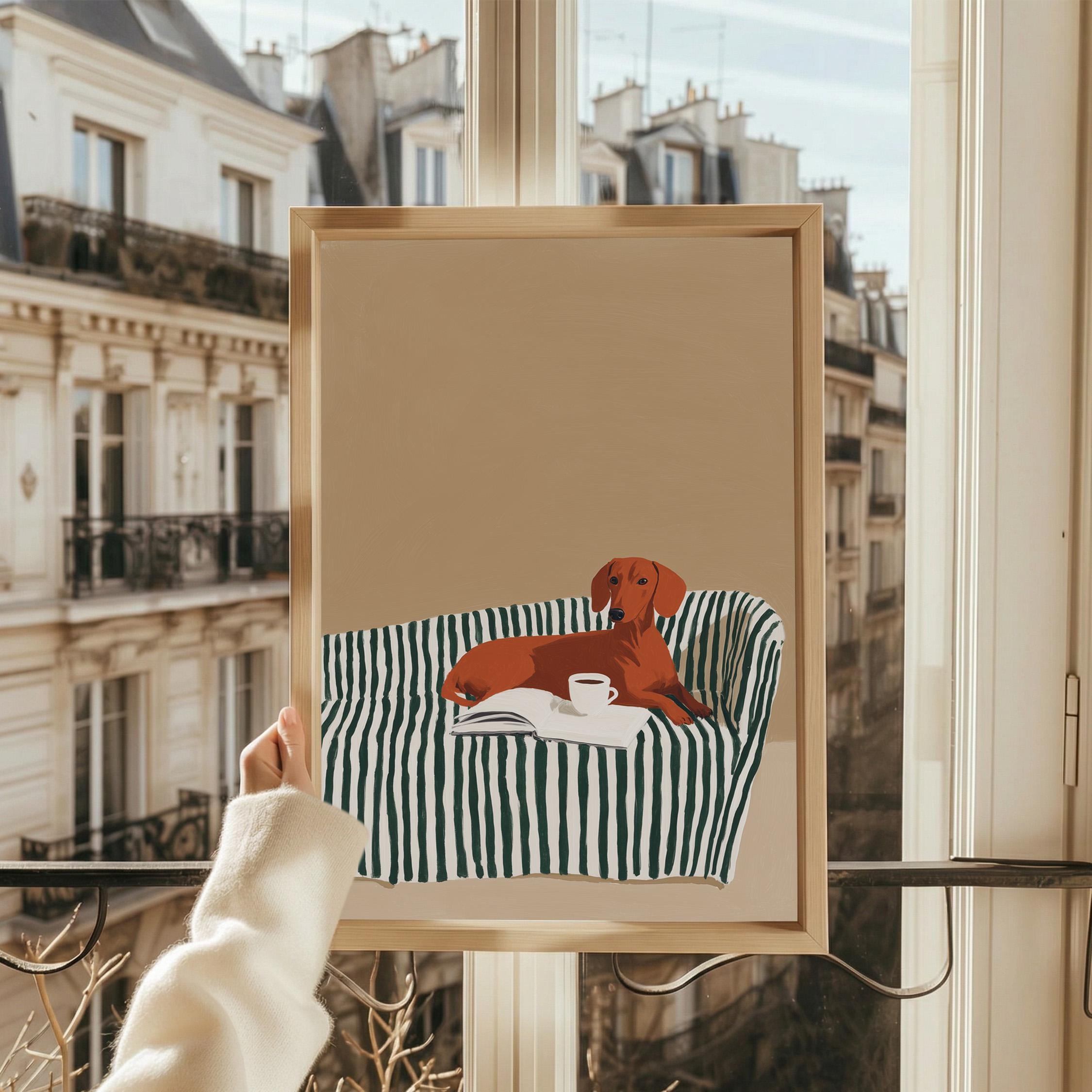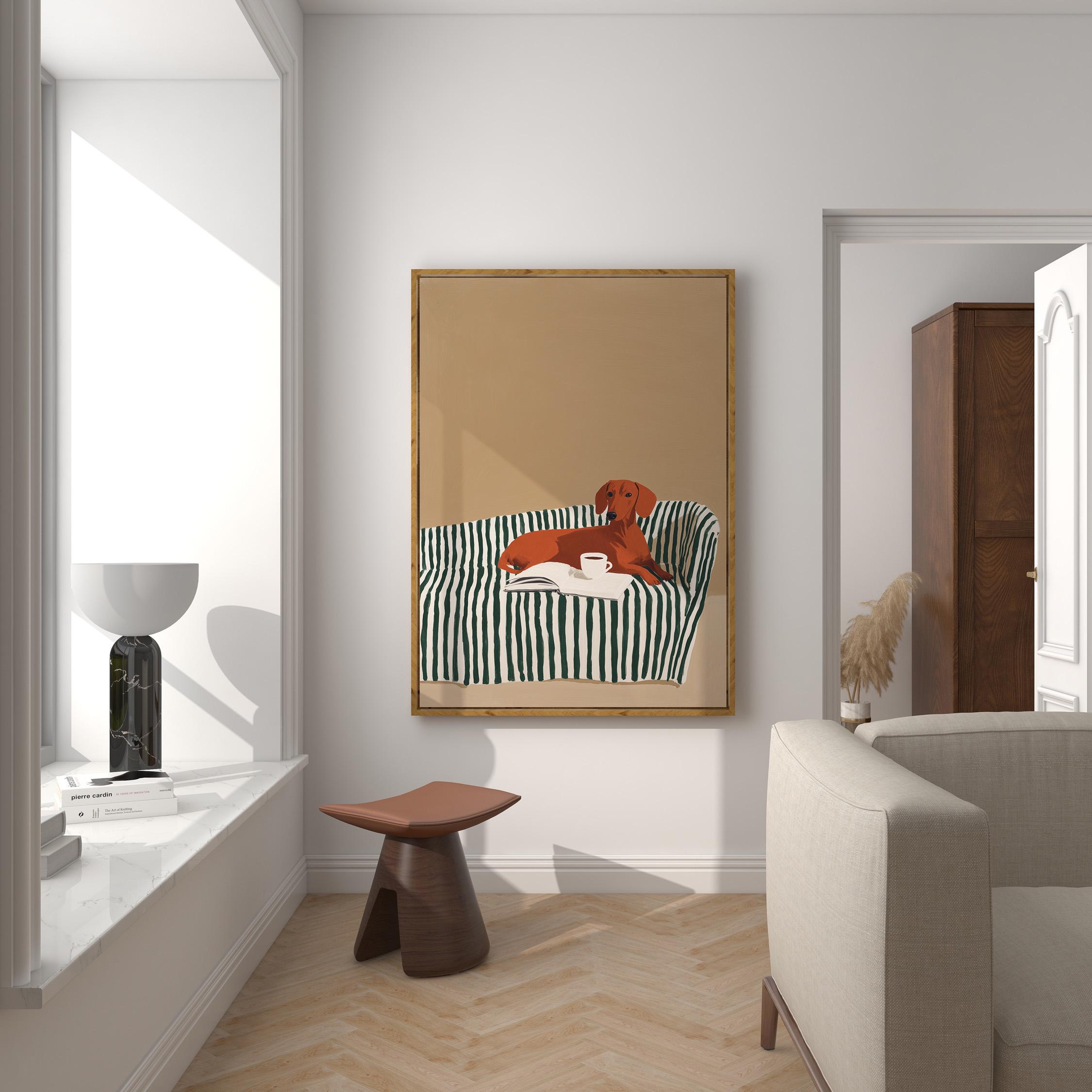A charming dachshund relaxing on a striped sofa with coffee and a book brings warmth and personality to your walls. Perfect for dog lovers, book enthusiasts, and anyone decorating a living room, bedroom, or reading nook with cozy, modern style.