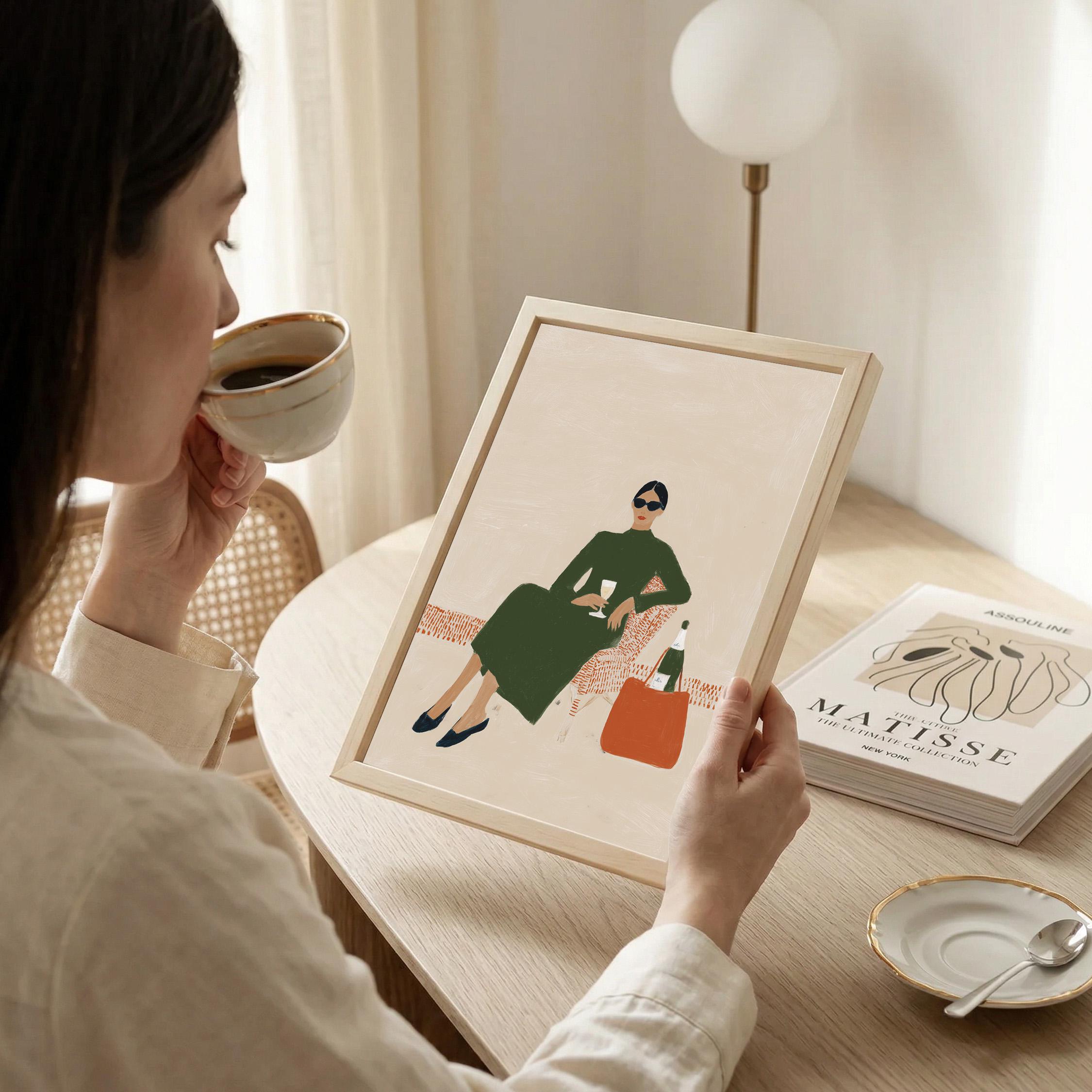 Transform your space with this chic woman enjoying wine in an elegant emerald dress, a sophisticated fashion illustration on a warm neutral background. Perfect for living rooms, bedrooms, home bars, or dressing areas for the fashion-forward woman who loves refined, modern aesthetics.