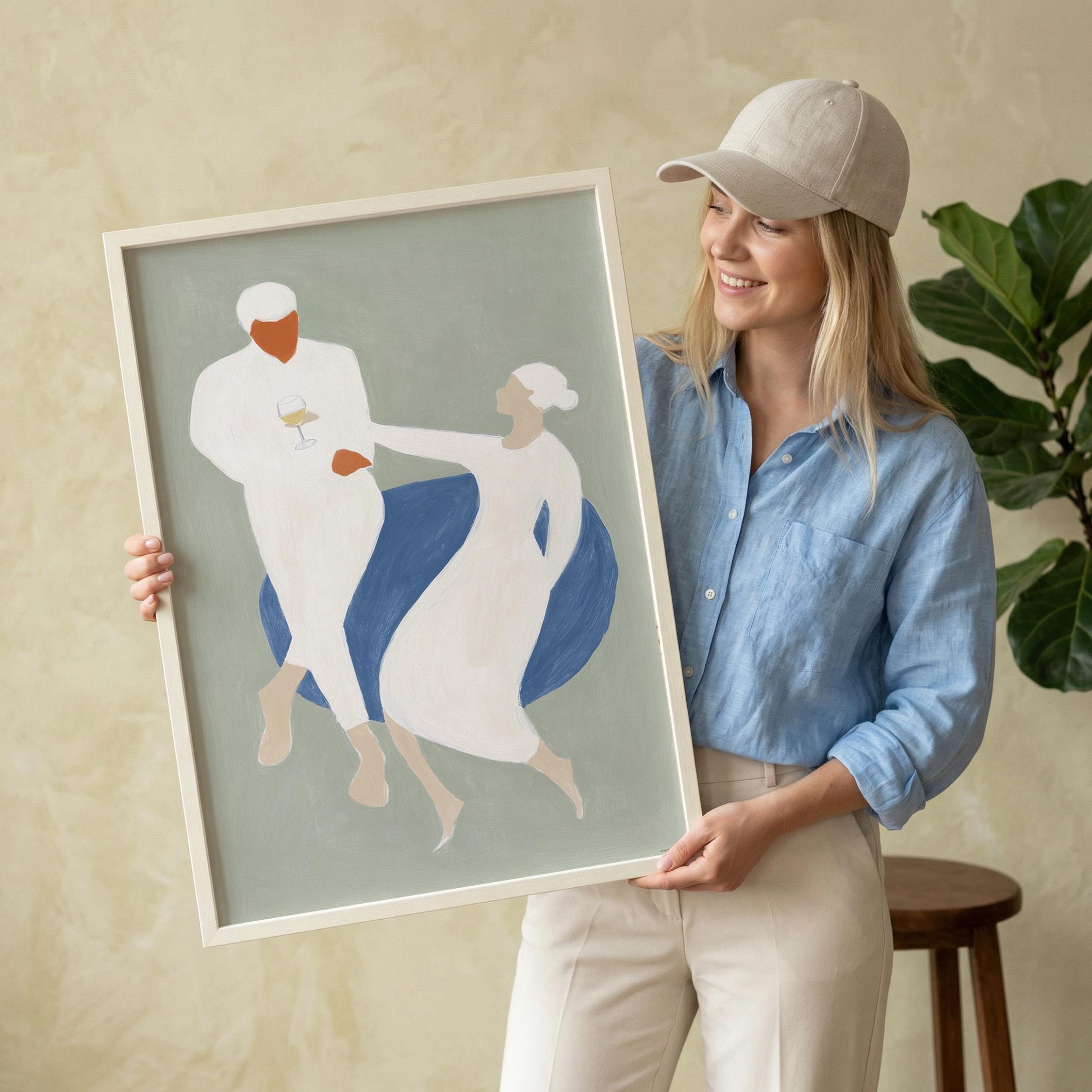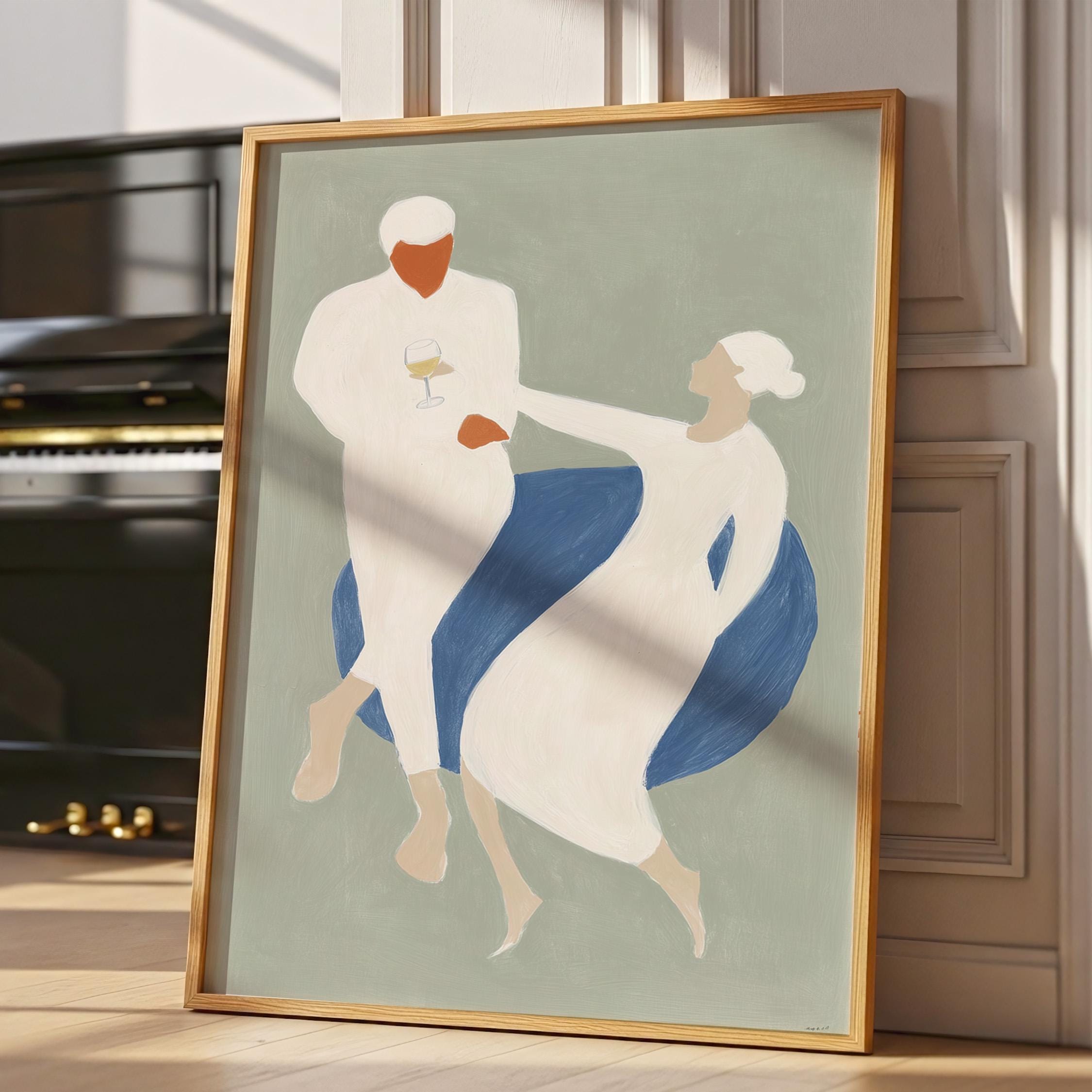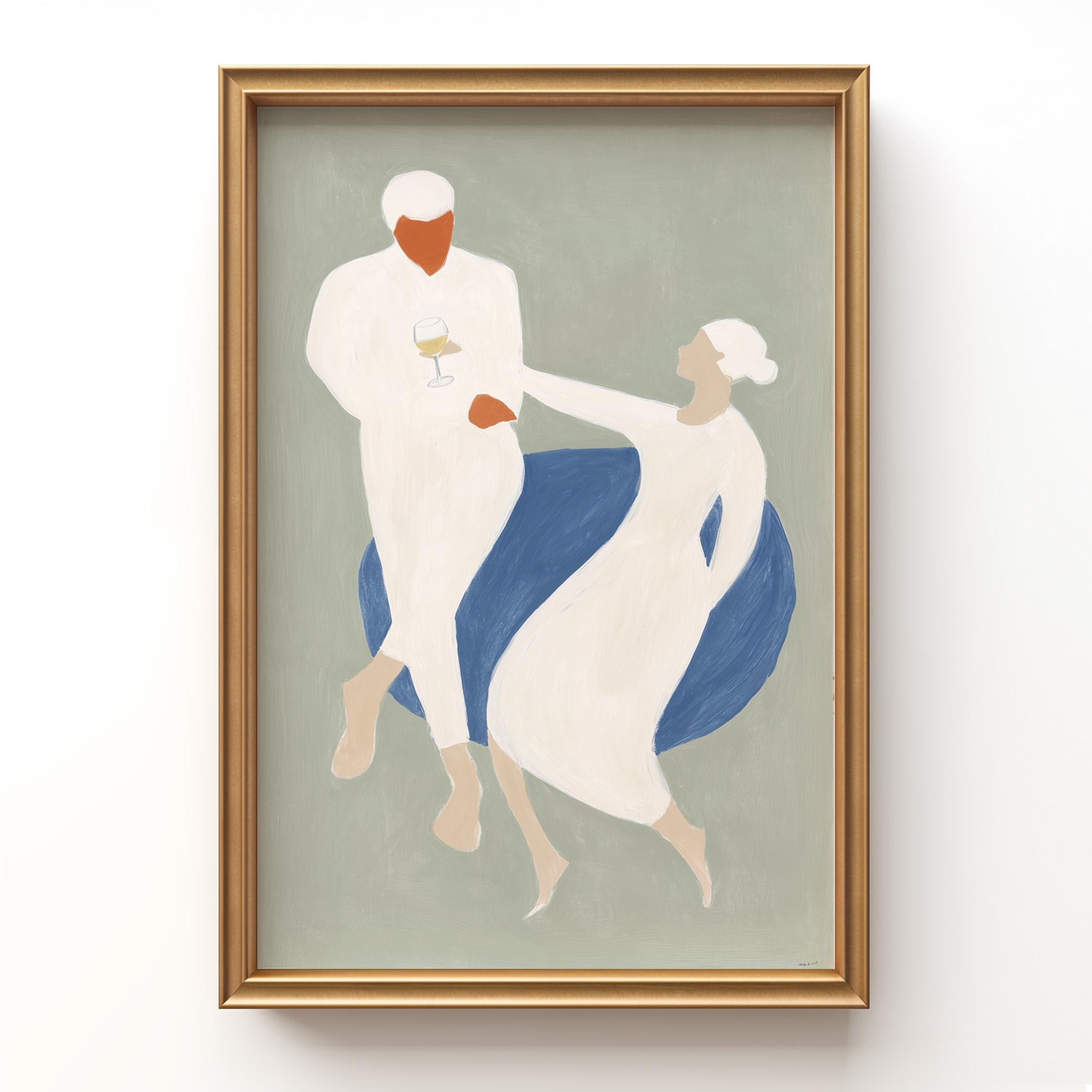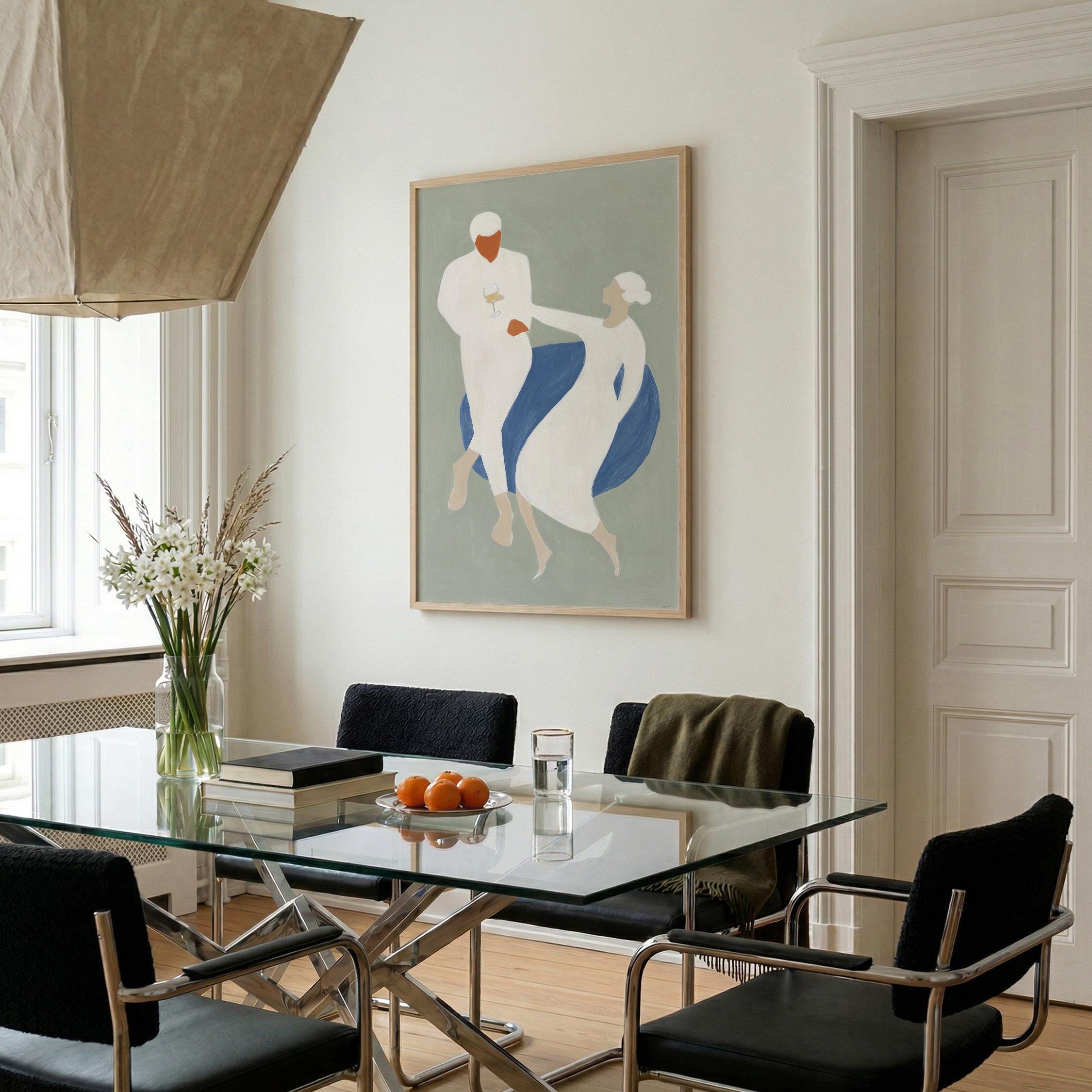 This elegant couple dancing print brings Mediterranean romance and coastal calm to your space with soft sage green, blue, and cream tones. Perfect for dining rooms, kitchens, or living rooms seeking sophisticated European-inspired art that feels relaxed yet refined.