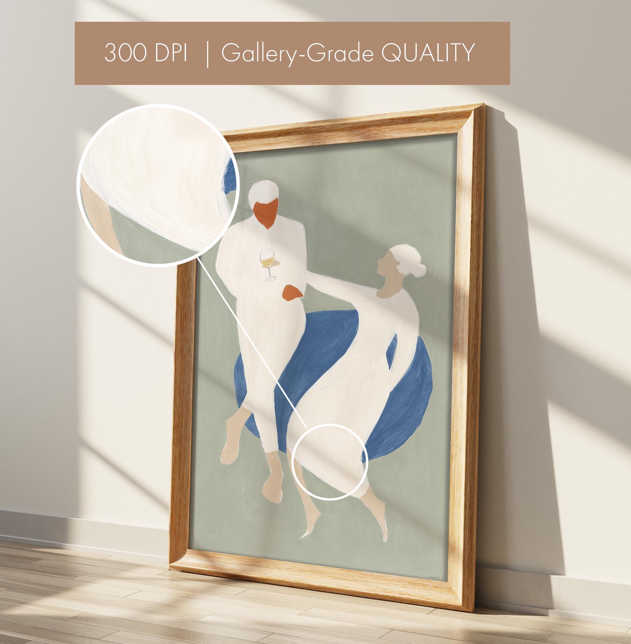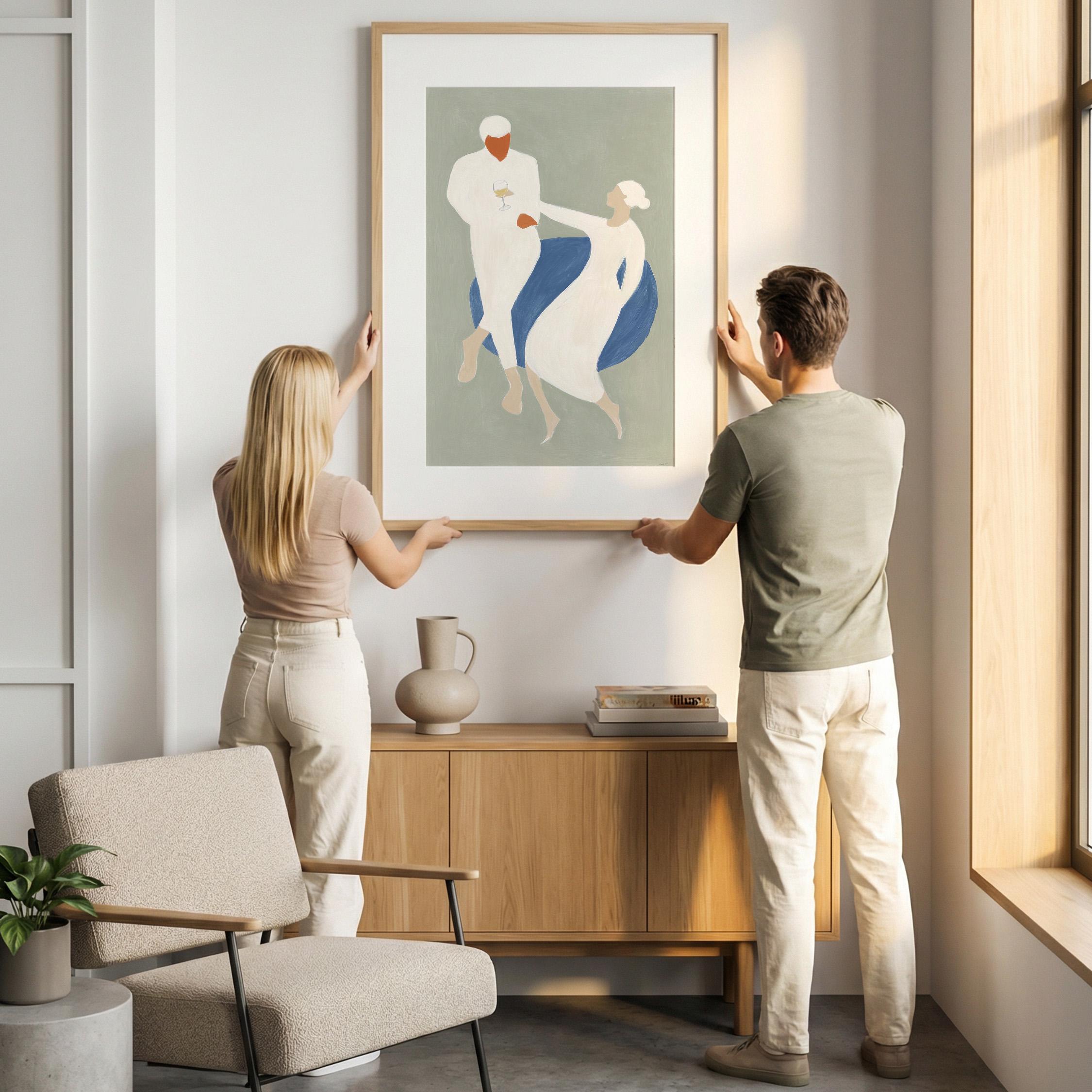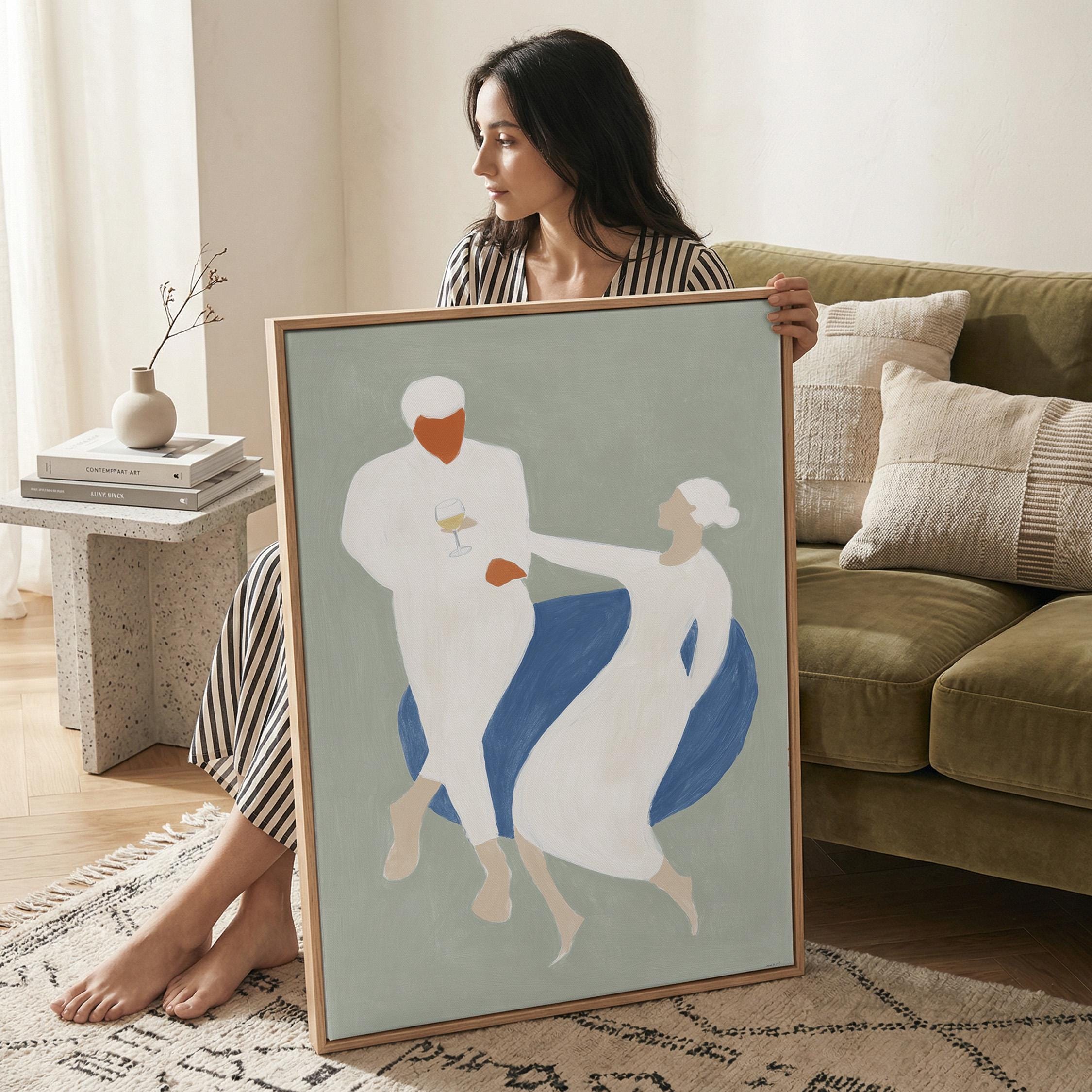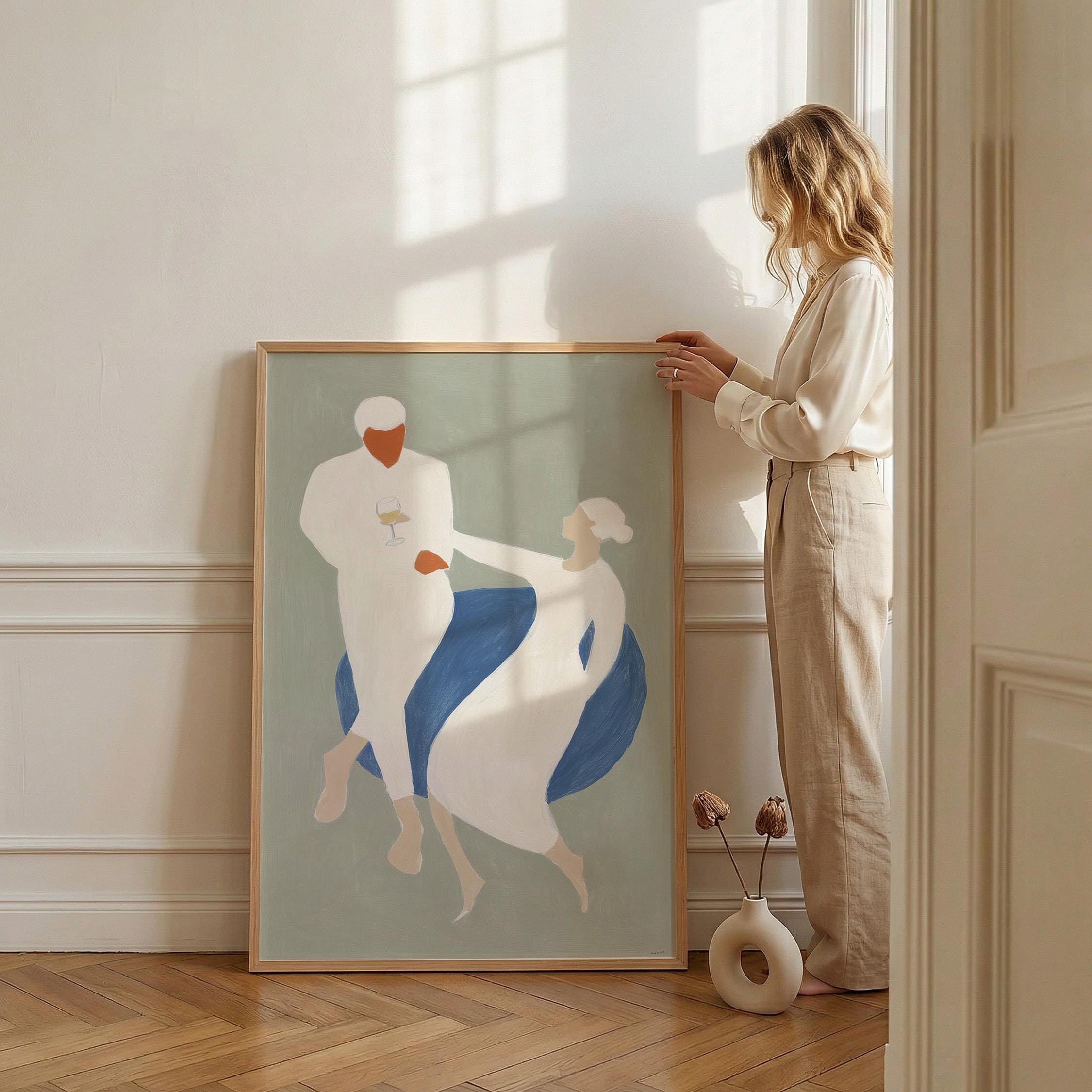 This elegant couple dancing print brings Mediterranean romance and coastal calm to your space with soft sage green, blue, and cream tones. Perfect for dining rooms, kitchens, or living rooms seeking sophisticated European-inspired art that feels relaxed yet refined.