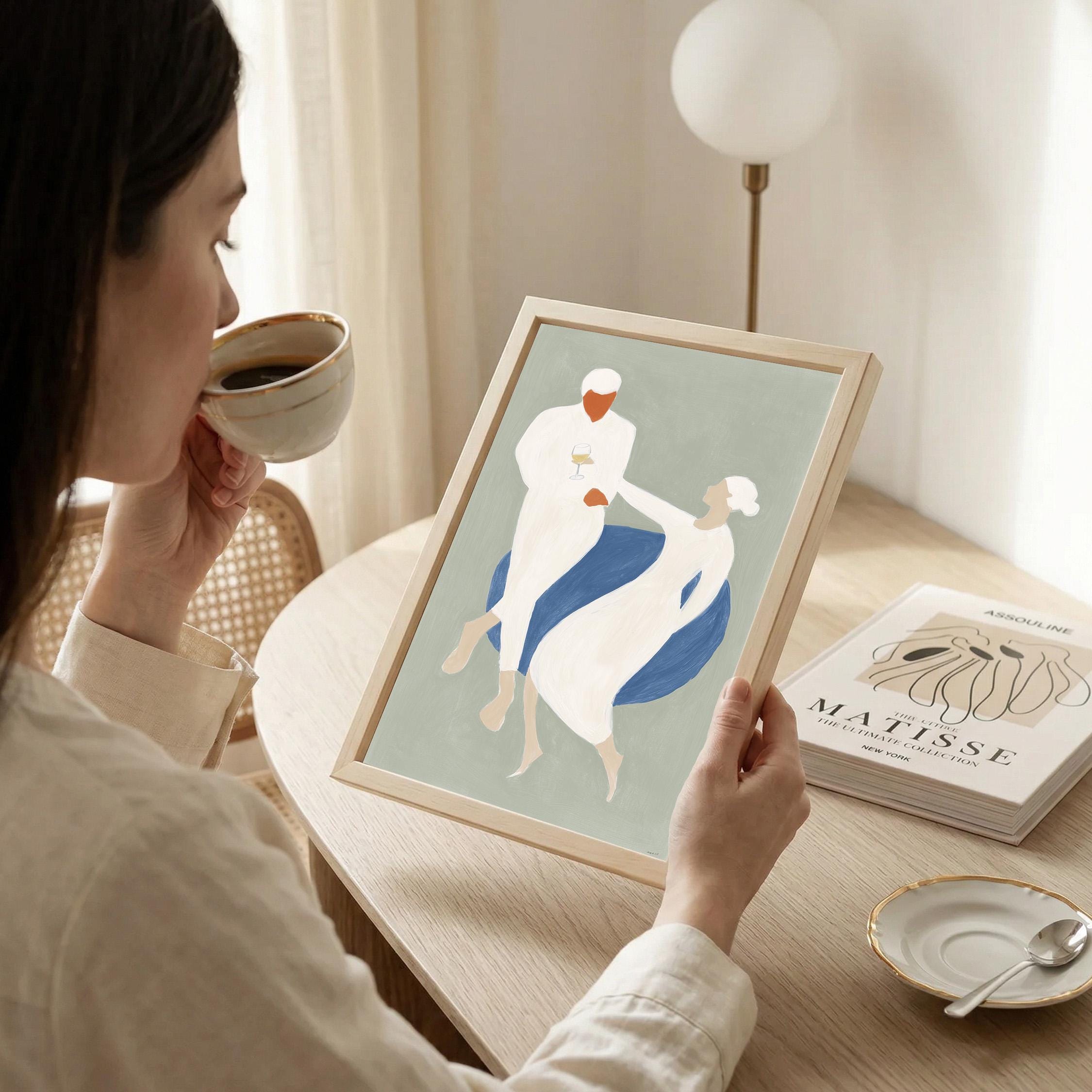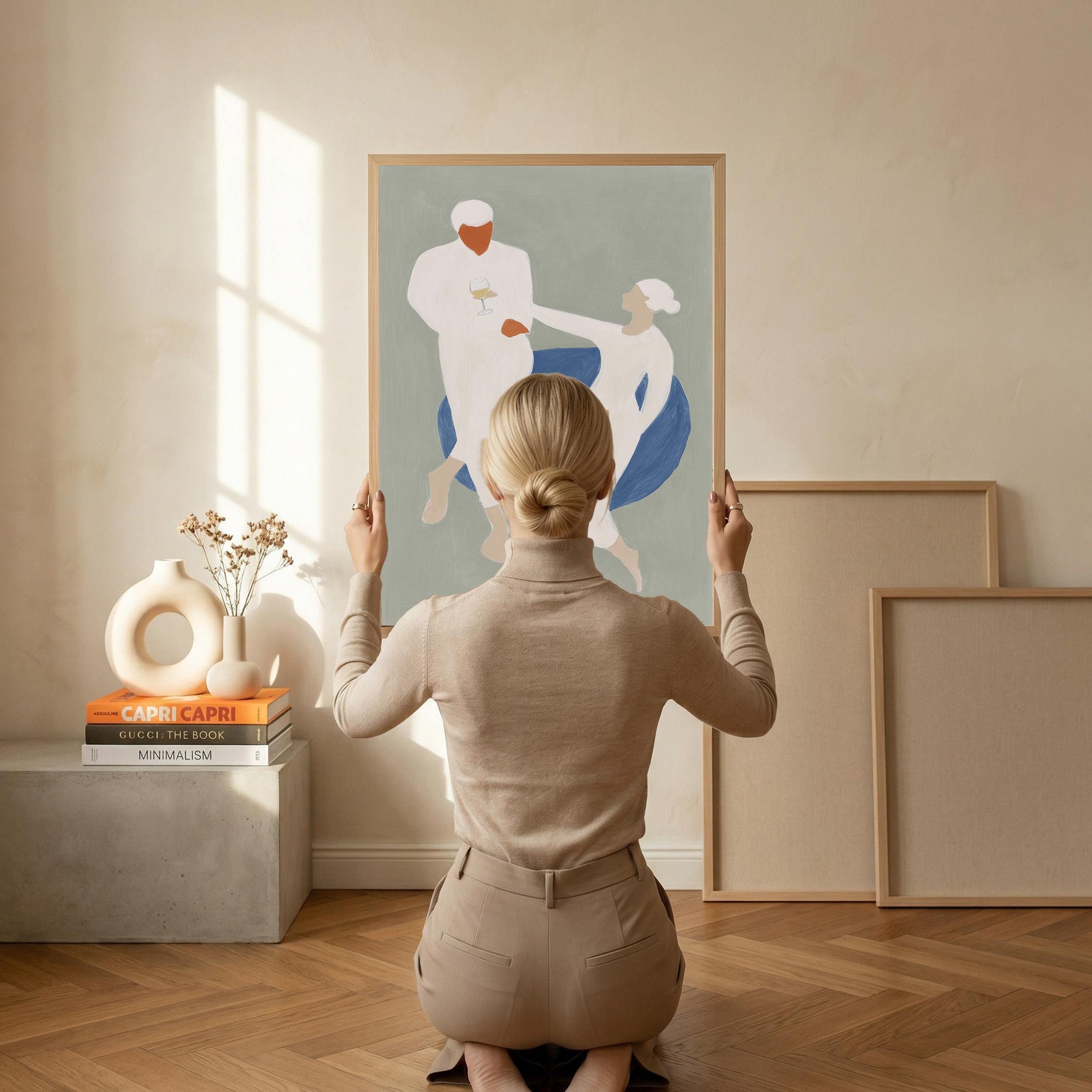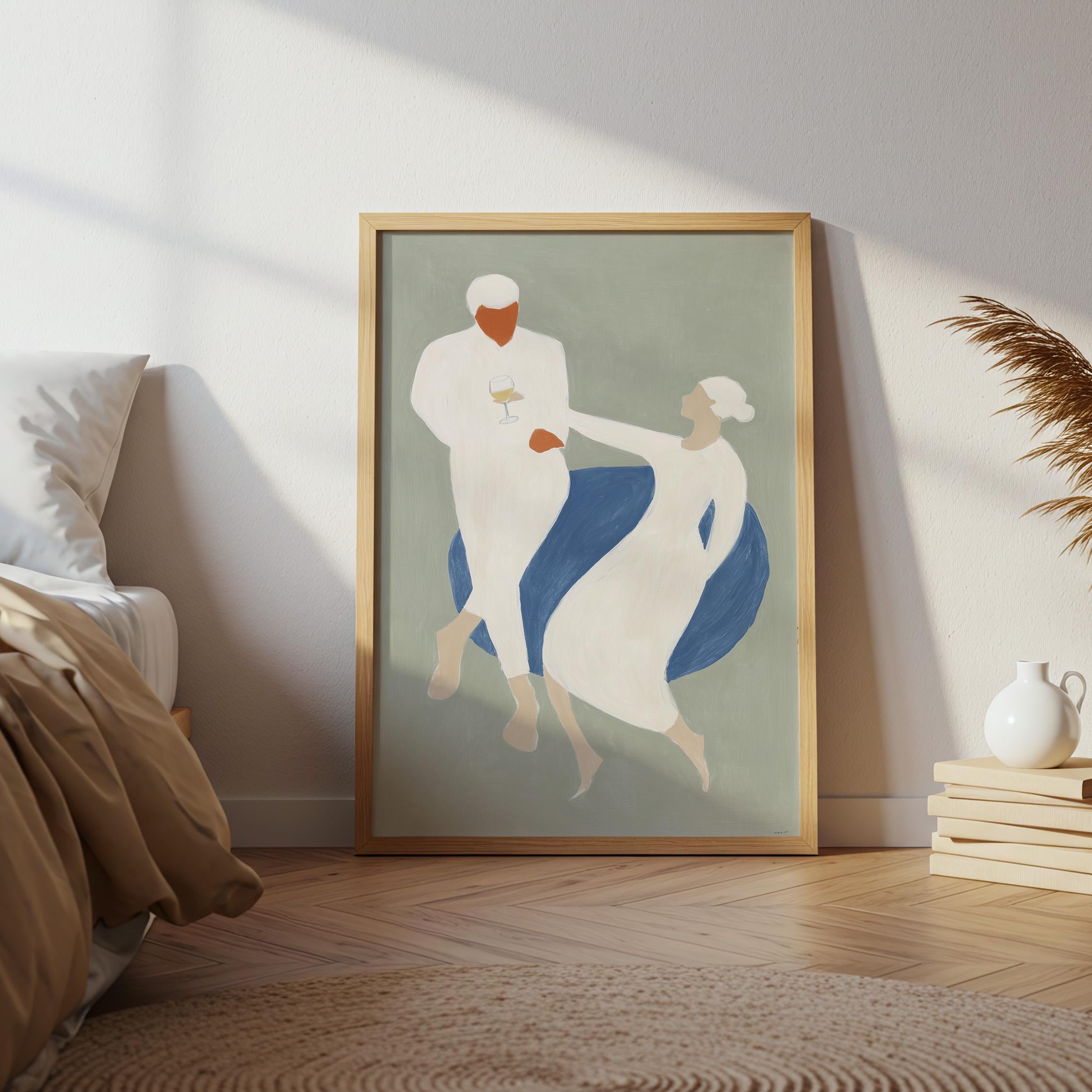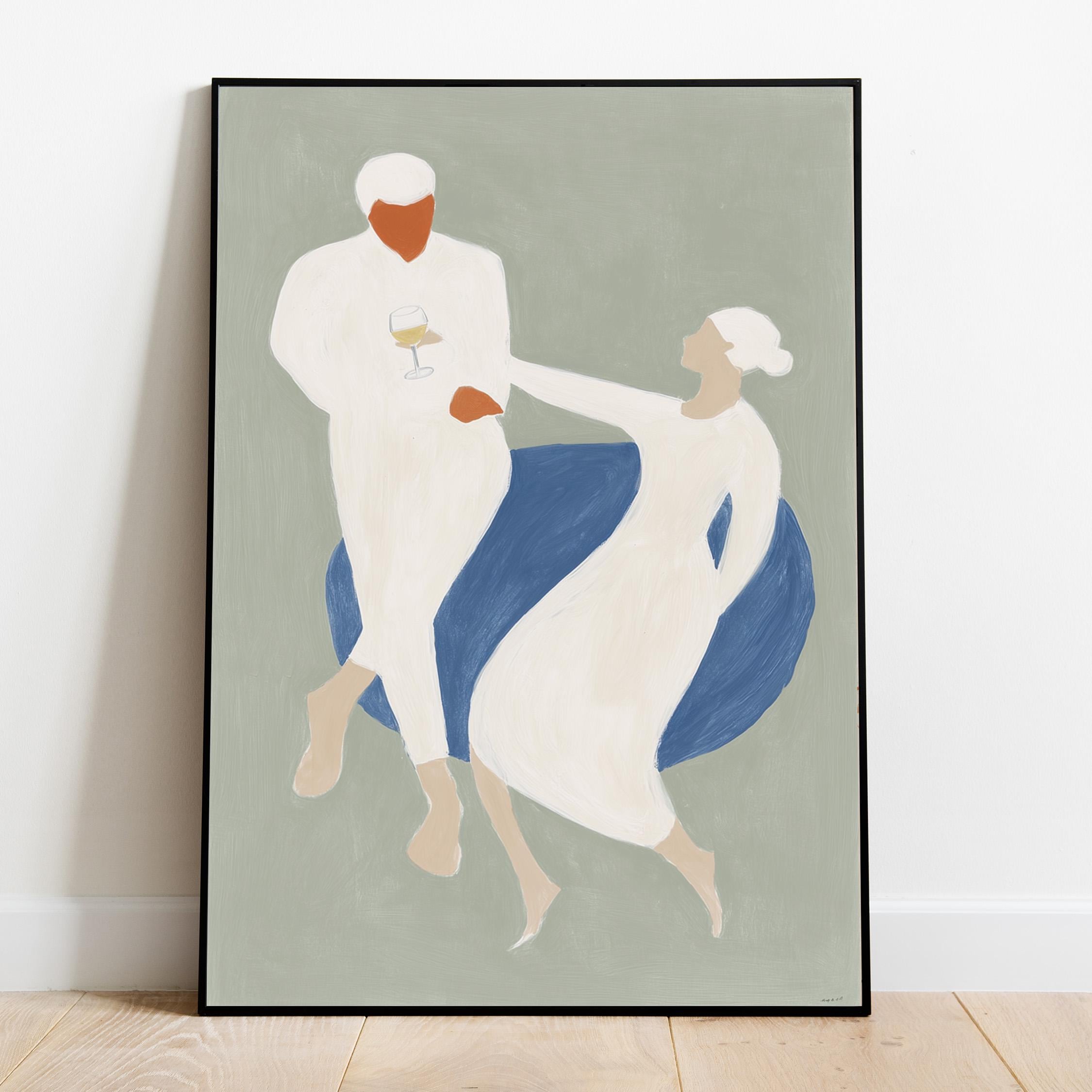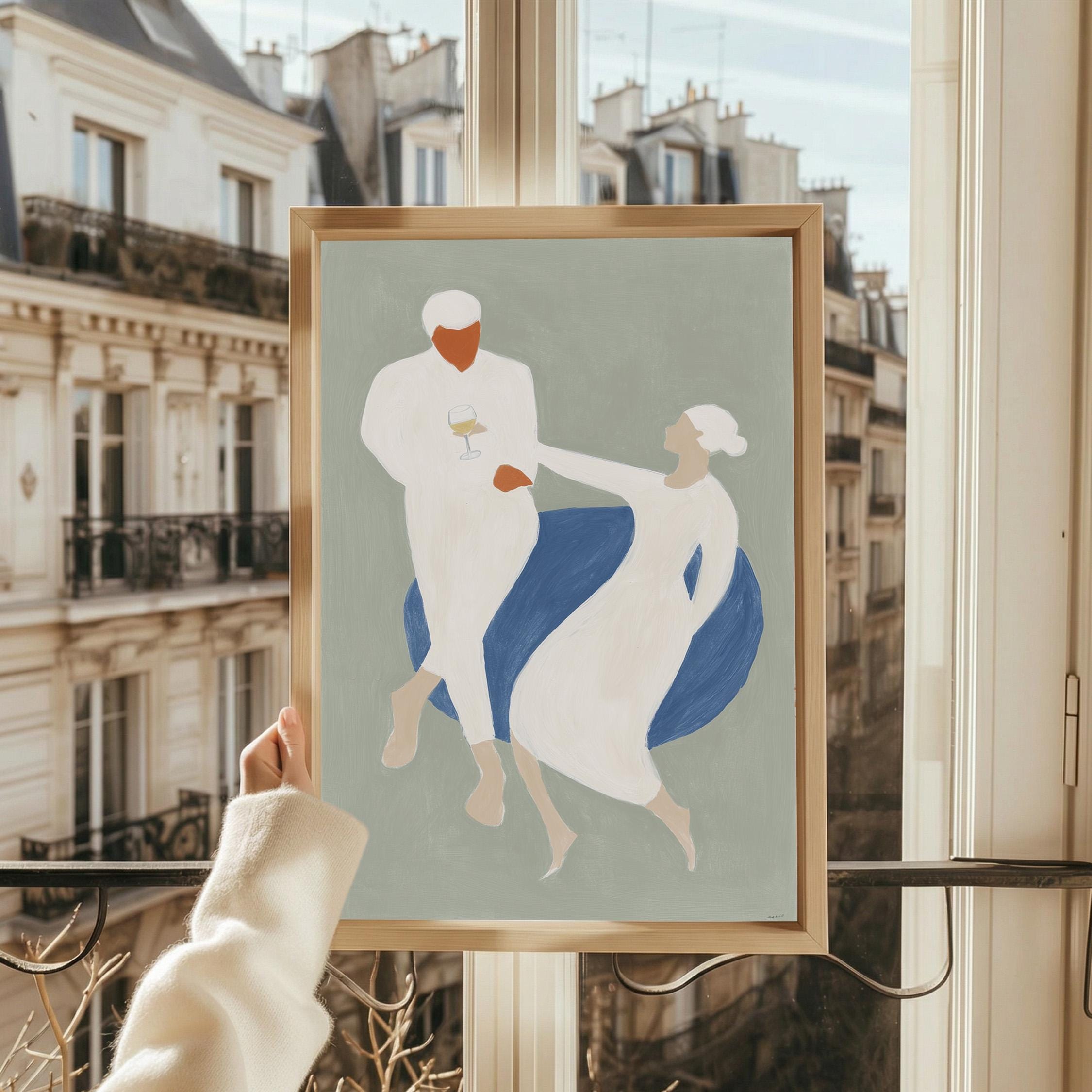 This elegant couple dancing print brings Mediterranean romance and coastal calm to your space with soft sage green, blue, and cream tones. Perfect for dining rooms, kitchens, or living rooms seeking sophisticated European-inspired art that feels relaxed yet refined.