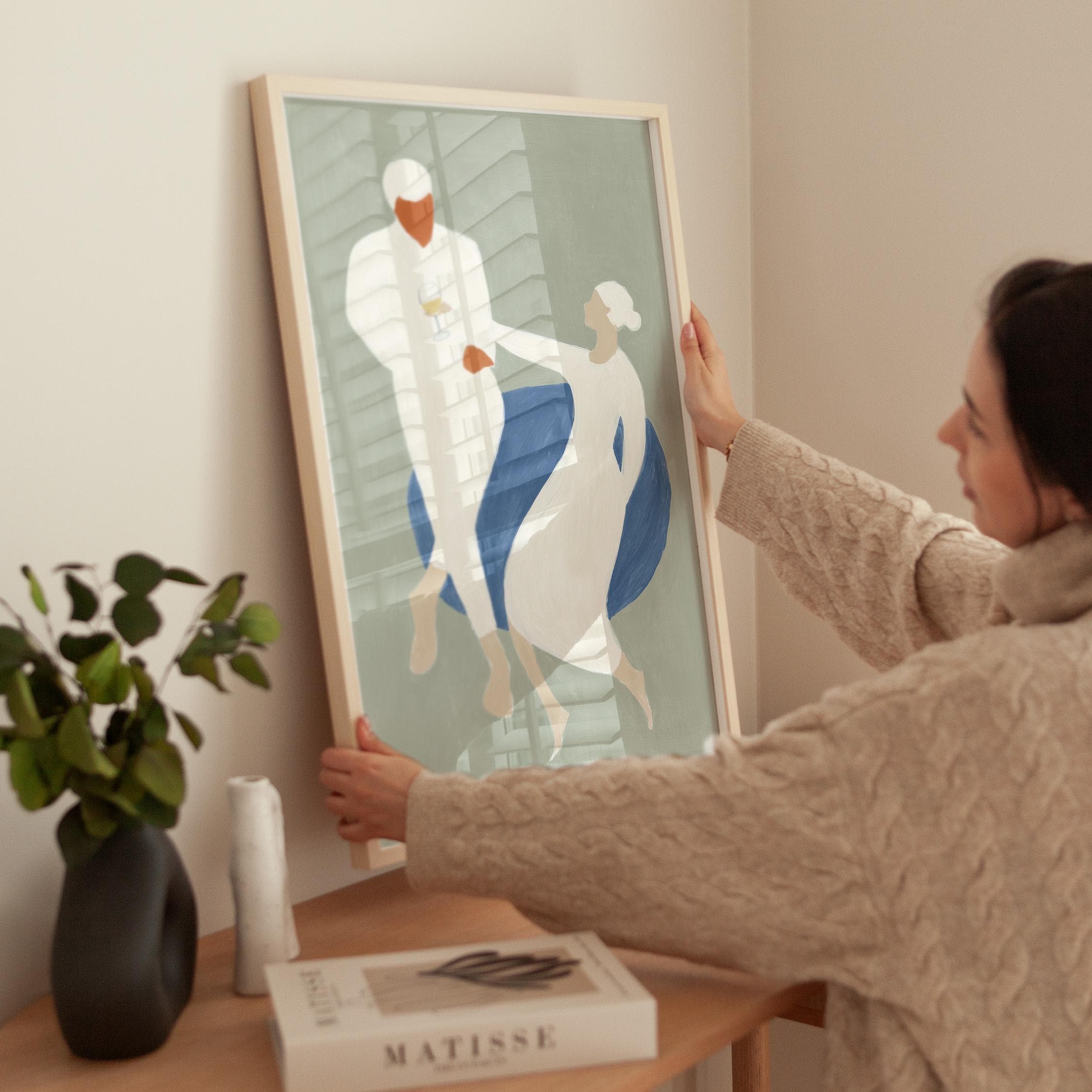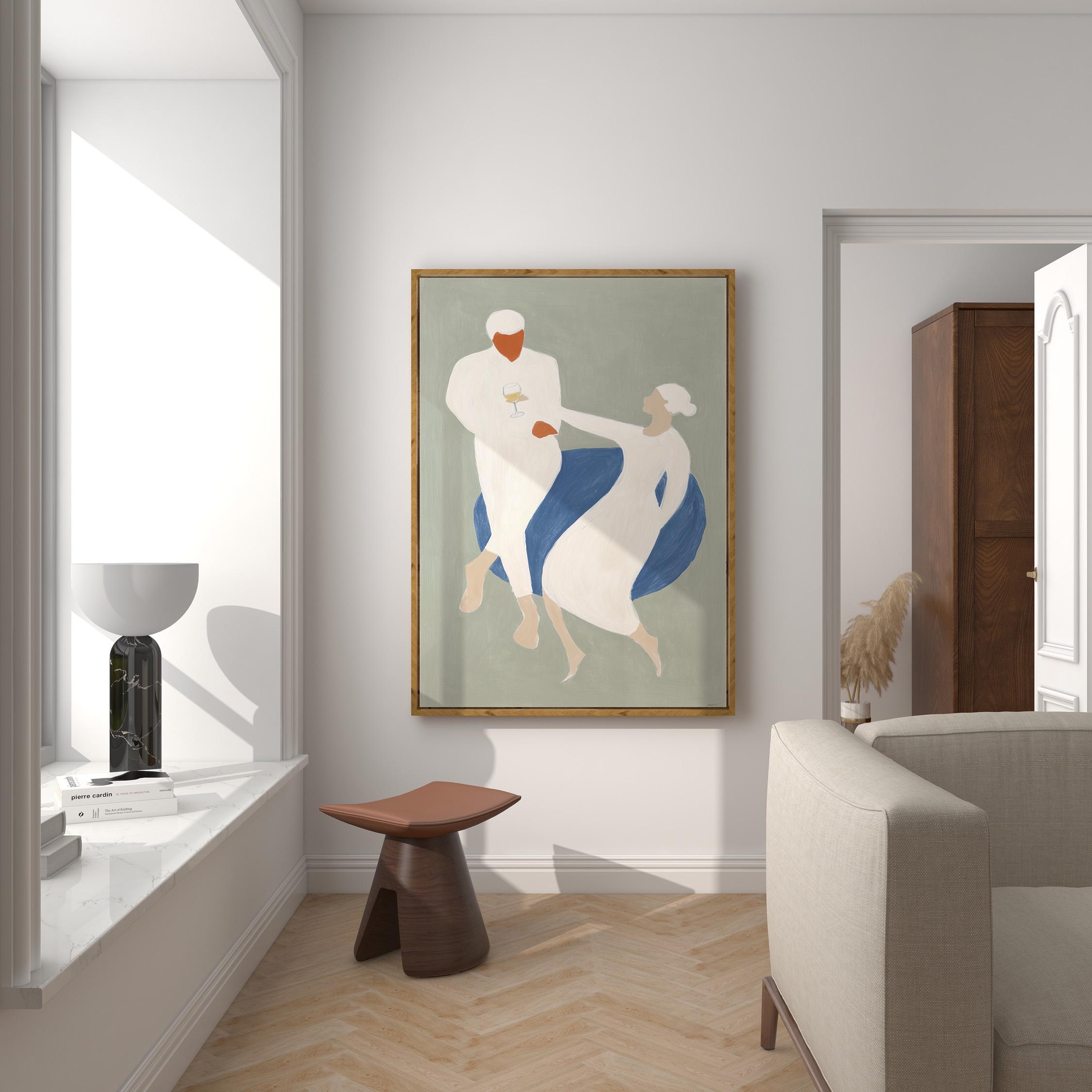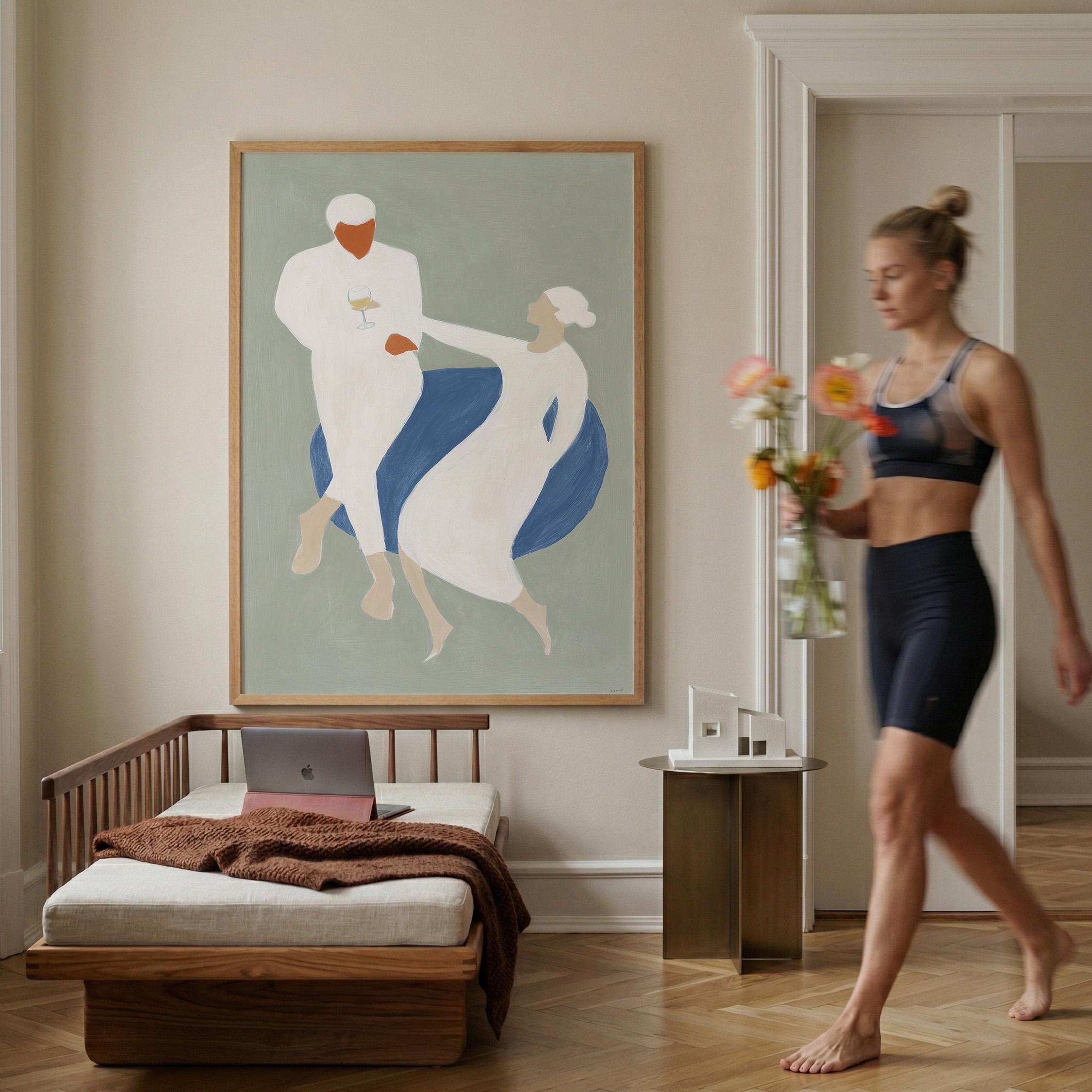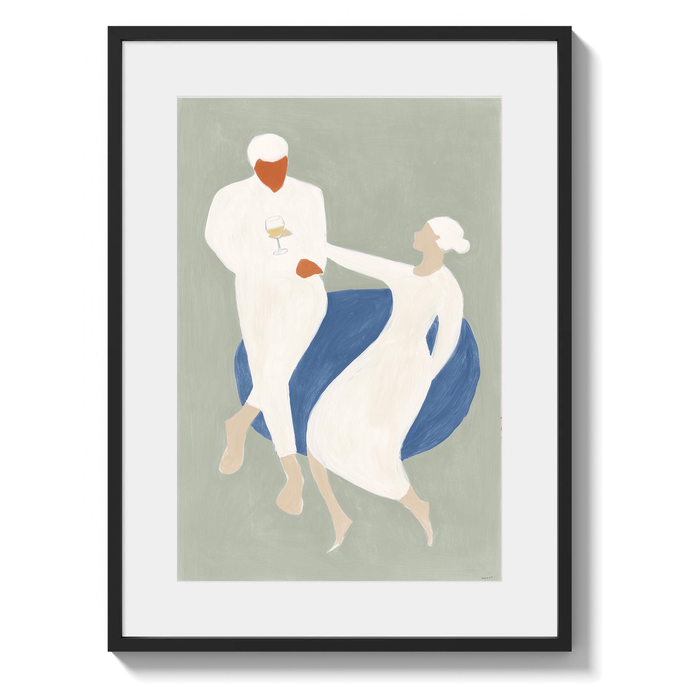 This elegant couple dancing print brings Mediterranean romance and coastal calm to your space with soft sage green, blue, and cream tones. Perfect for dining rooms, kitchens, or living rooms seeking sophisticated European-inspired art that feels relaxed yet refined.