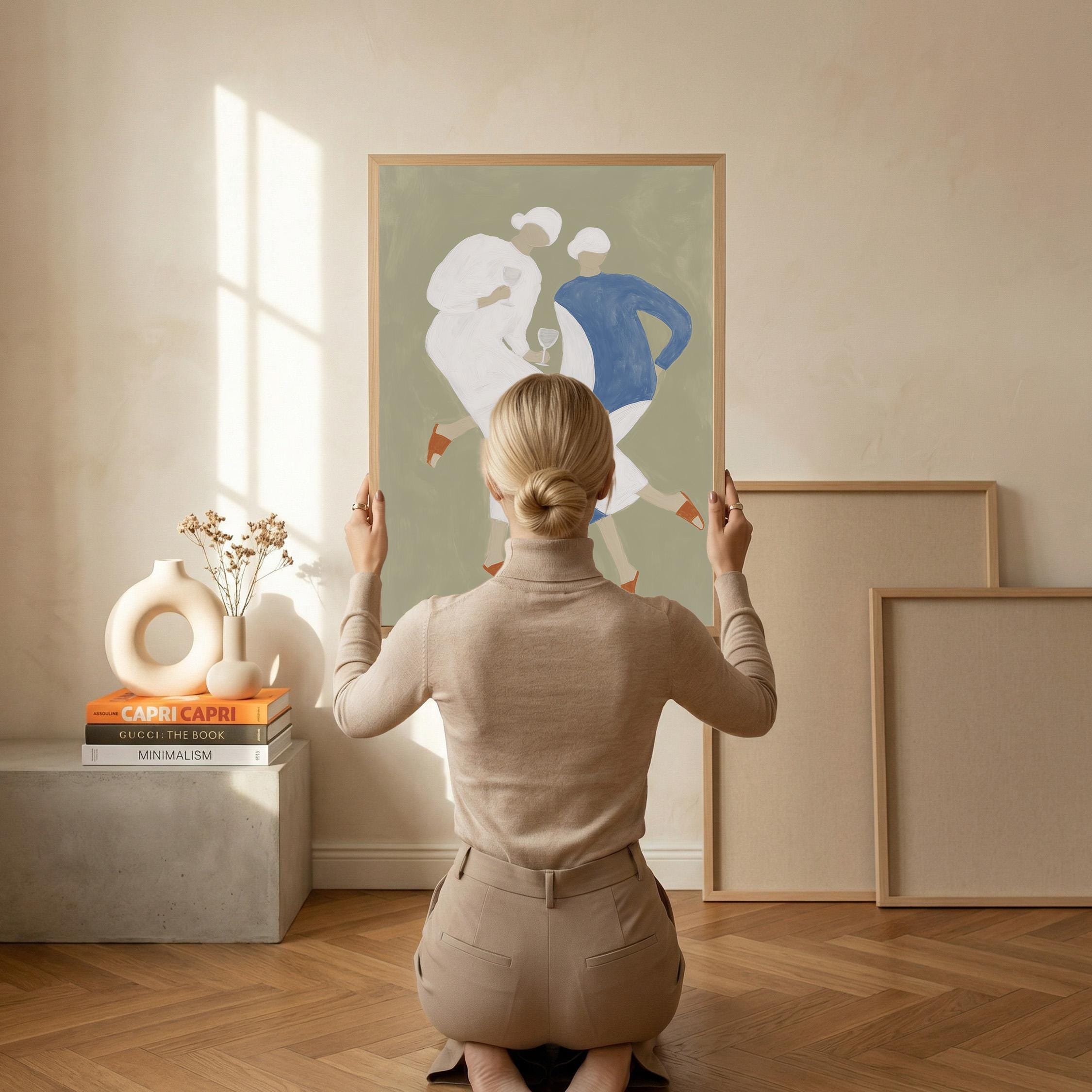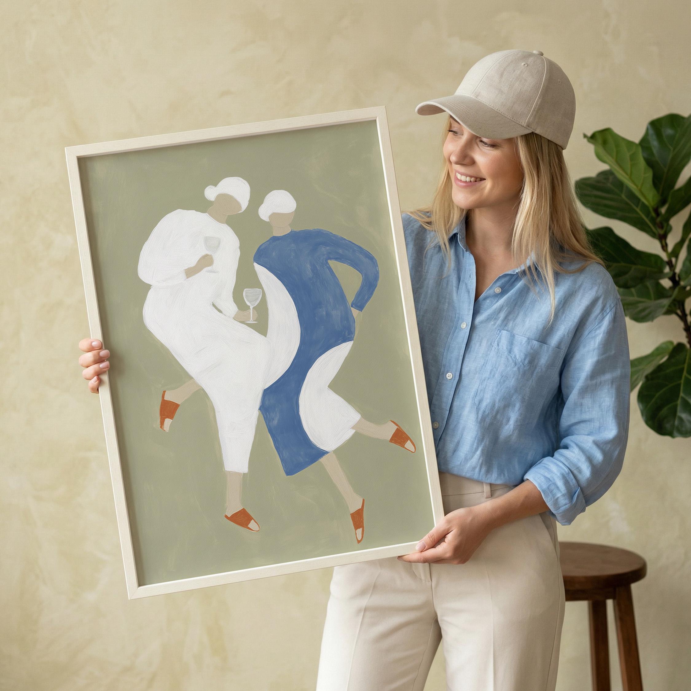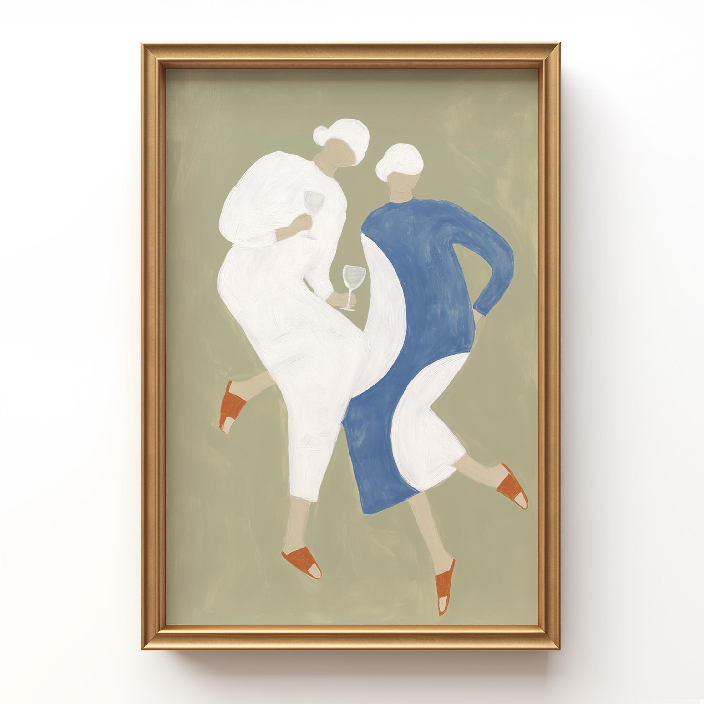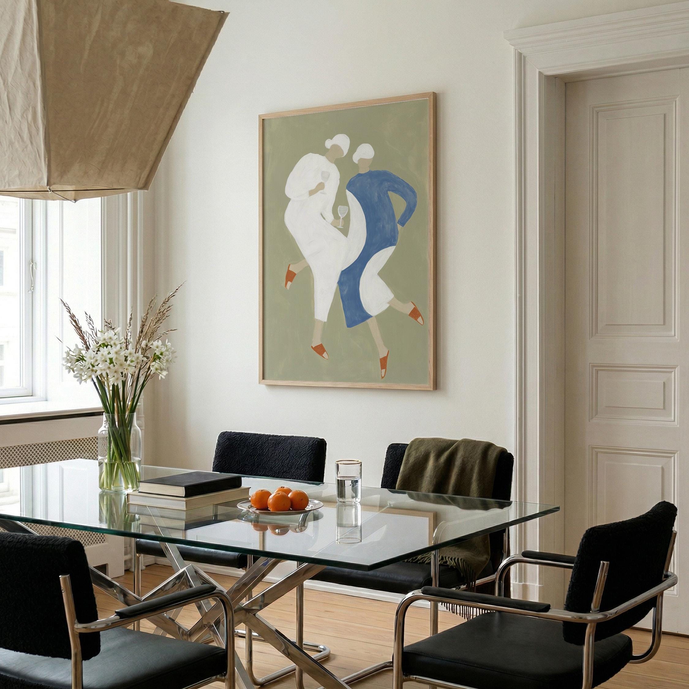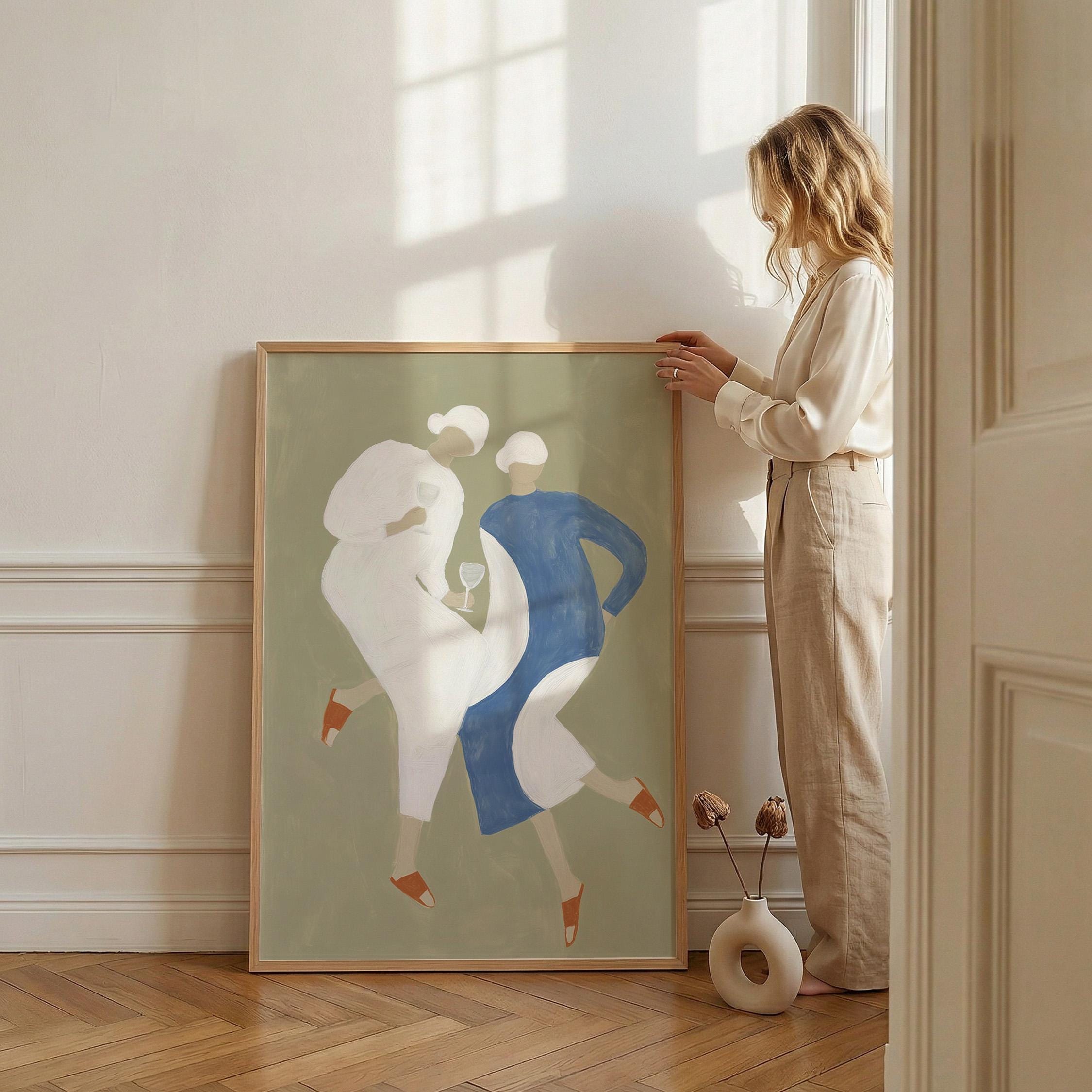 Transform your kitchen or dining space with this charming mid-century inspired print featuring two stylish women sharing wine in soft sage green, cream, and dusty blue tones. Perfect for anyone creating a warm, inviting kitchen gallery wall, wine lovers, or those seeking retro-modern decor with a feminine, friendship-celebrating vibe.