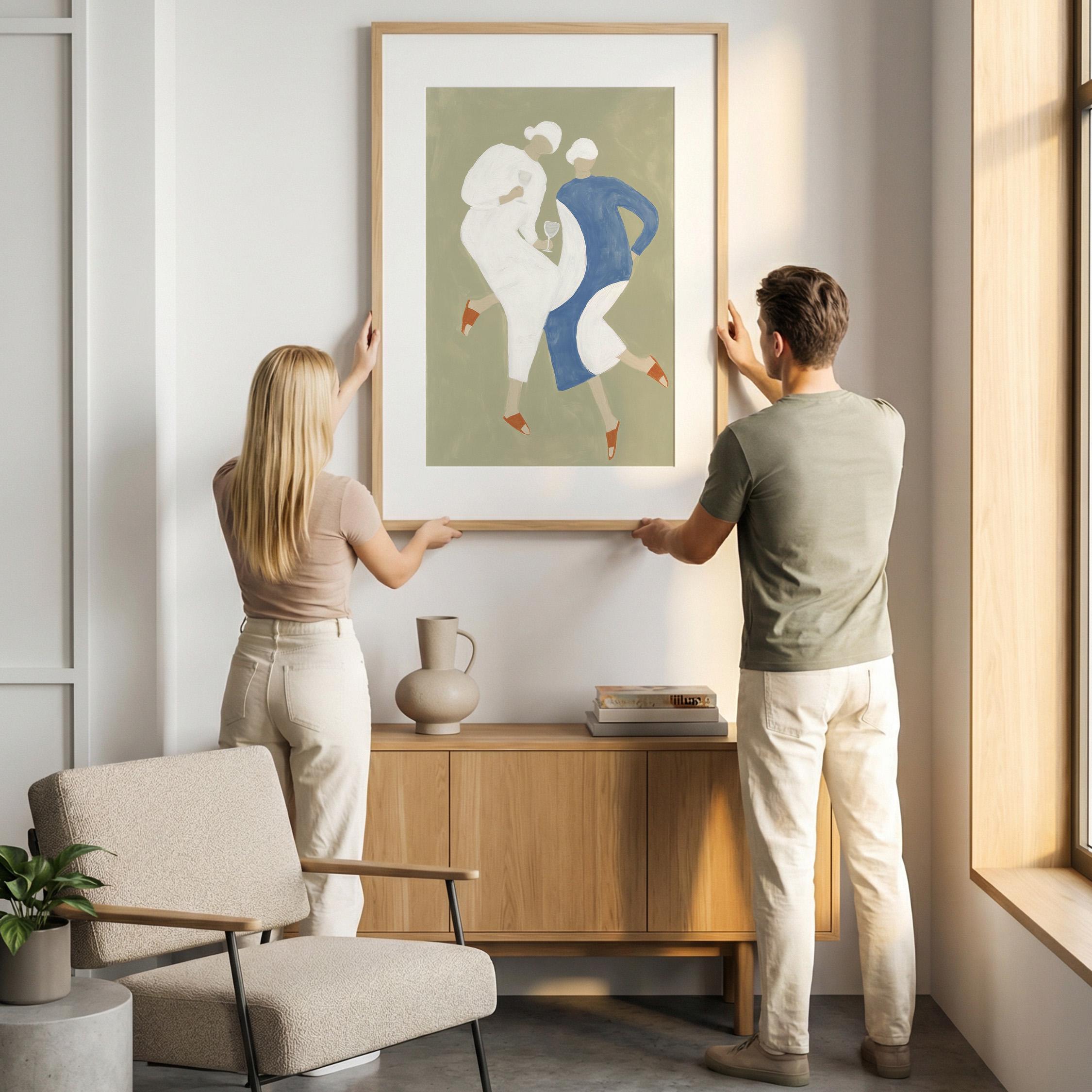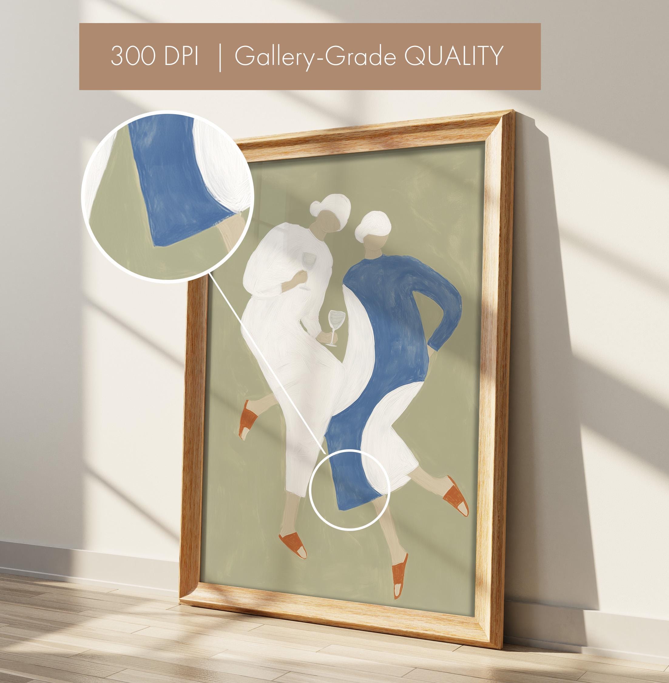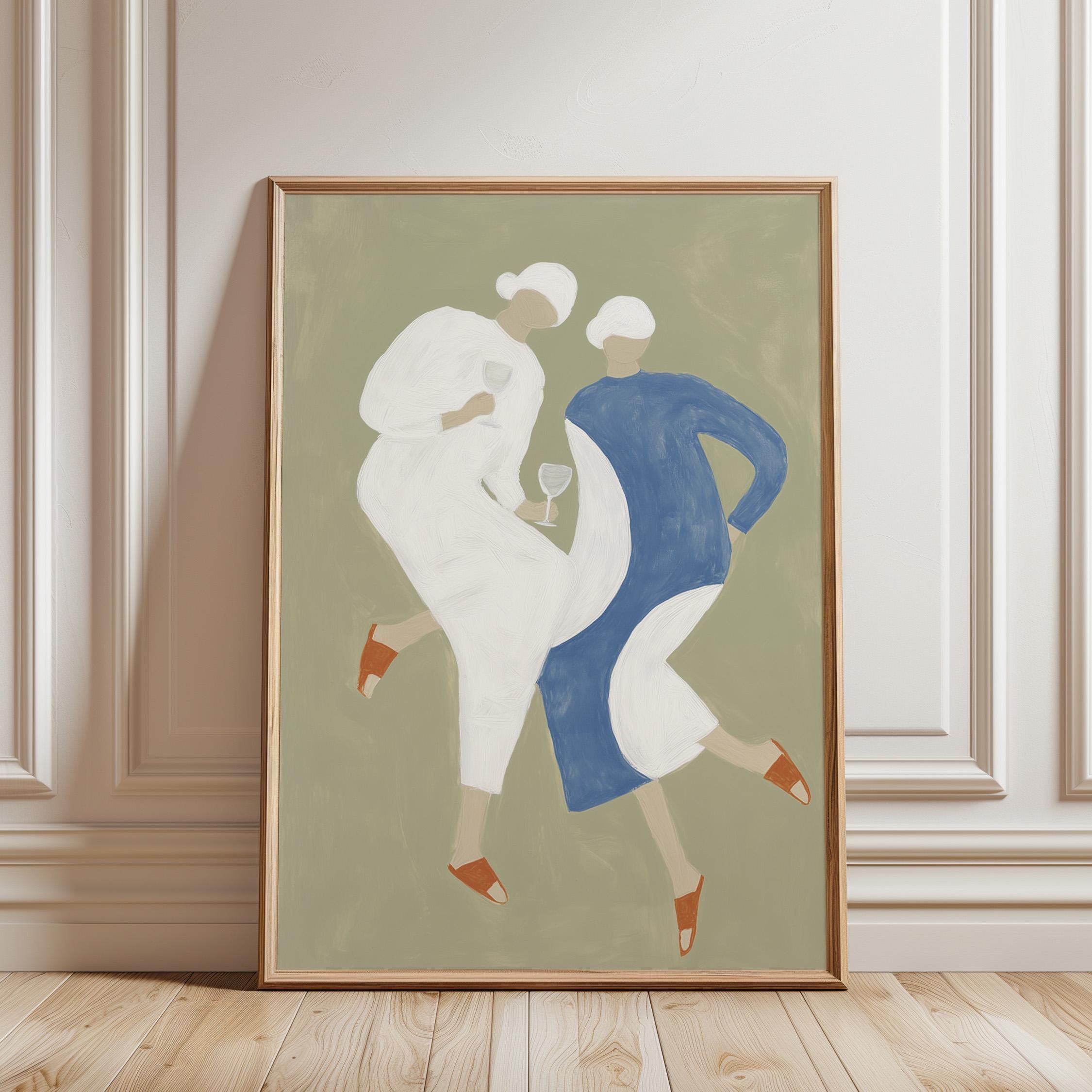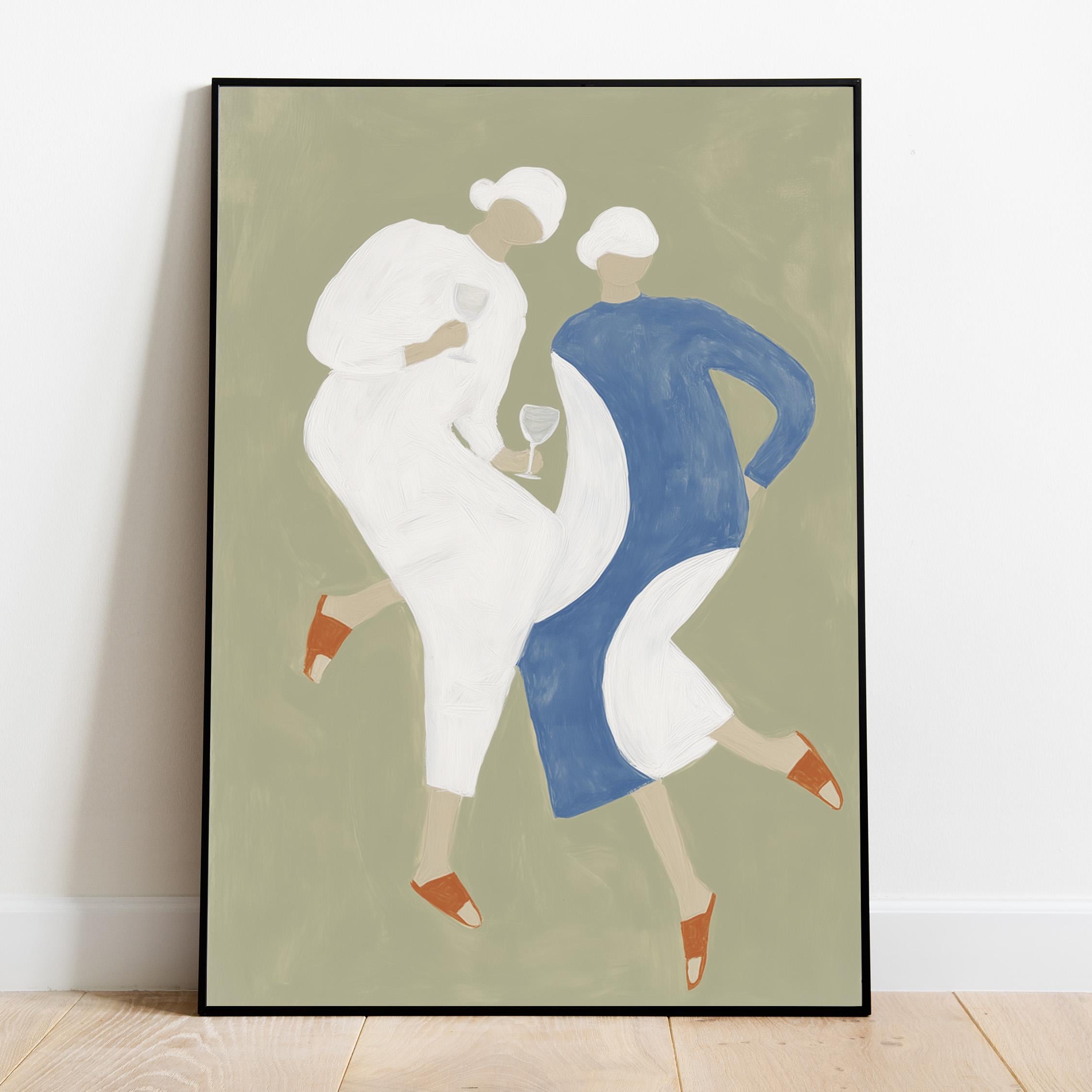 Transform your kitchen or dining space with this charming mid-century inspired print featuring two stylish women sharing wine in soft sage green, cream, and dusty blue tones. Perfect for anyone creating a warm, inviting kitchen gallery wall, wine lovers, or those seeking retro-modern decor with a feminine, friendship-celebrating vibe.