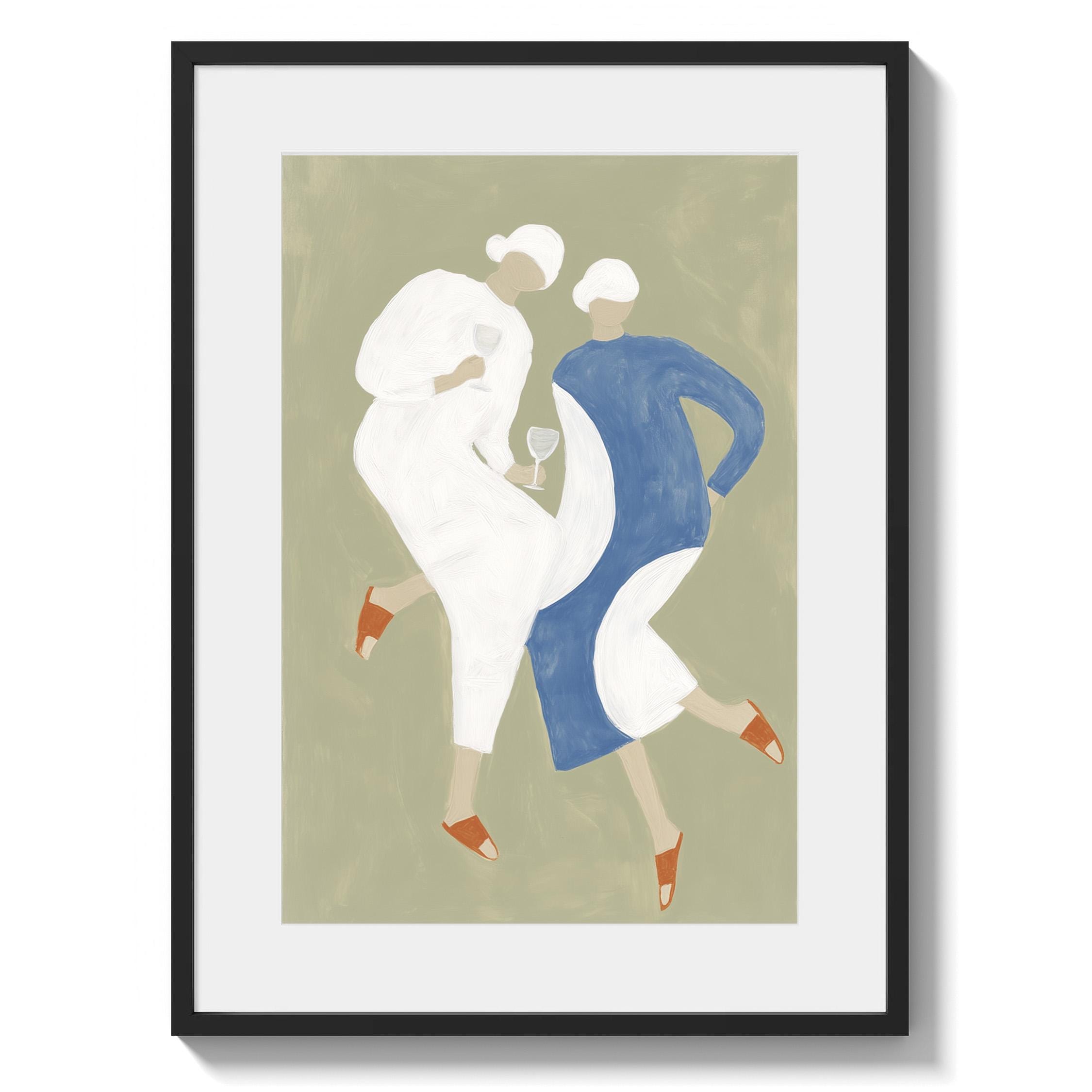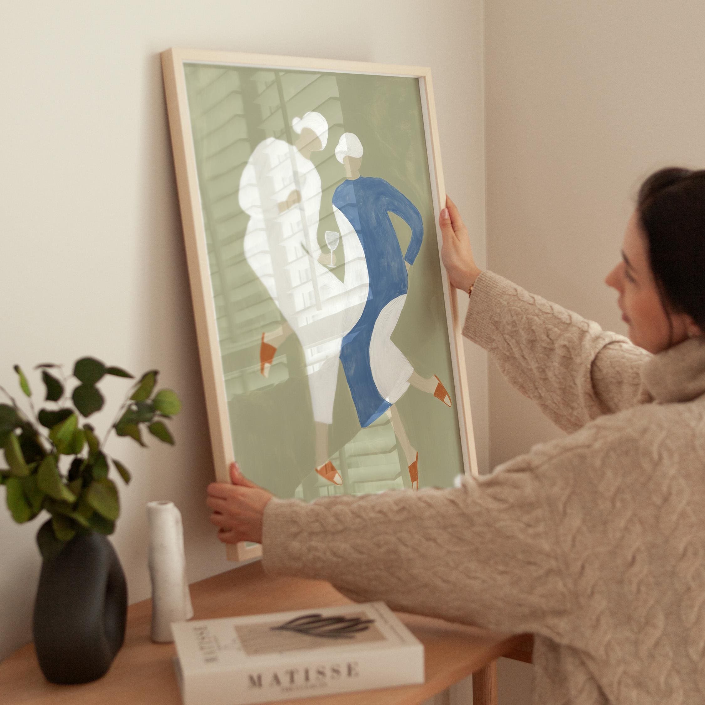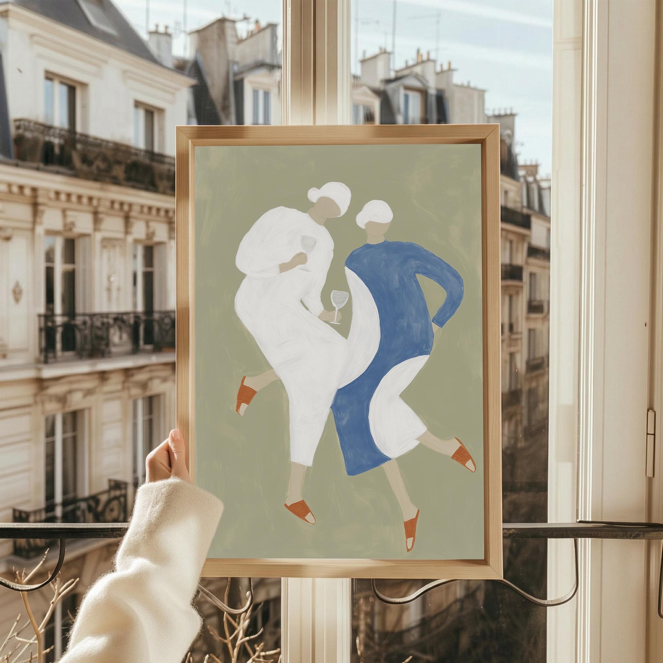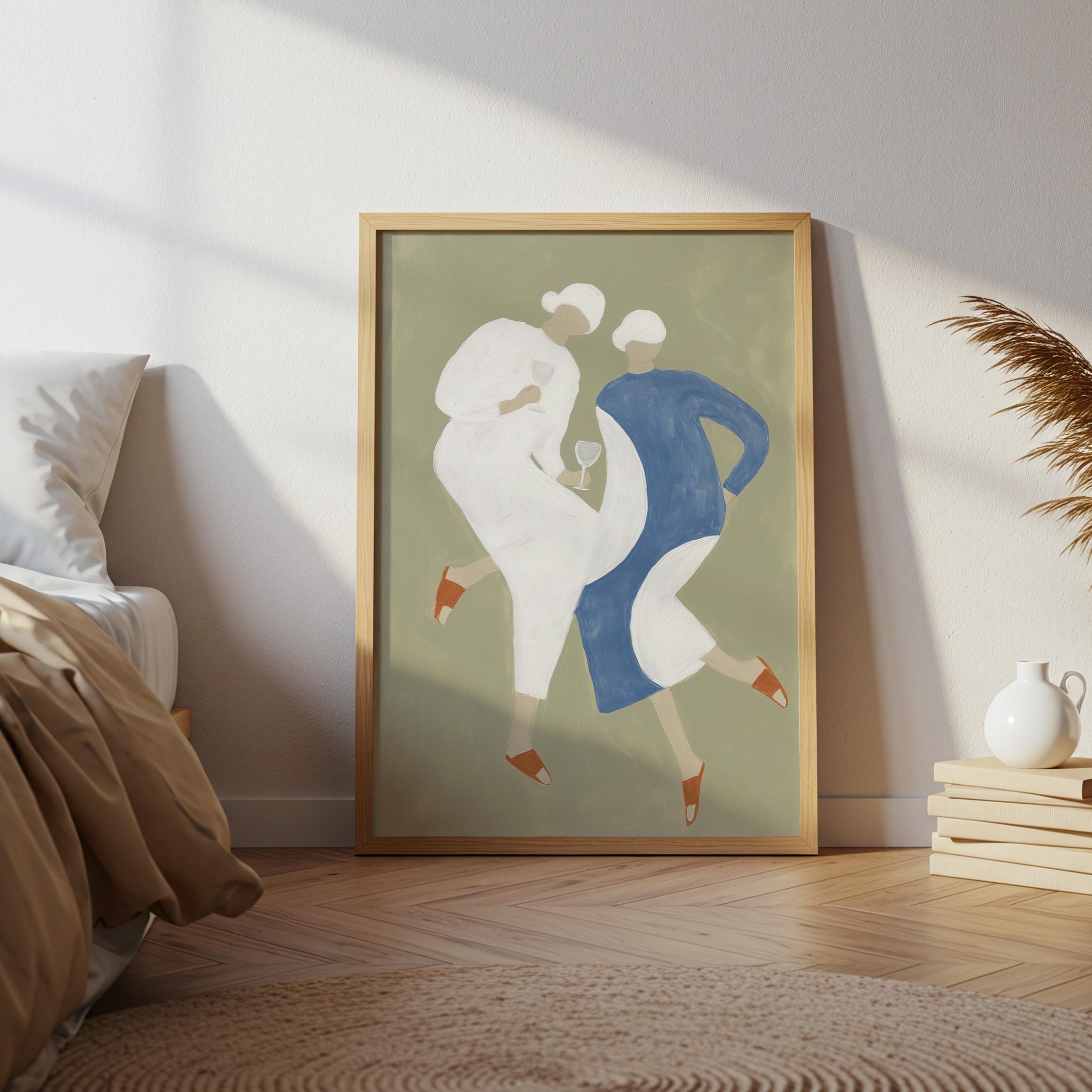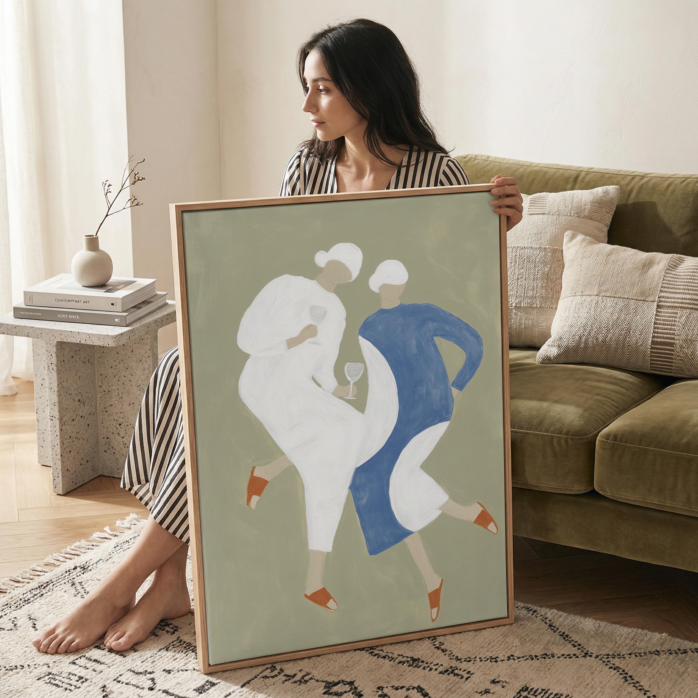 Transform your kitchen or dining space with this charming mid-century inspired print featuring two stylish women sharing wine in soft sage green, cream, and dusty blue tones. Perfect for anyone creating a warm, inviting kitchen gallery wall, wine lovers, or those seeking retro-modern decor with a feminine, friendship-celebrating vibe.