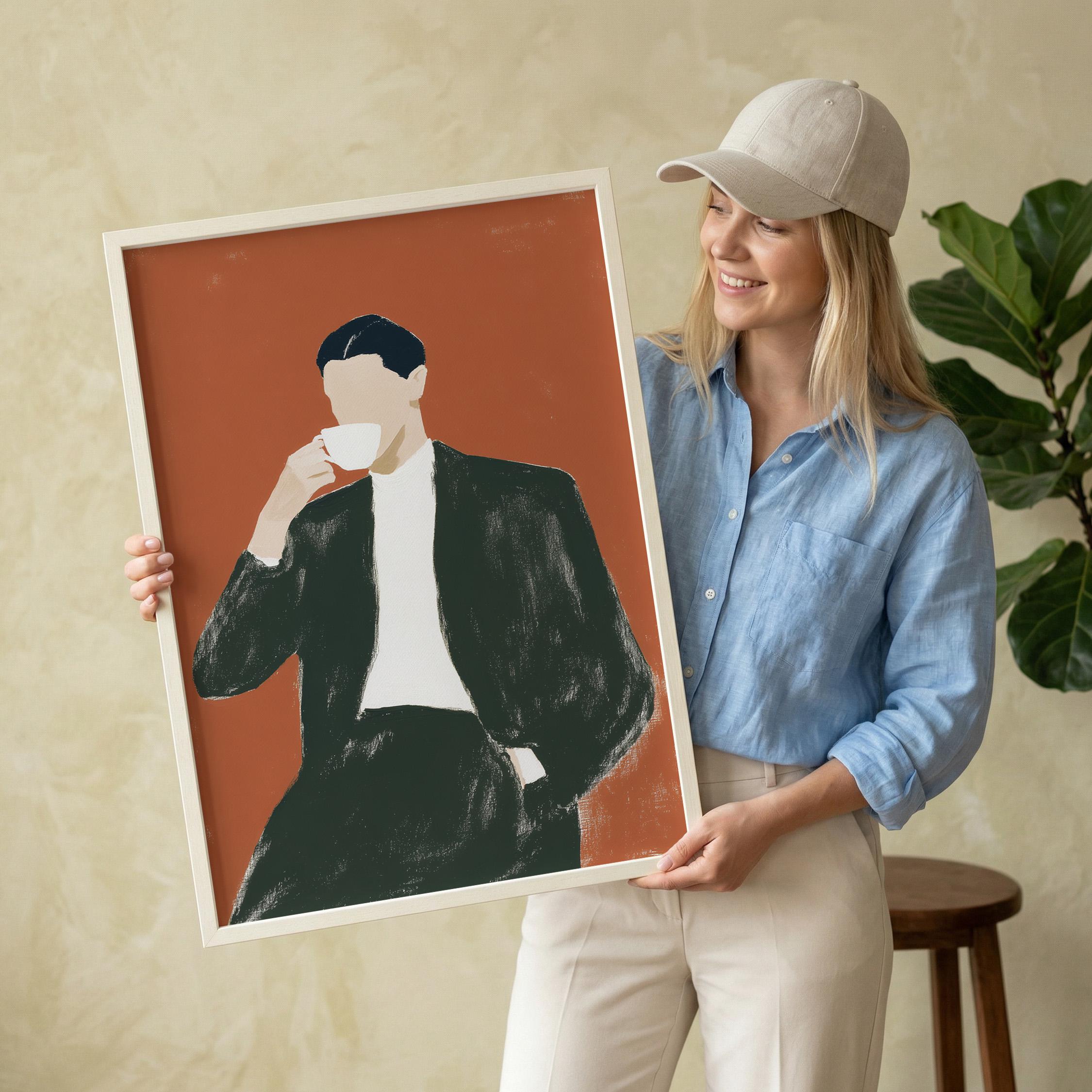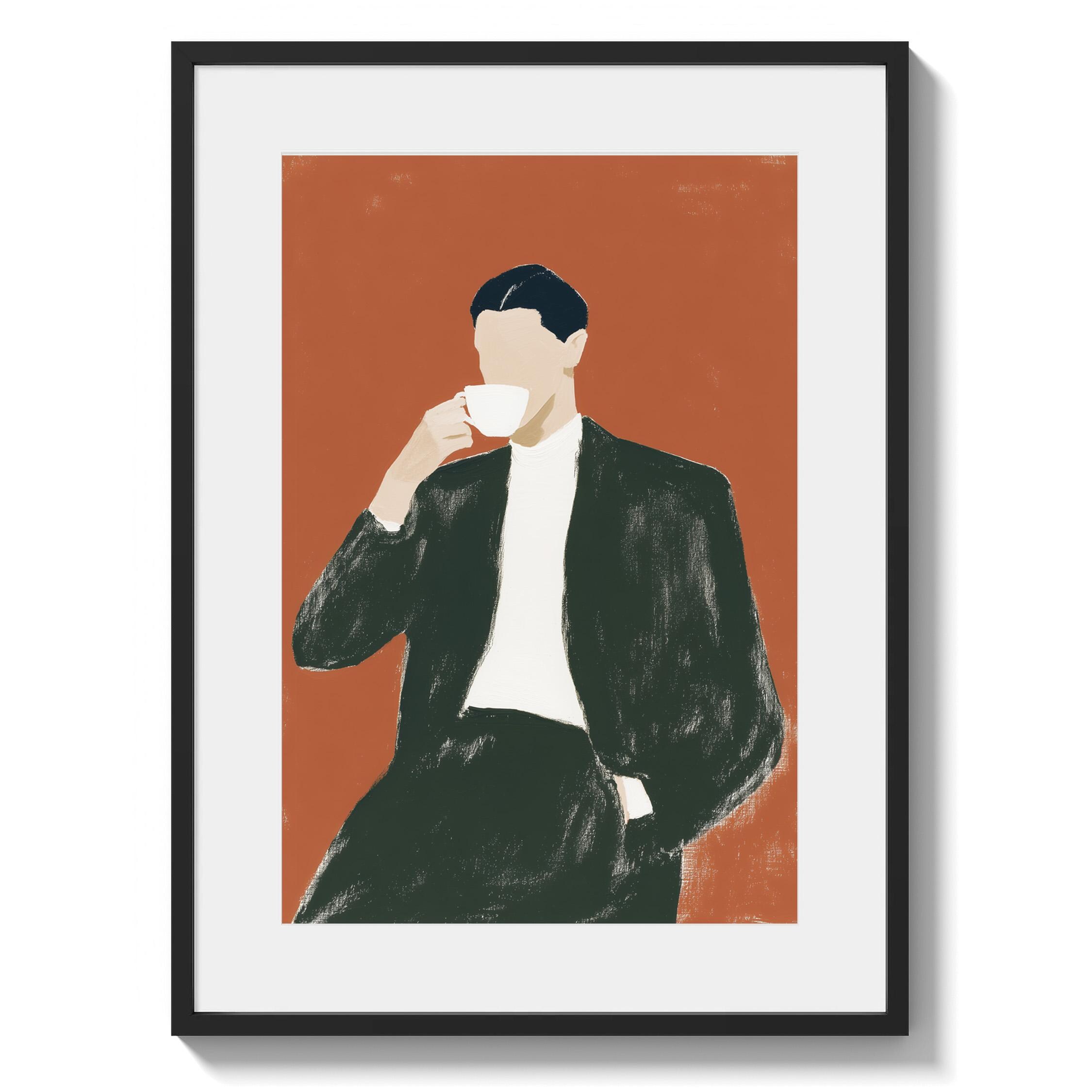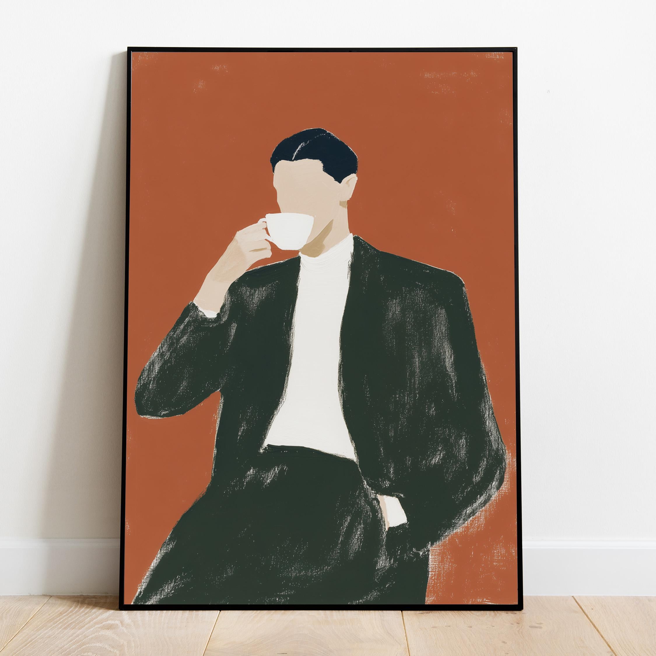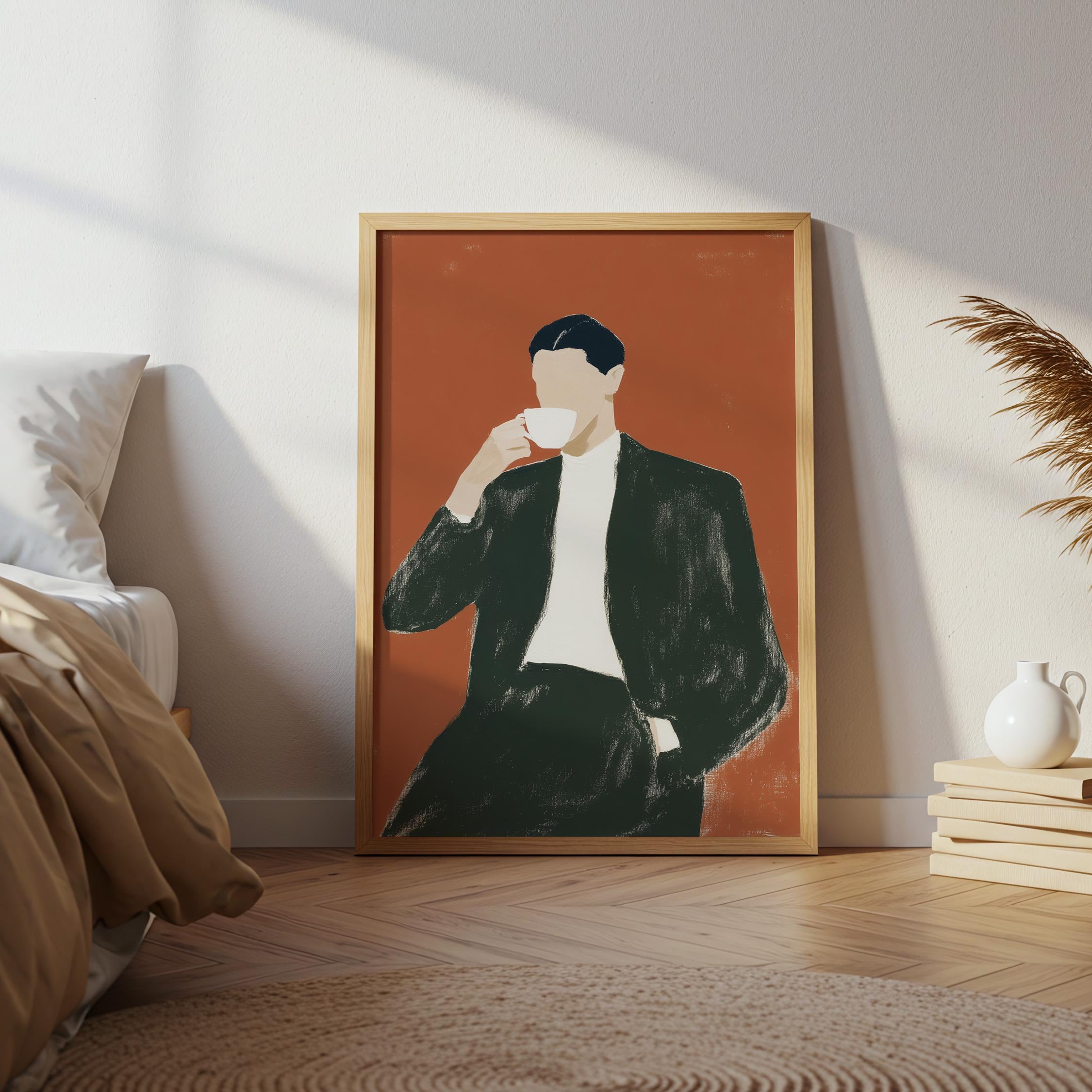 Elevate your space with this Gentleman Drinking Coffee Wall Art Print featuring a sophisticated mid-century modern portrait against a warm terracotta background. Perfect for coffee lovers and anyone seeking vintage-inspired decor for kitchens, dining rooms, coffee bars, or home offices.