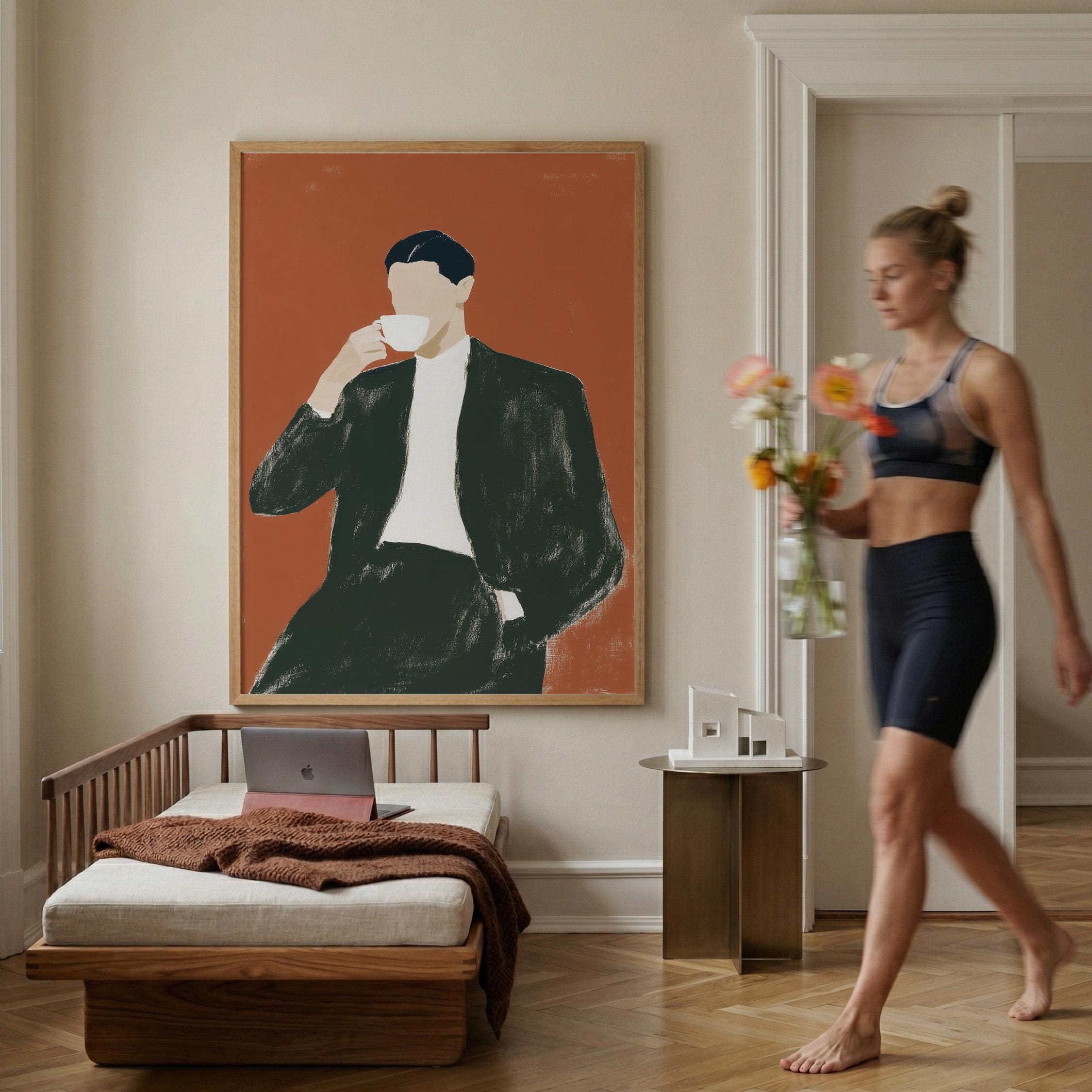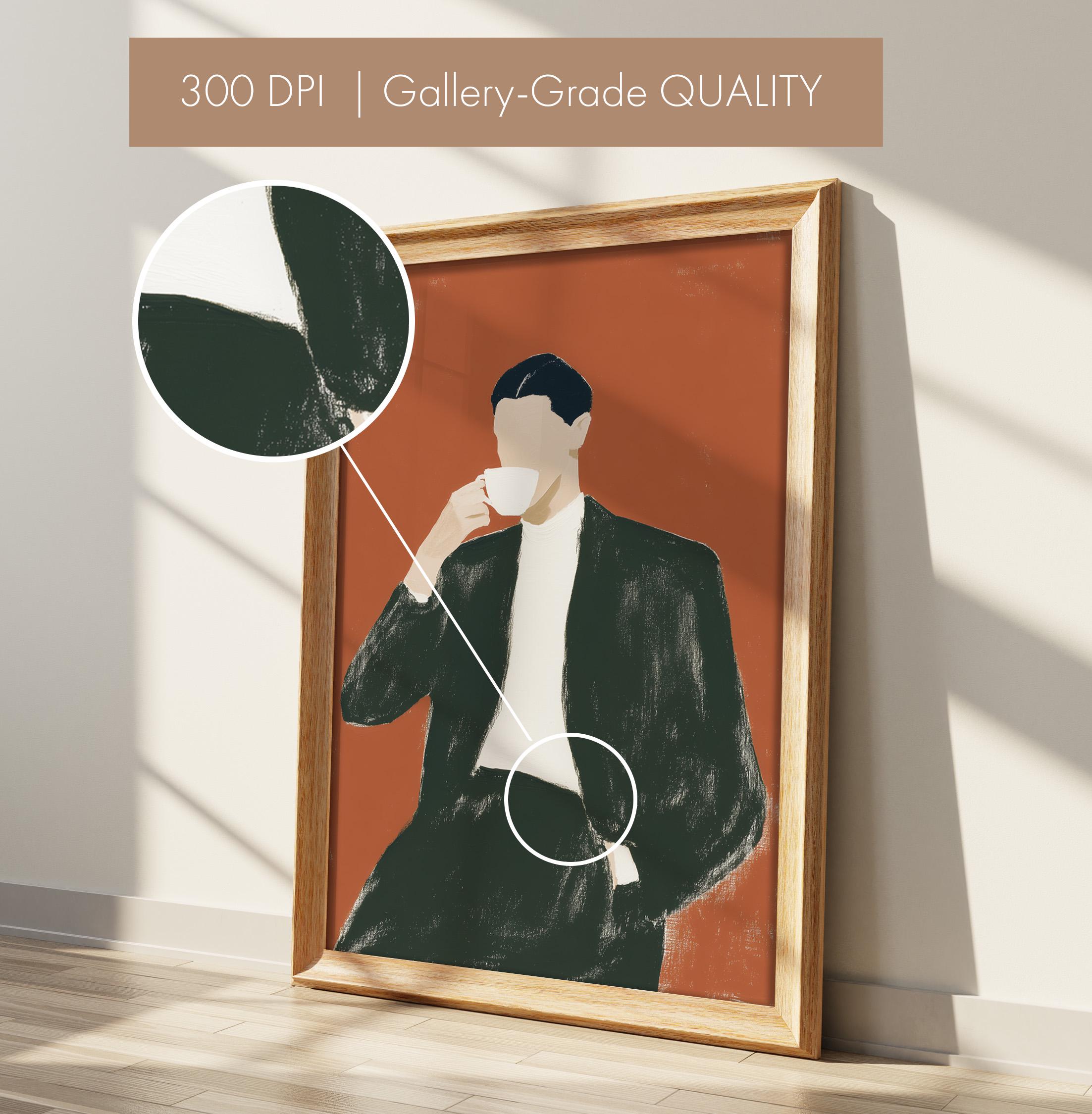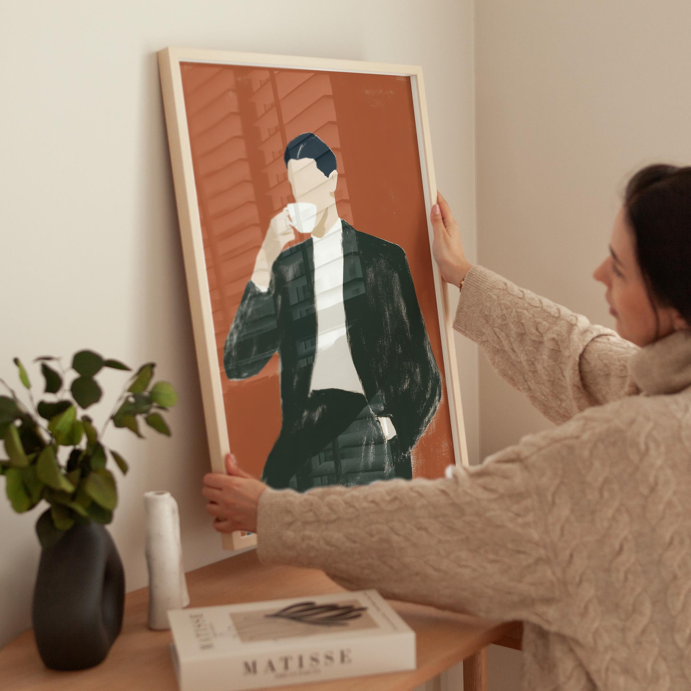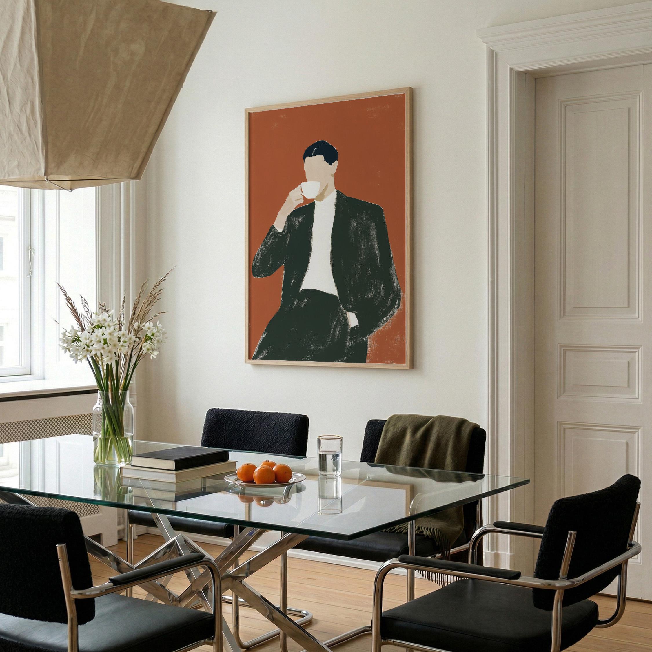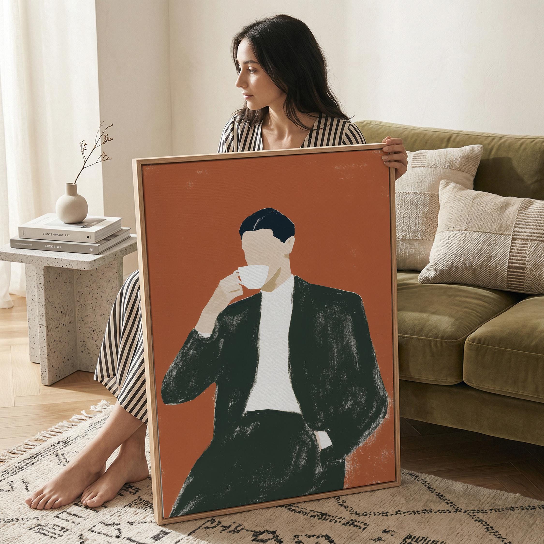 Elevate your space with this Gentleman Drinking Coffee Wall Art Print featuring a sophisticated mid-century modern portrait against a warm terracotta background. Perfect for coffee lovers and anyone seeking vintage-inspired decor for kitchens, dining rooms, coffee bars, or home offices.